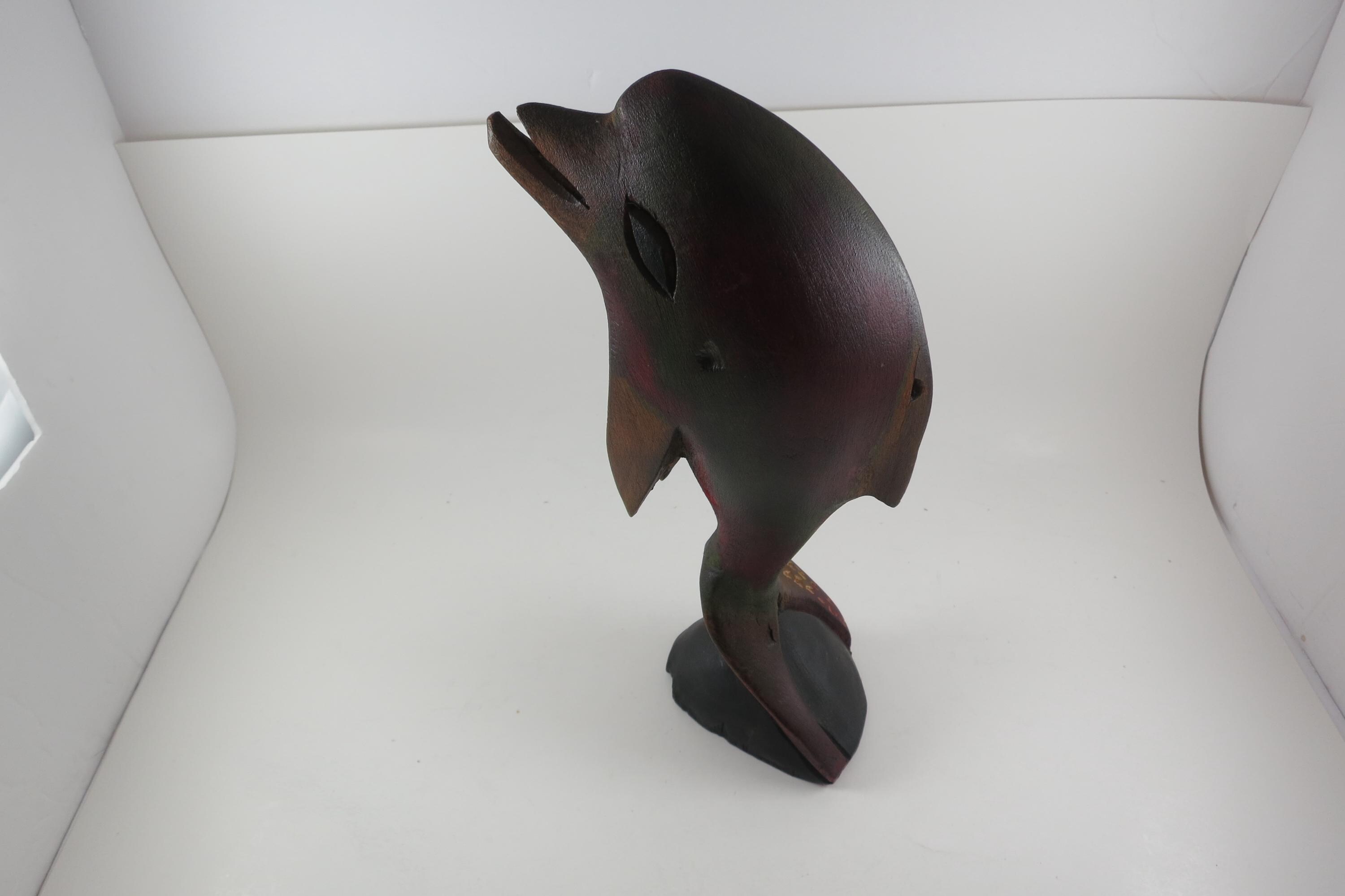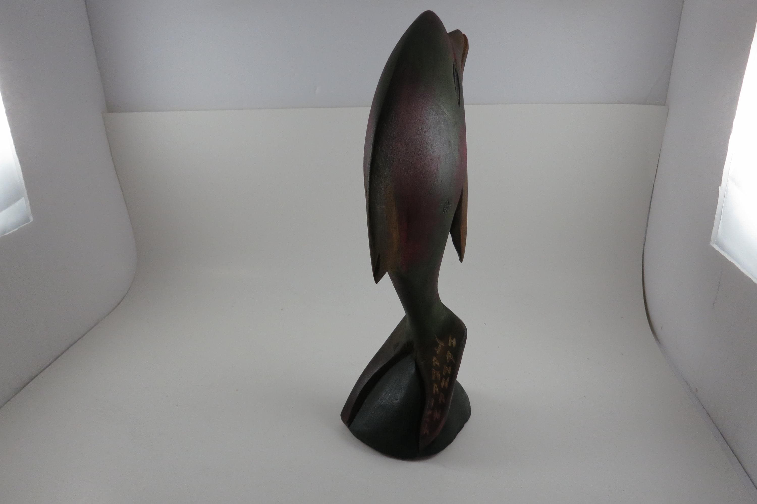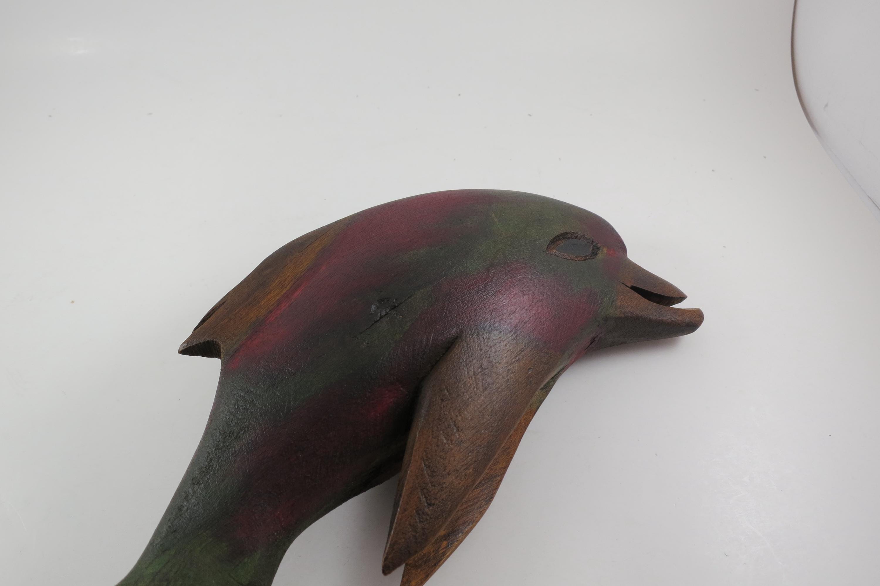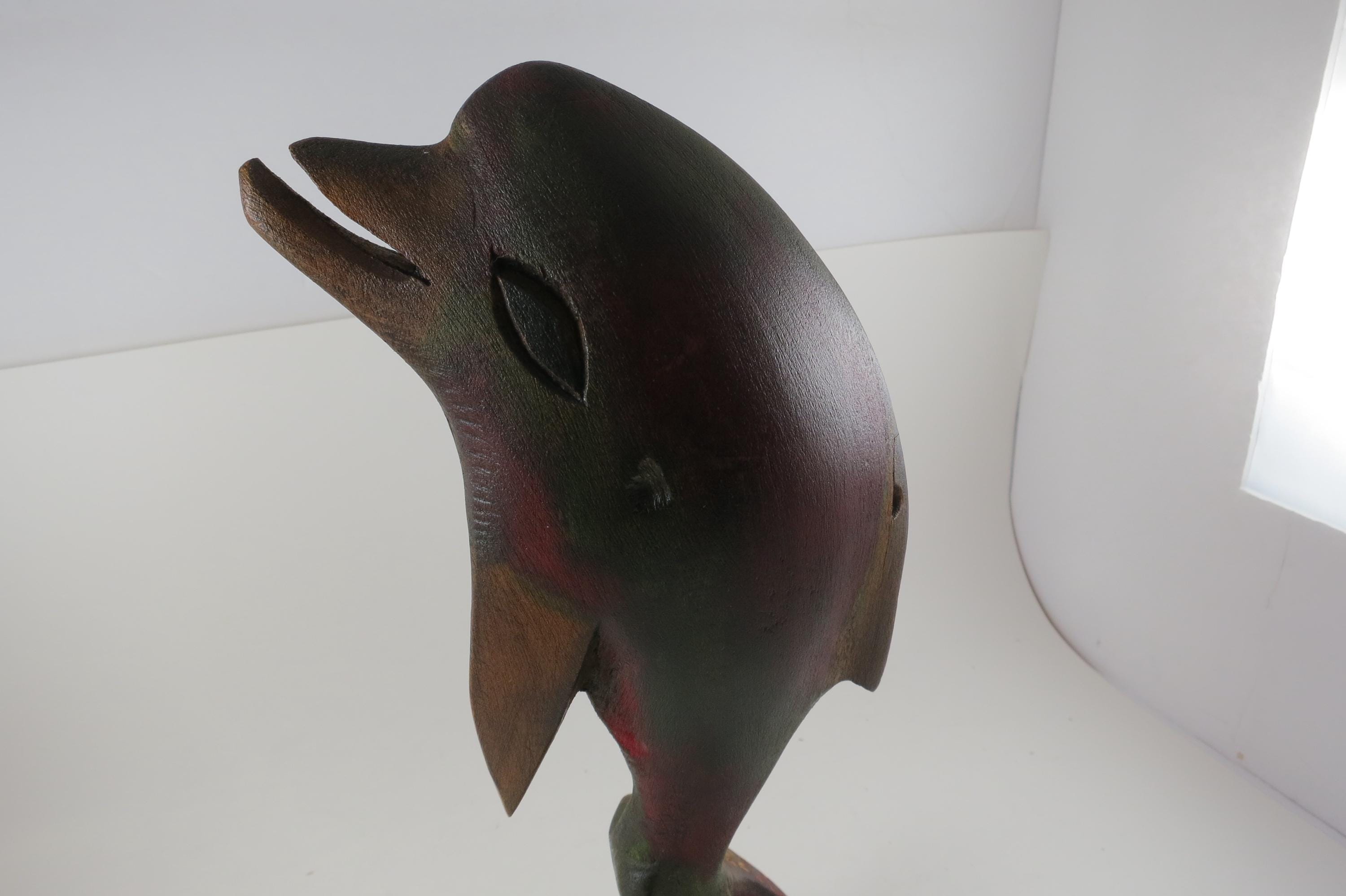 Vintage Hand Carved Wooden Dolphin Porpoise Figure 11 3/4 Inches Tall Artist Signed Multi Color.