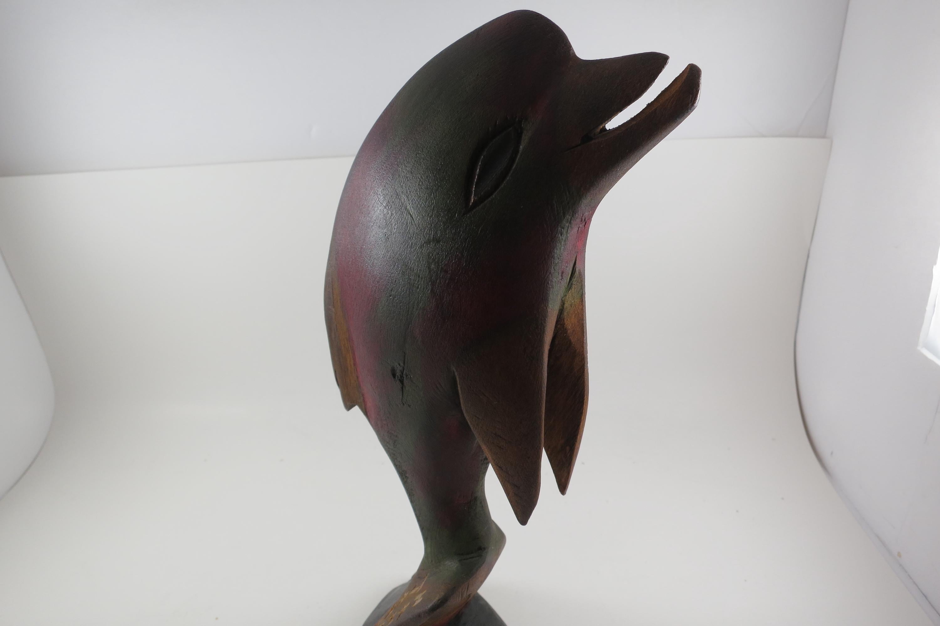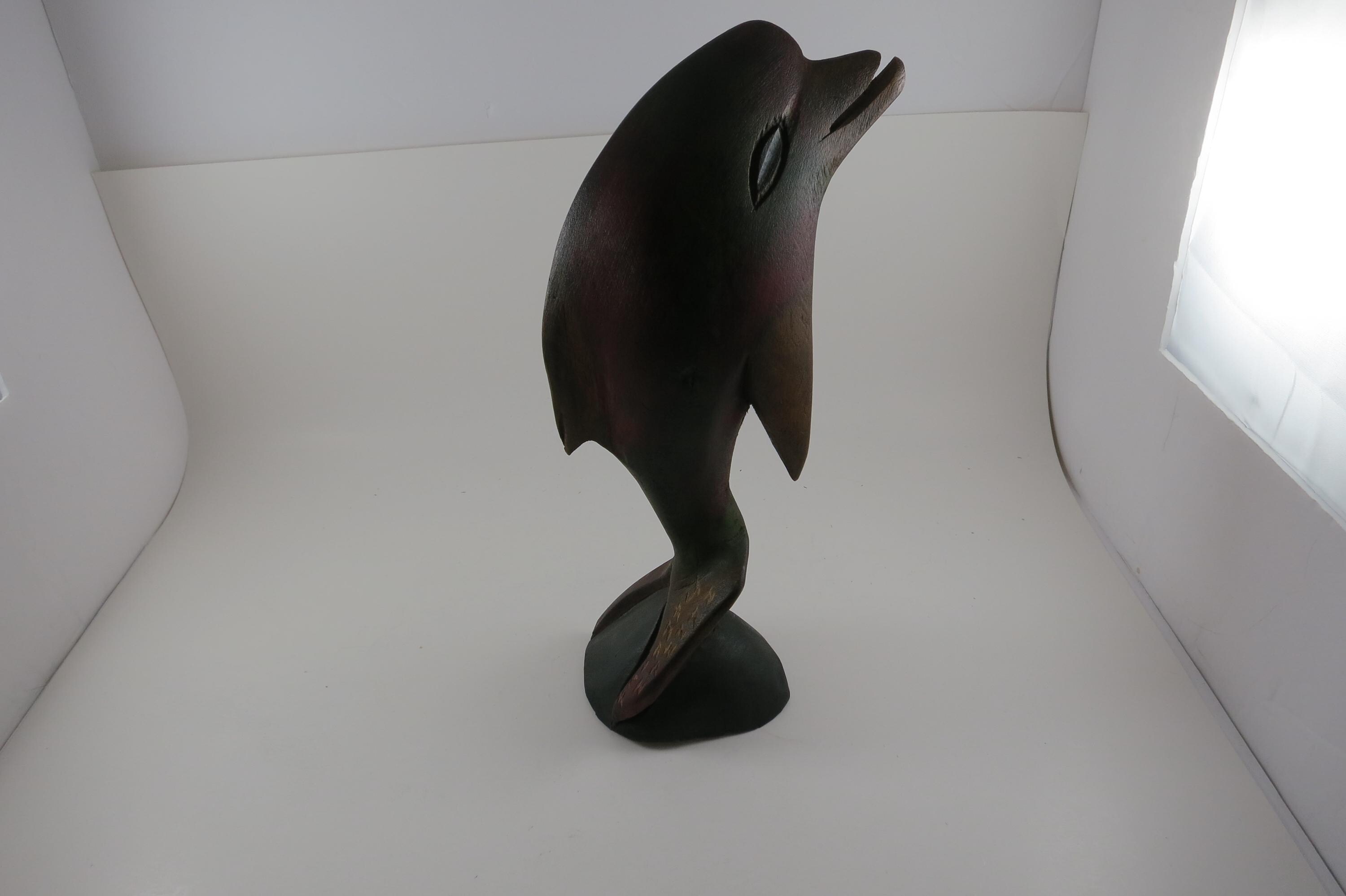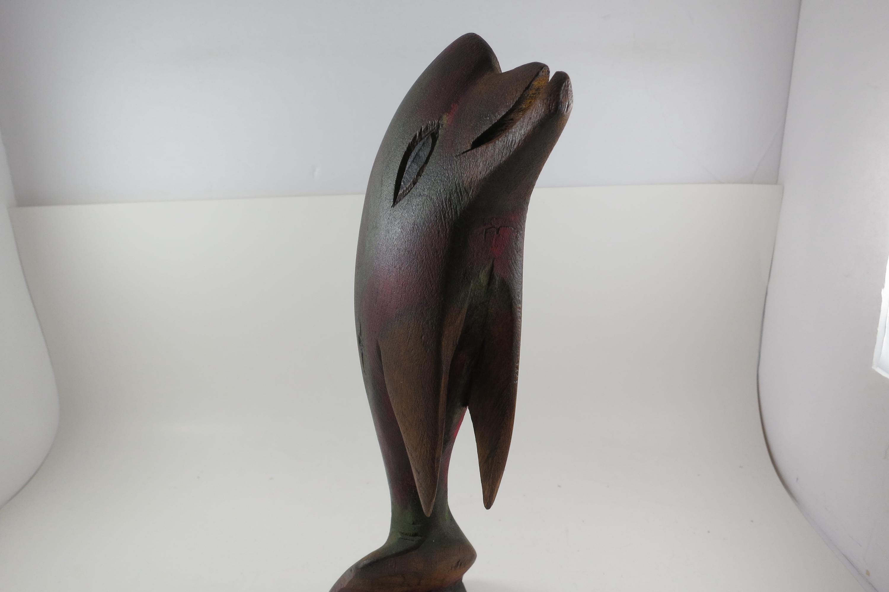 Vintage Hand Carved Wooden Dolphin Porpoise Figure 11 3/4 Inches Tall Artist Signed Multi Color.