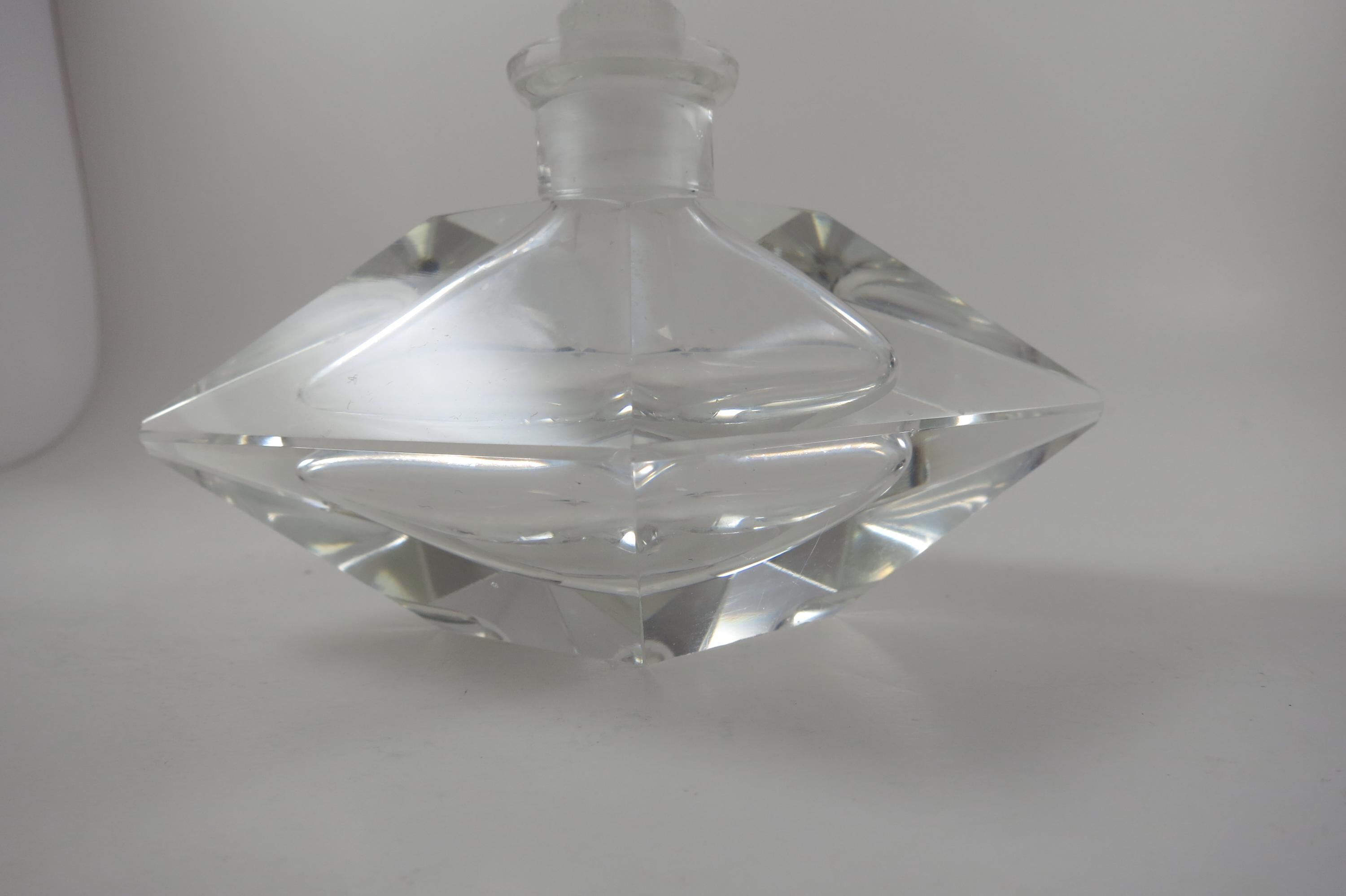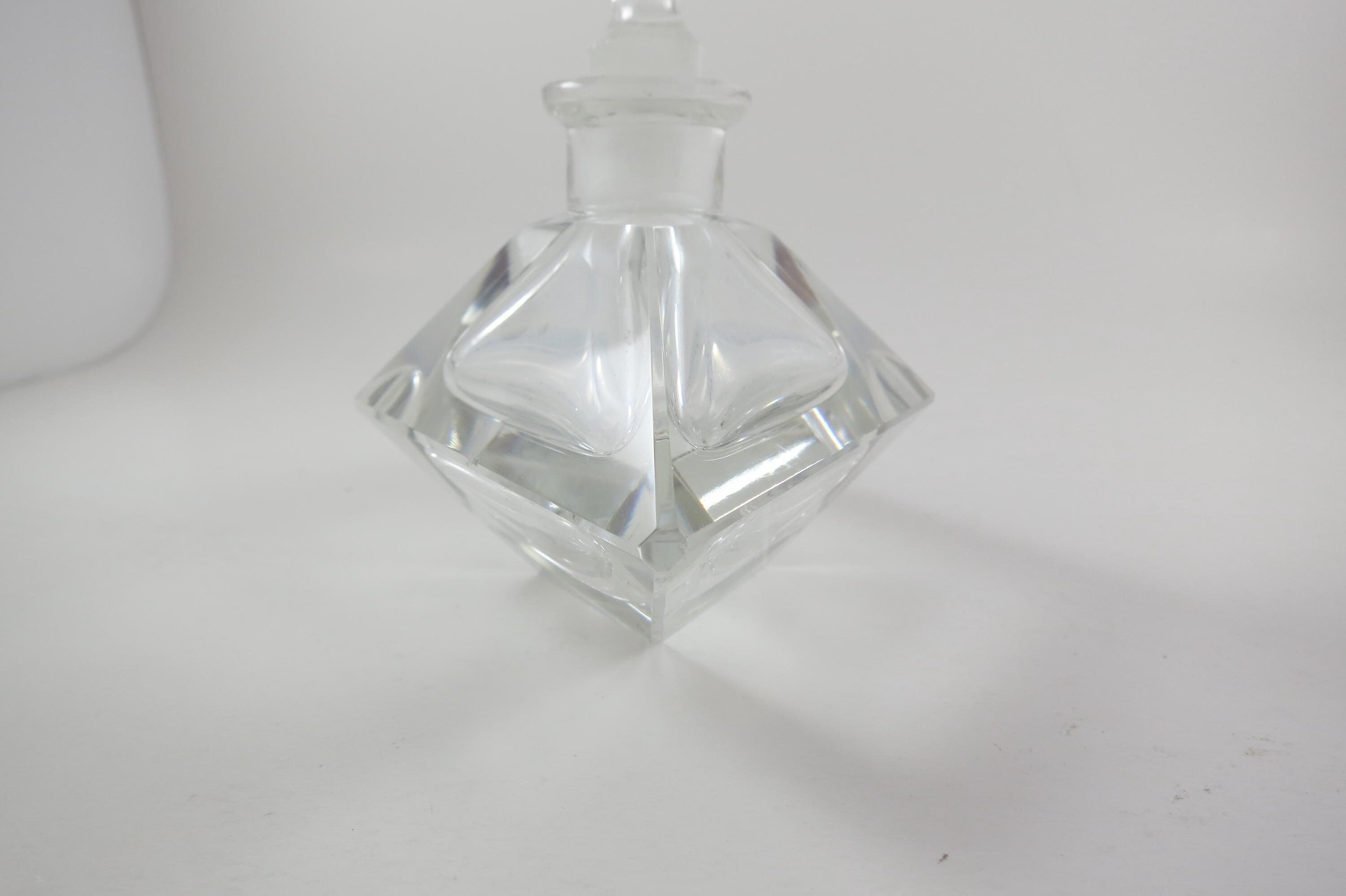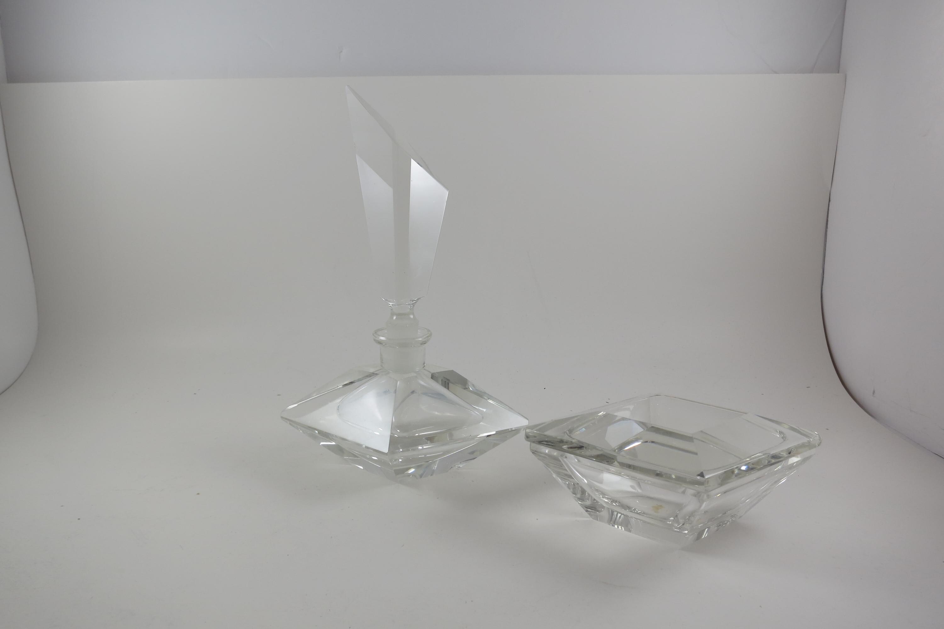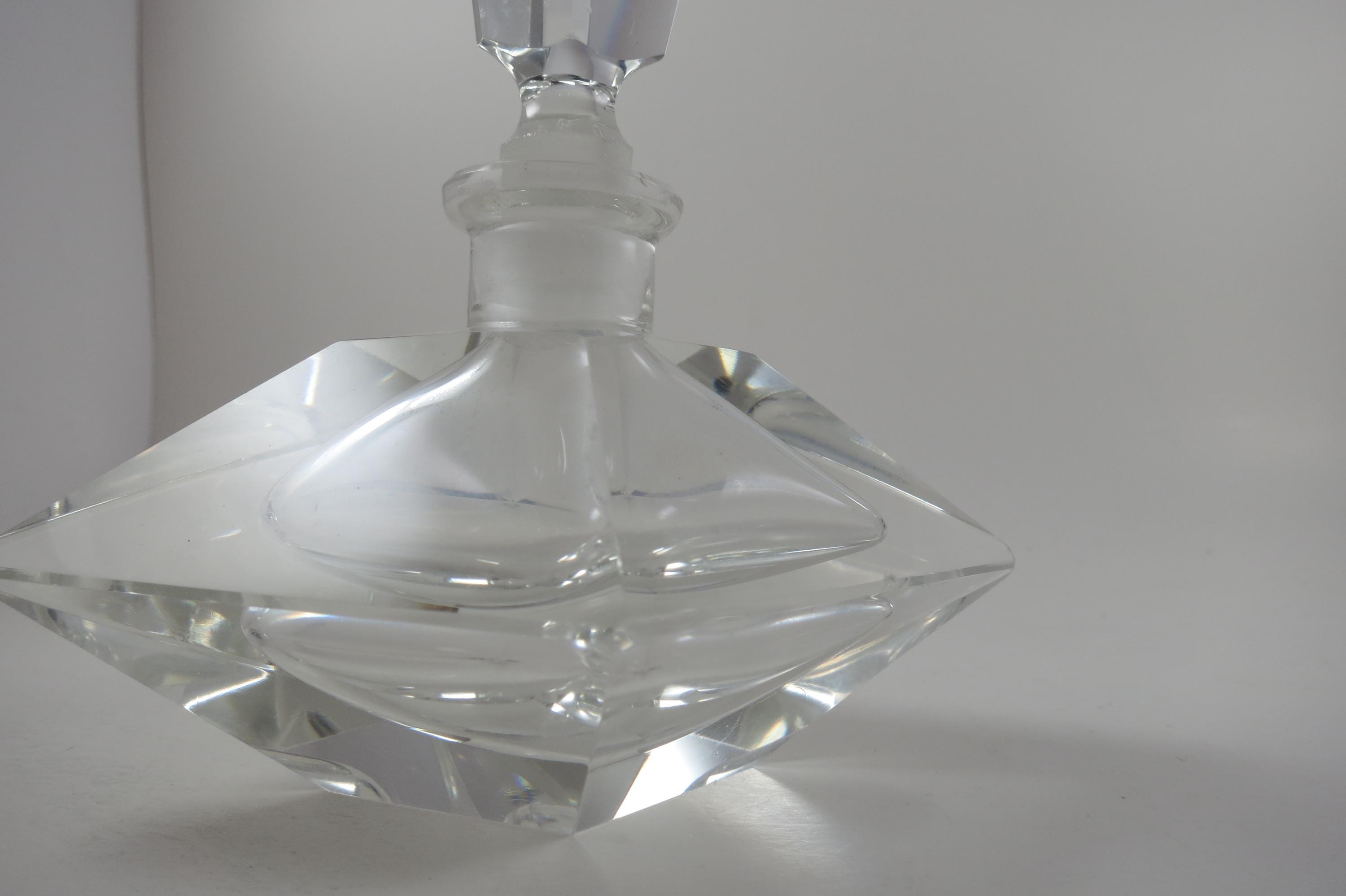 Vintage German Crystal Clear Cut Perfume Bottle with Lid and 2 Piece Powder Dish. Bottle with Lid measures 7 1/2 inches tall and 5 inches wide. The two piece powder dish measures 4 3/4 bu 4 3/4 inches. Dish has a couple small nicks on the edges. Beautiful set!