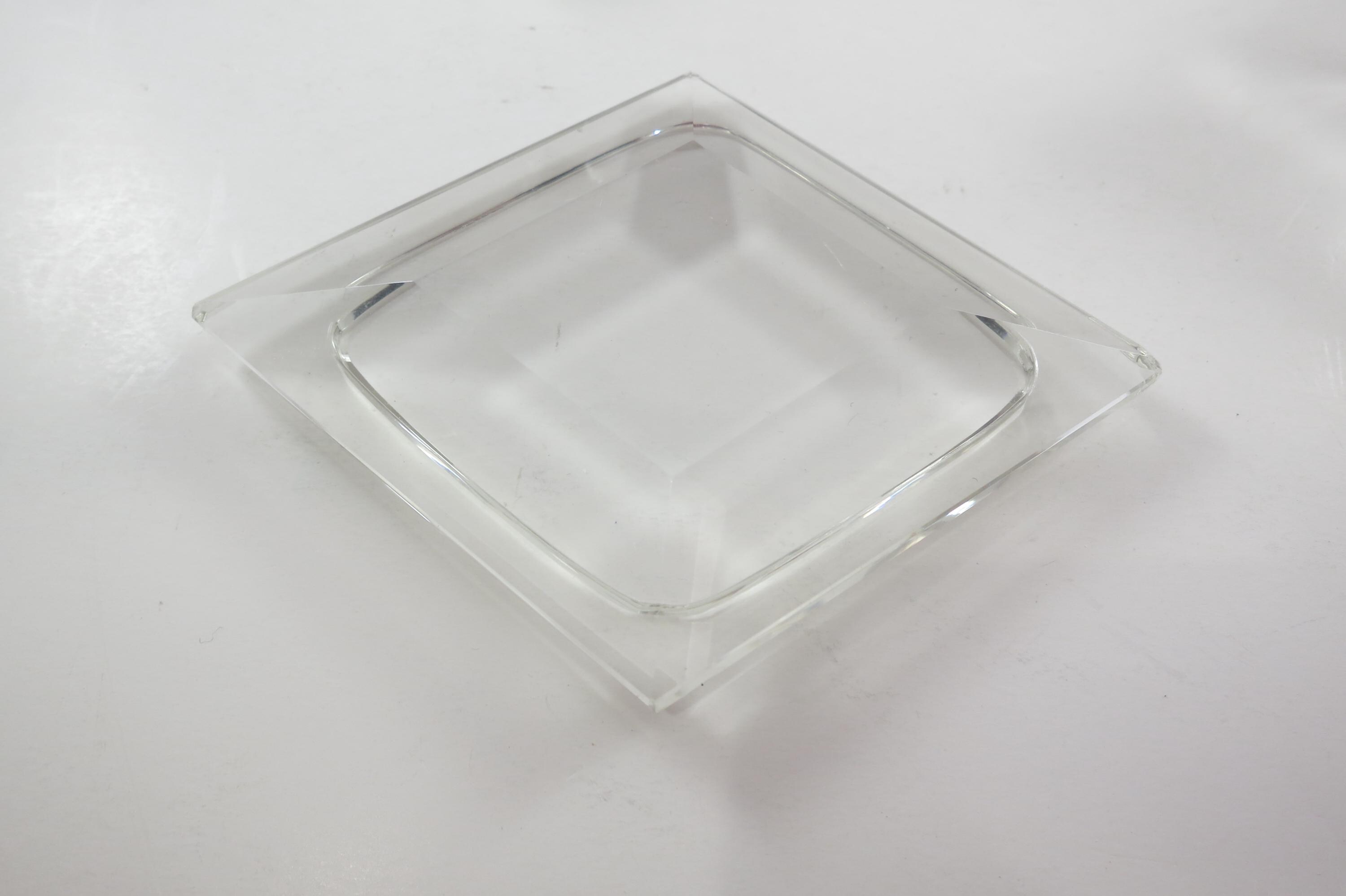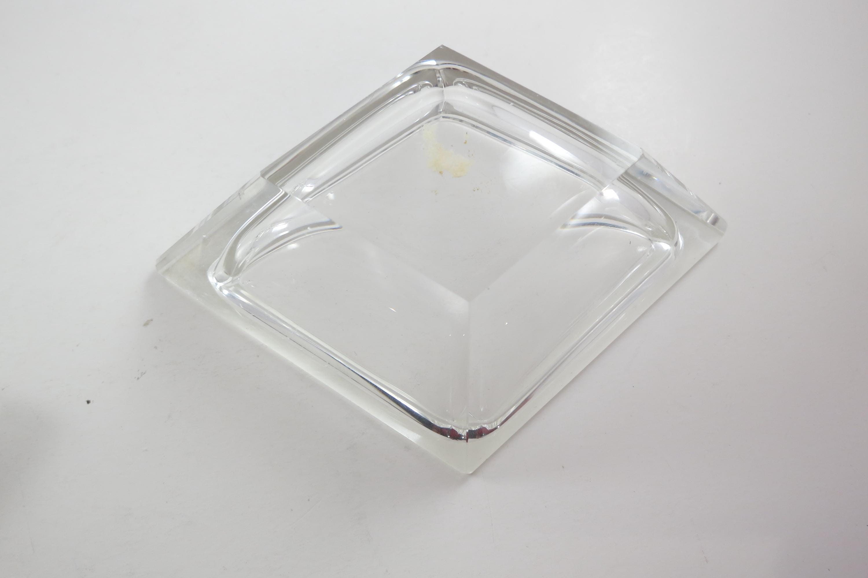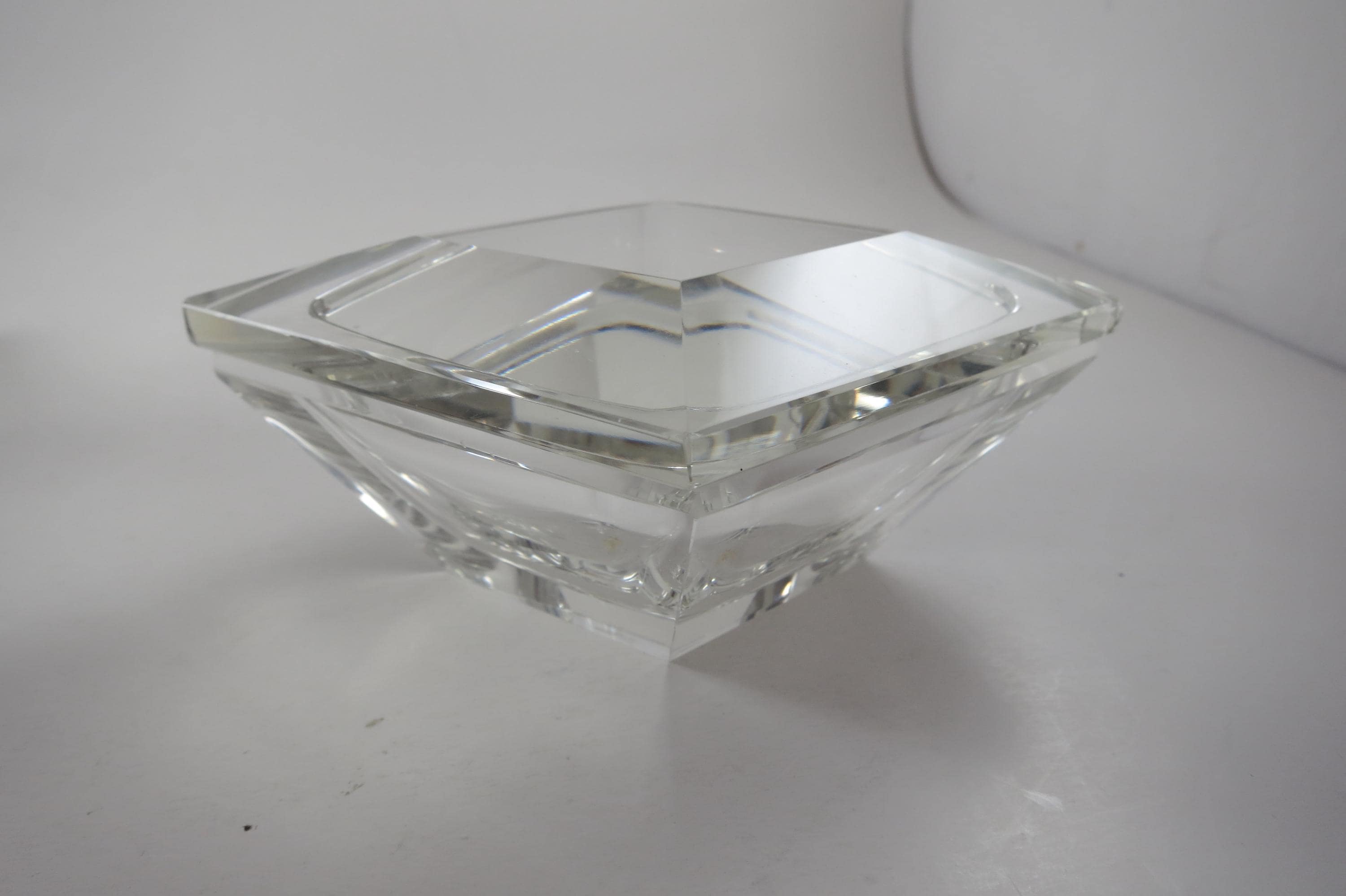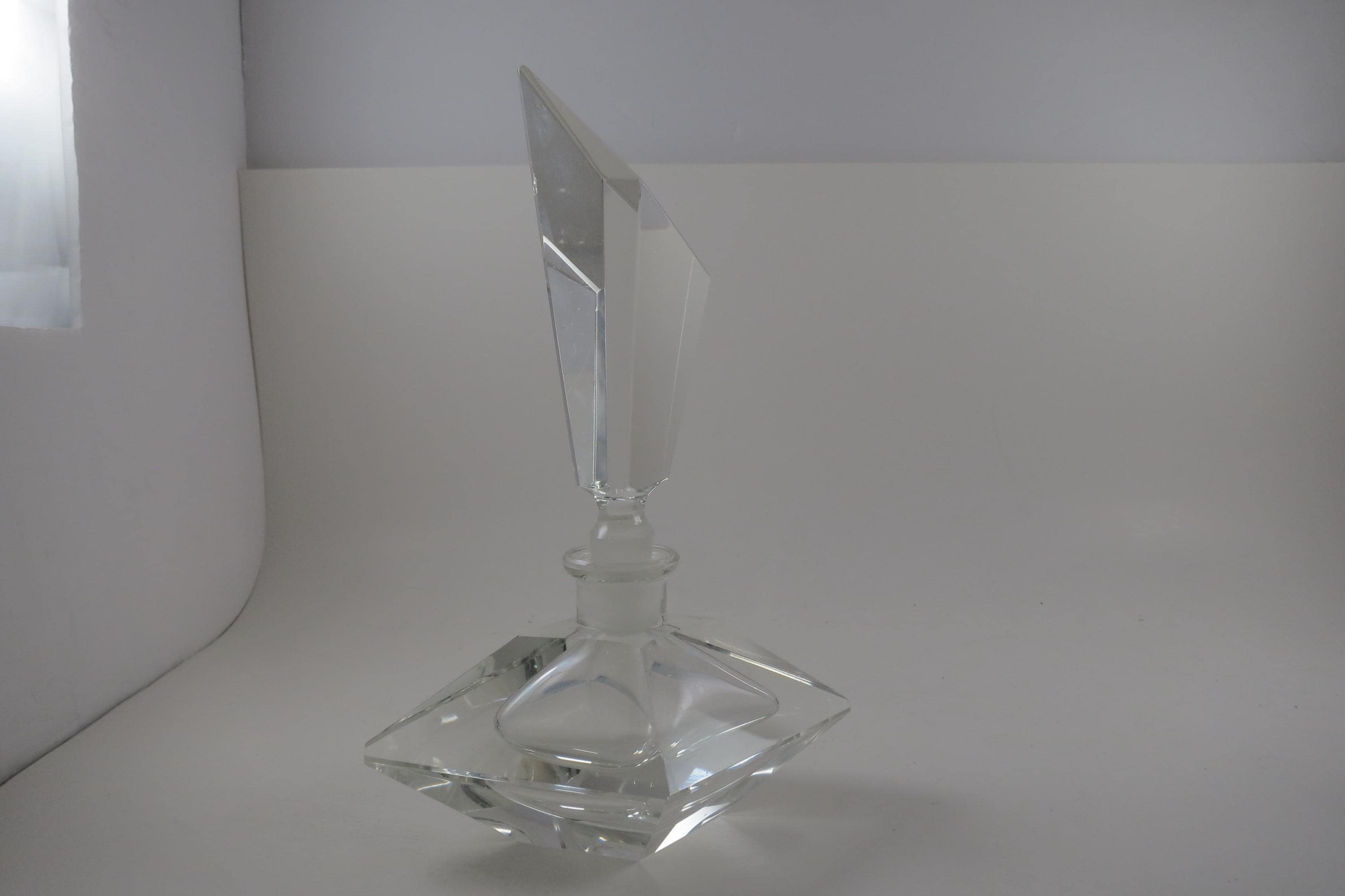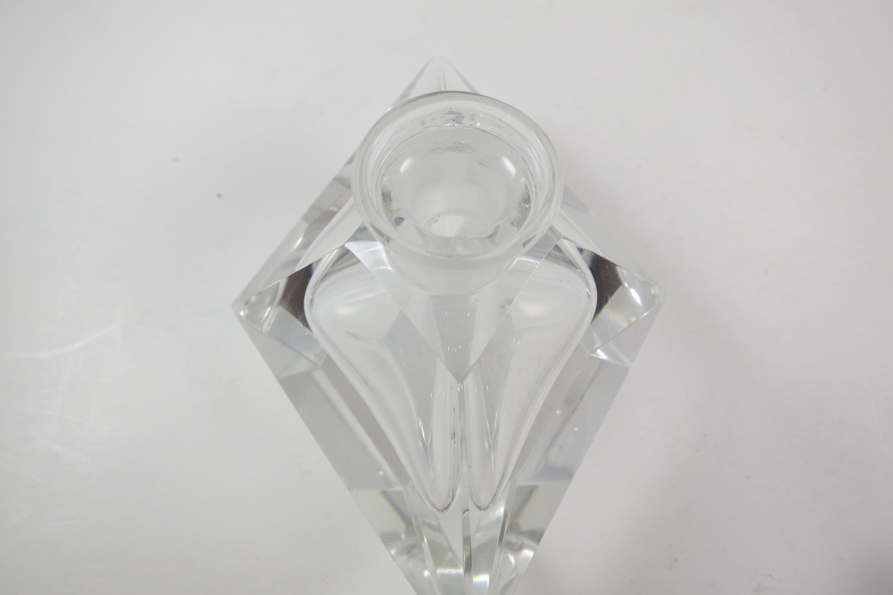 Vintage German Crystal Clear Cut Perfume Bottle with Lid and 2 Piece Powder Dish. Bottle with Lid measures 7 1/2 inches tall and 5 inches wide. The two piece powder dish measures 4 3/4 bu 4 3/4 inches. Dish has a couple small nicks on the edges. Beautiful set!