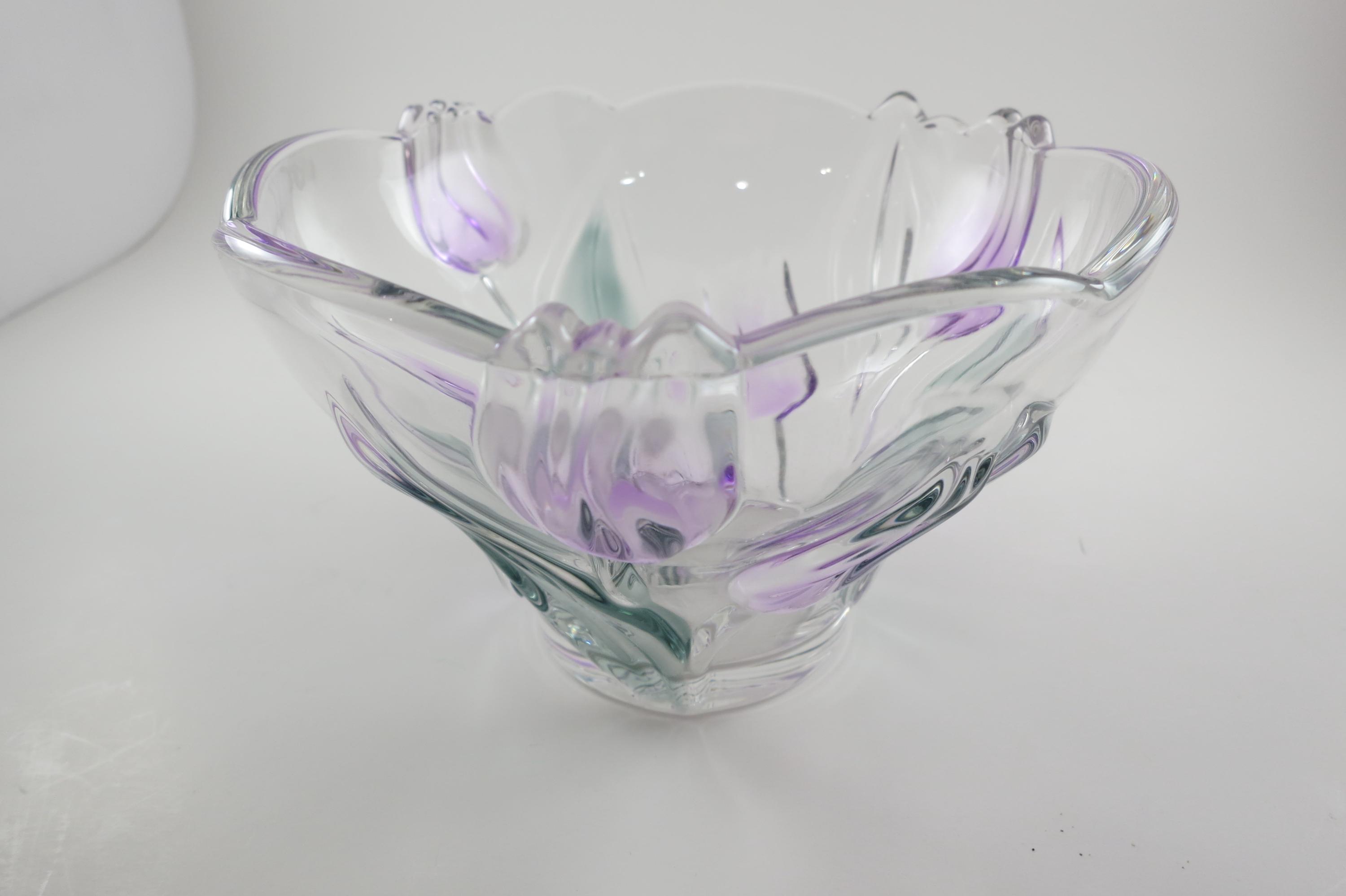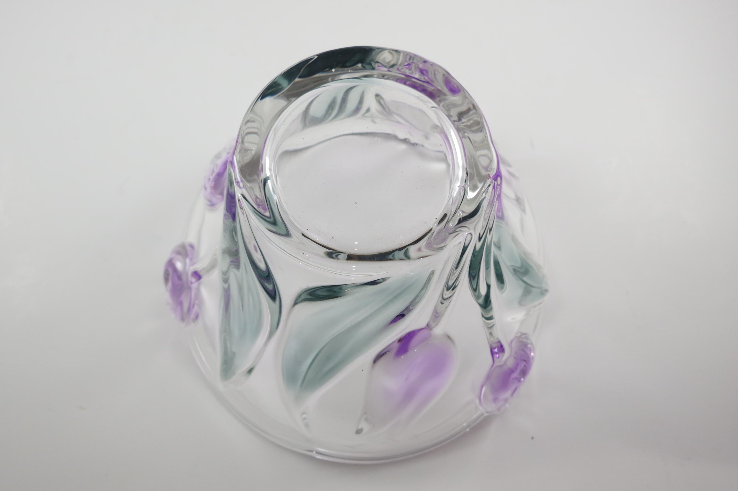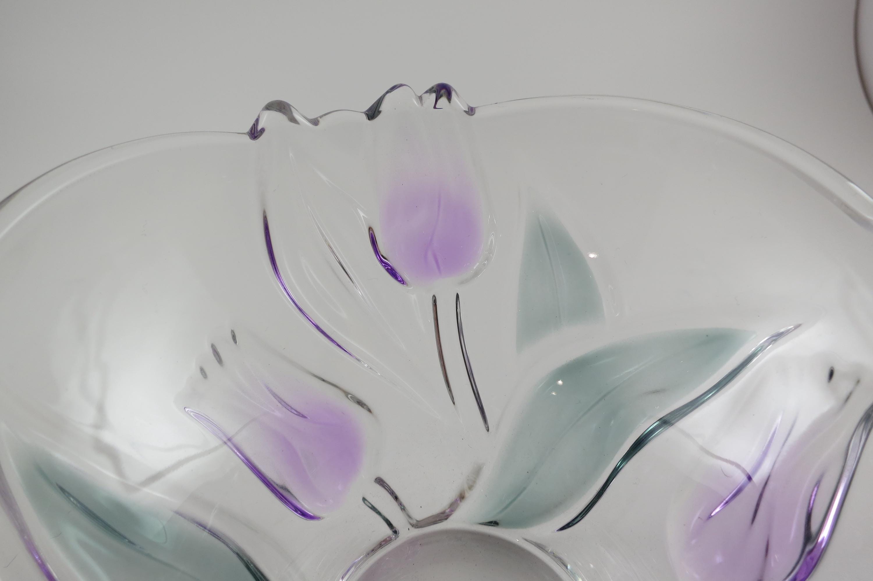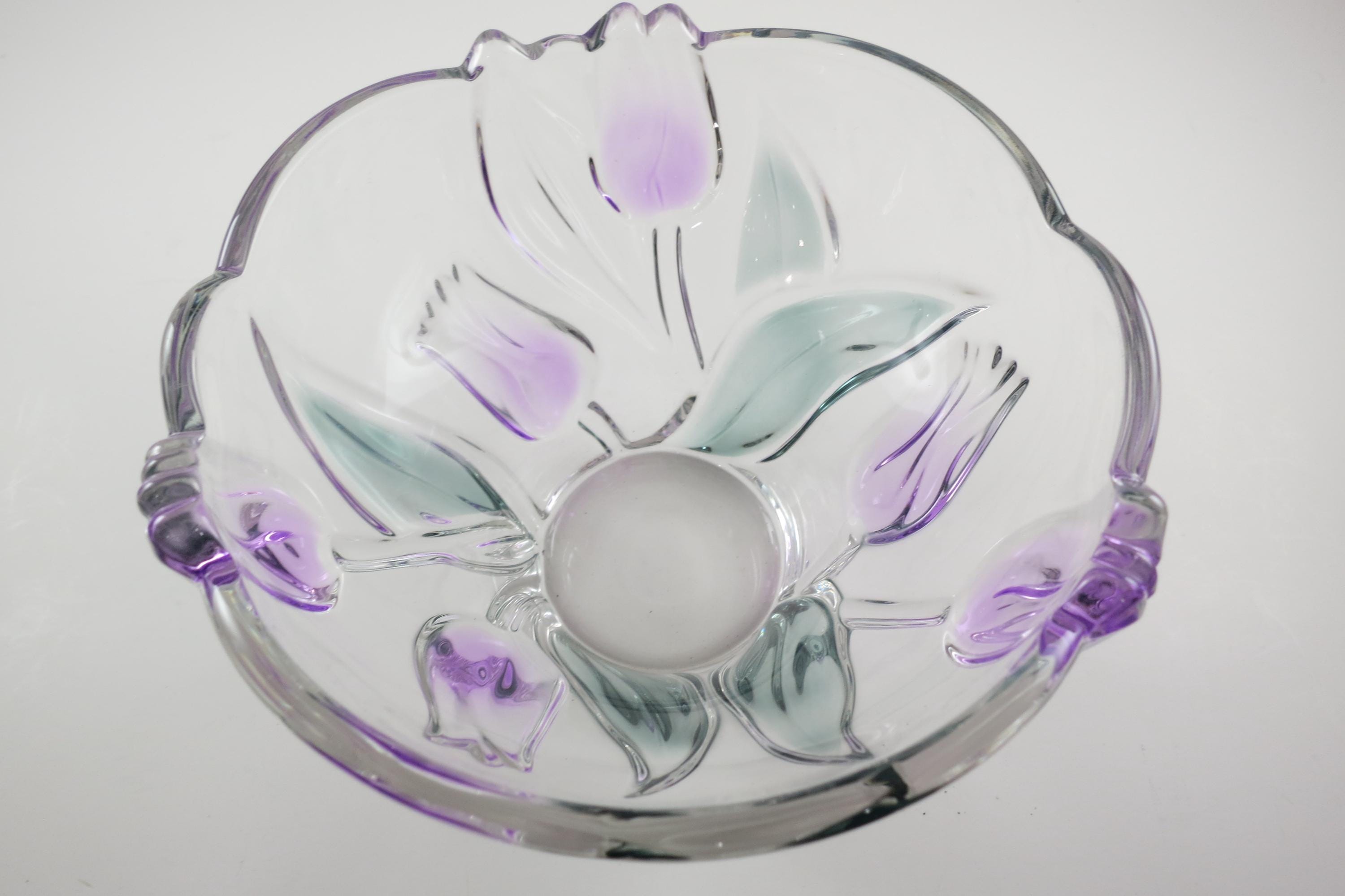 Unbranded Art Glass Clear Bowl Shades of Green and Purple Flowers Excellent Condition. Measures 6 inches diameter and 4 inches tall. Very nice bowl!