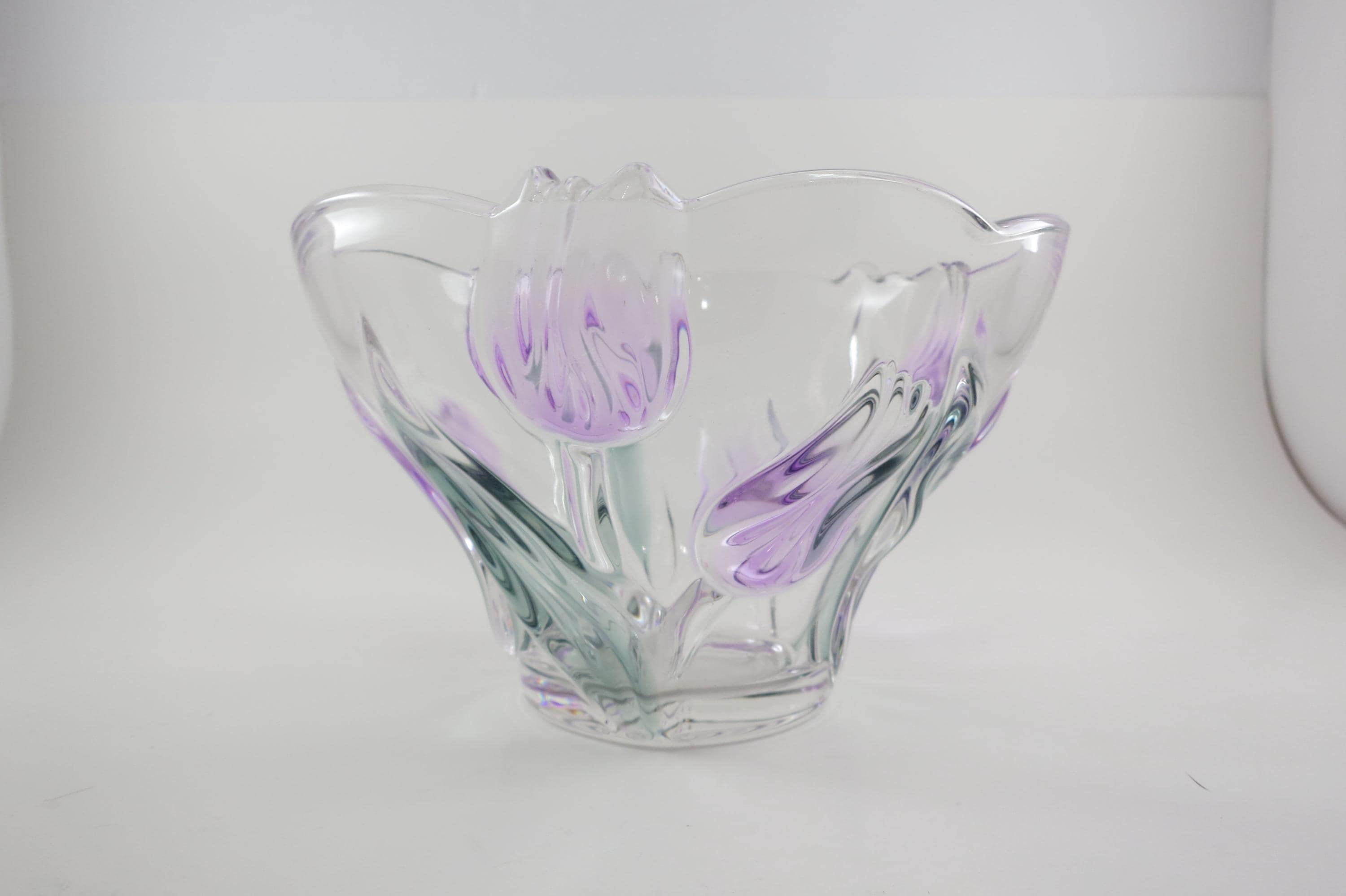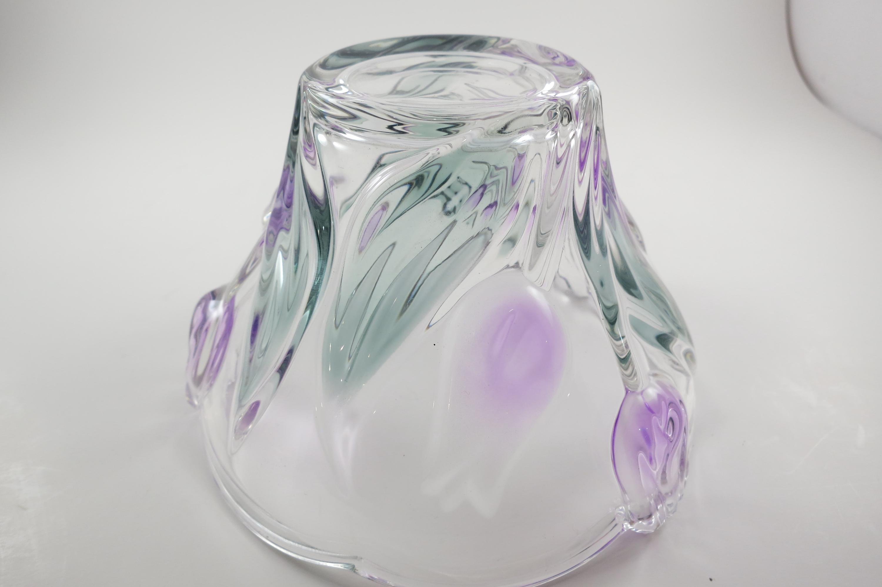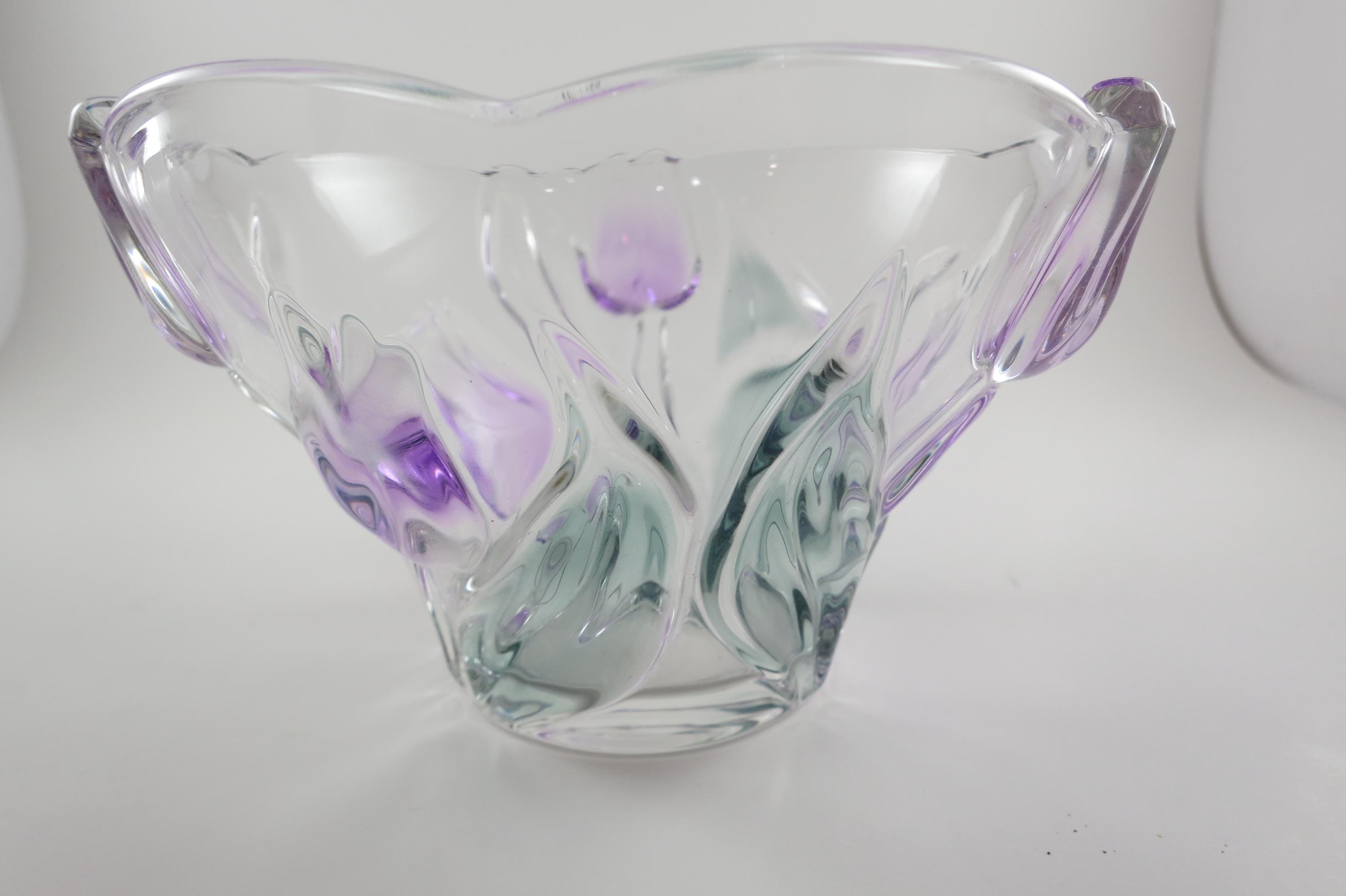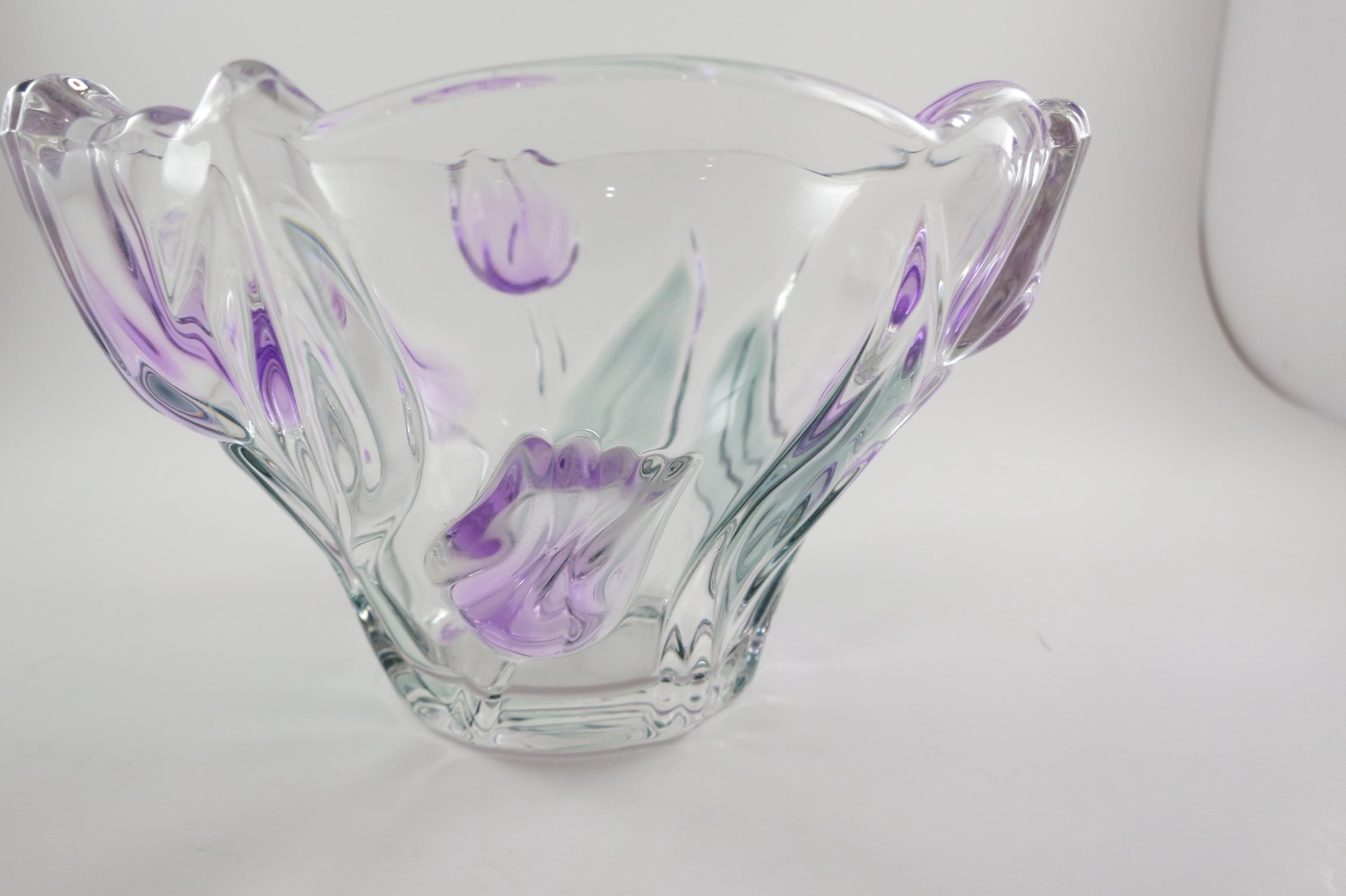 Unbranded Art Glass Clear Bowl Shades of Green and Purple Flowers Excellent Condition. Measures 6 inches diameter and 4 inches tall. Very nice bowl!