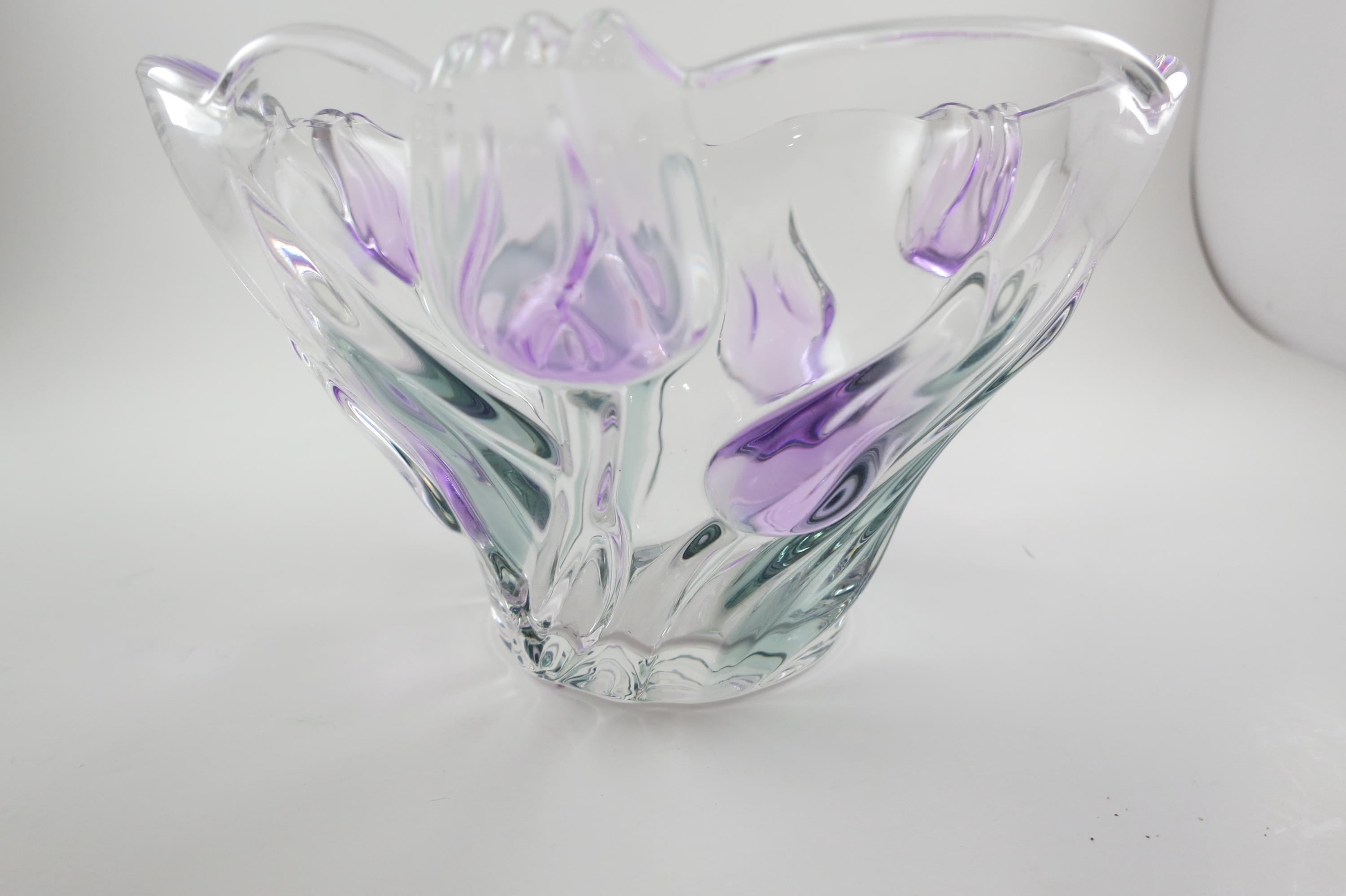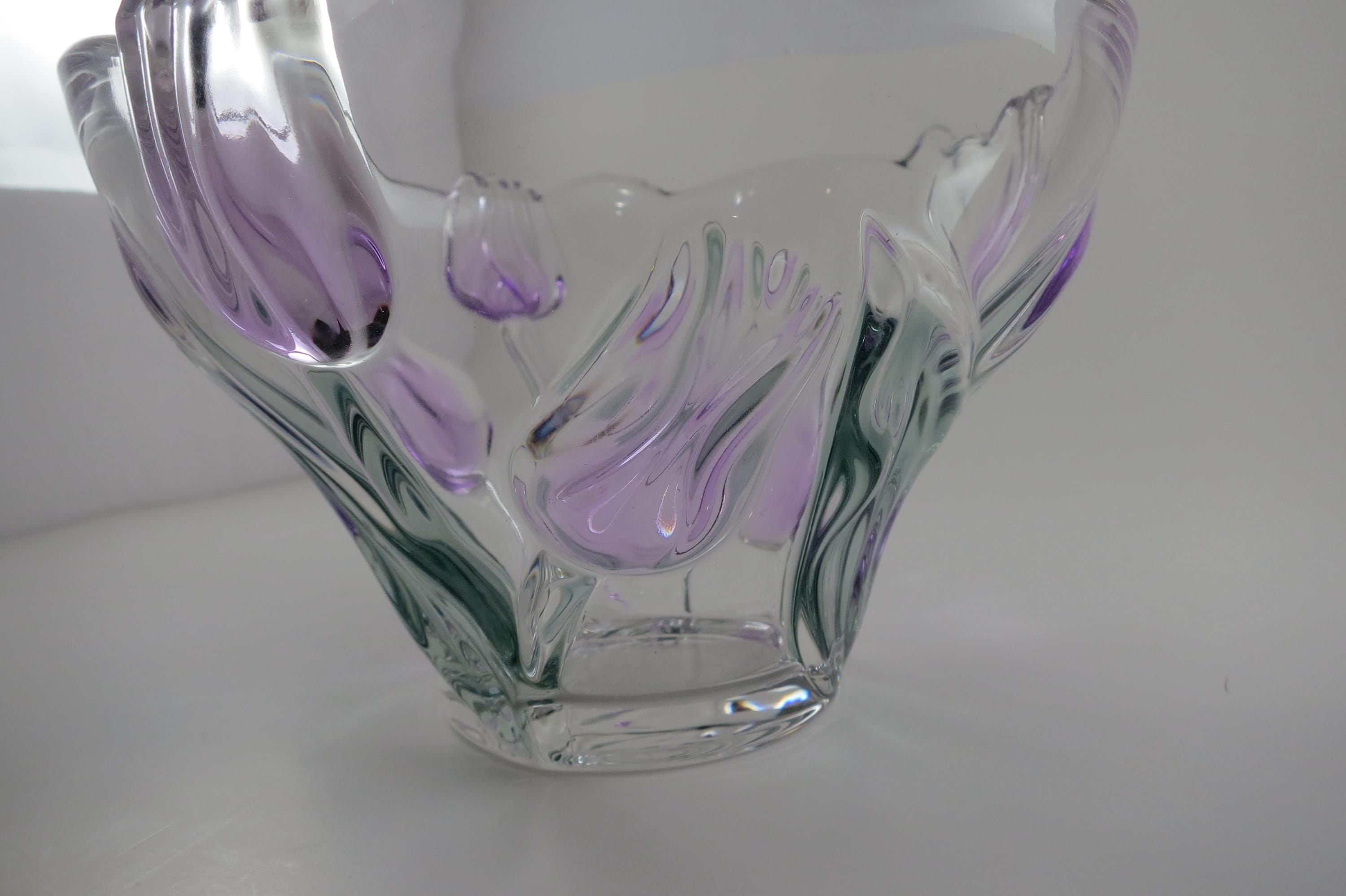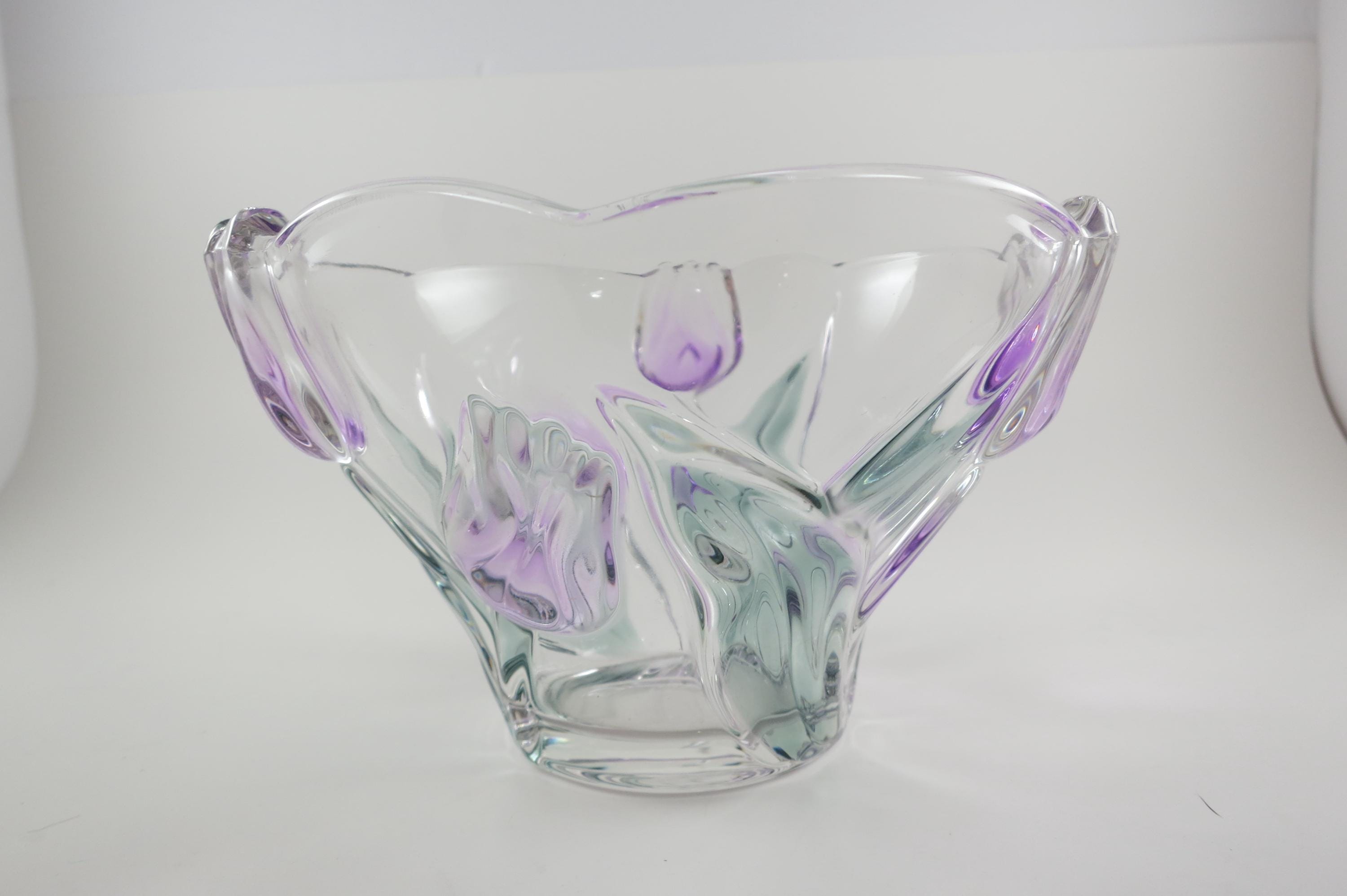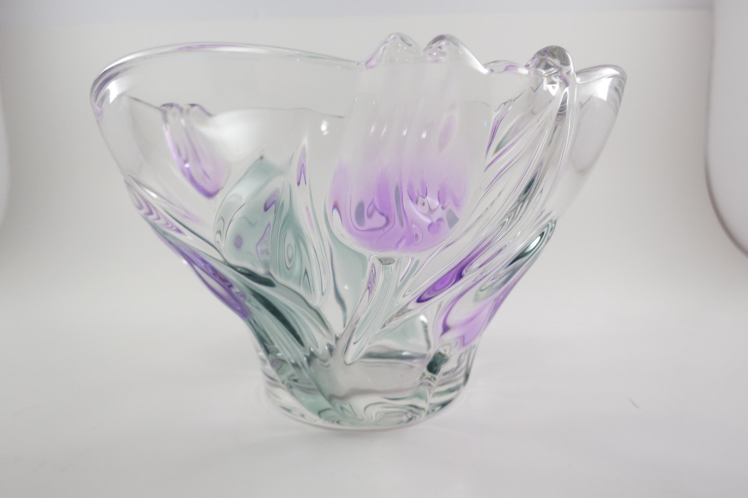 Unbranded Art Glass Clear Bowl Shades of Green and Purple Flowers Excellent Condition. Measures 6 inches diameter and 4 inches tall. Very nice bowl!