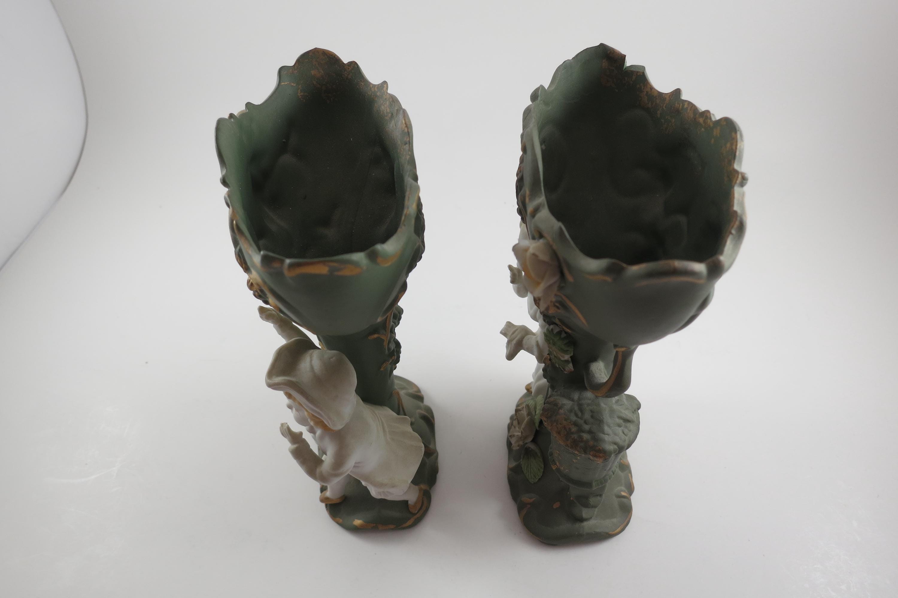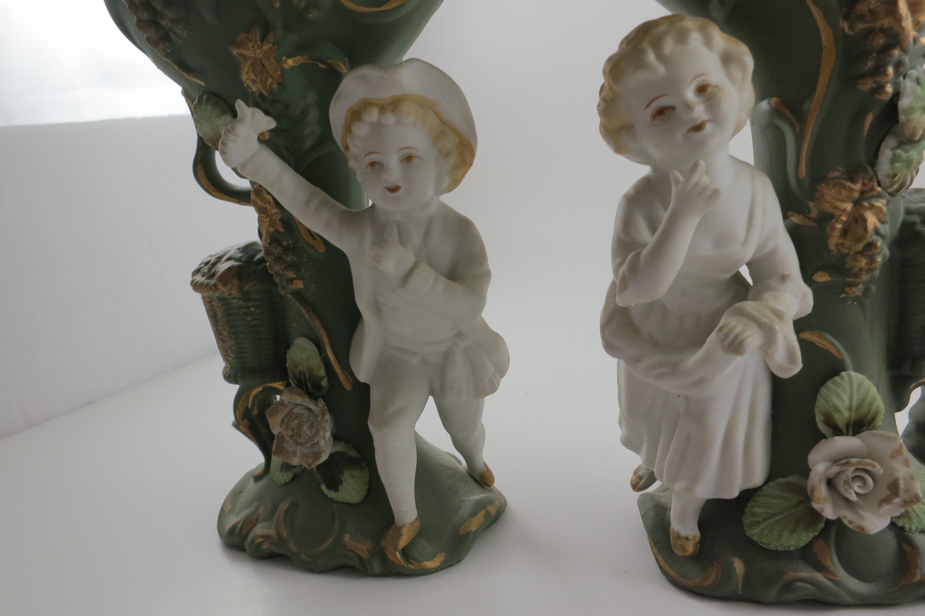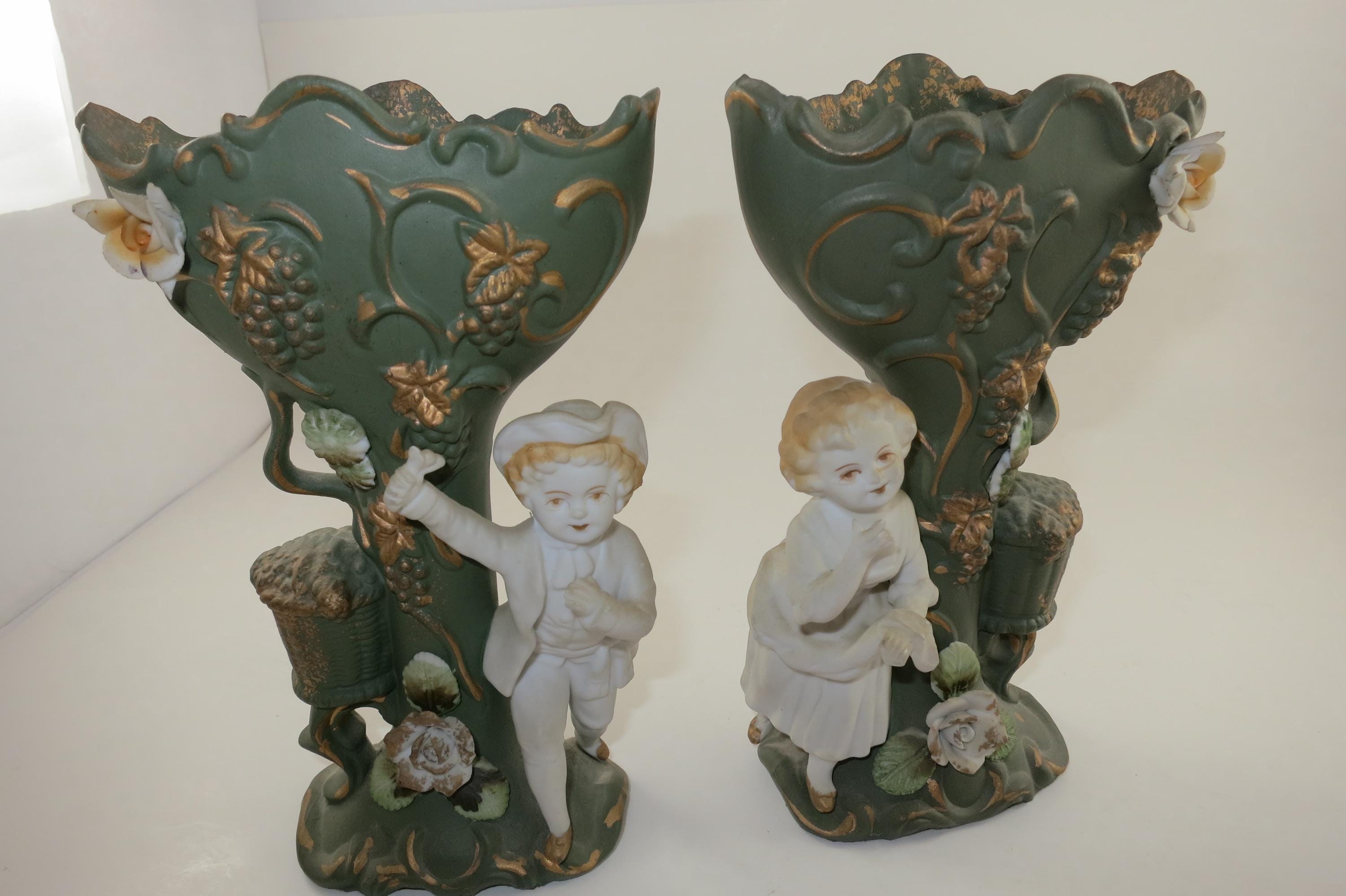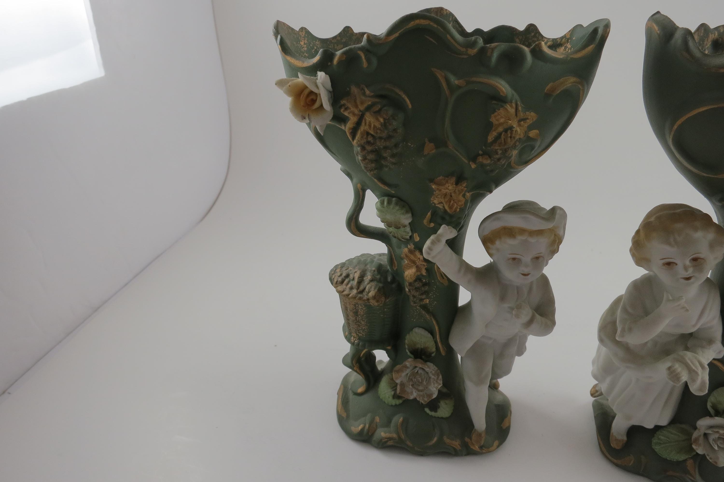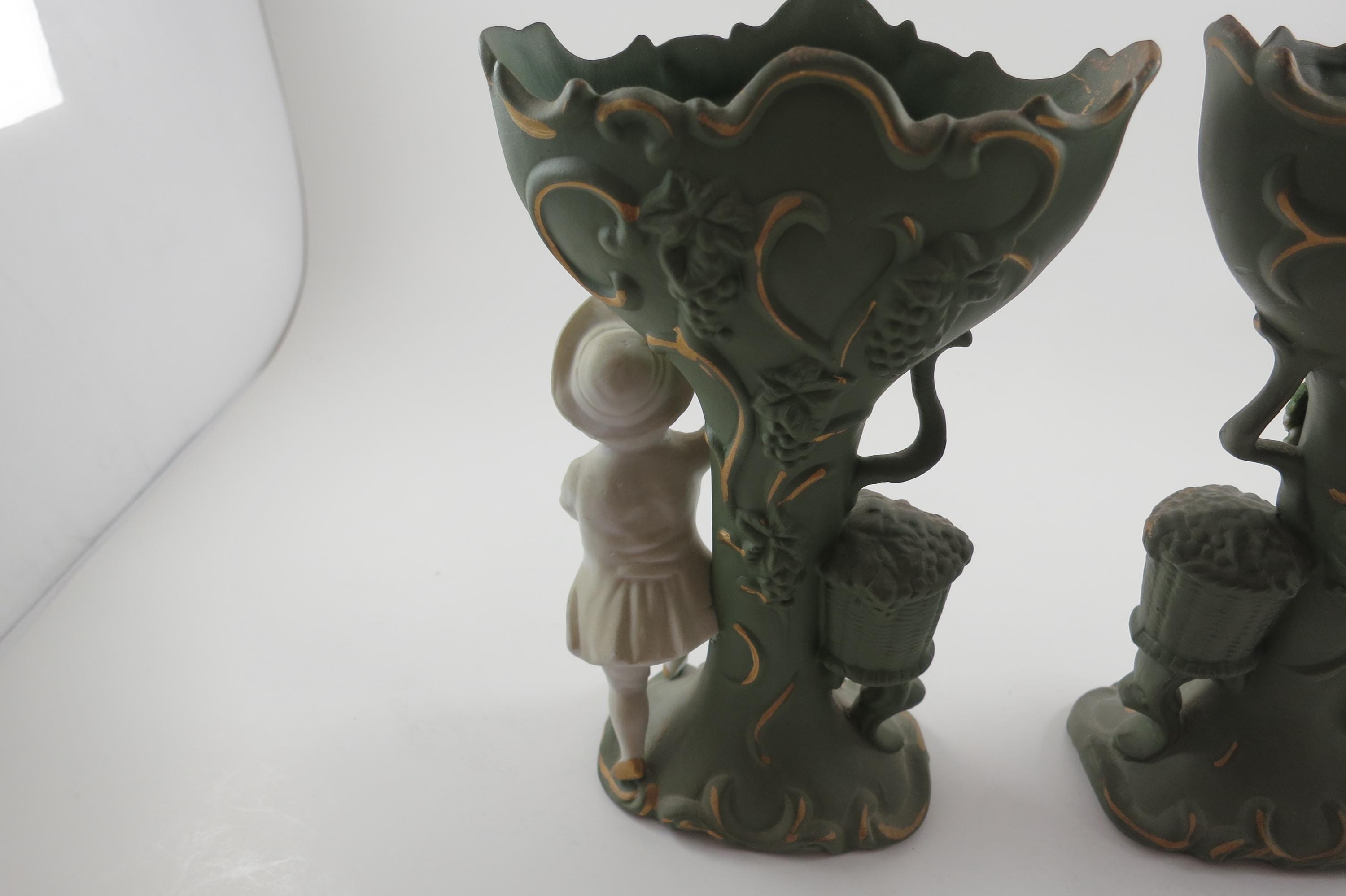 Pair of Vintage Green & White Maiden By The Maple Tree Figures Vases Pockets White Roses Porcelain Beauties. Each measures 7 inches tall and 4 inches wide. These are fabulous ornate pieces that display very nicely.