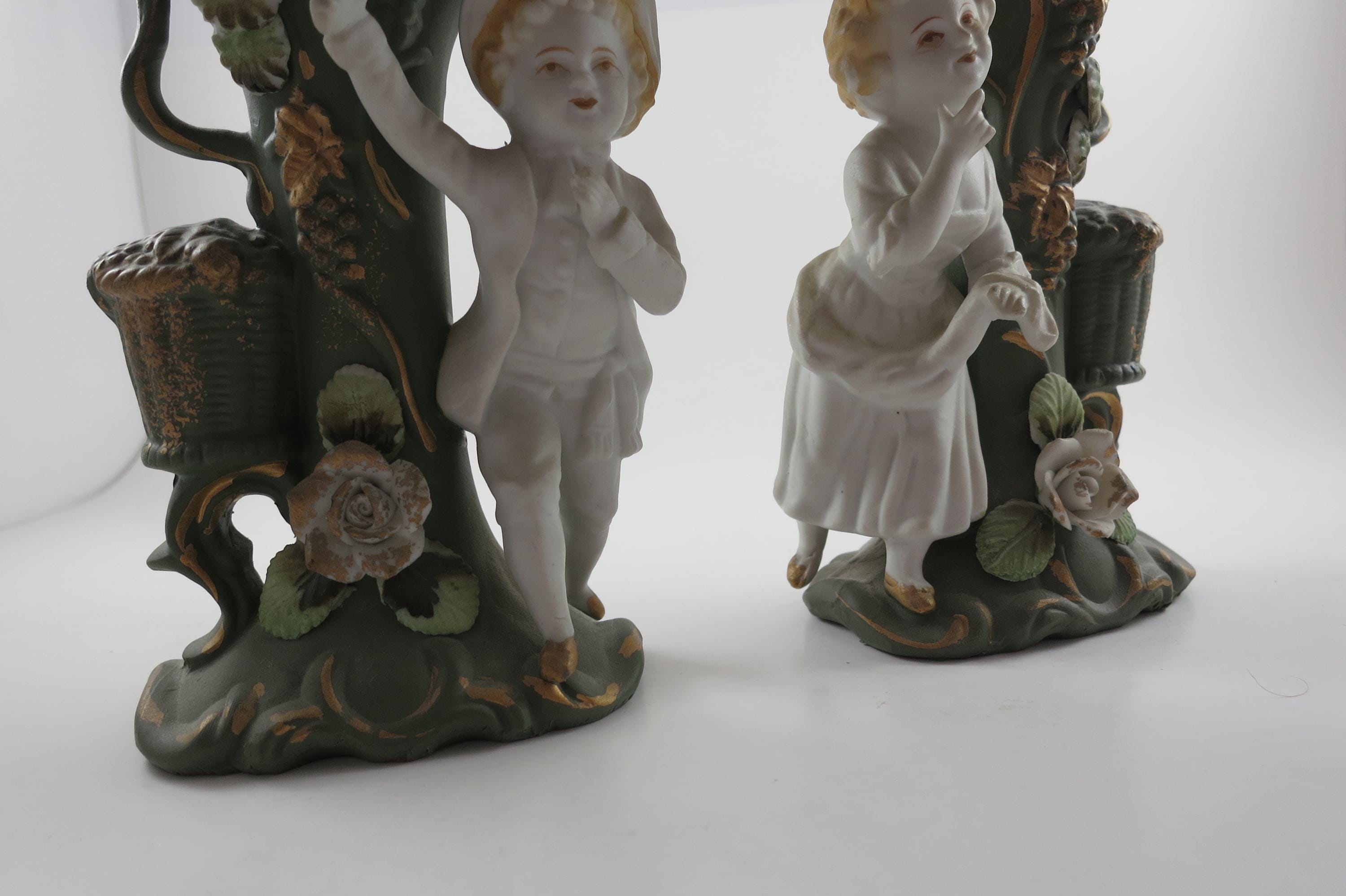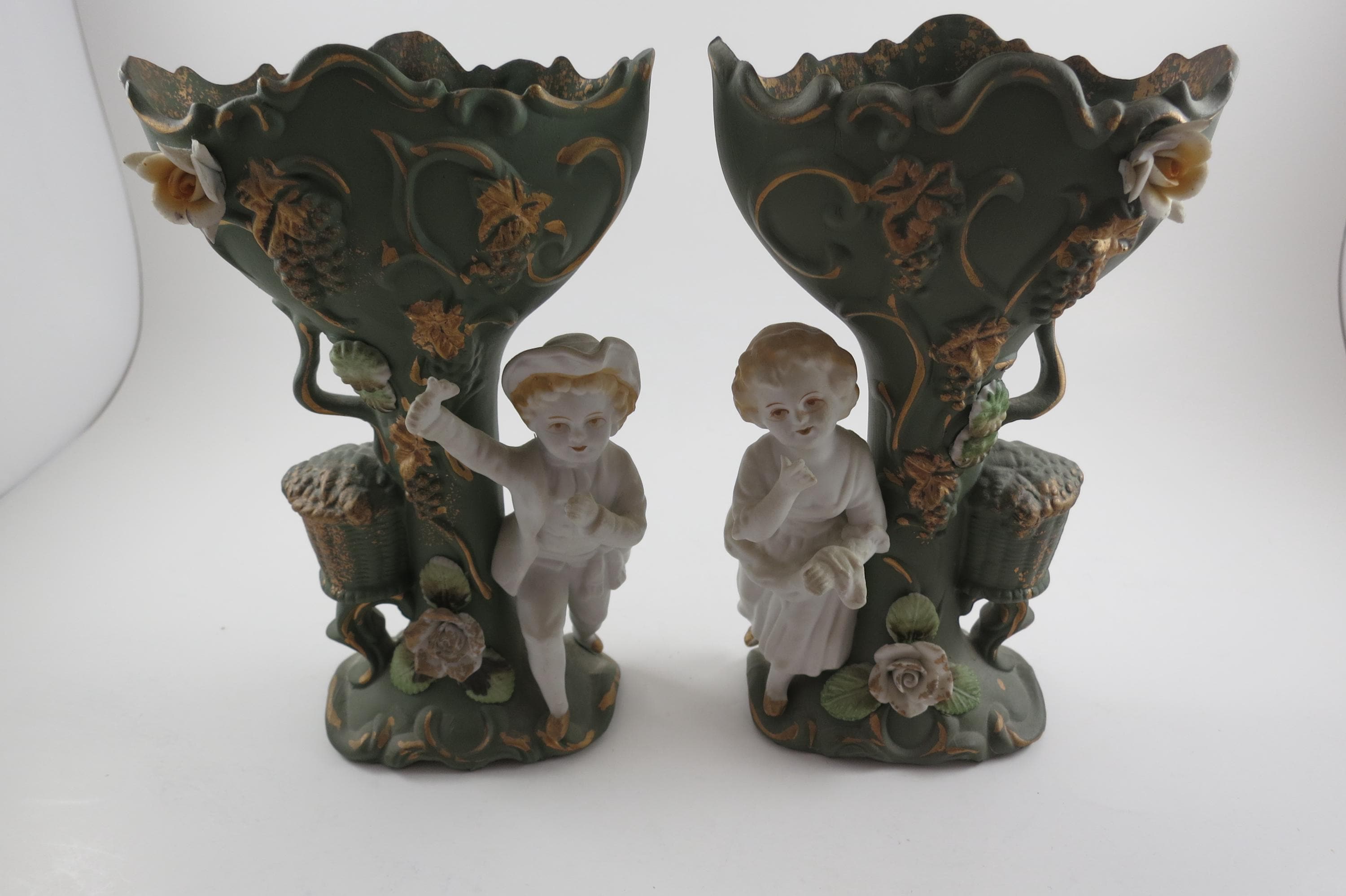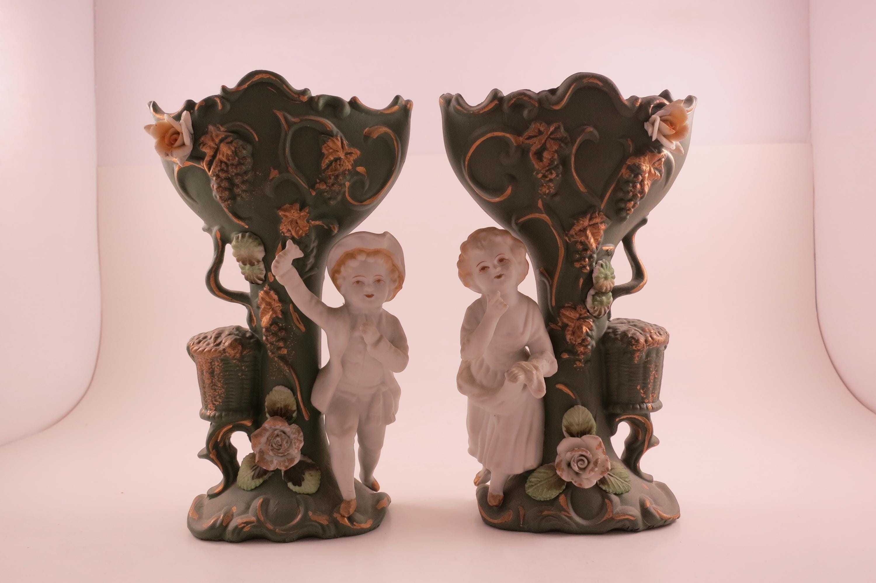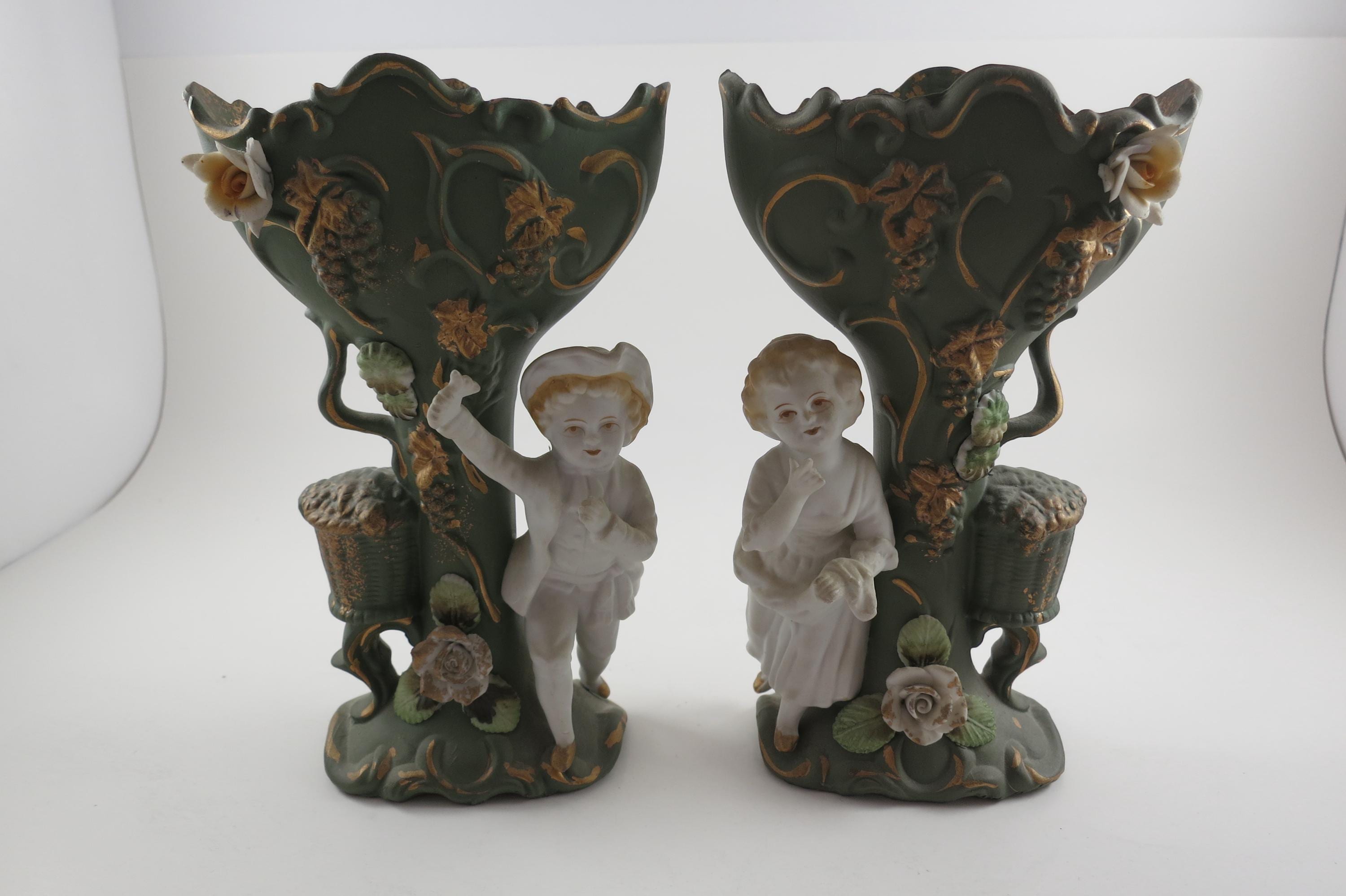 Pair of Vintage Green & White Maiden By The Maple Tree Figures Vases Pockets White Roses Porcelain Beauties. Each measures 7 inches tall and 4 inches wide. These are fabulous ornate pieces that display very nicely.