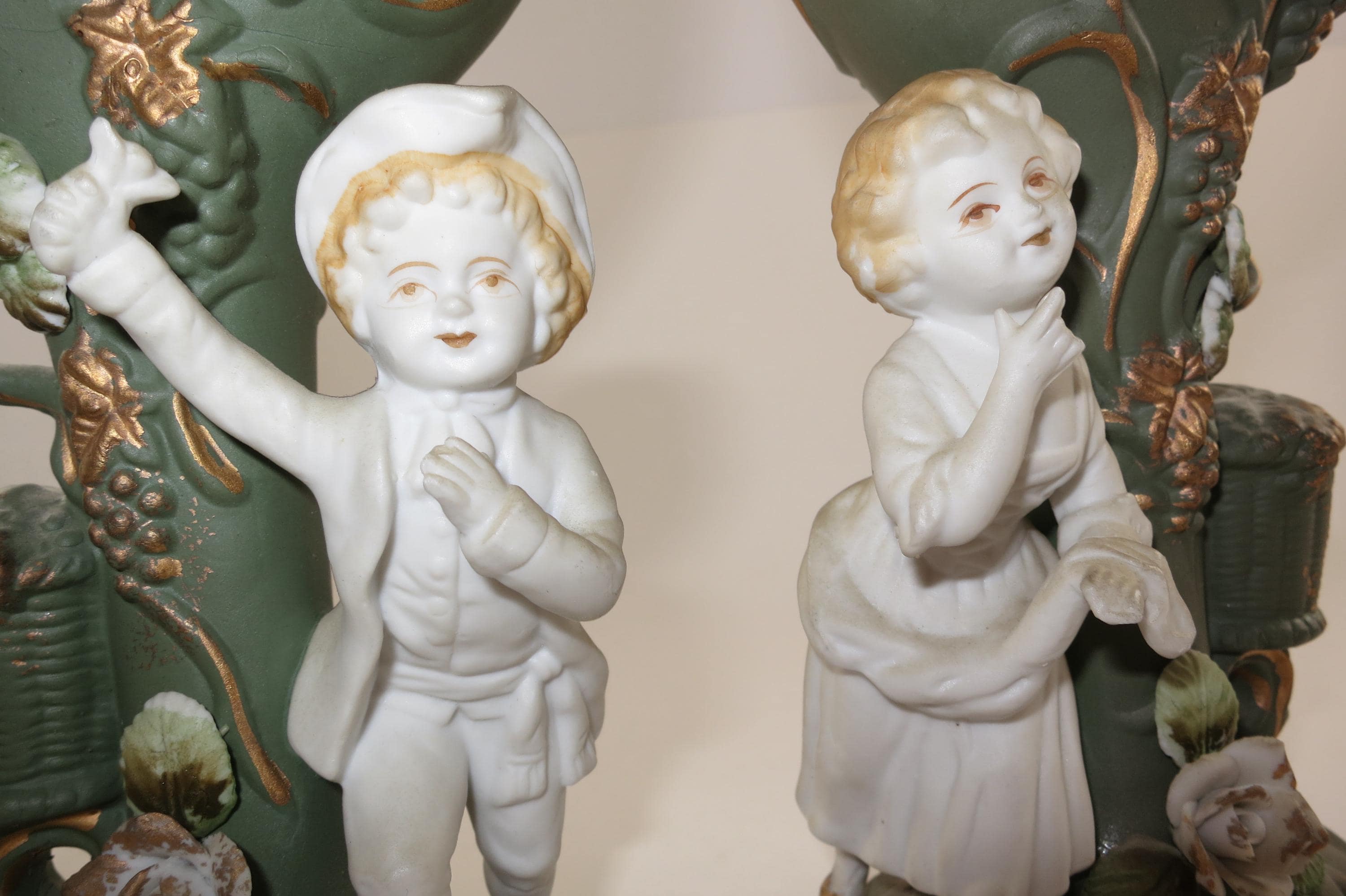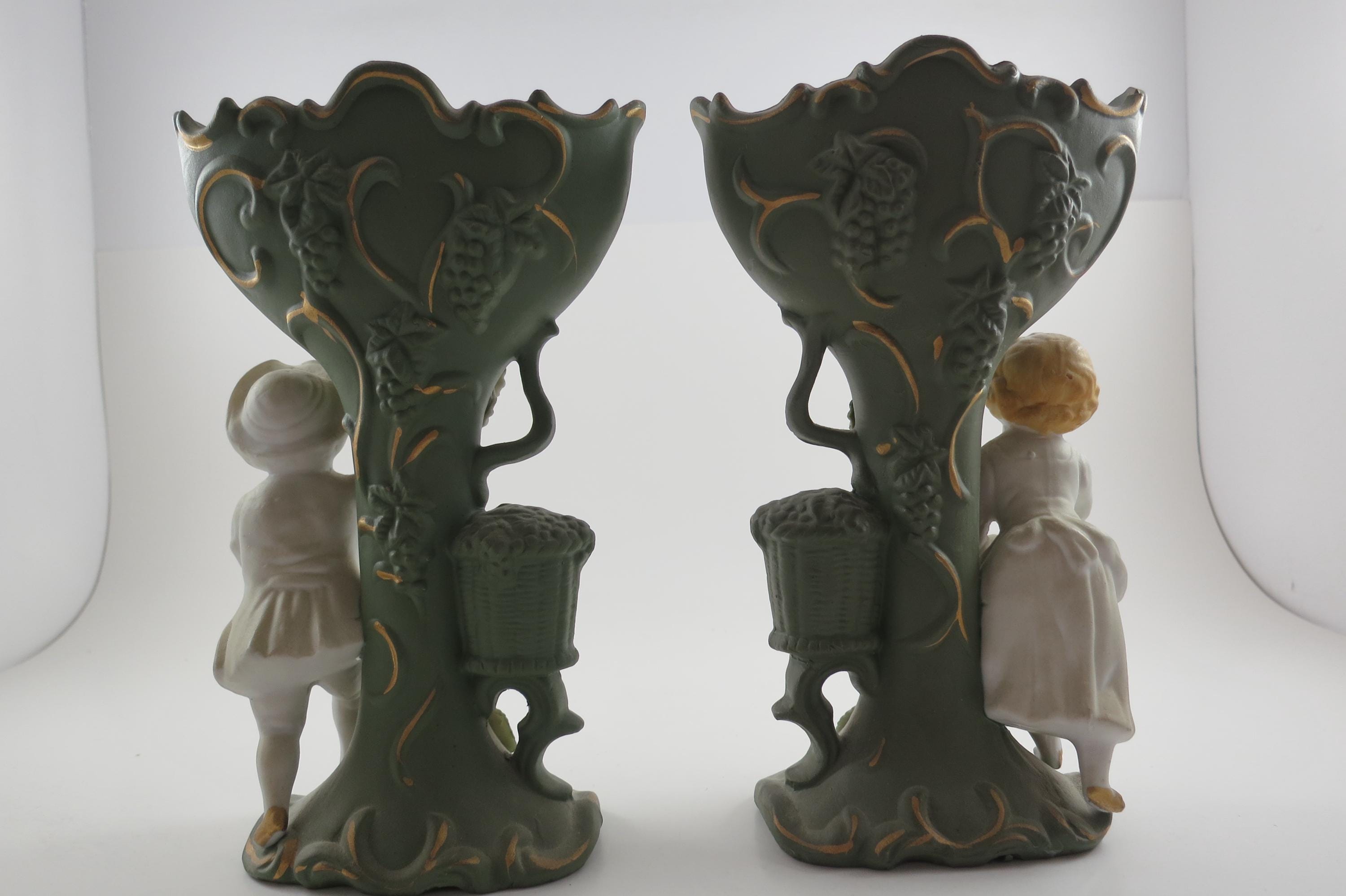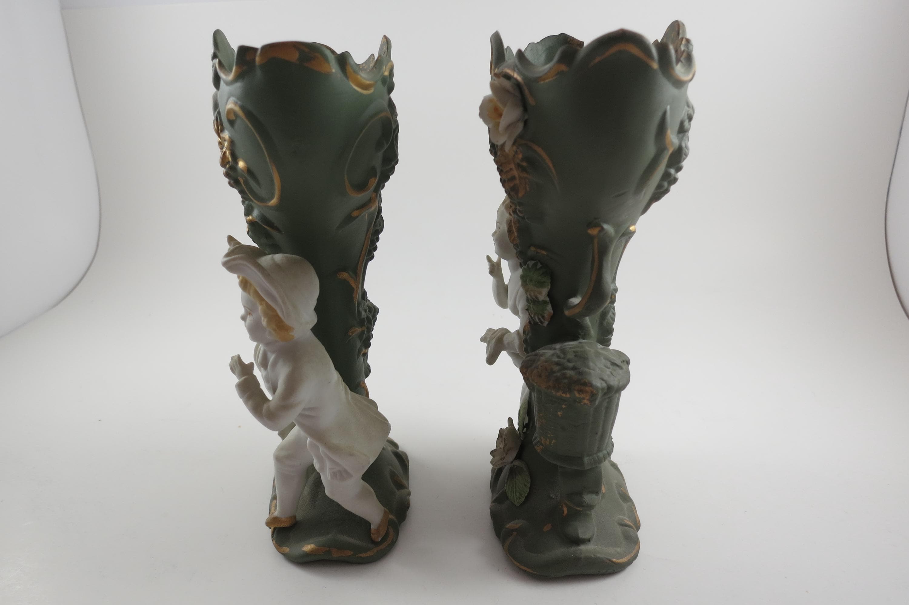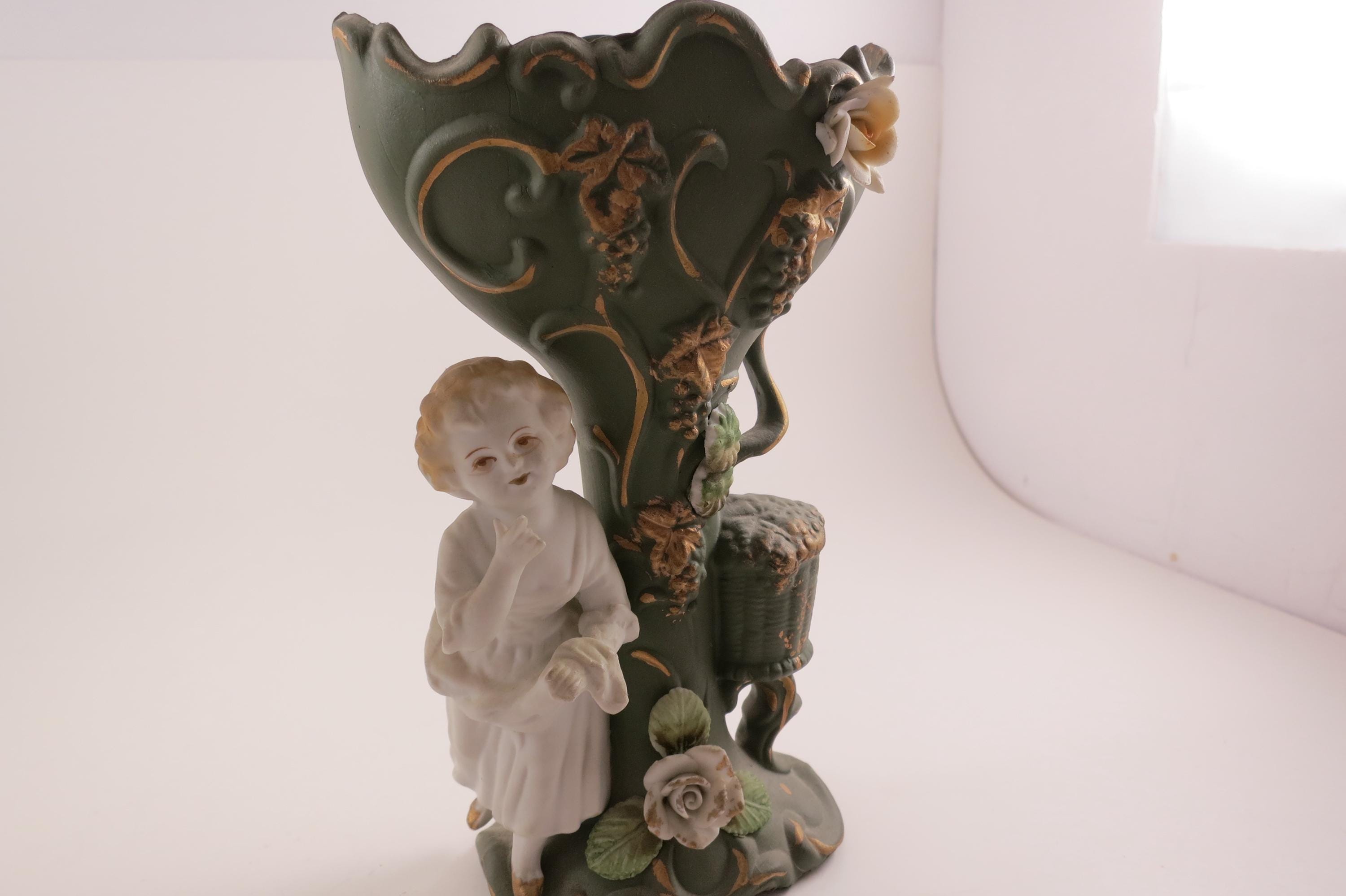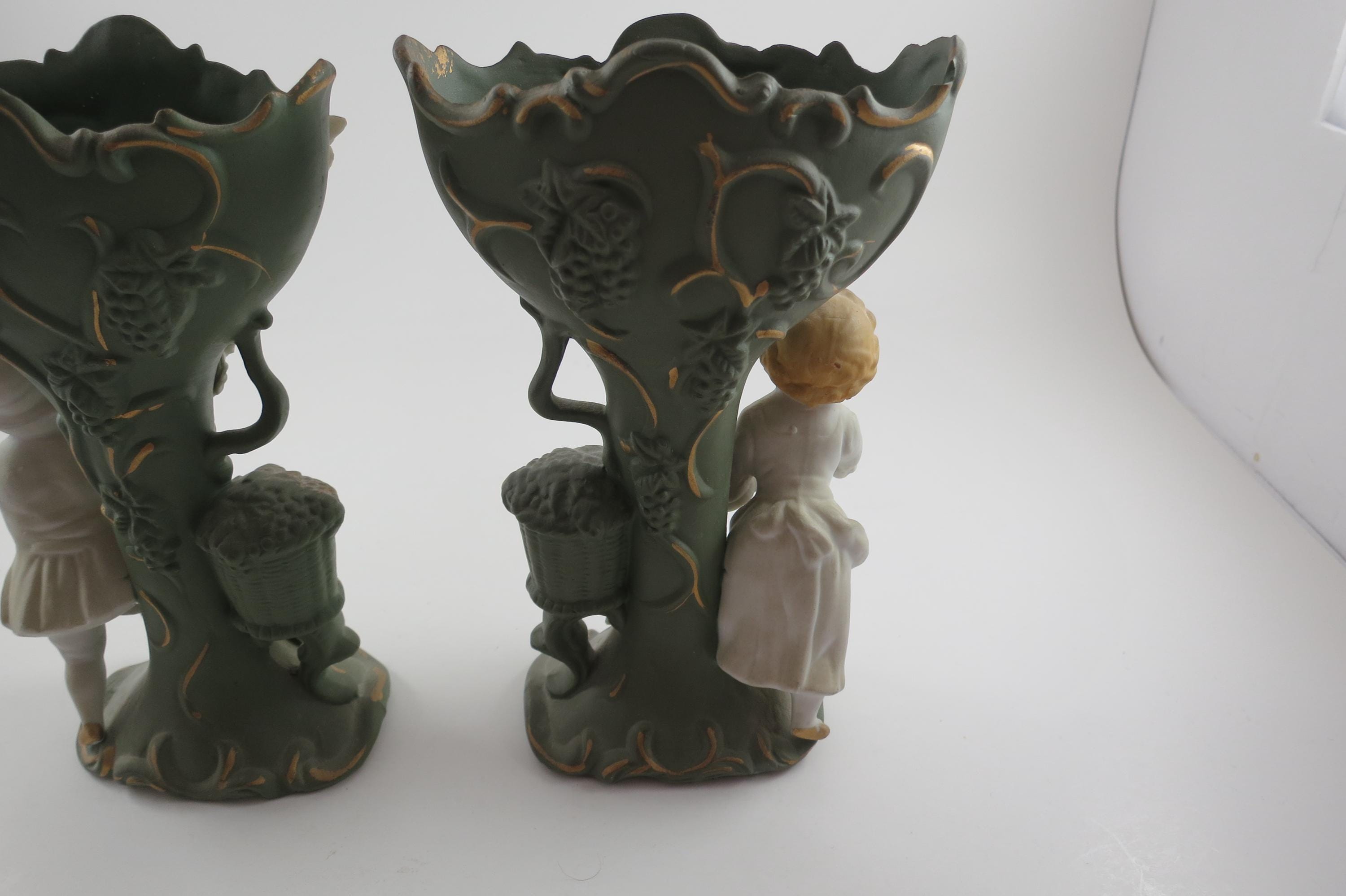 Pair of Vintage Green & White Maiden By The Maple Tree Figures Vases Pockets White Roses Porcelain Beauties. Each measures 7 inches tall and 4 inches wide. These are fabulous ornate pieces that display very nicely.