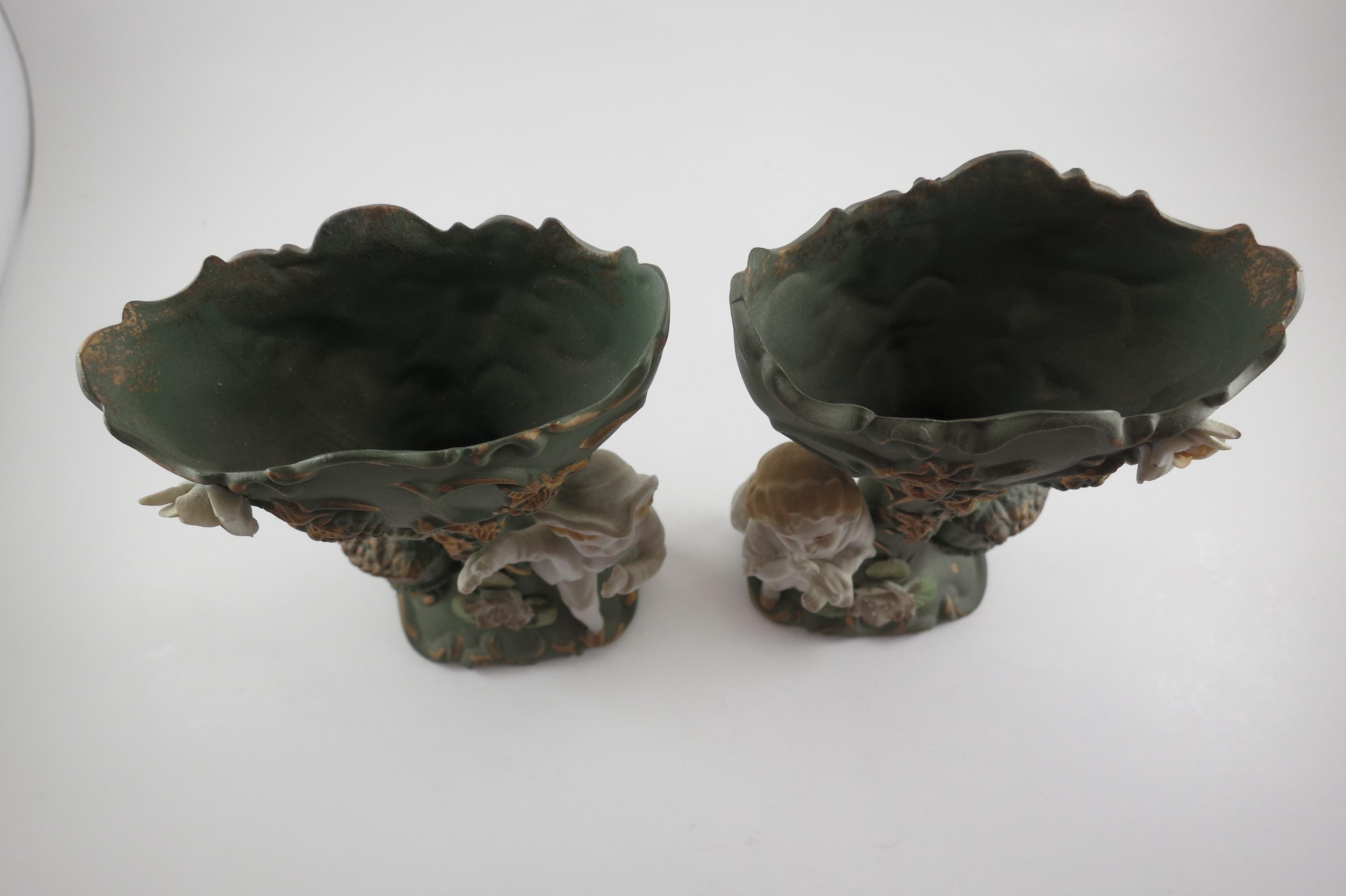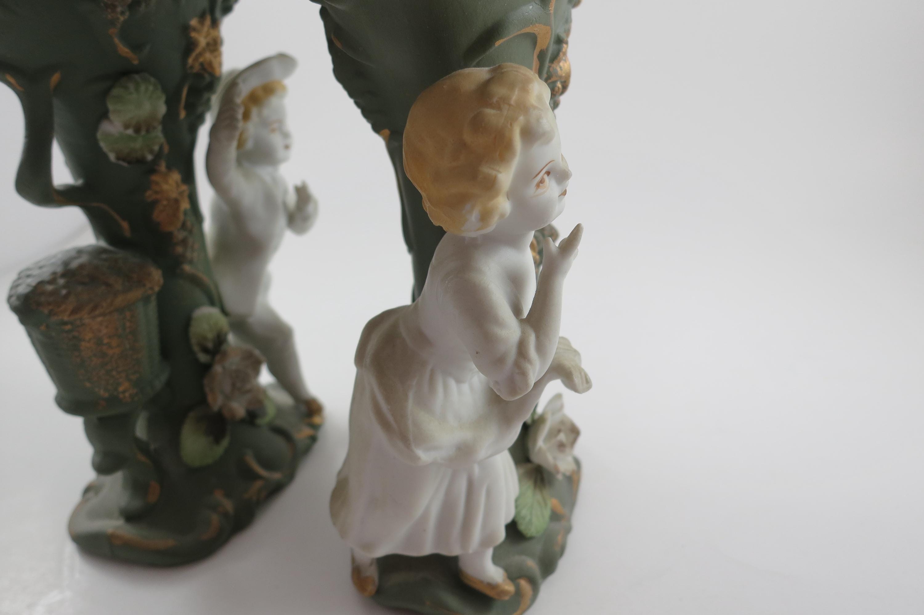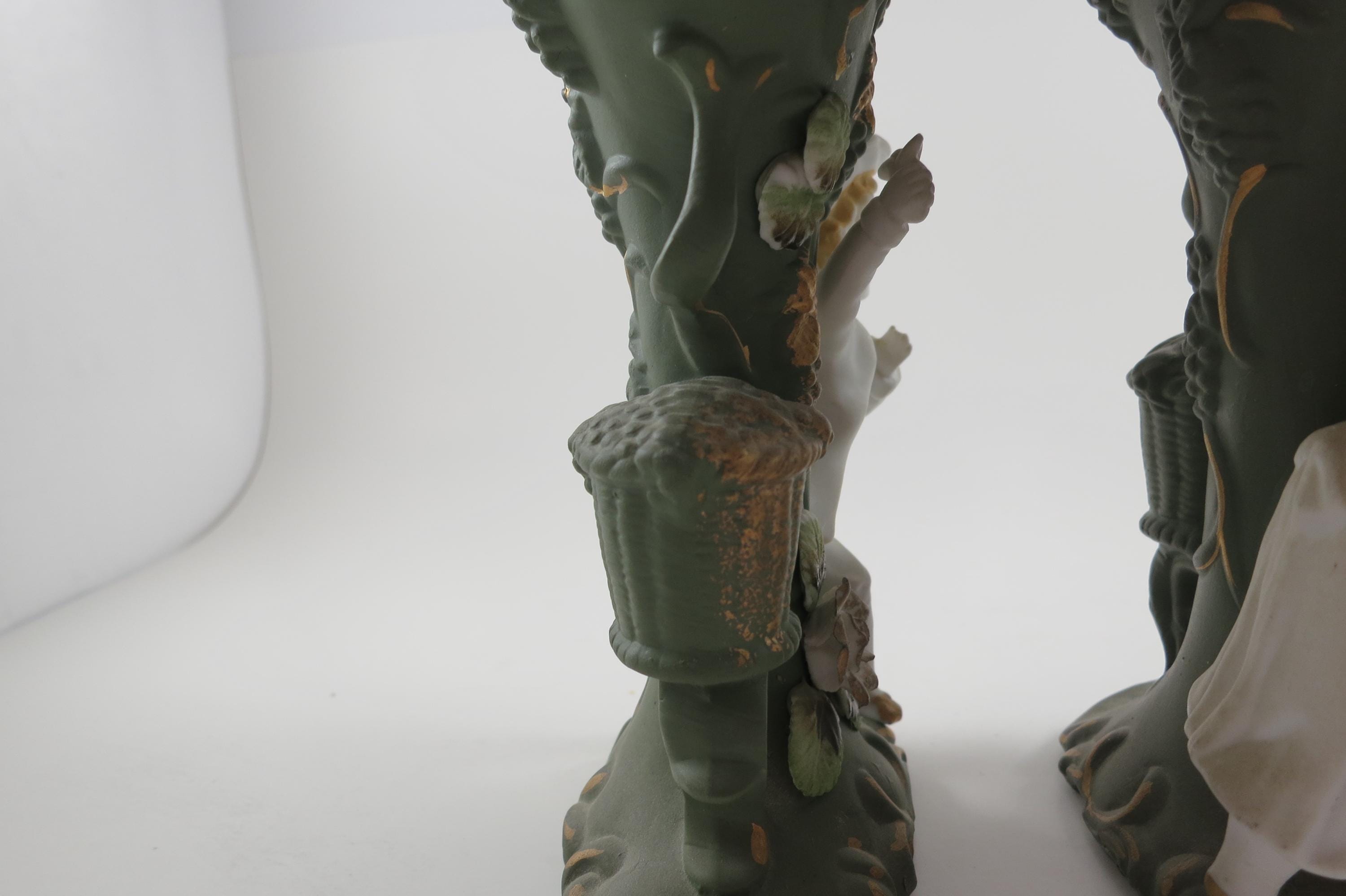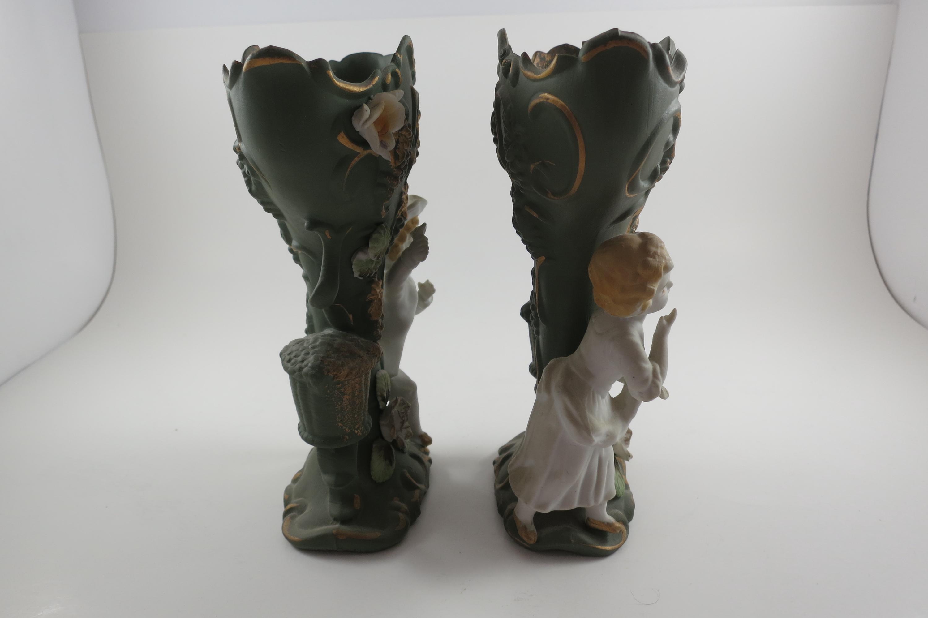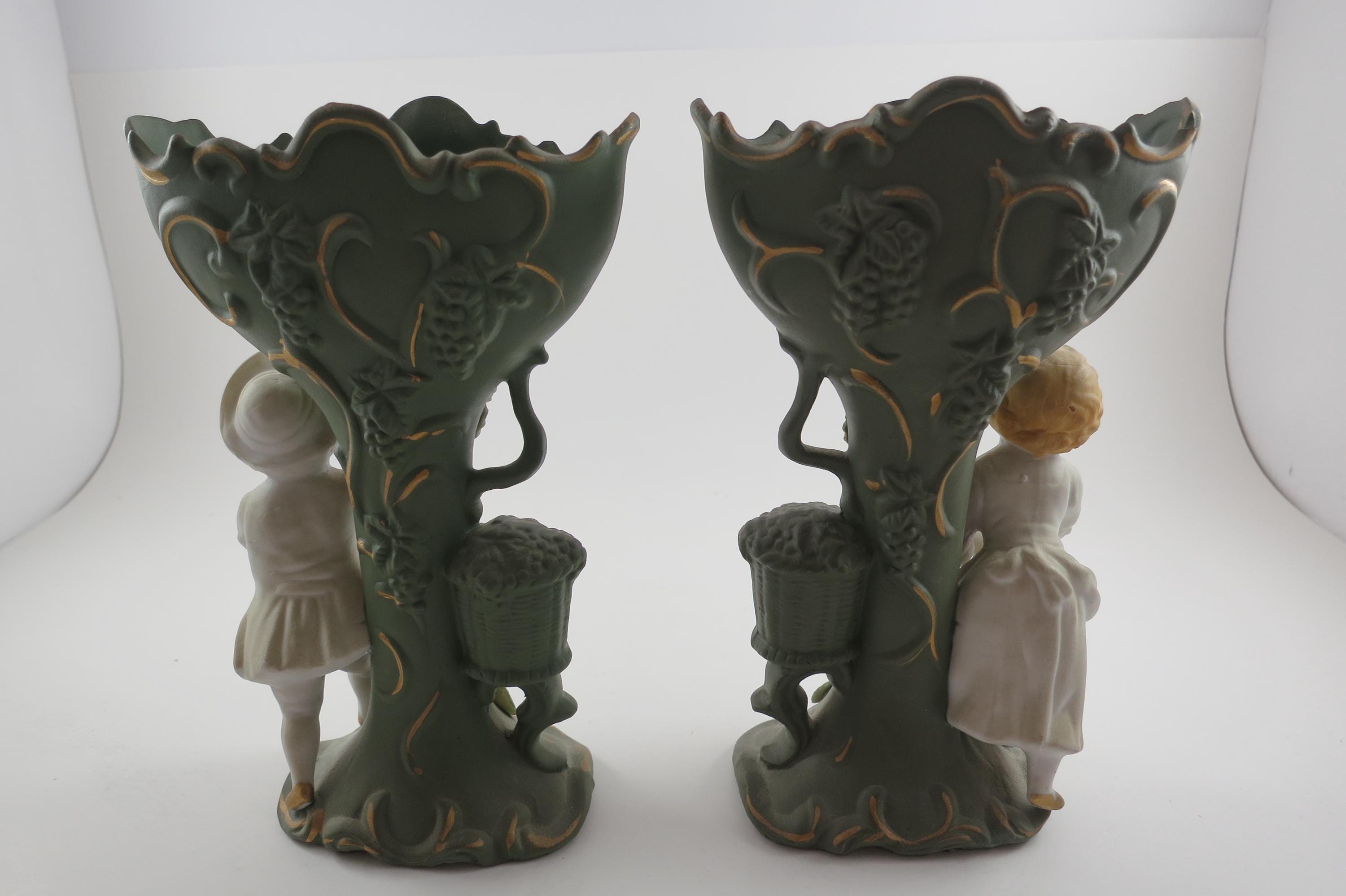 Pair of Vintage Green & White Maiden By The Maple Tree Figures Vases Pockets White Roses Porcelain Beauties. Each measures 7 inches tall and 4 inches wide. These are fabulous ornate pieces that display very nicely.