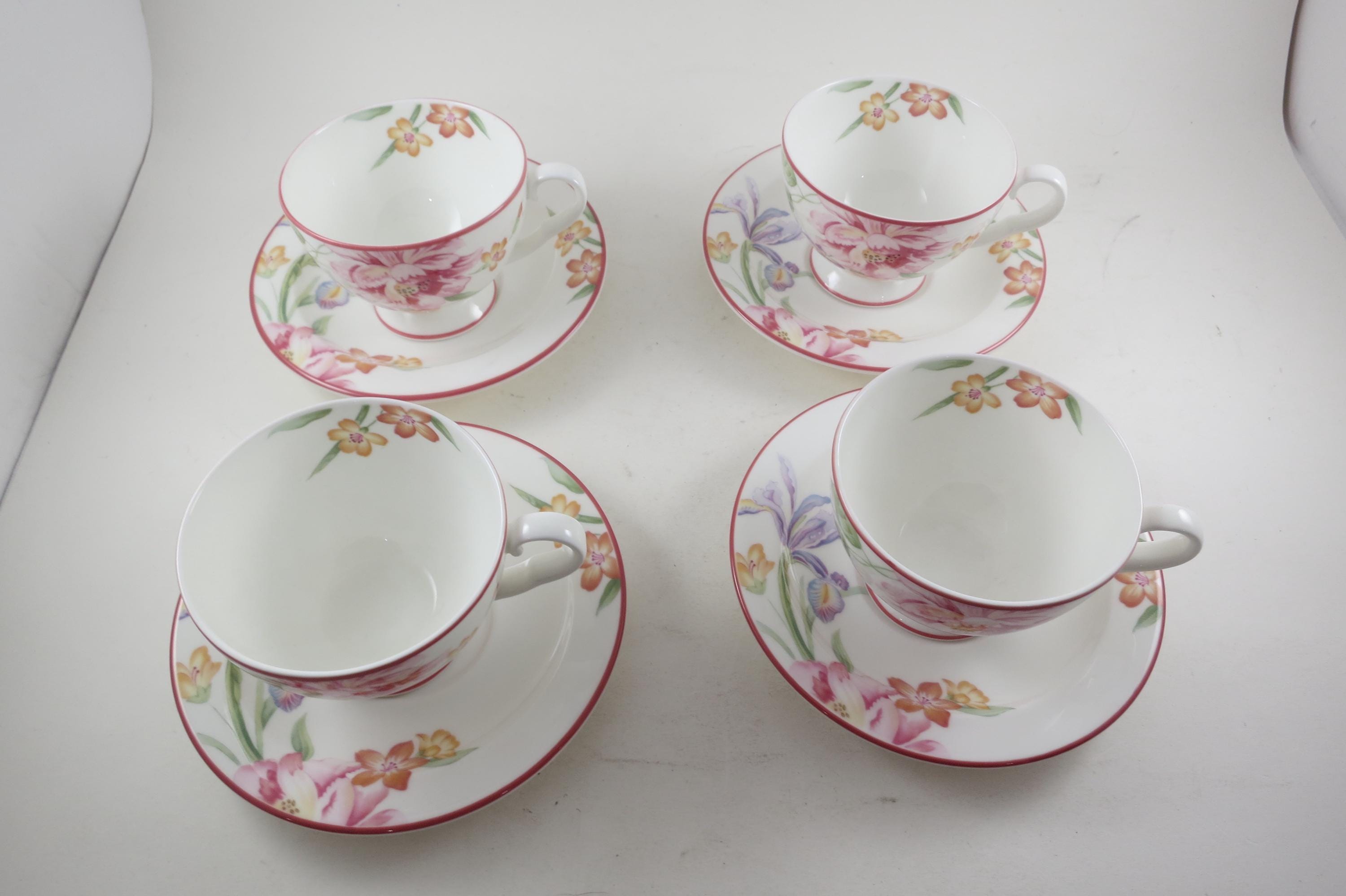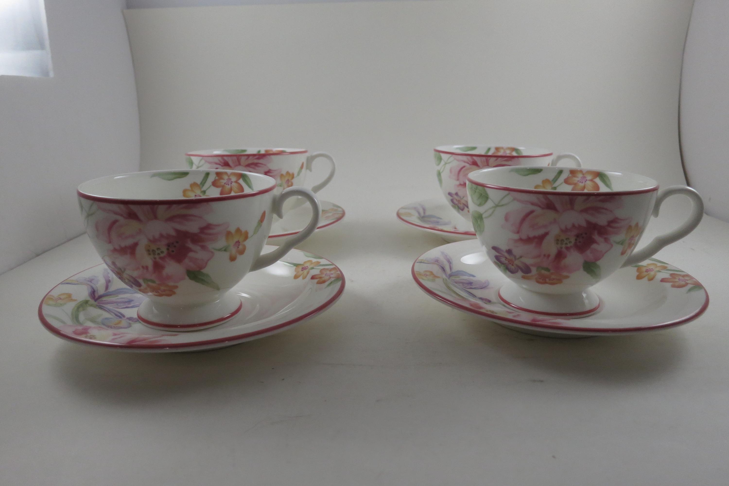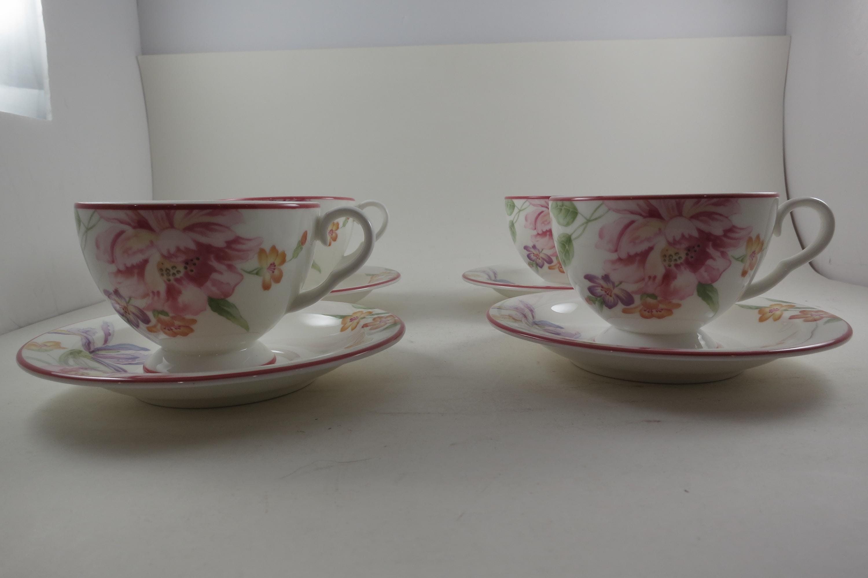 This listing is for a set of four cup and saucer sets. They are in pristine condition and look like they were never used.