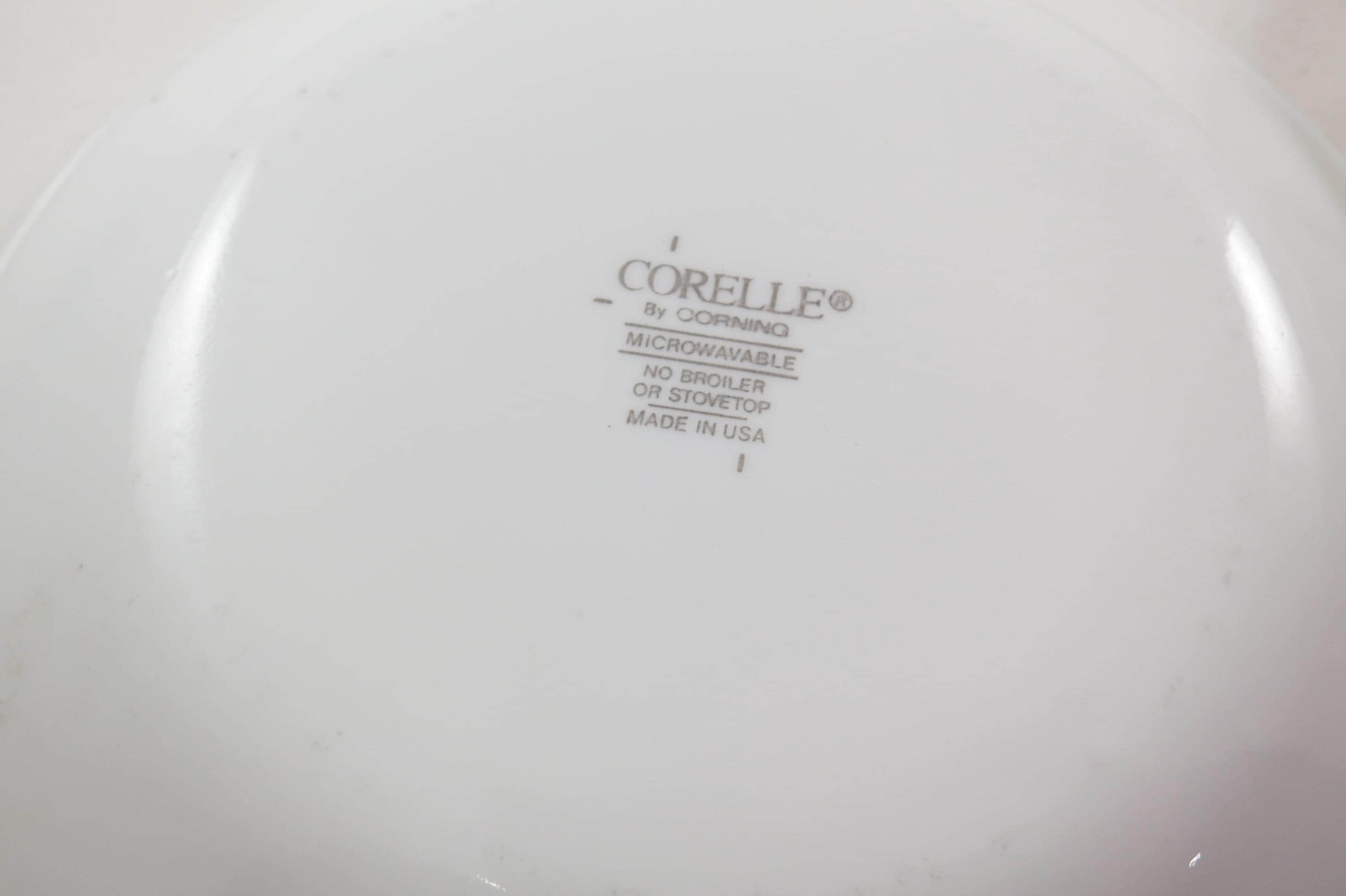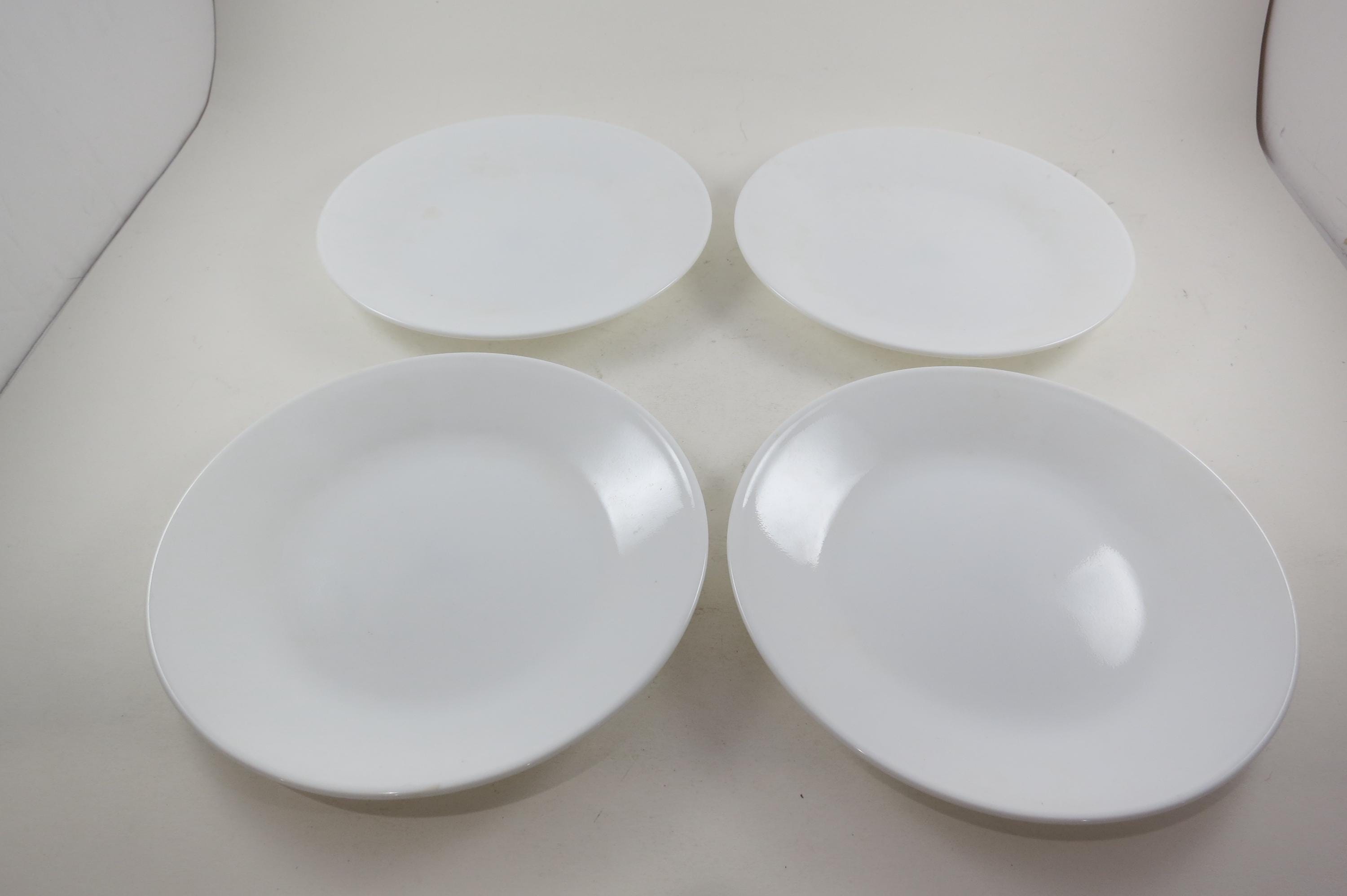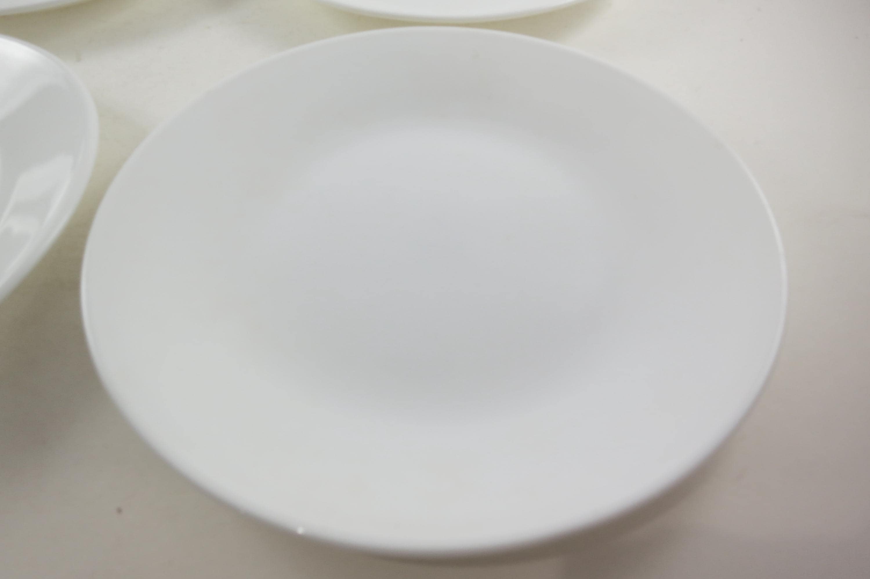 Set of Four Vintage Corelle by Corning Vitrelle White Pattern 6 3/4 Inch Bread Plates Very Good Used Condition. No chips, cracks or damages. These show light use wear.