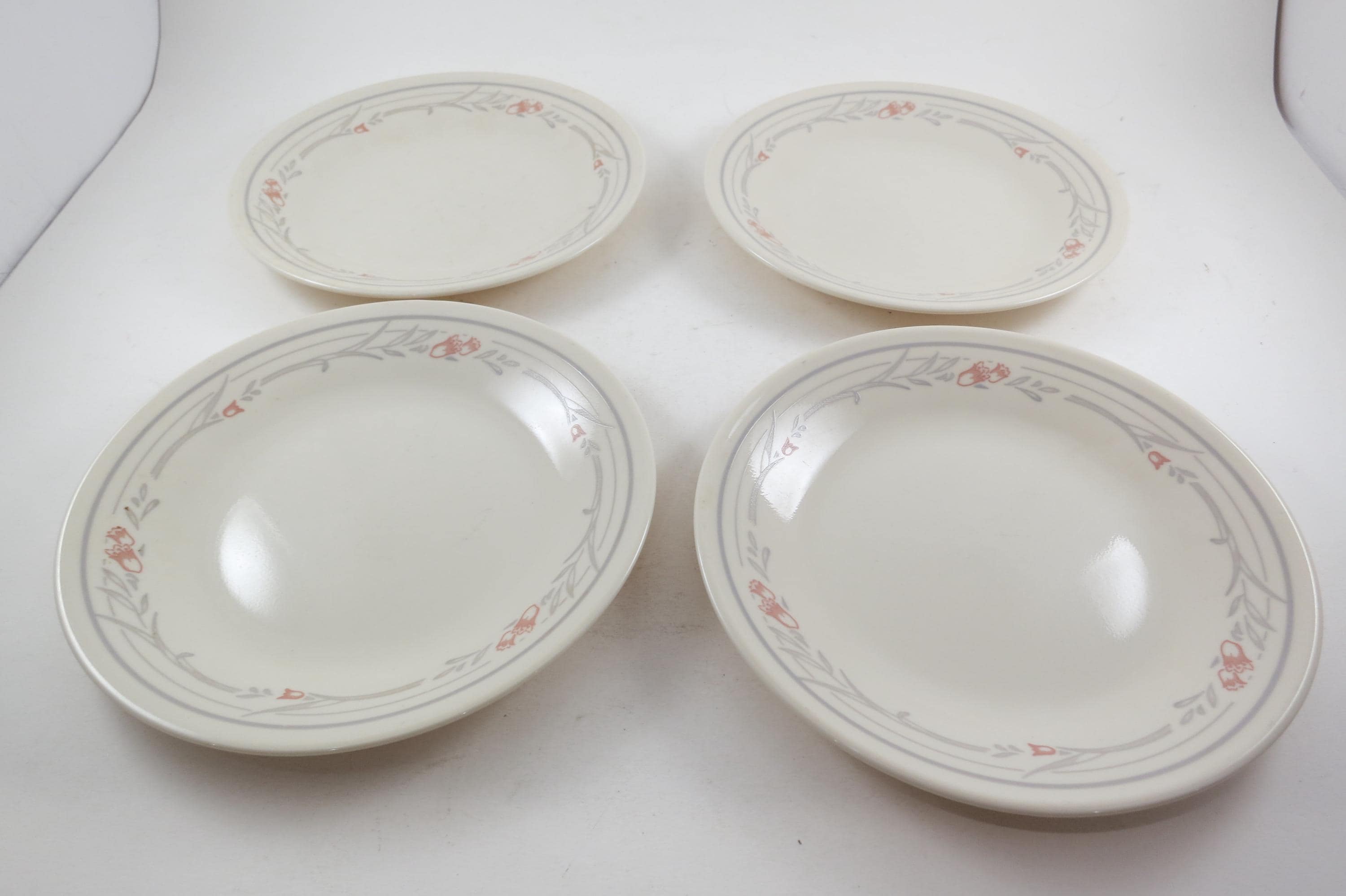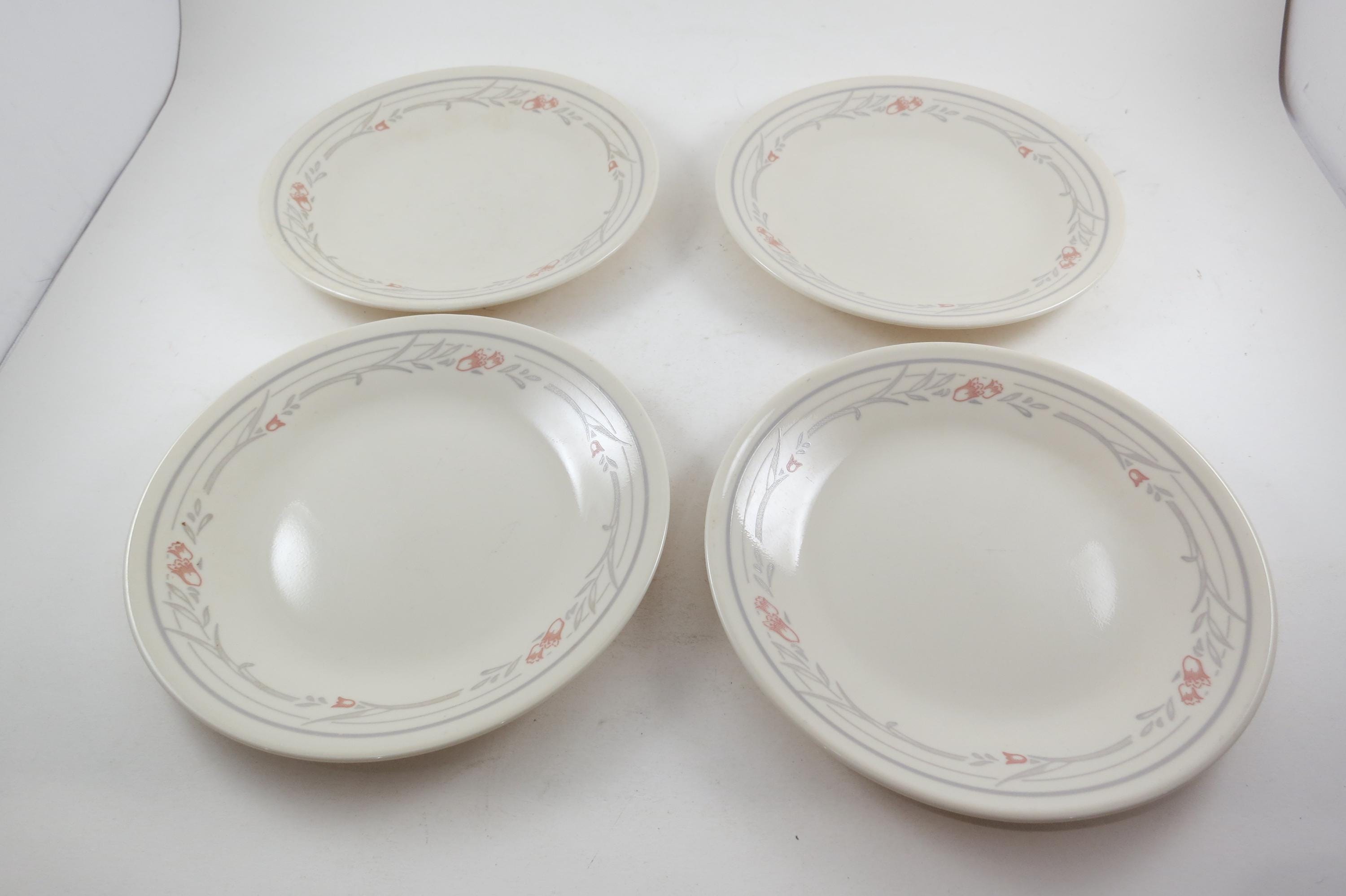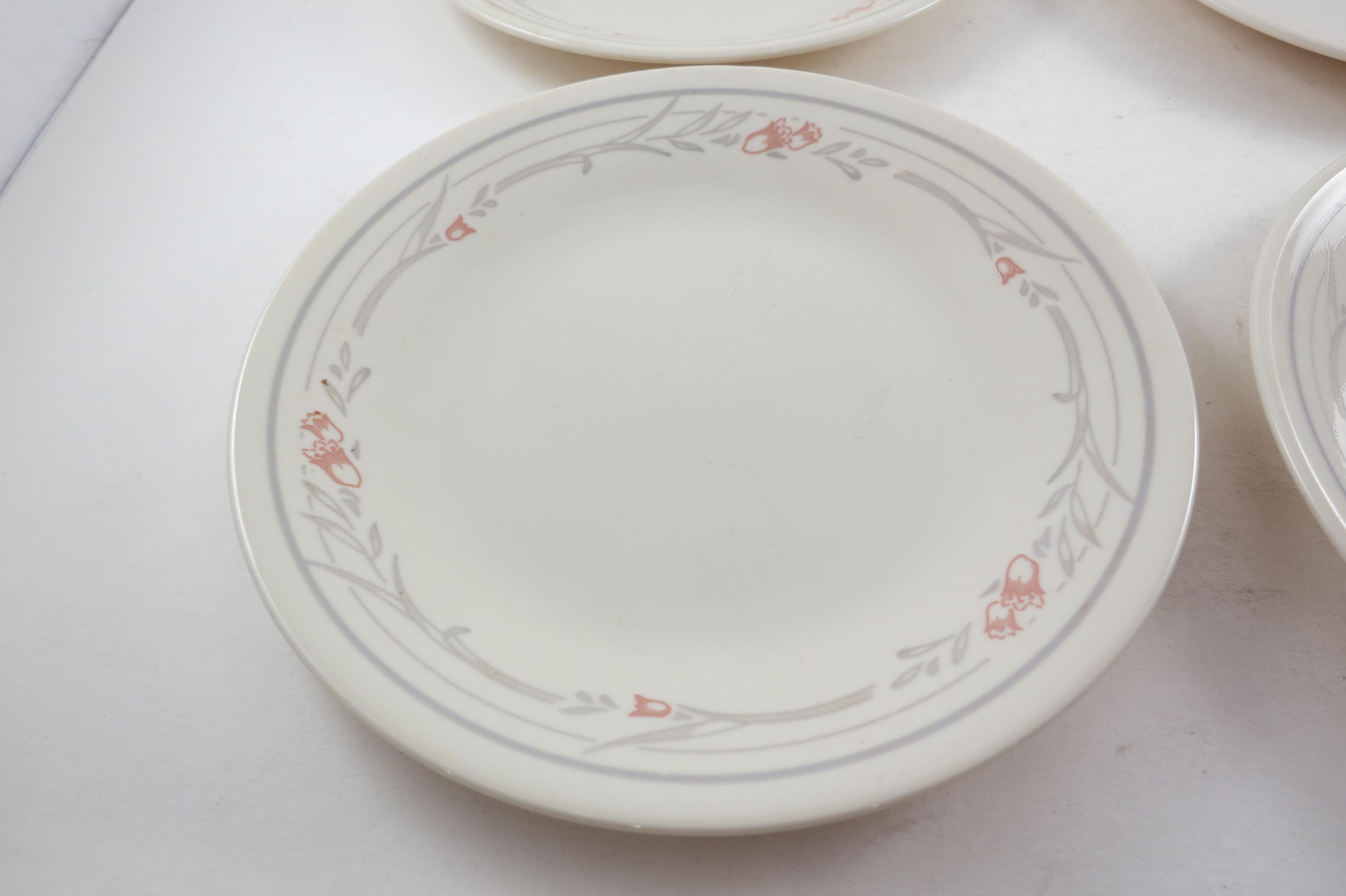 Set of Four Vintage Corelle Tulip Rose 6 3/4 Inch Bread Plates Very Good Used Condition. No chips, cracks or damages. These show light use wear.