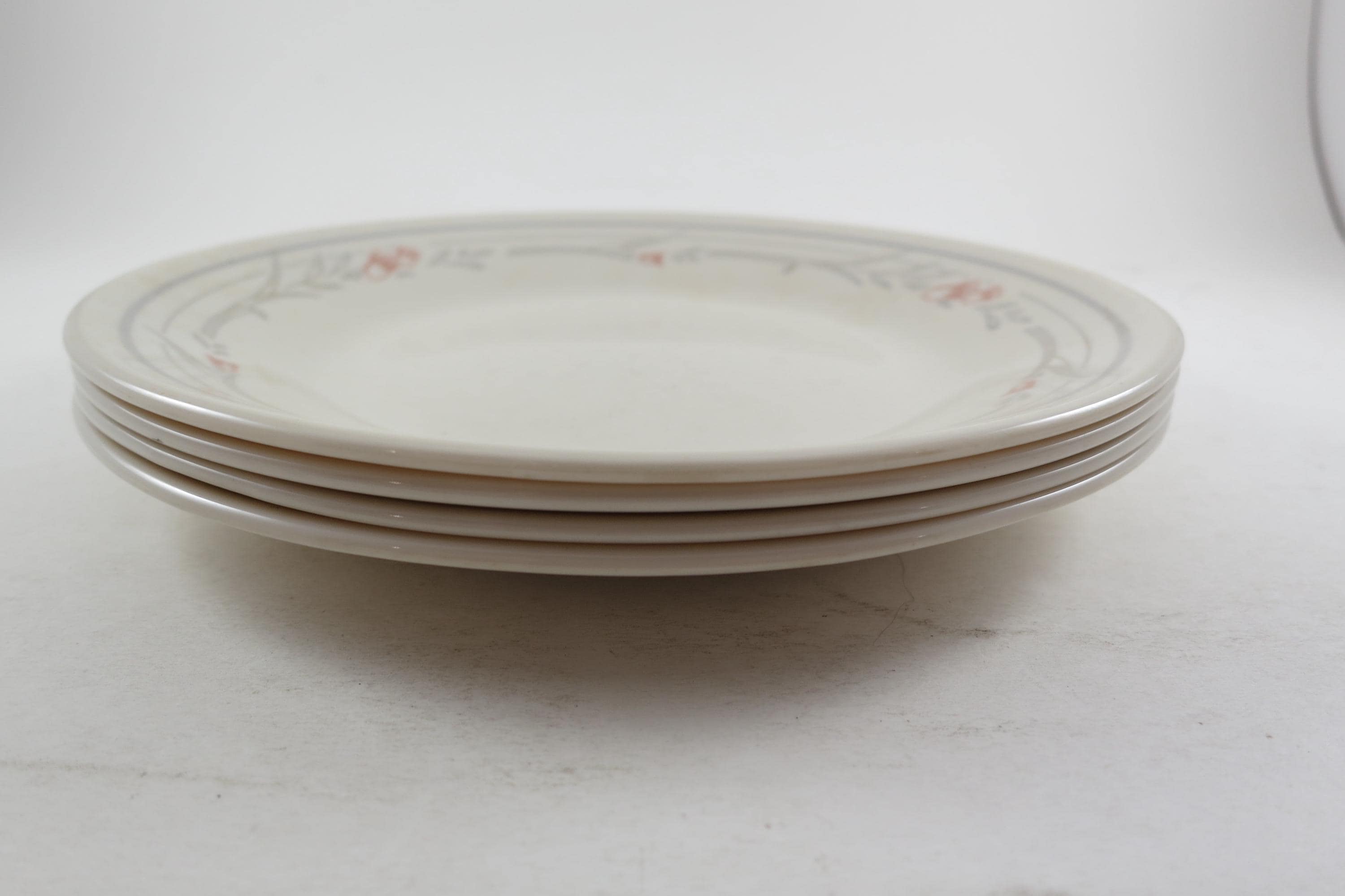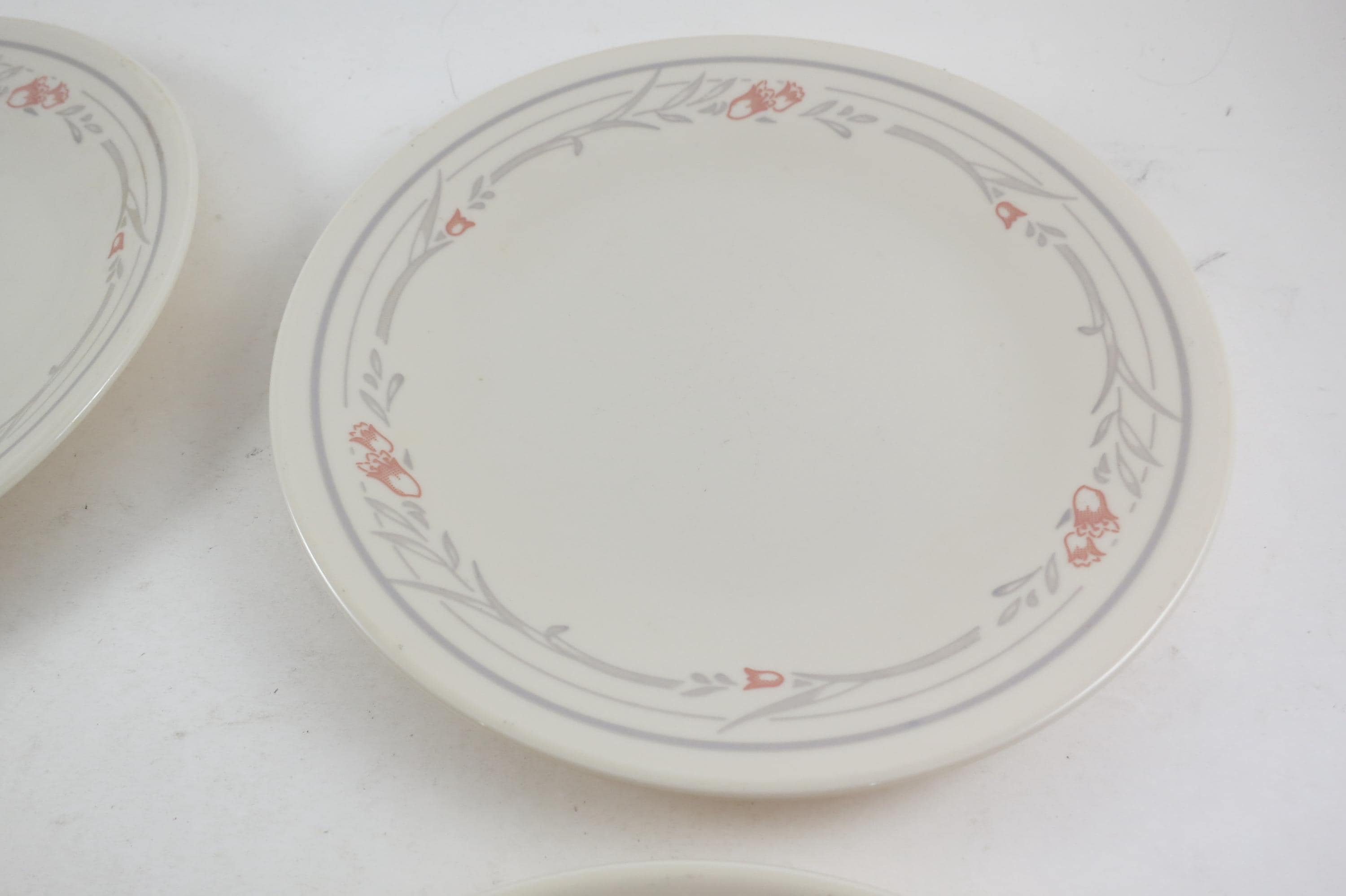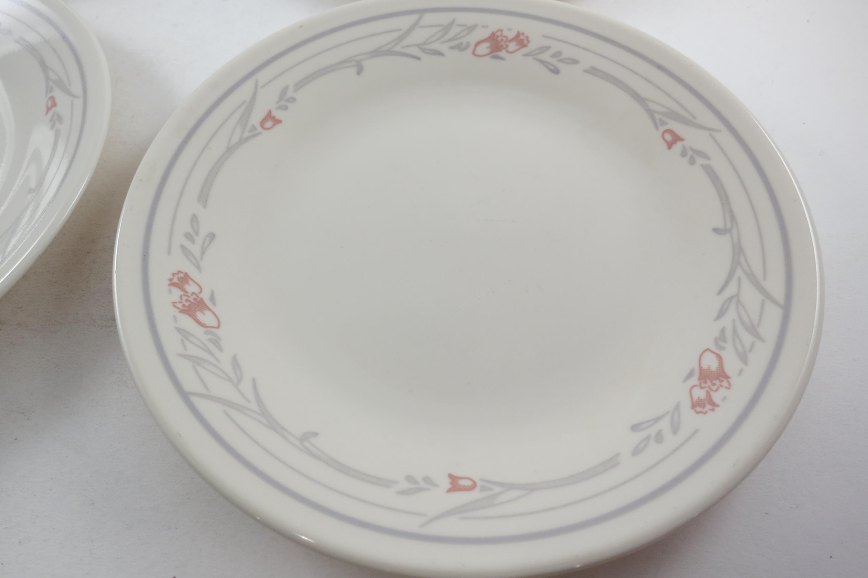 Set of Four Vintage Corelle Tulip Rose 6 3/4 Inch Bread Plates Very Good Used Condition. No chips, cracks or damages. These show light use wear.