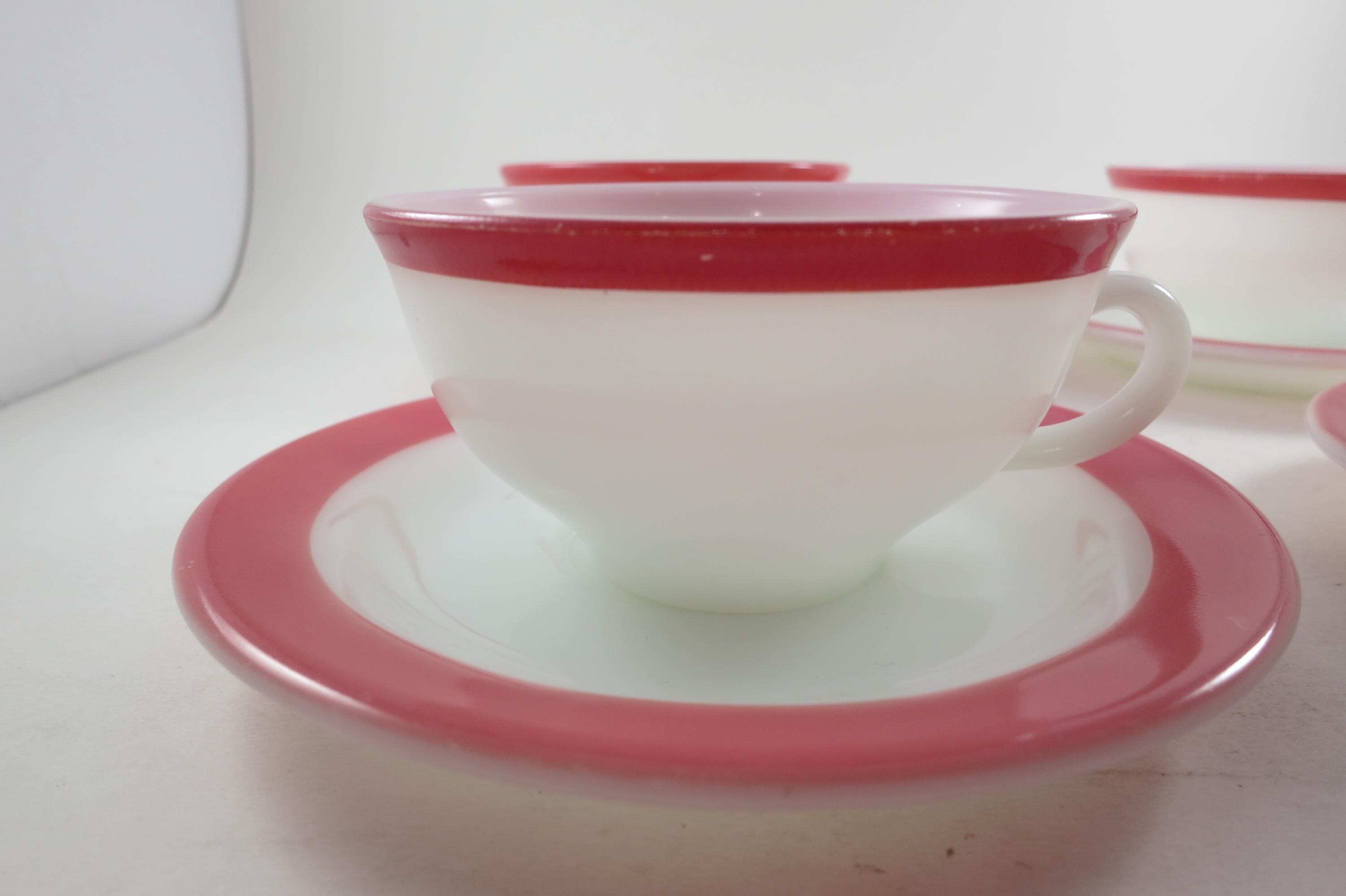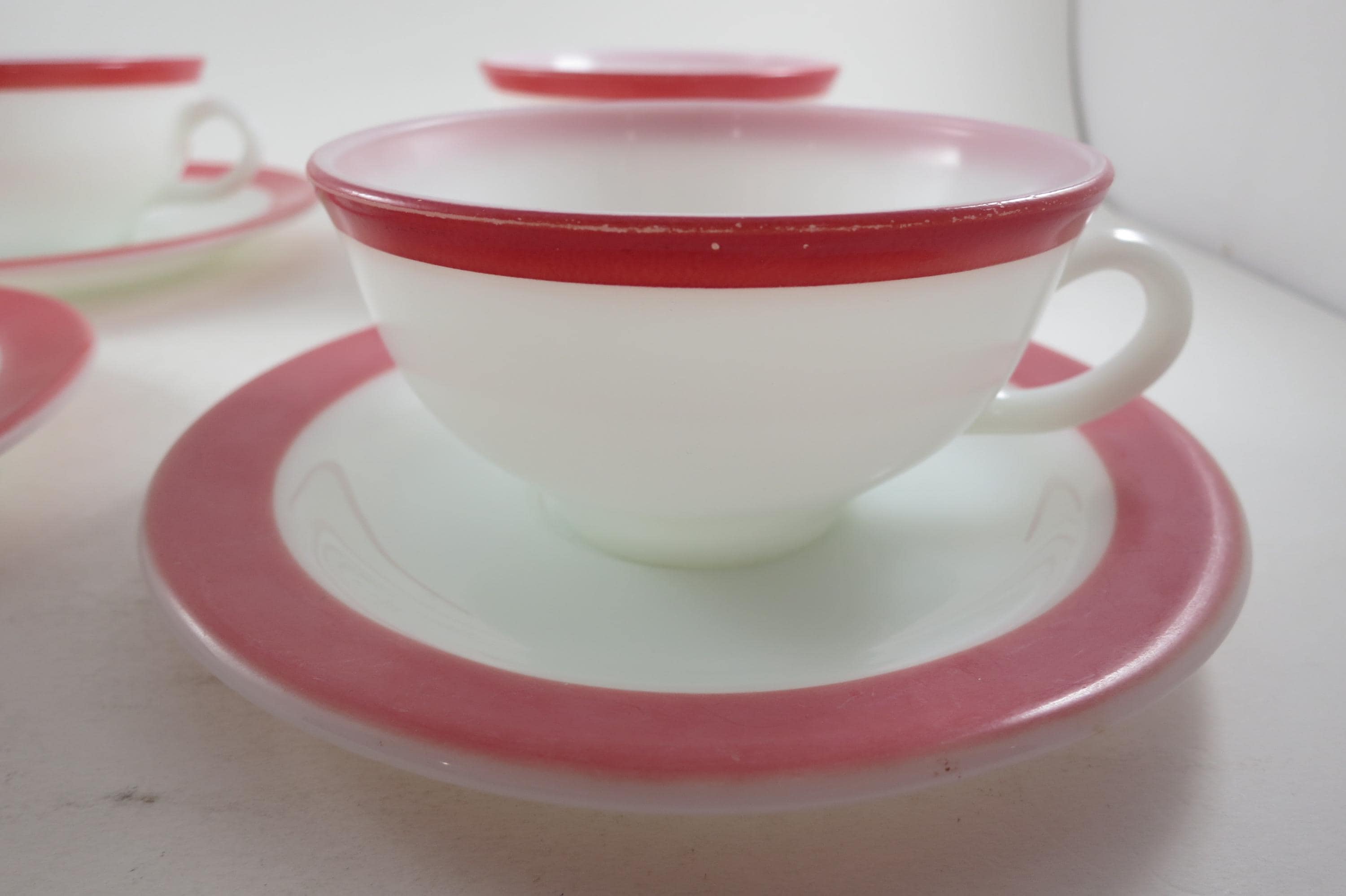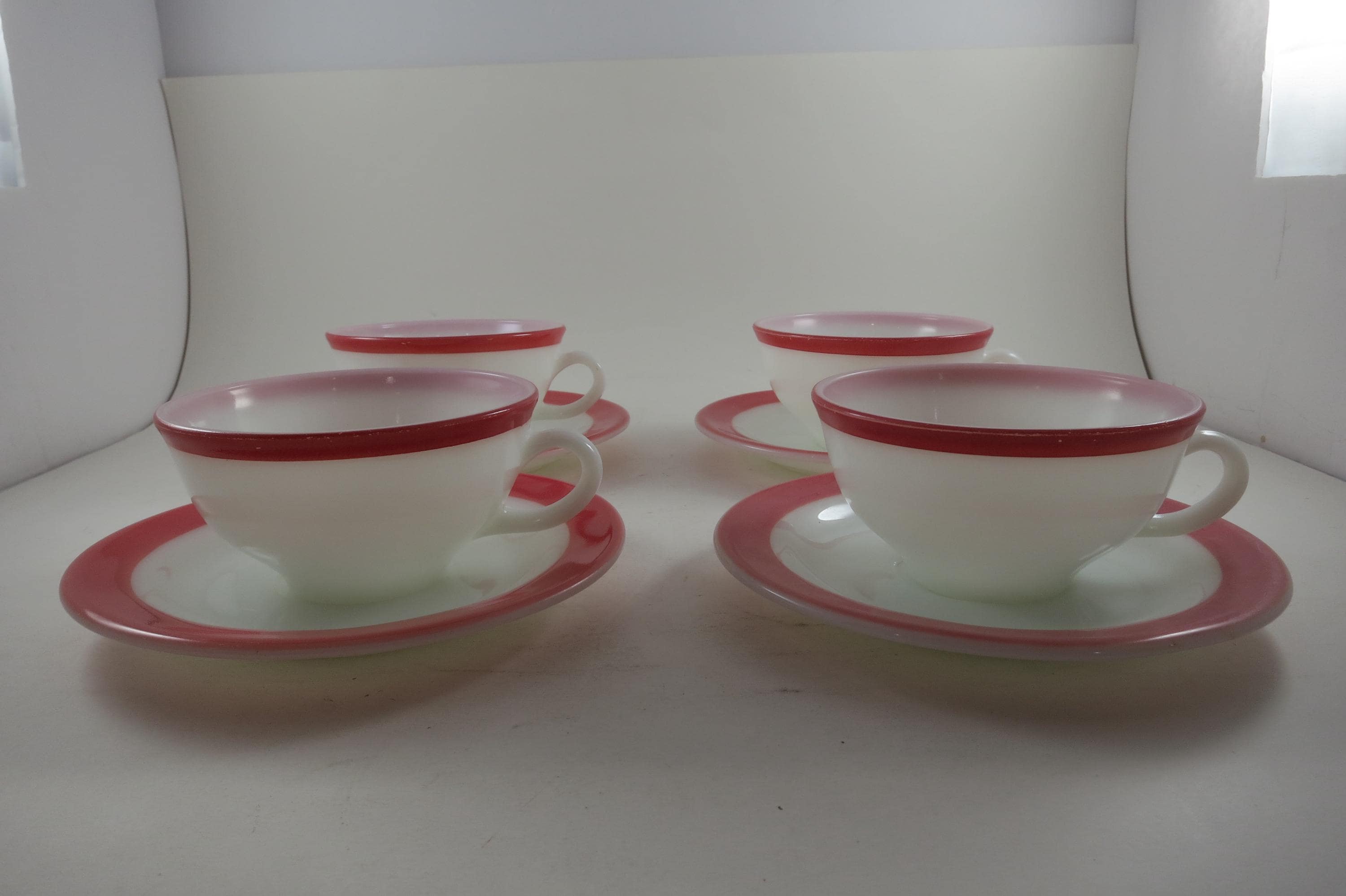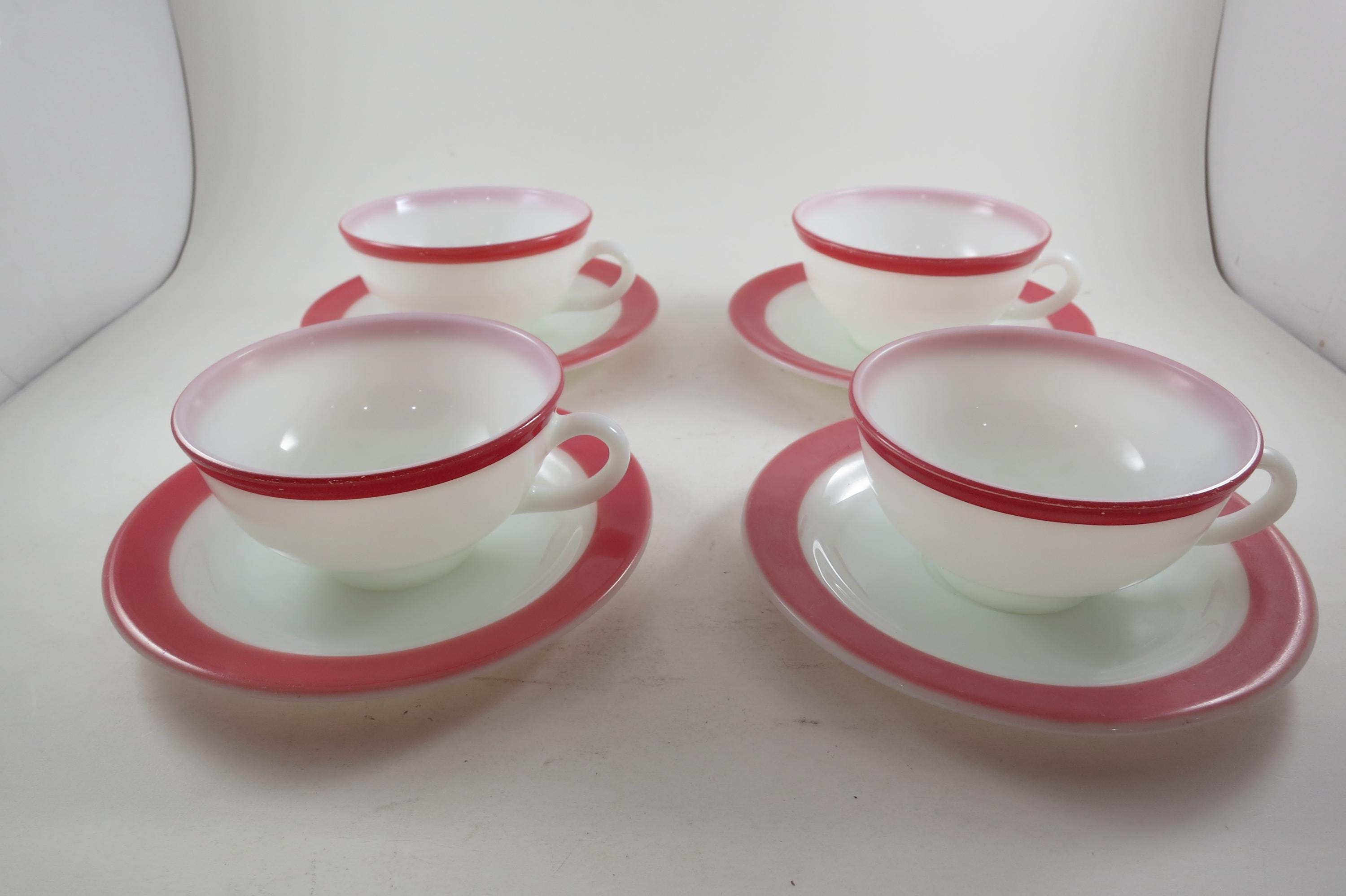 Vintage Pyrex Flamingo Pink Milk Glass Set of Four Cup and Saucer Sets Excellent Condition.