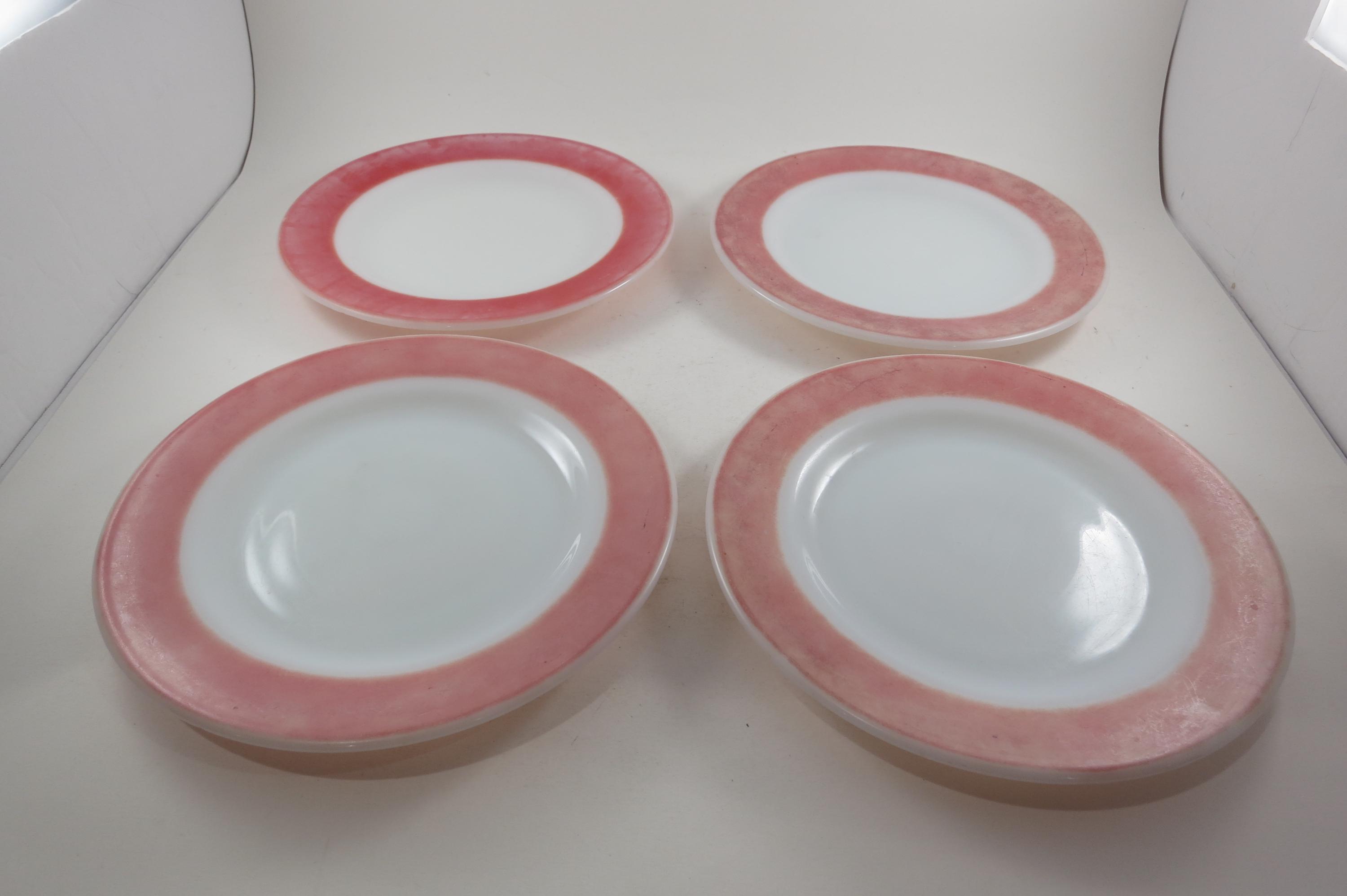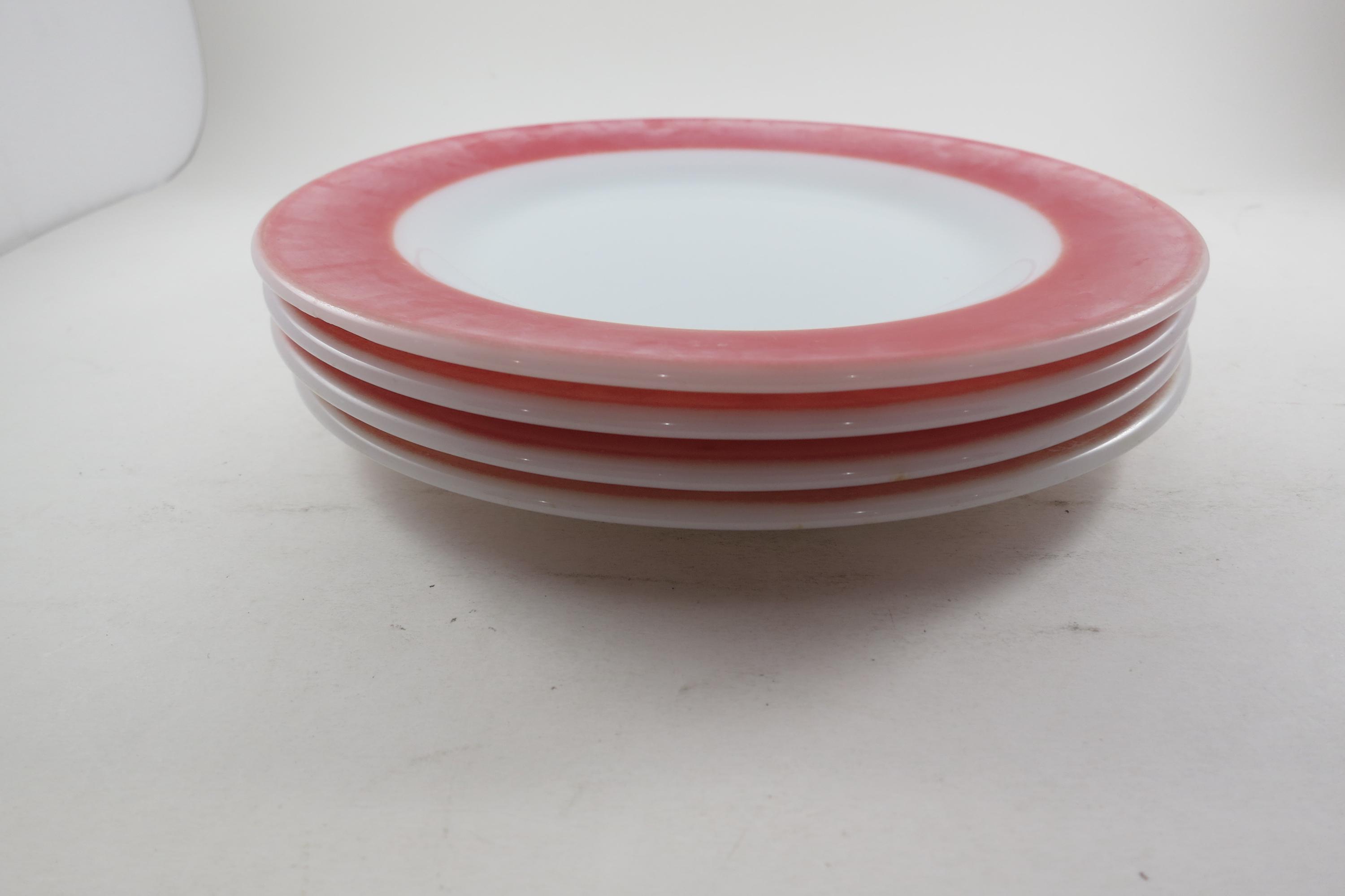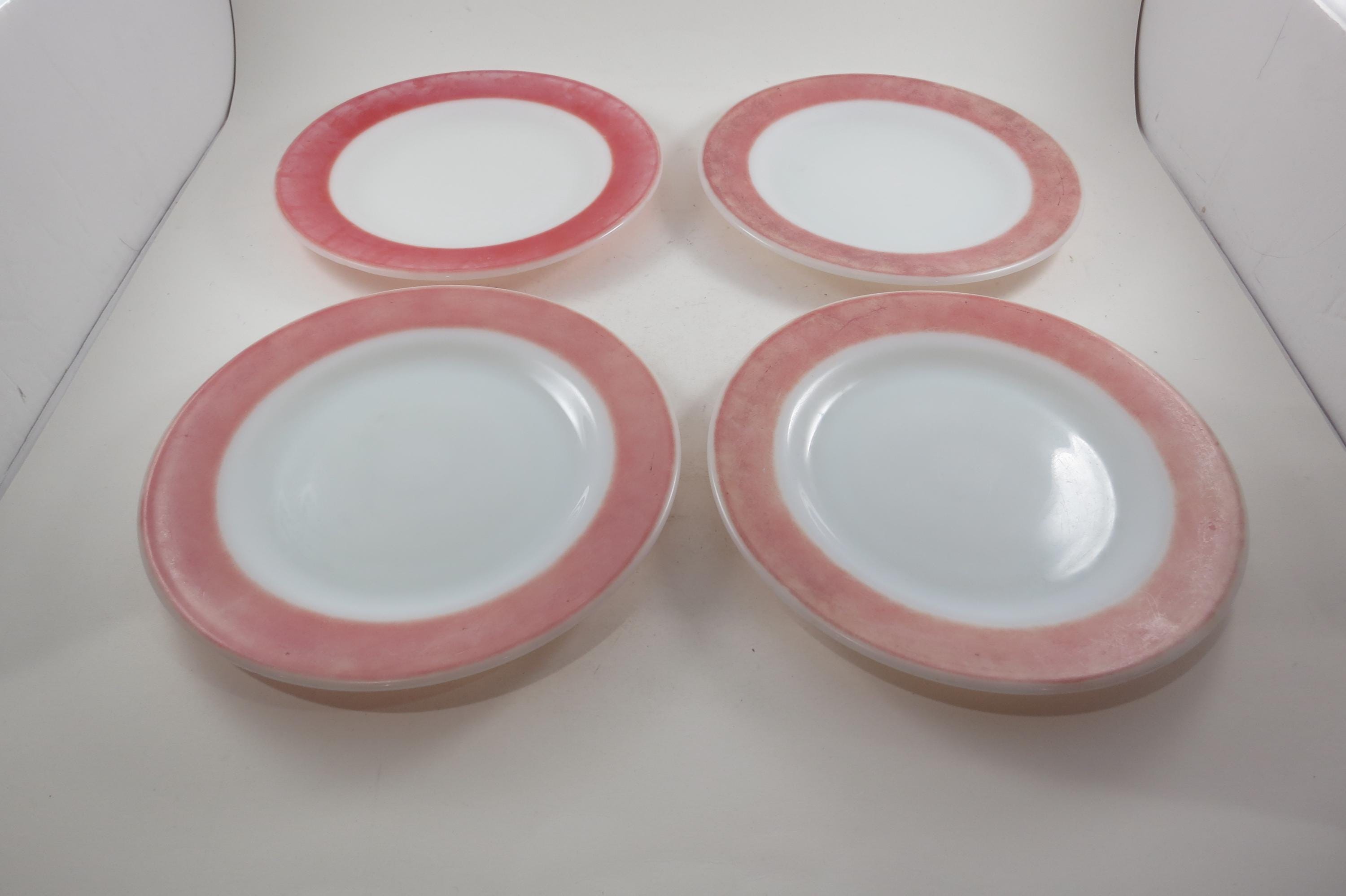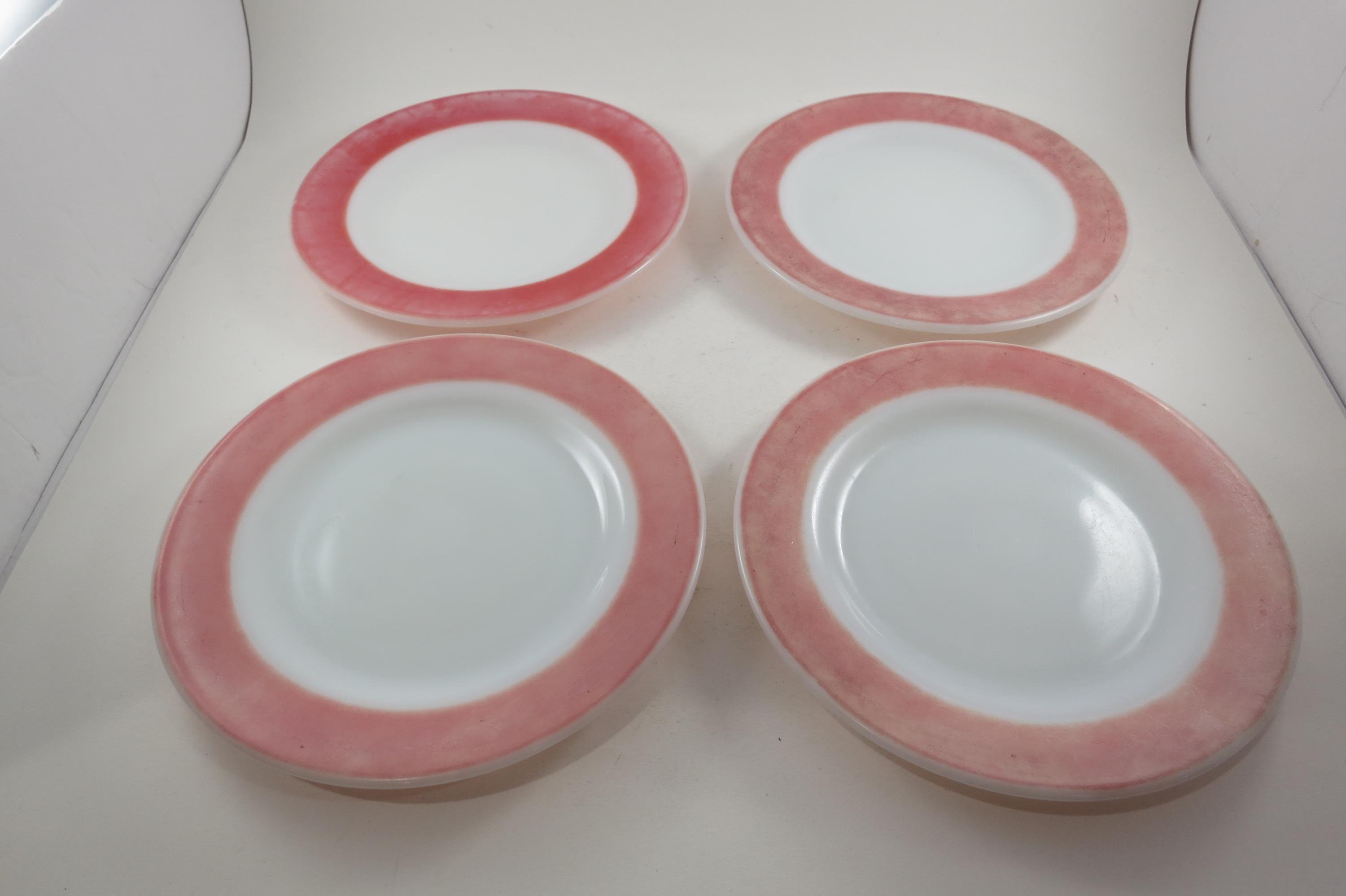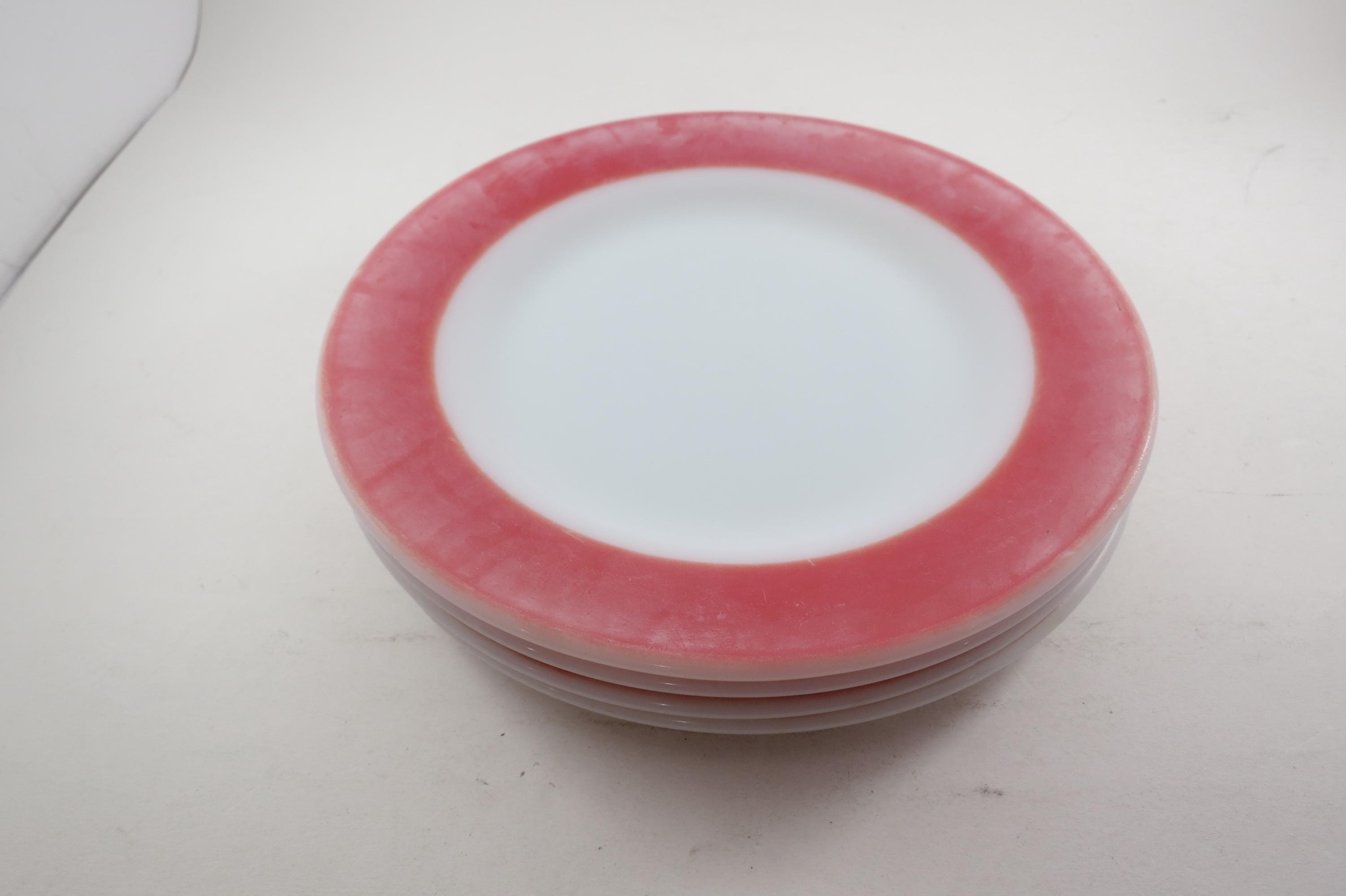 Vintage Pyrex Flamingo Pink Milk Glass 8 Inch Salad Plates Set of Four Good Used Condition.