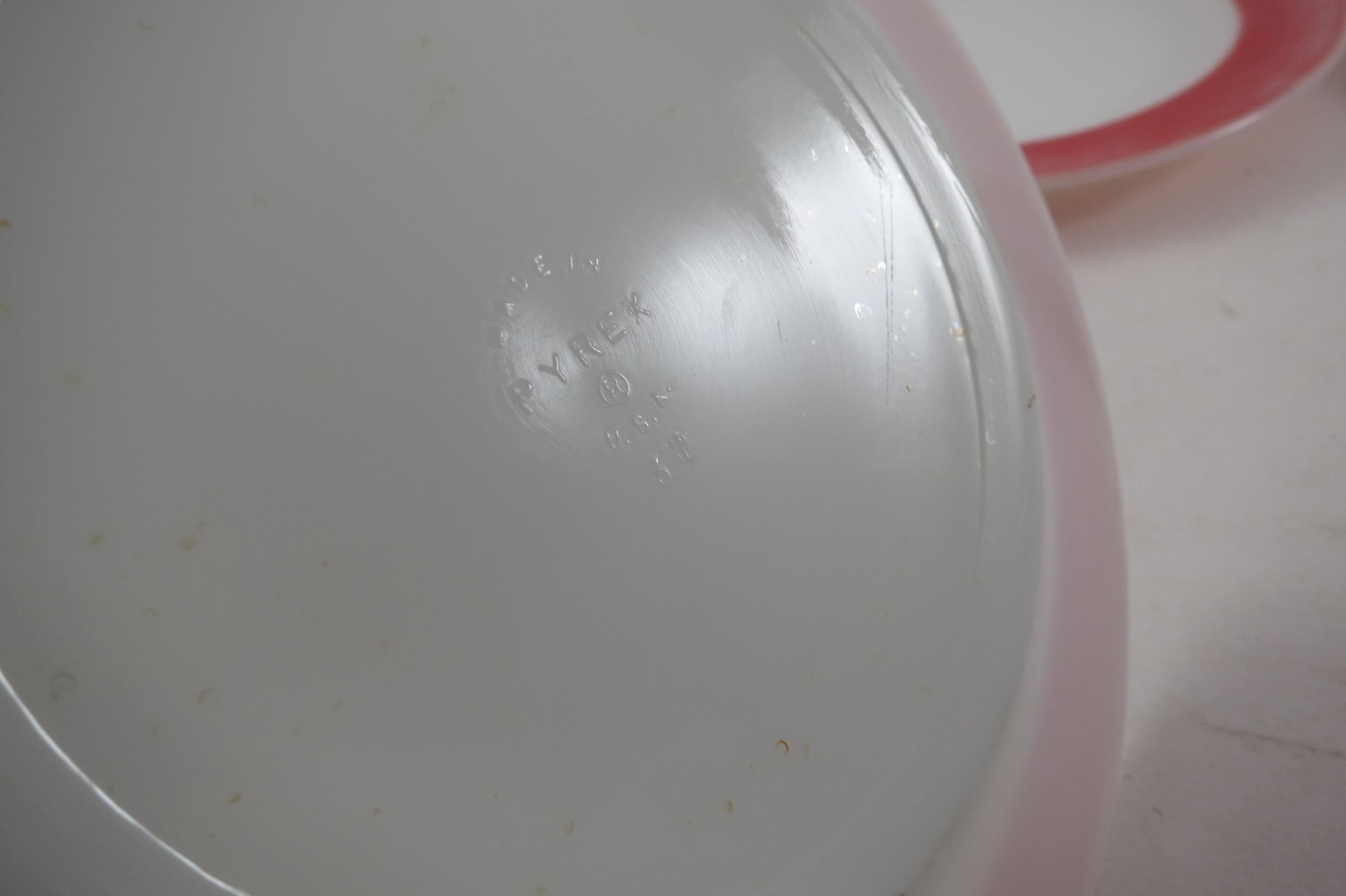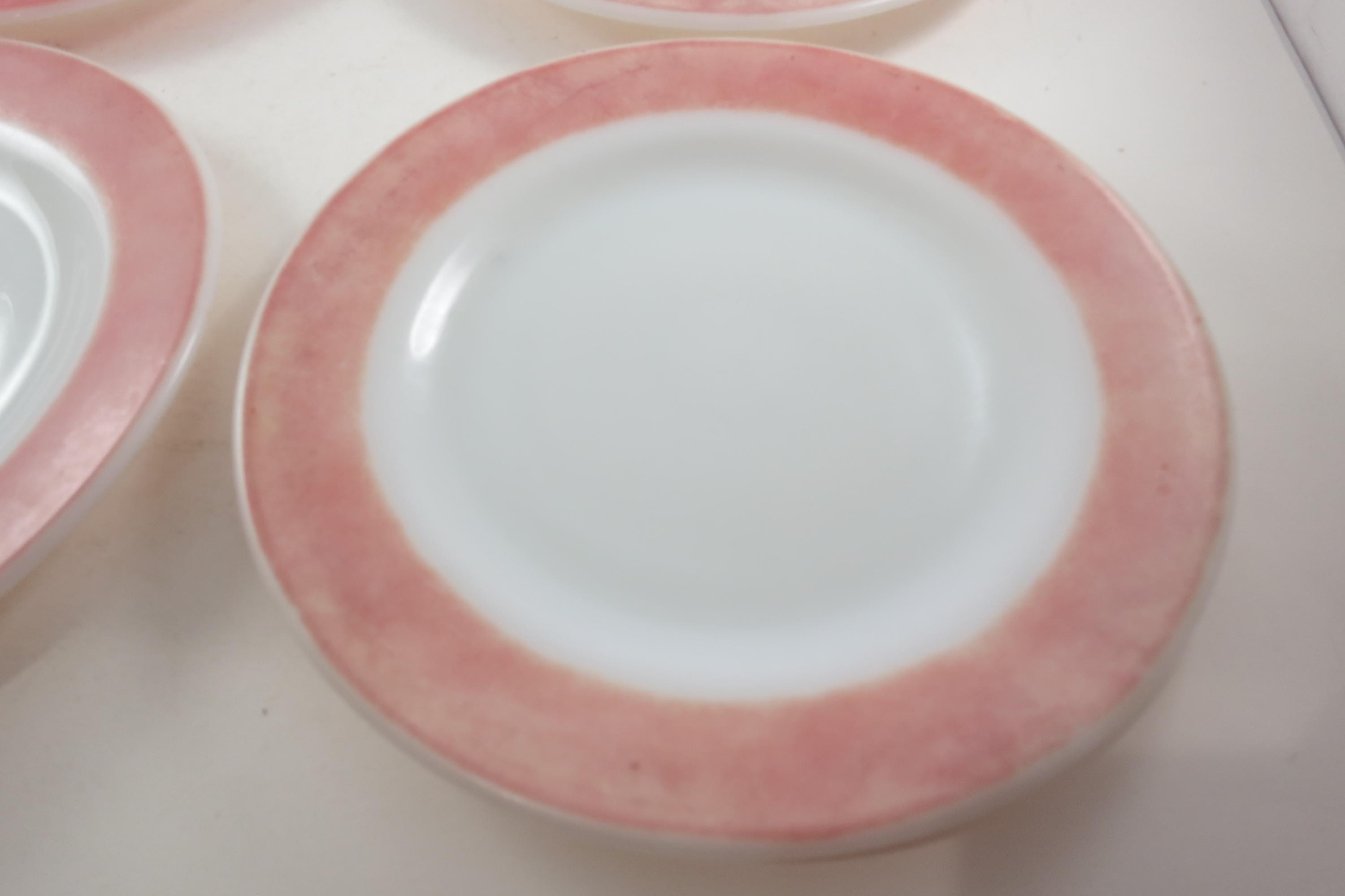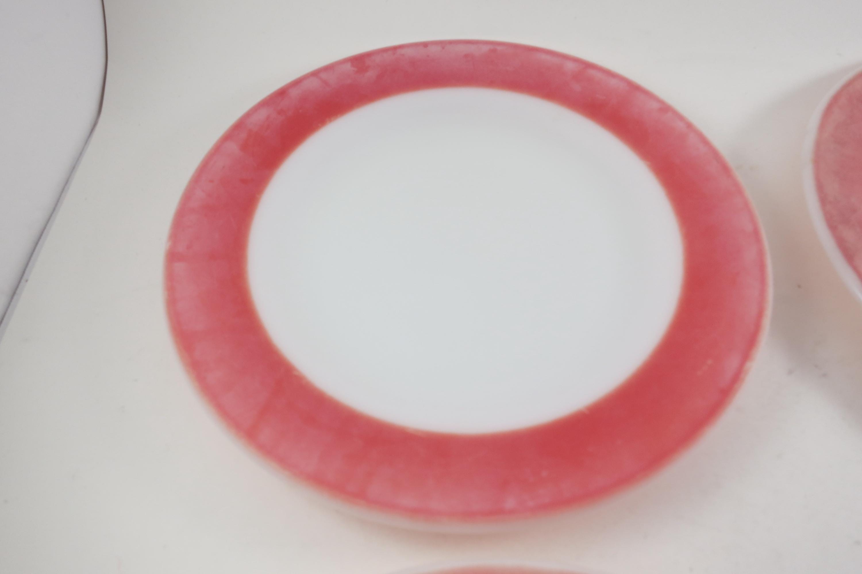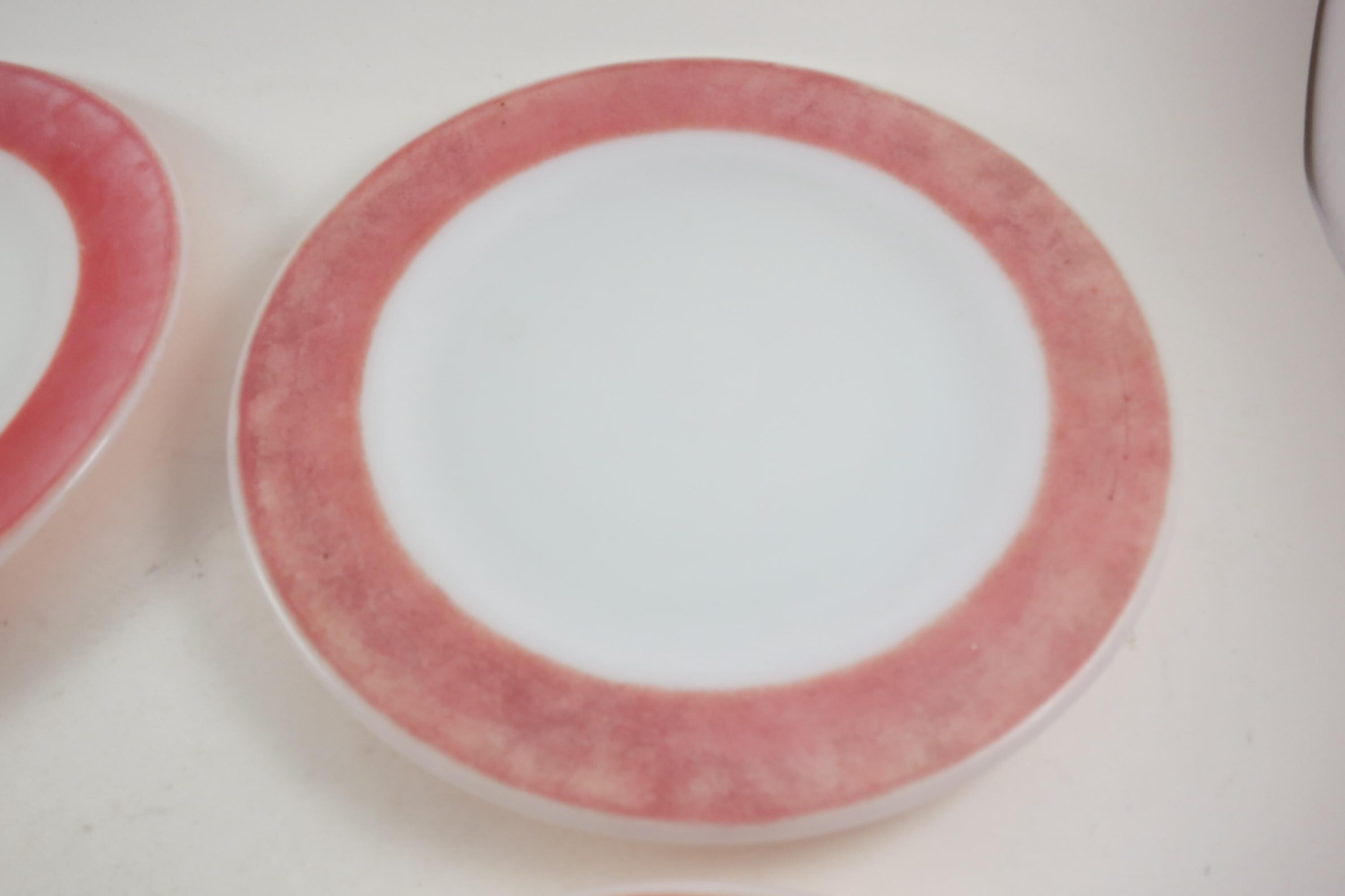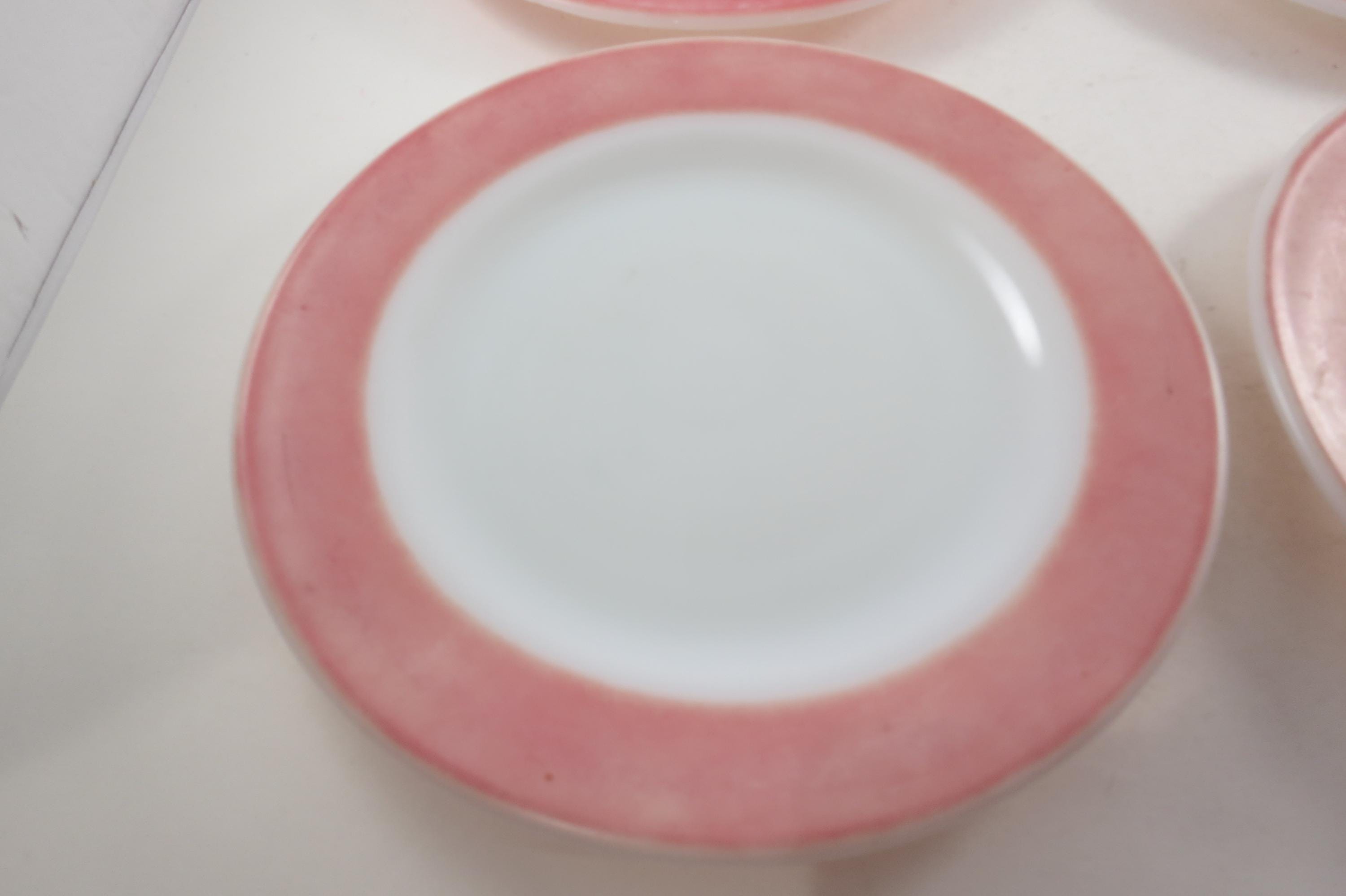 Vintage Pyrex Flamingo Pink Milk Glass 8 Inch Salad Plates Set of Four Good Used Condition.