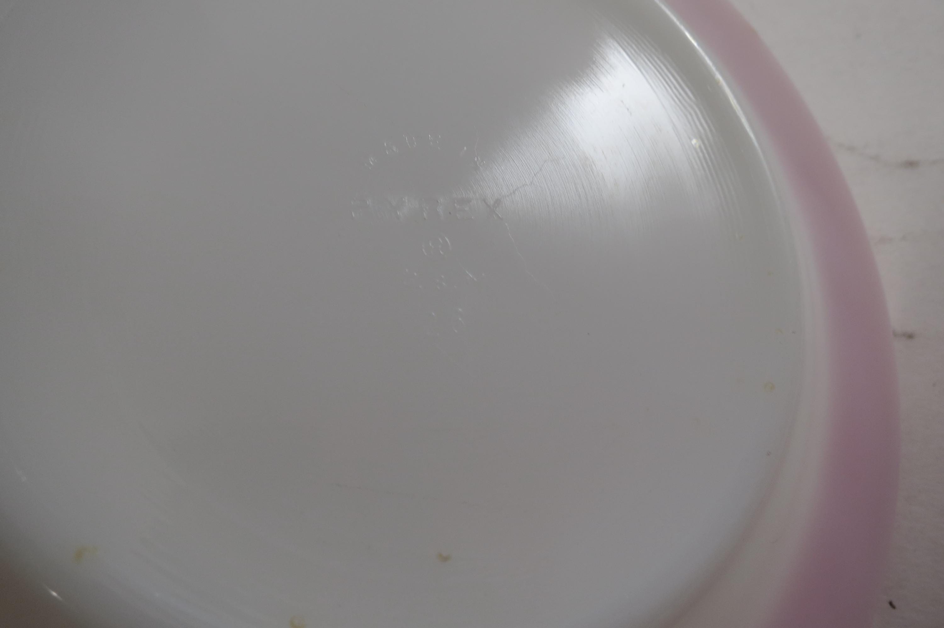 Vintage Pyrex Flamingo Pink Milk Glass 6 3/4 Inch Bread Plates Set of Six Good Used Condition.