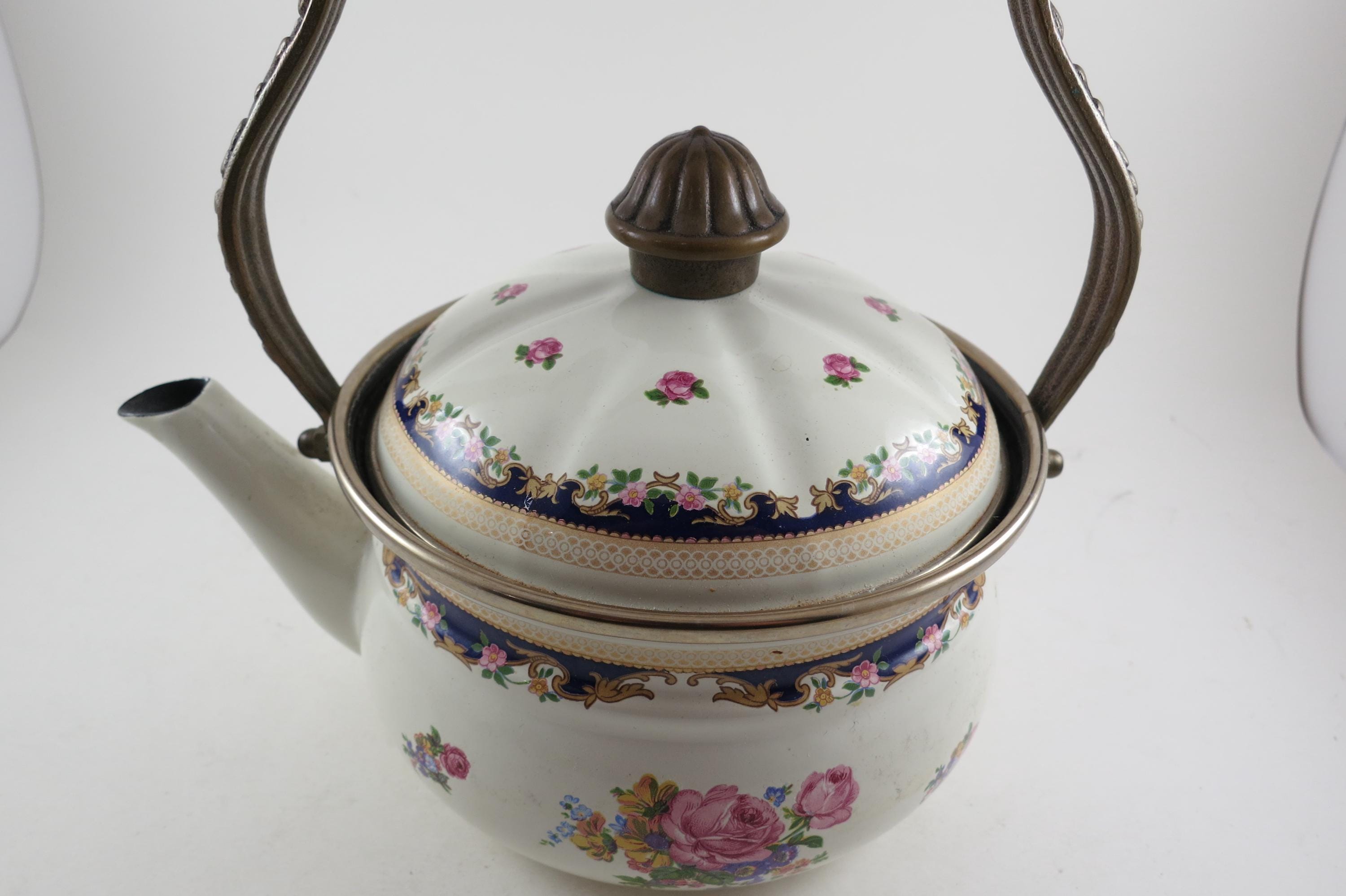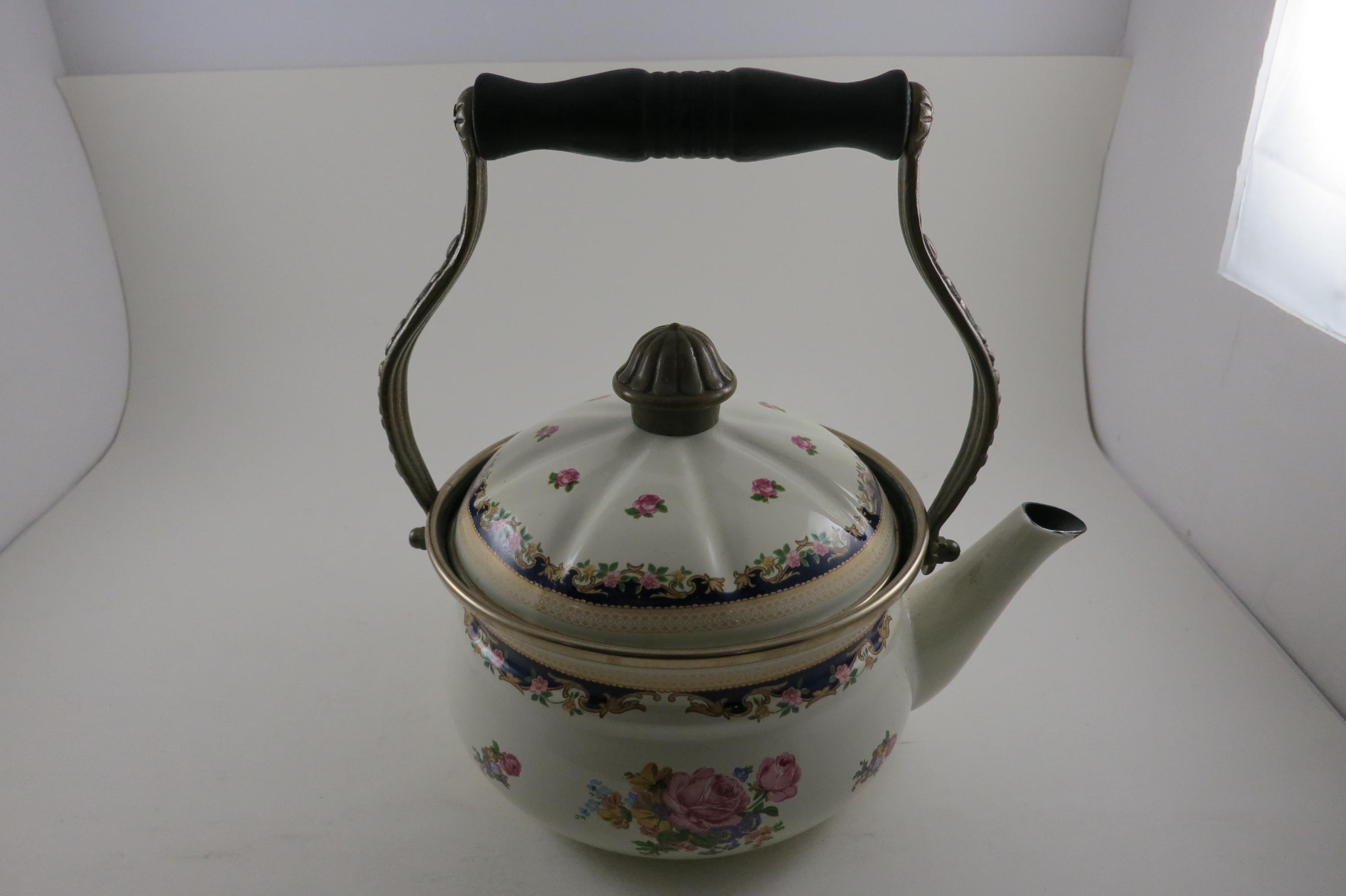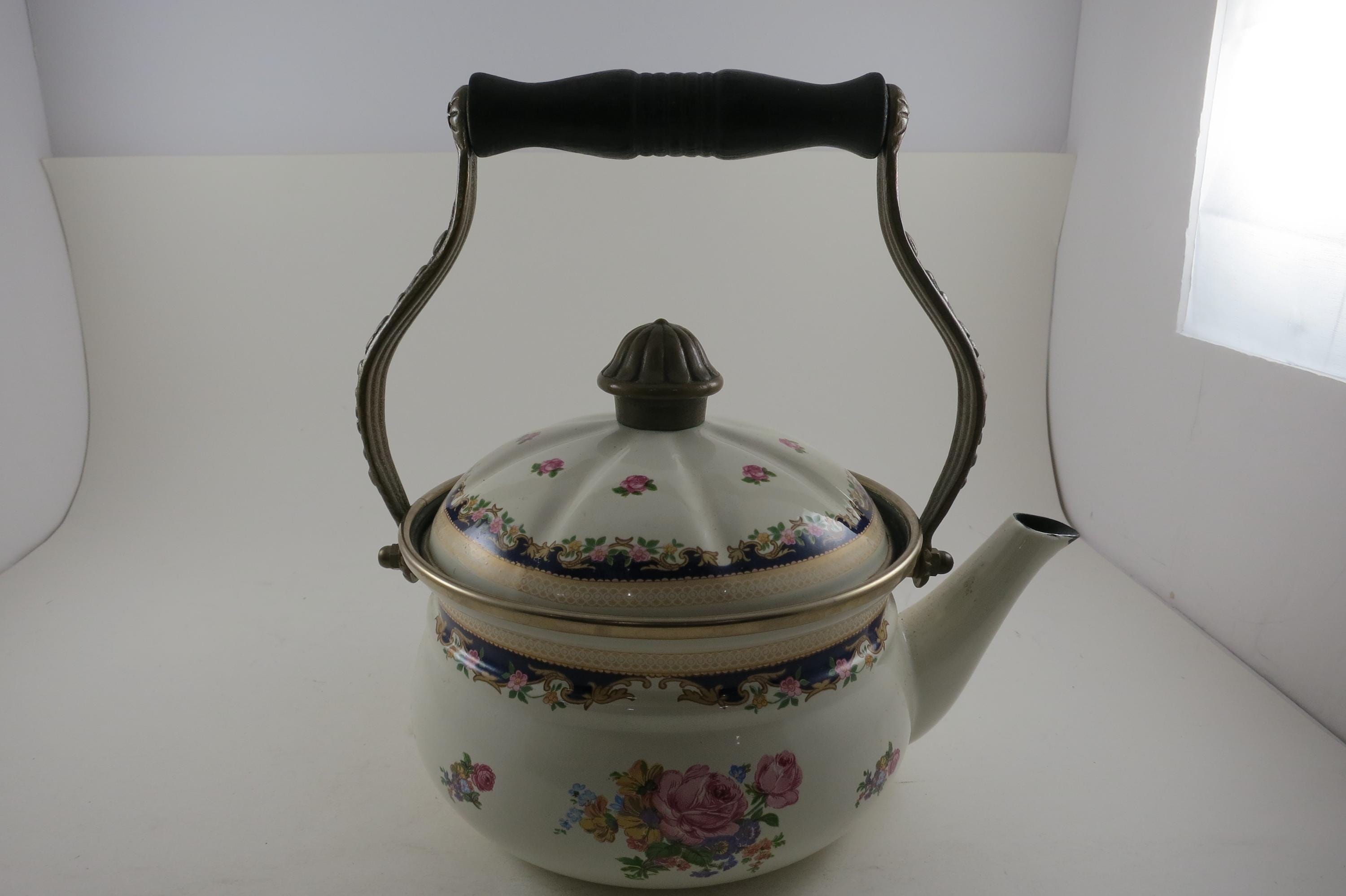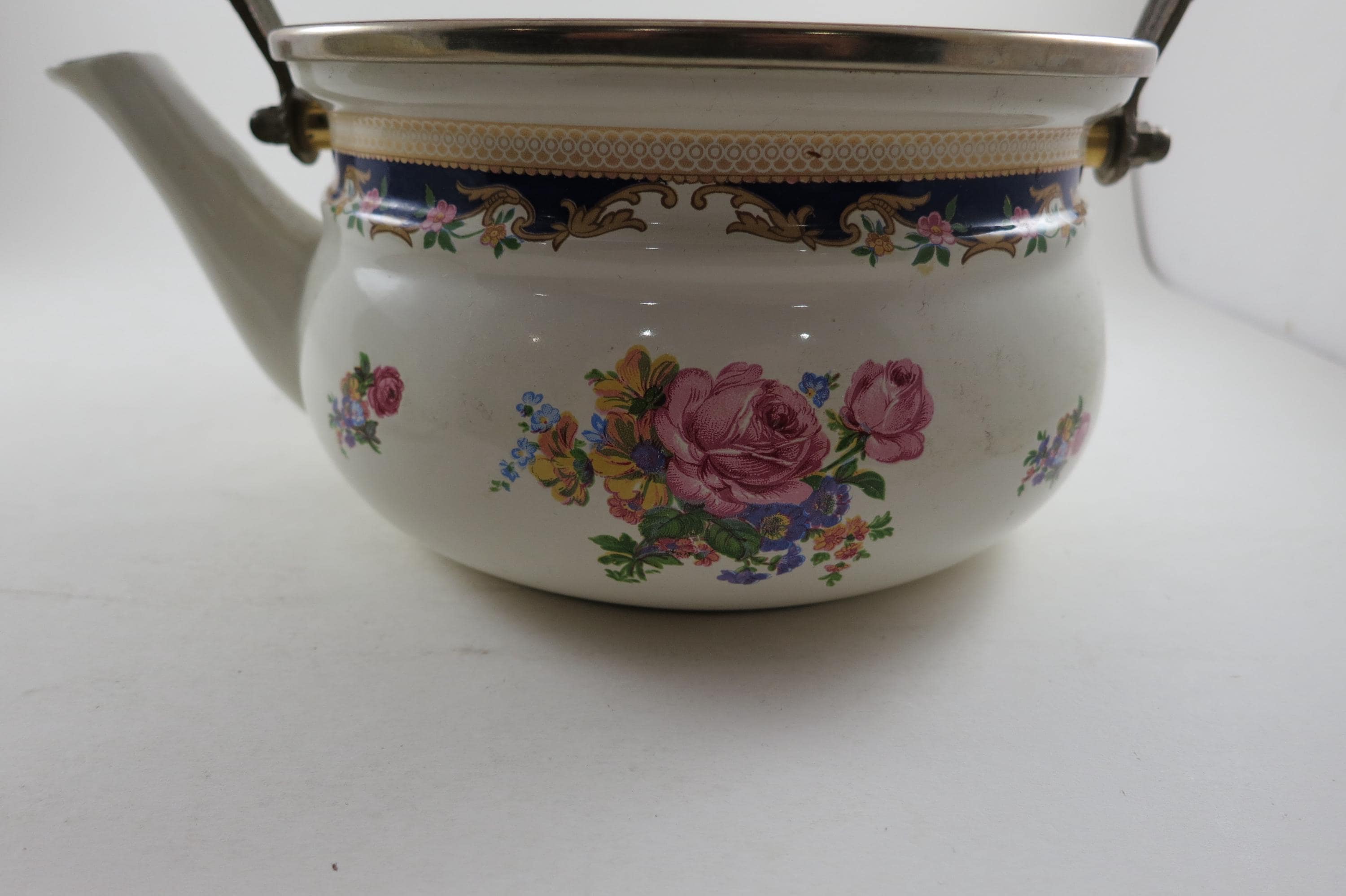 Vintage Floral Enamelware Teapot Asta West Germany. Very nice used condition, 8 1/2 inches wide with a wooden handle.