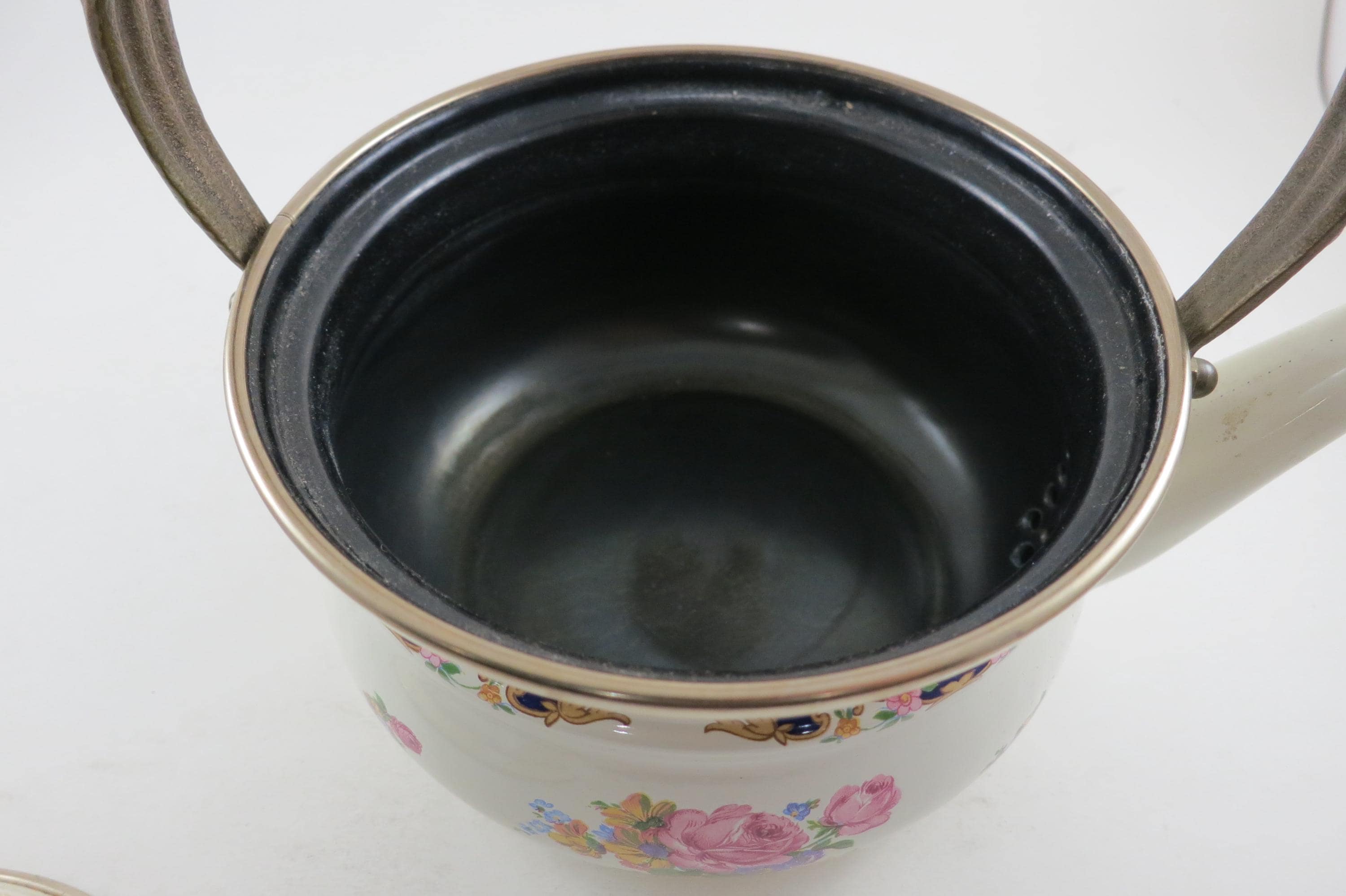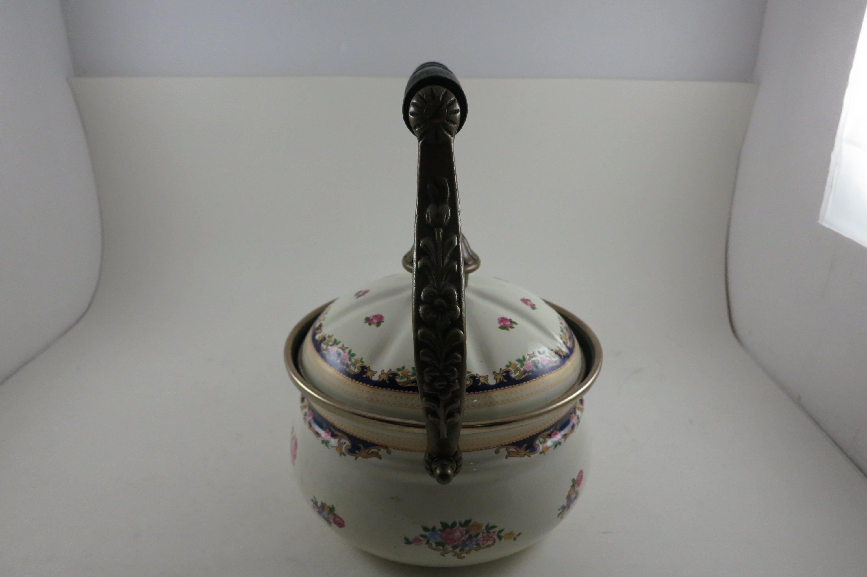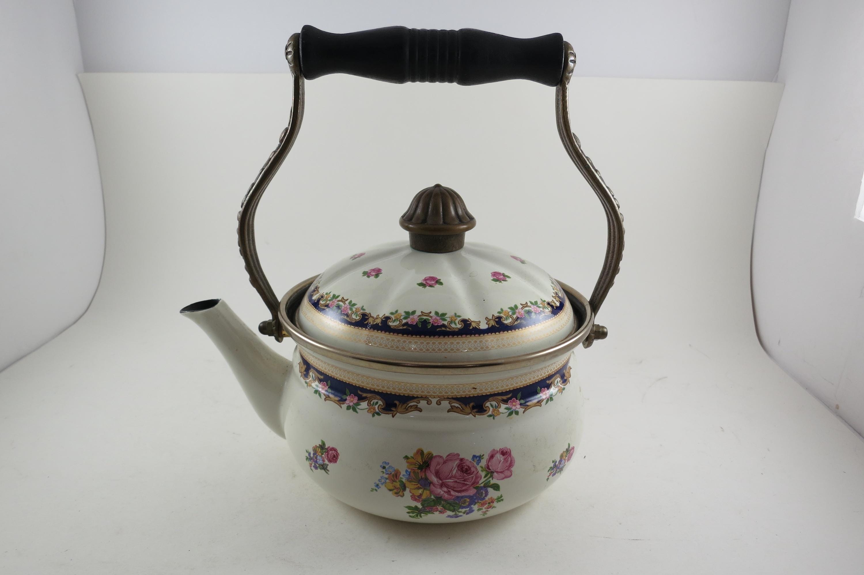 Vintage Floral Enamelware Teapot Asta West Germany. Very nice used condition, 8 1/2 inches wide with a wooden handle.