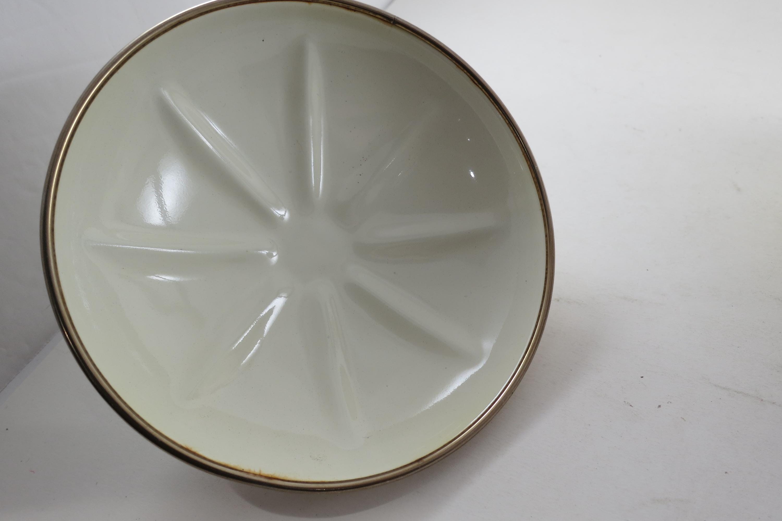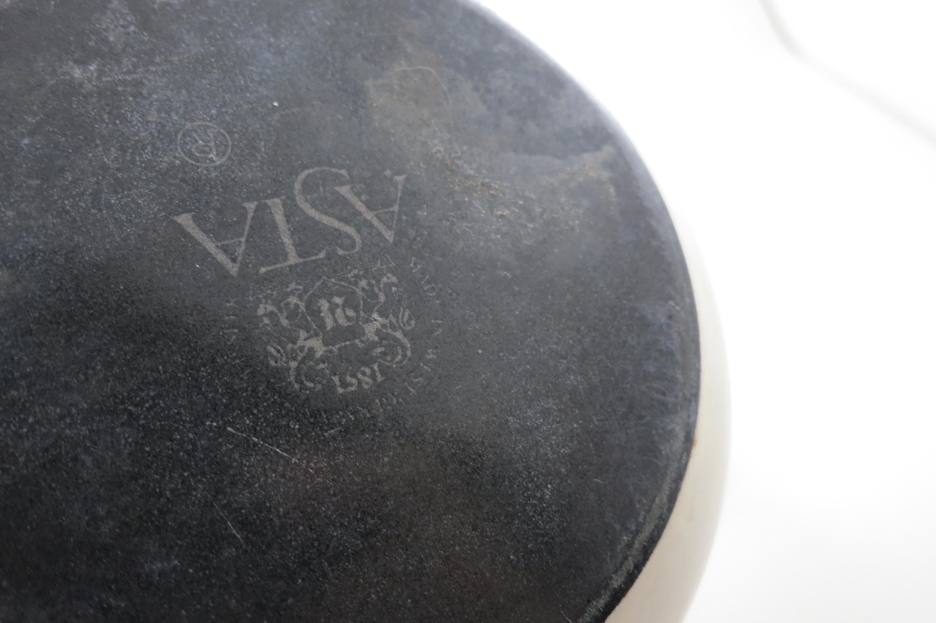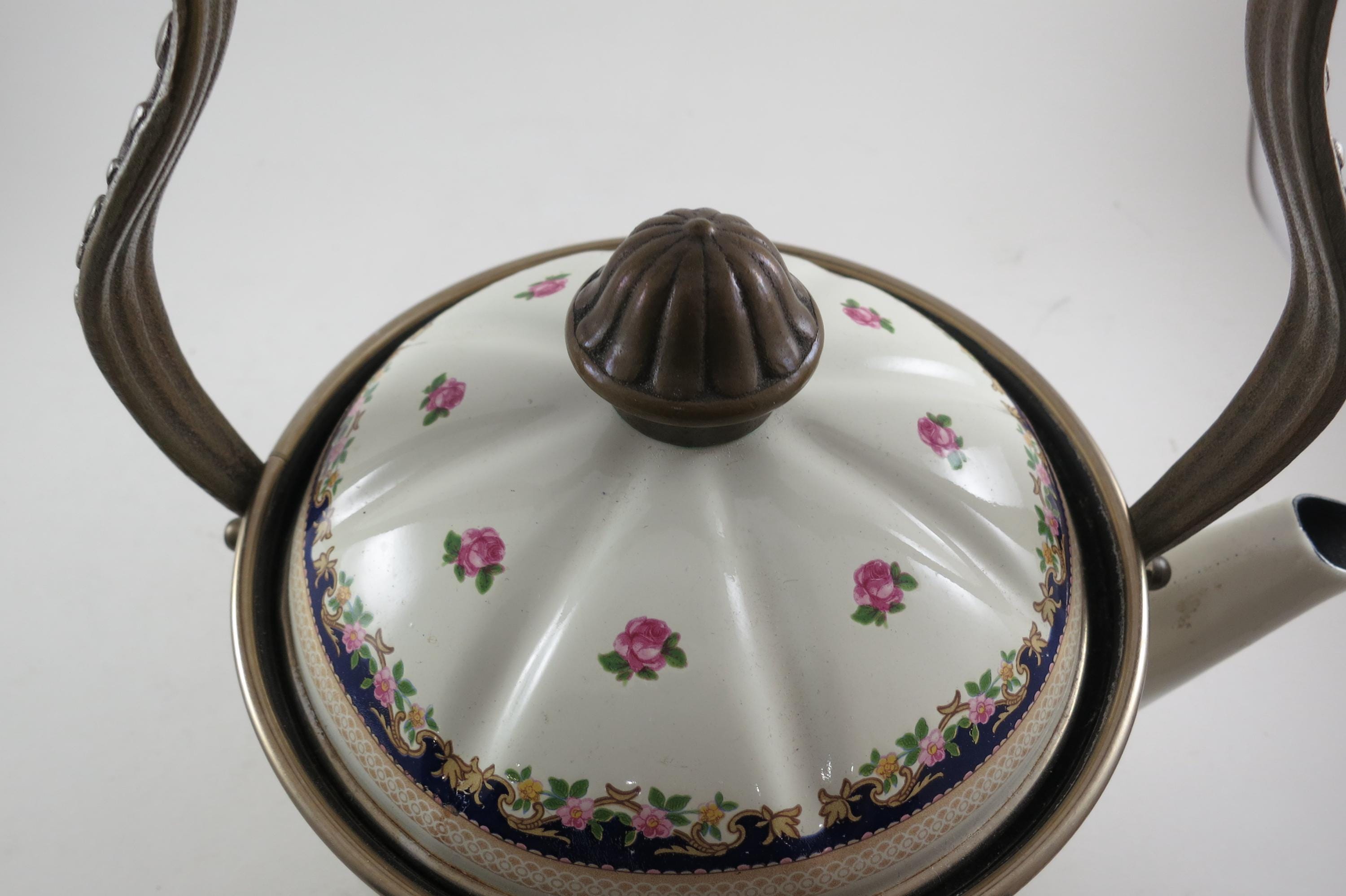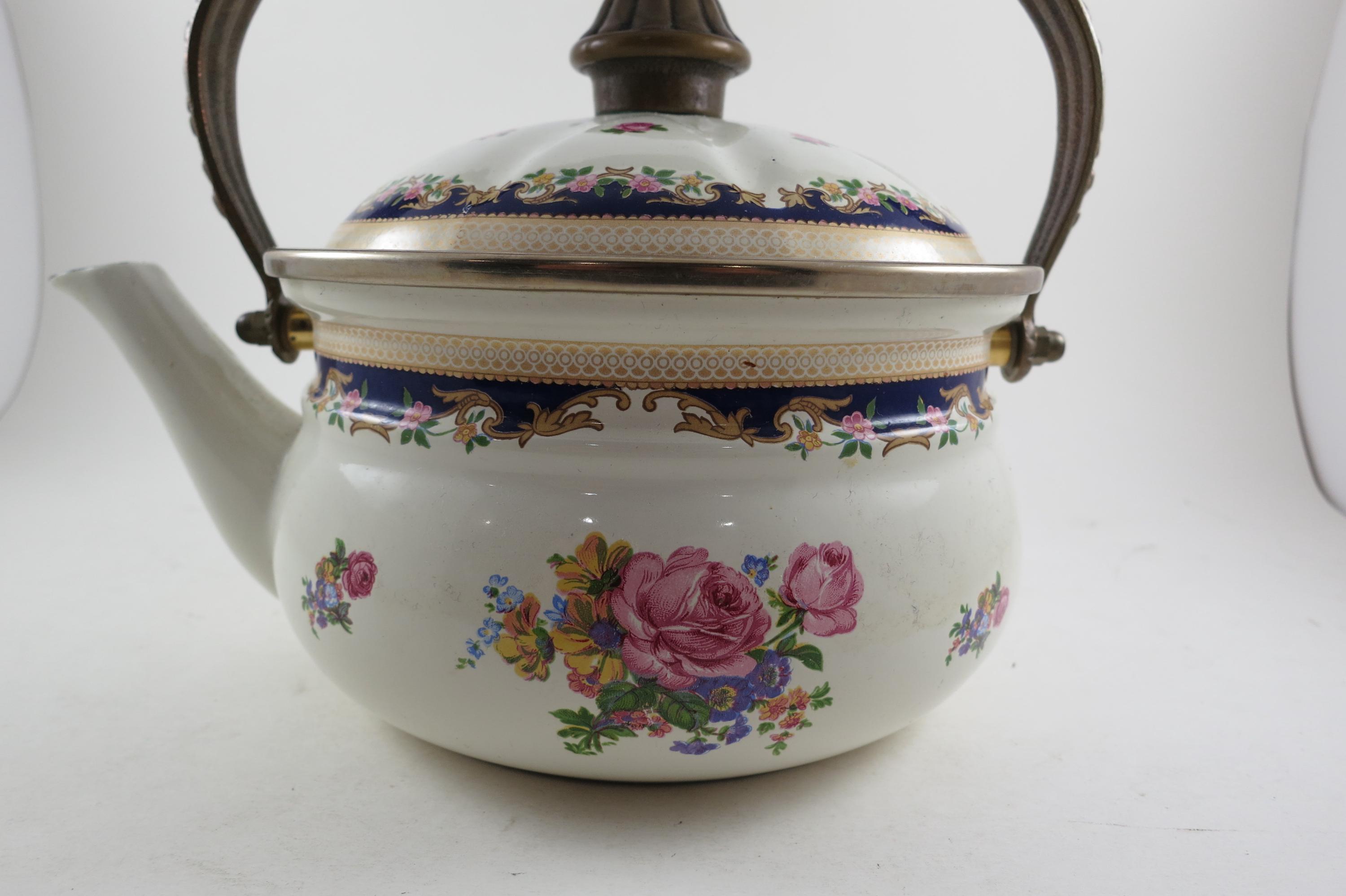 Vintage Floral Enamelware Teapot Asta West Germany. Very nice used condition, 8 1/2 inches wide with a wooden handle.