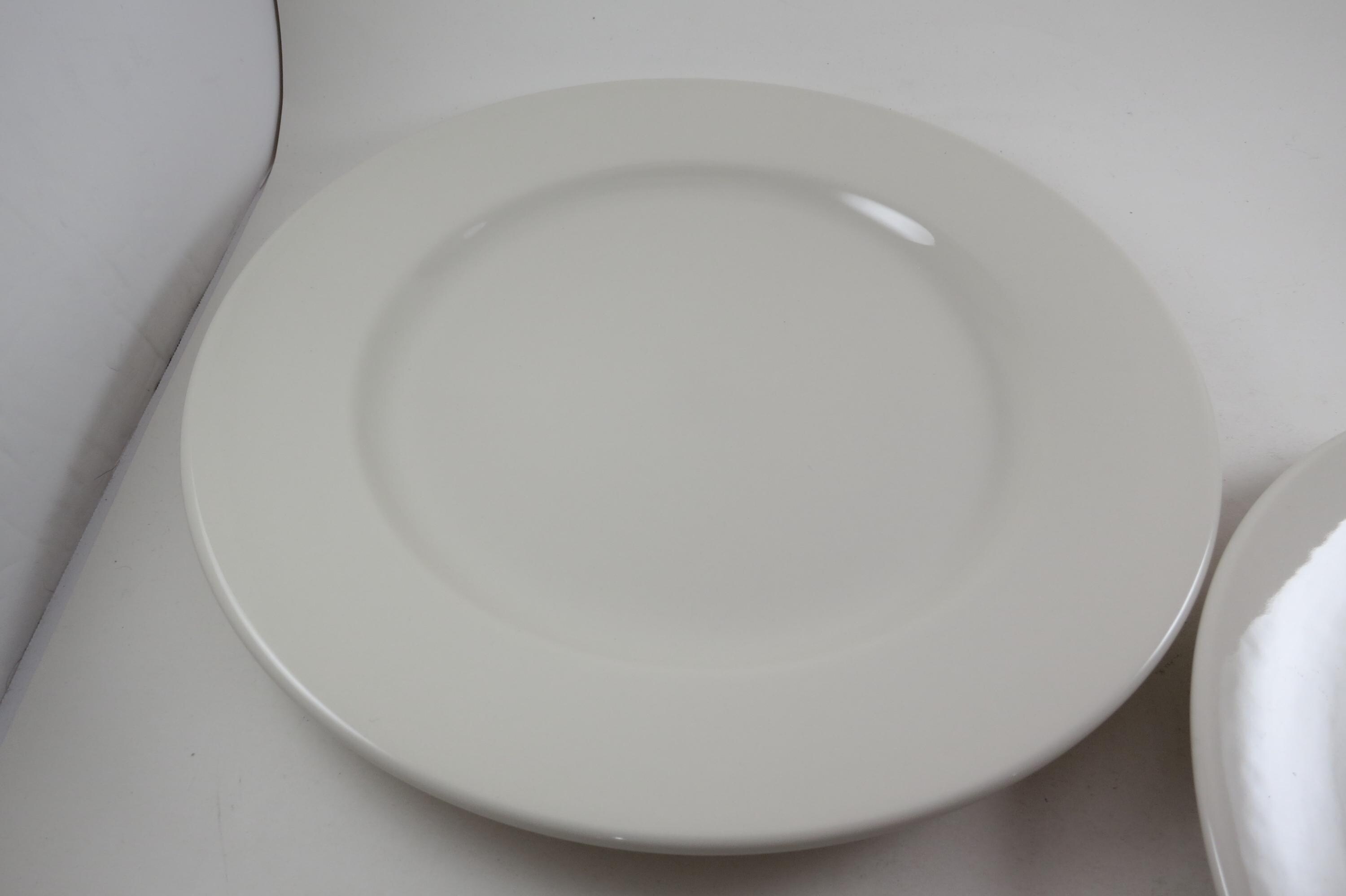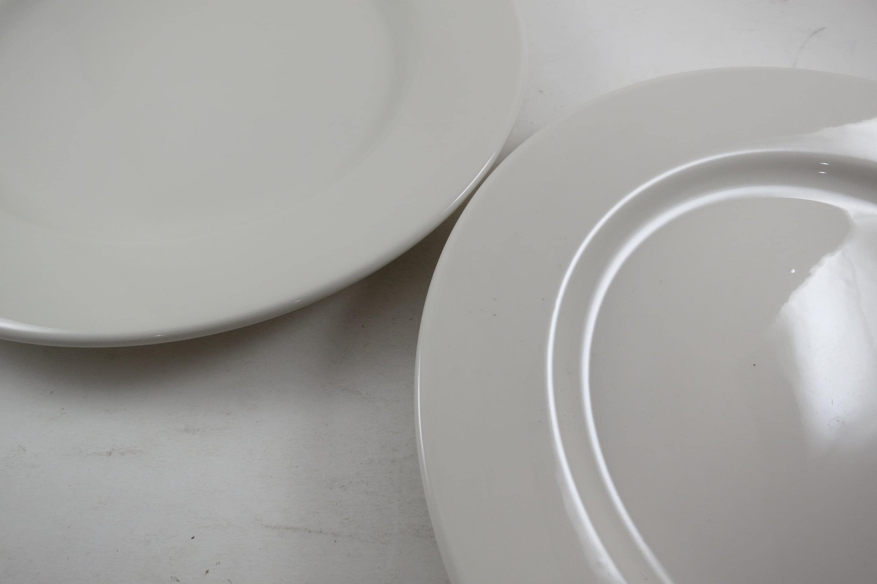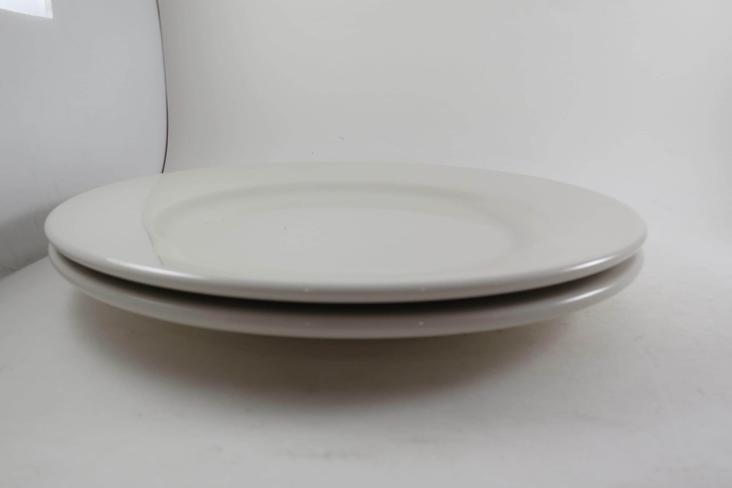Pair of Homer Laughlin China Restaurant Ware Off White 12 1/4 Inch Round Dinner Plates Excellent Condition. Both are in excellent condition with no chips, cracks or damages. Each measures 12 1/4 inches diameter. These are large, heavy good quality plates.
