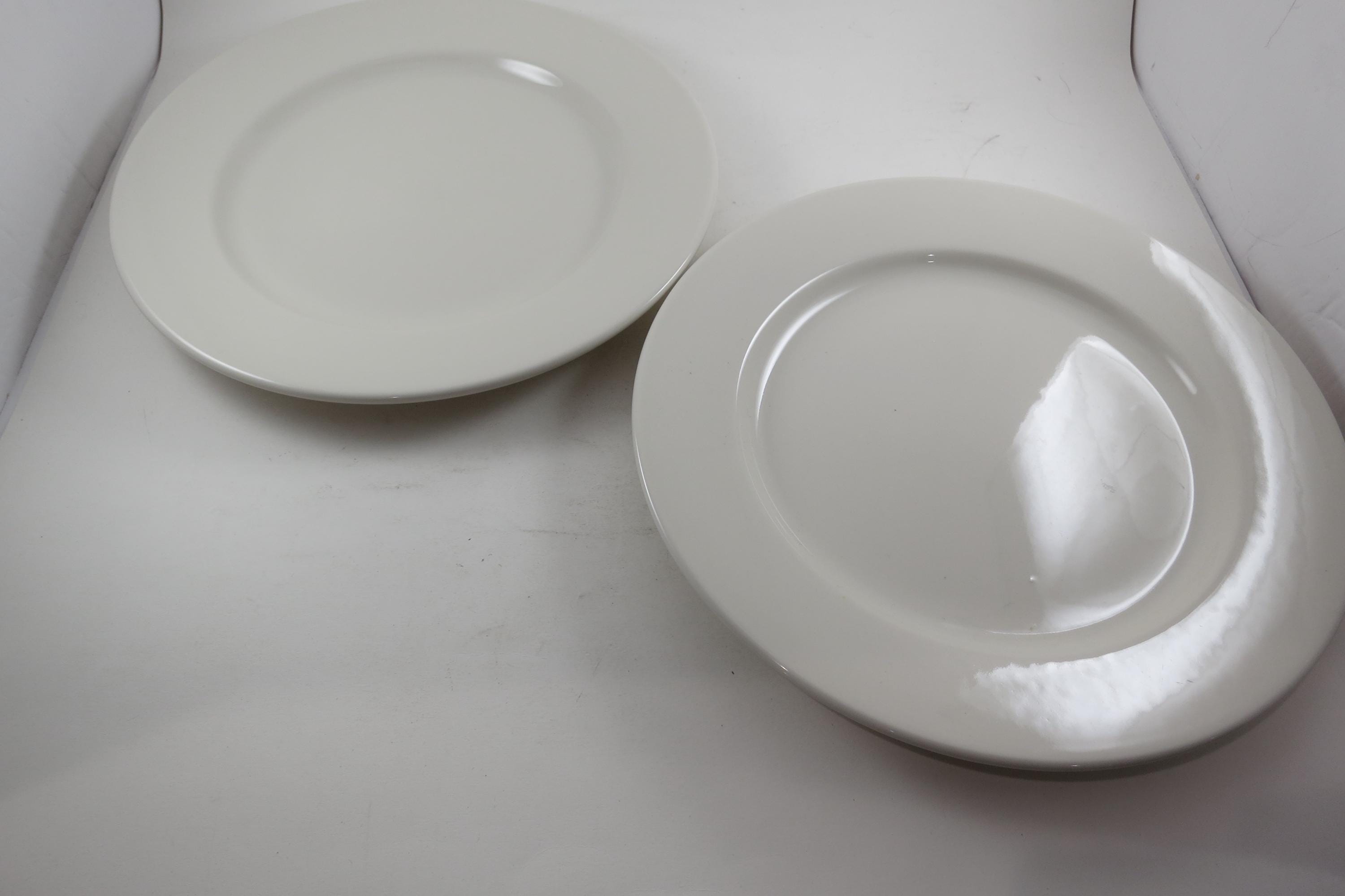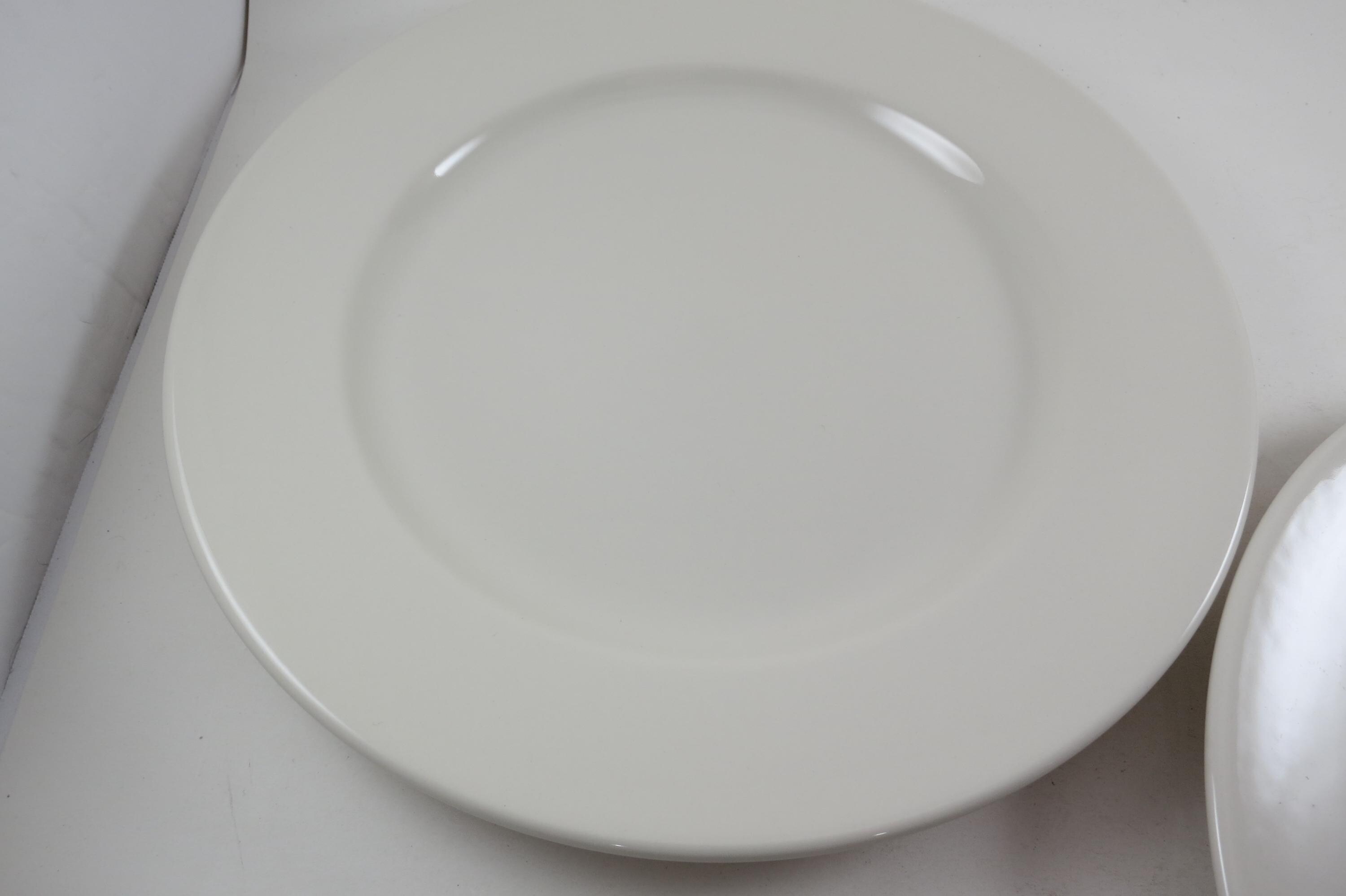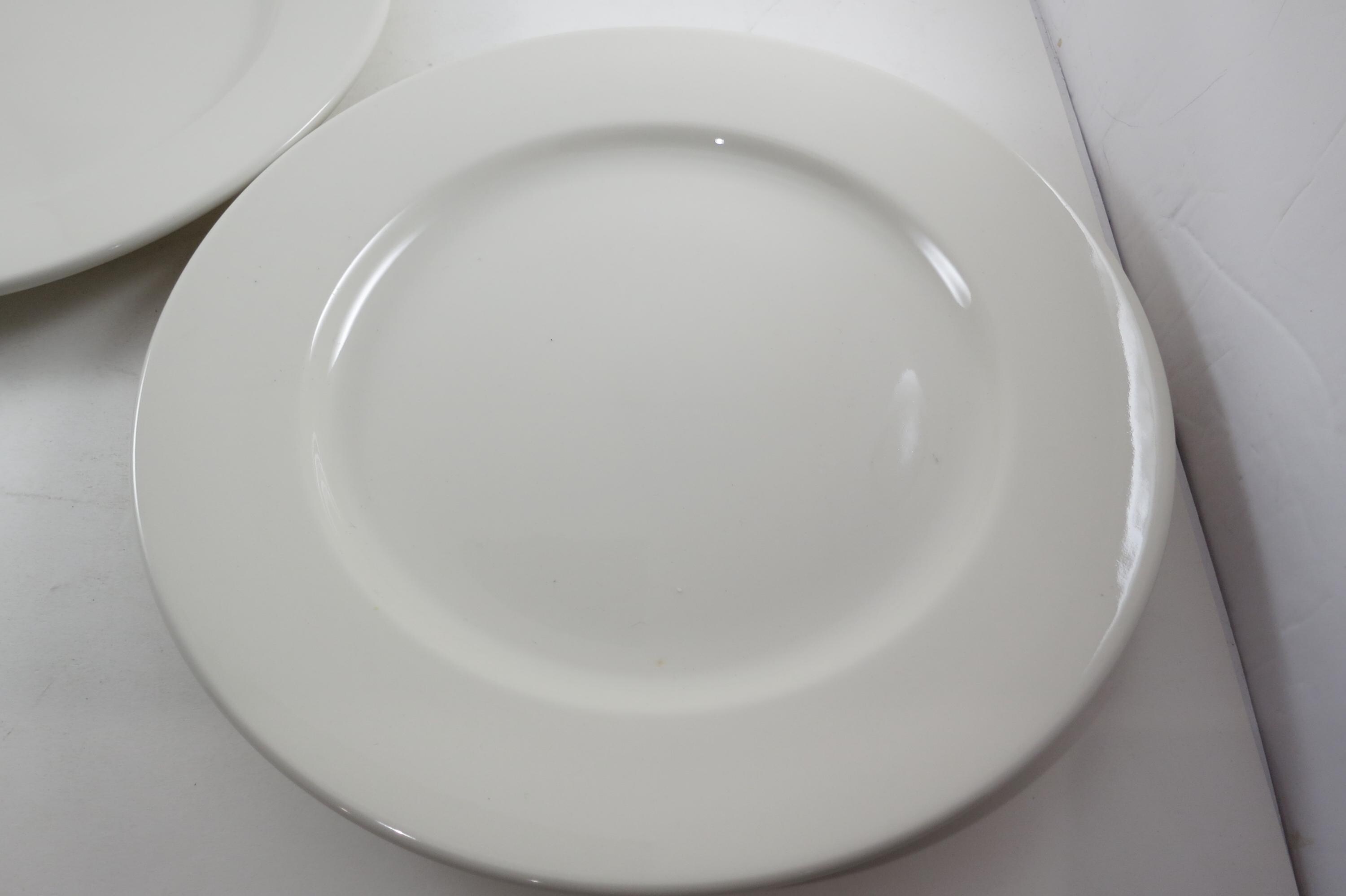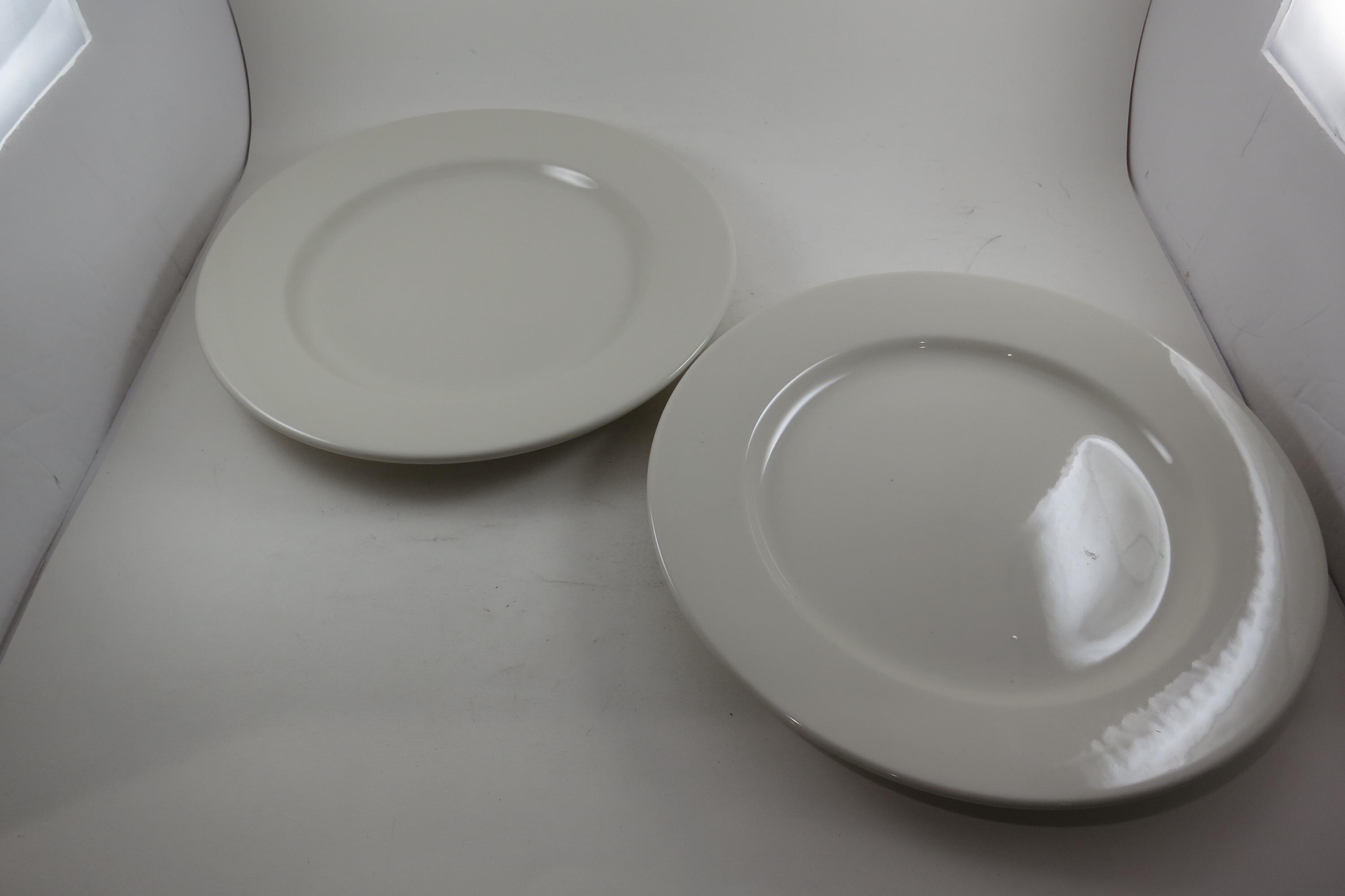 Pair of Homer Laughlin China Restaurant Ware Off White 12 1/4 Inch Round Dinner Plates Excellent Condition. Both are in excellent condition with no chips, cracks or damages. Each measures 12 1/4 inches diameter. These are large, heavy good quality plates.