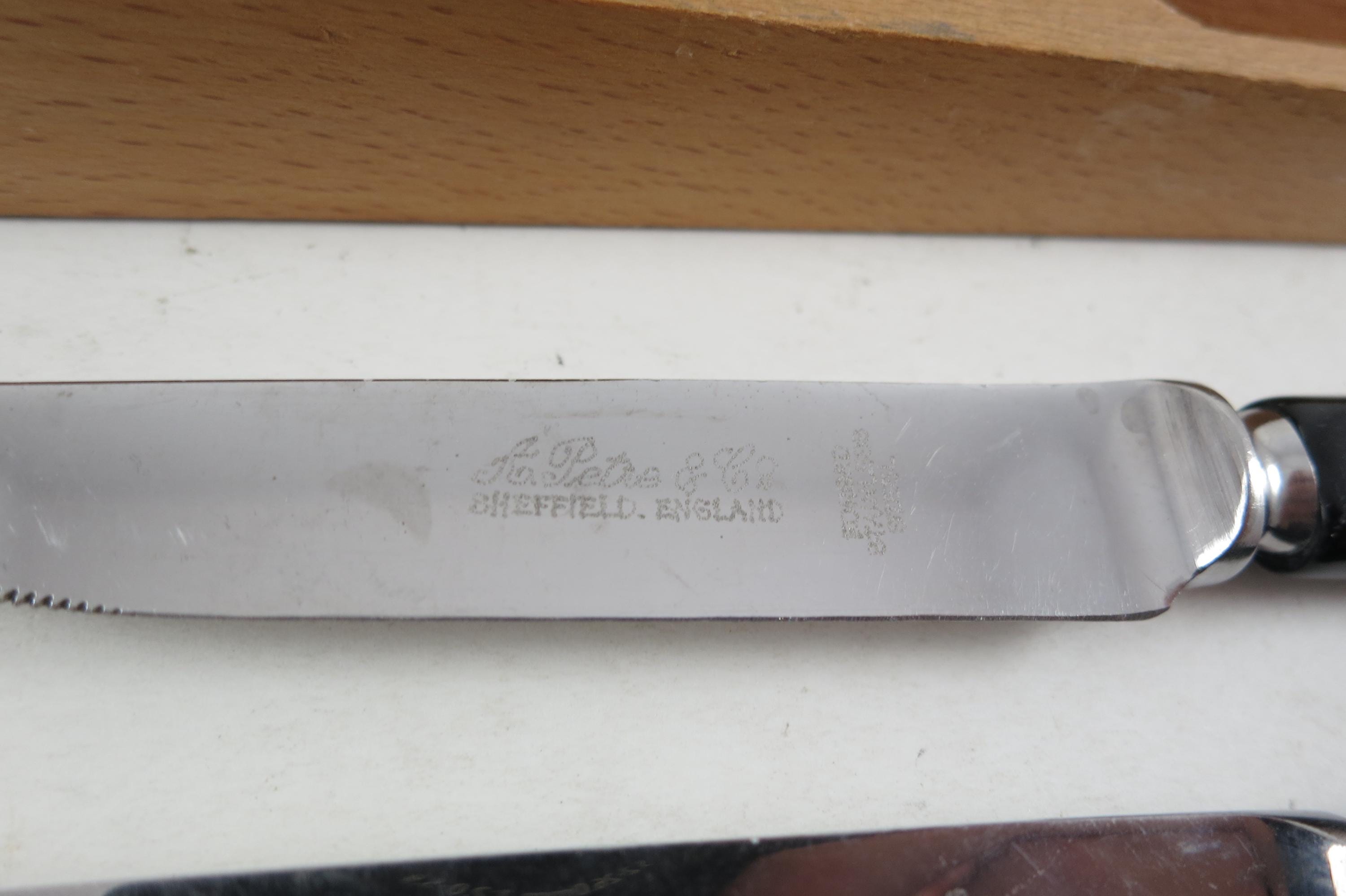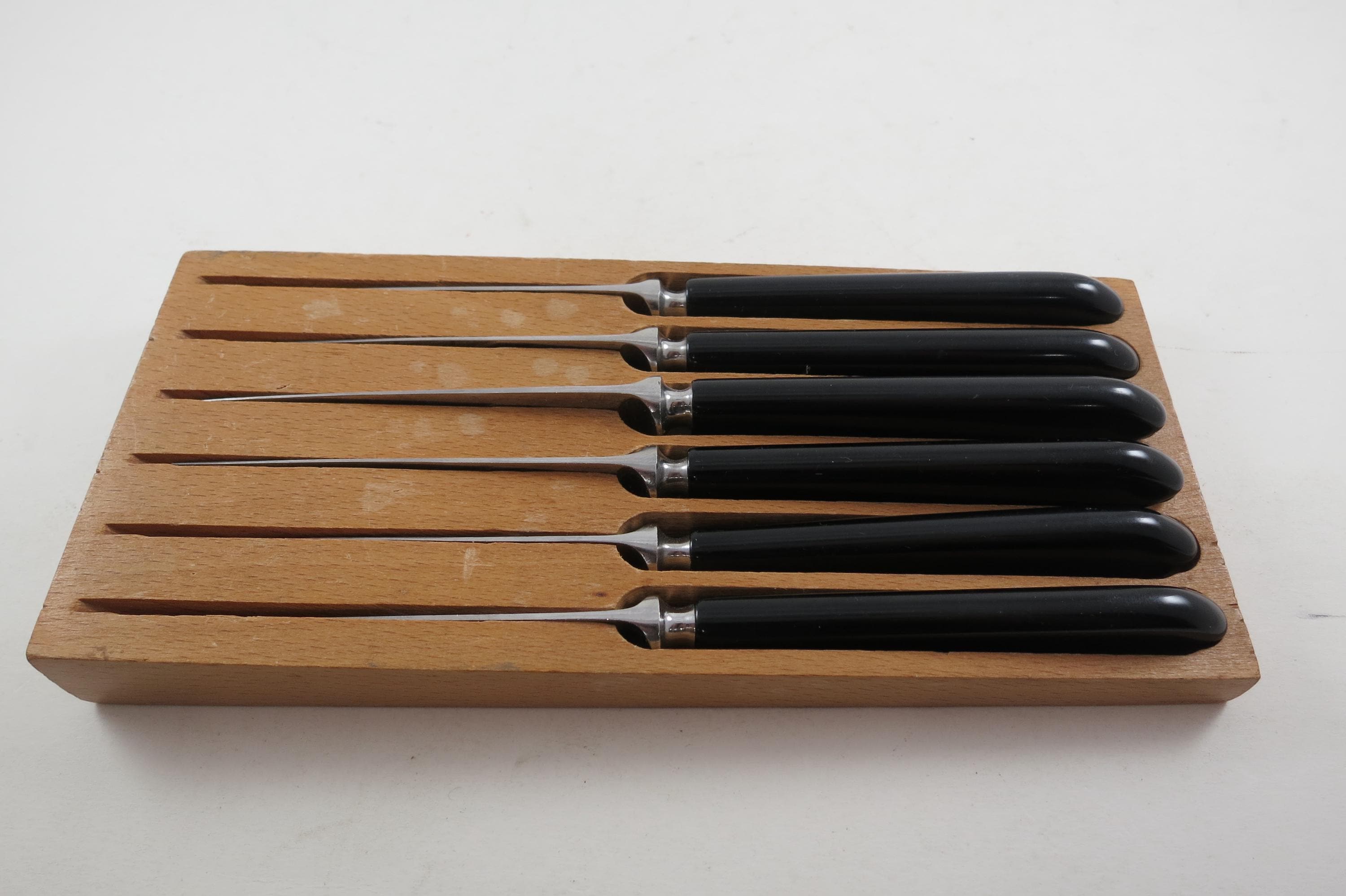 Sheffield Steak Knives Set, Stainless Steel with Bakelite Handles, Wooden Block