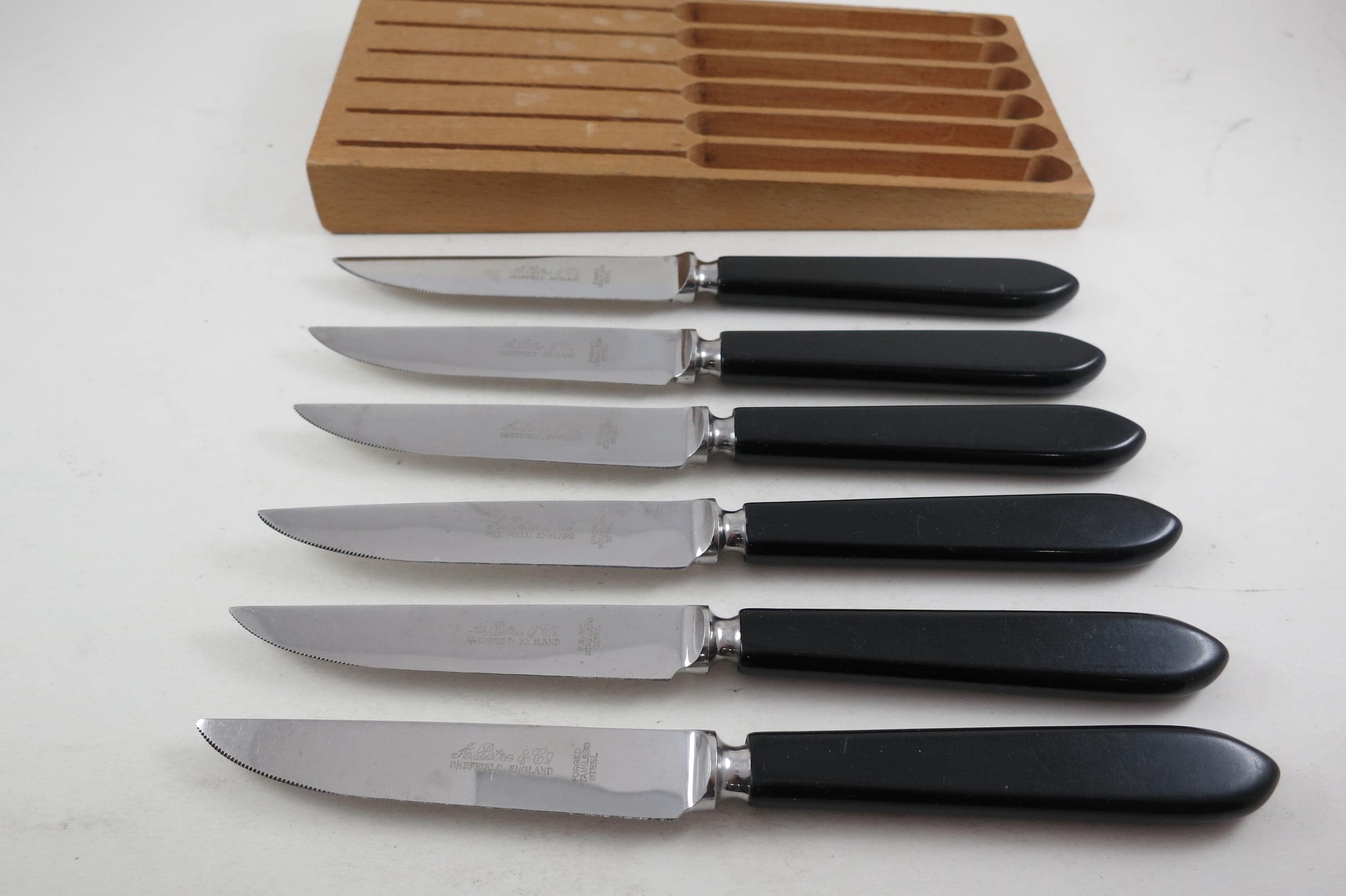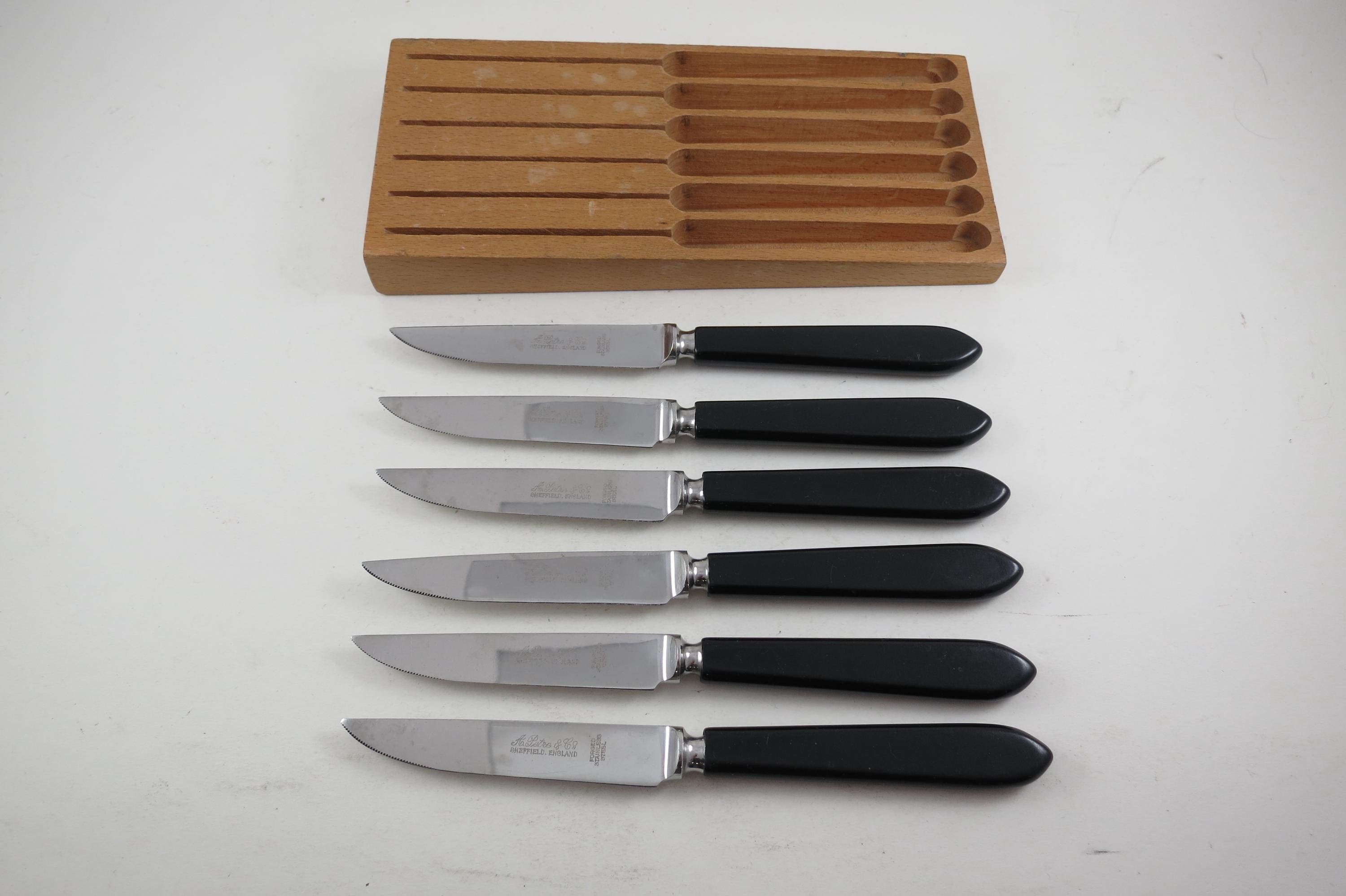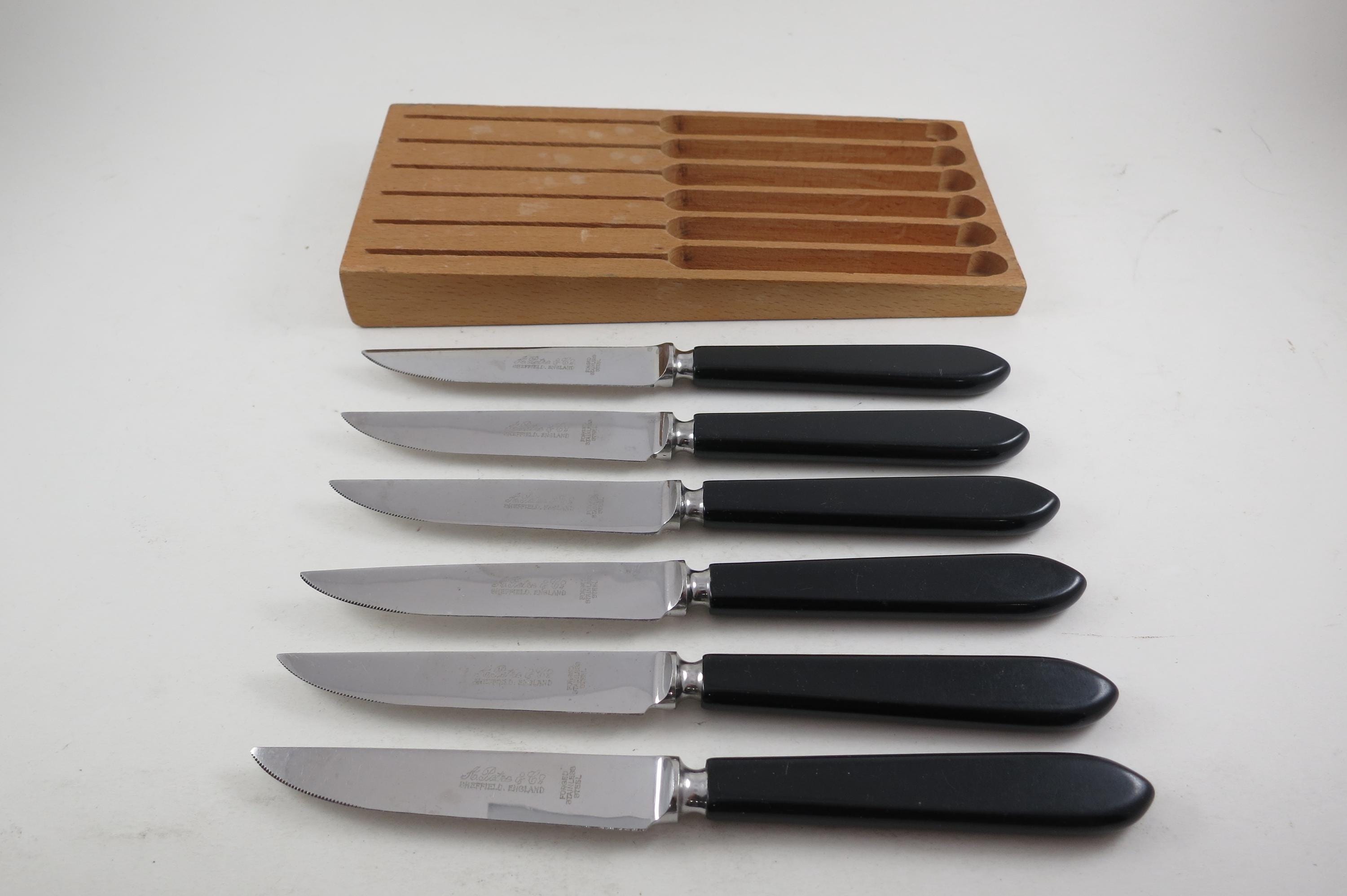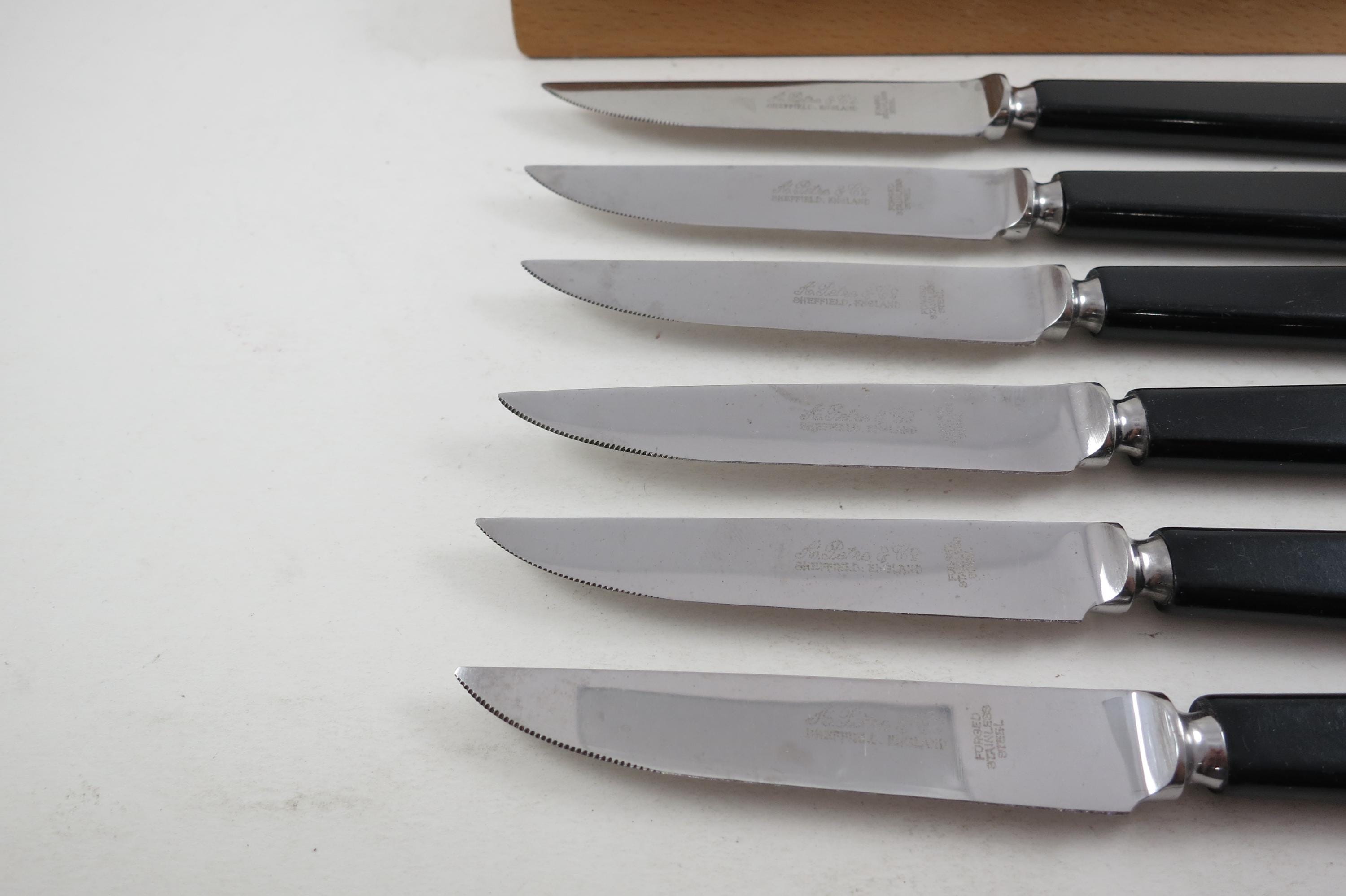 Set of Six A Petre & Co Sheffield England Steak Knives Forged Stainless Steel Bakelite Handles In Wooden Block Holder. Knives are 7 1/2 inches long with 3 3/4 inch blades. Nice Set!