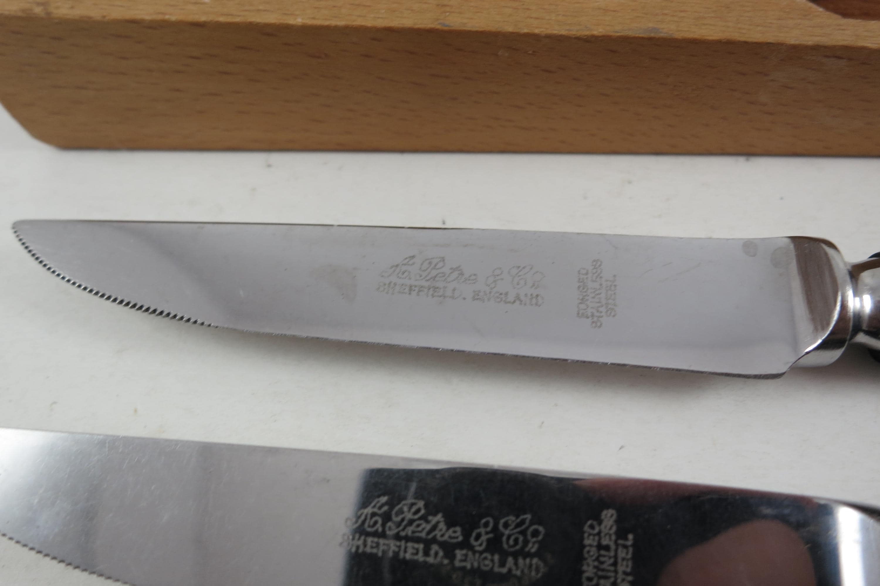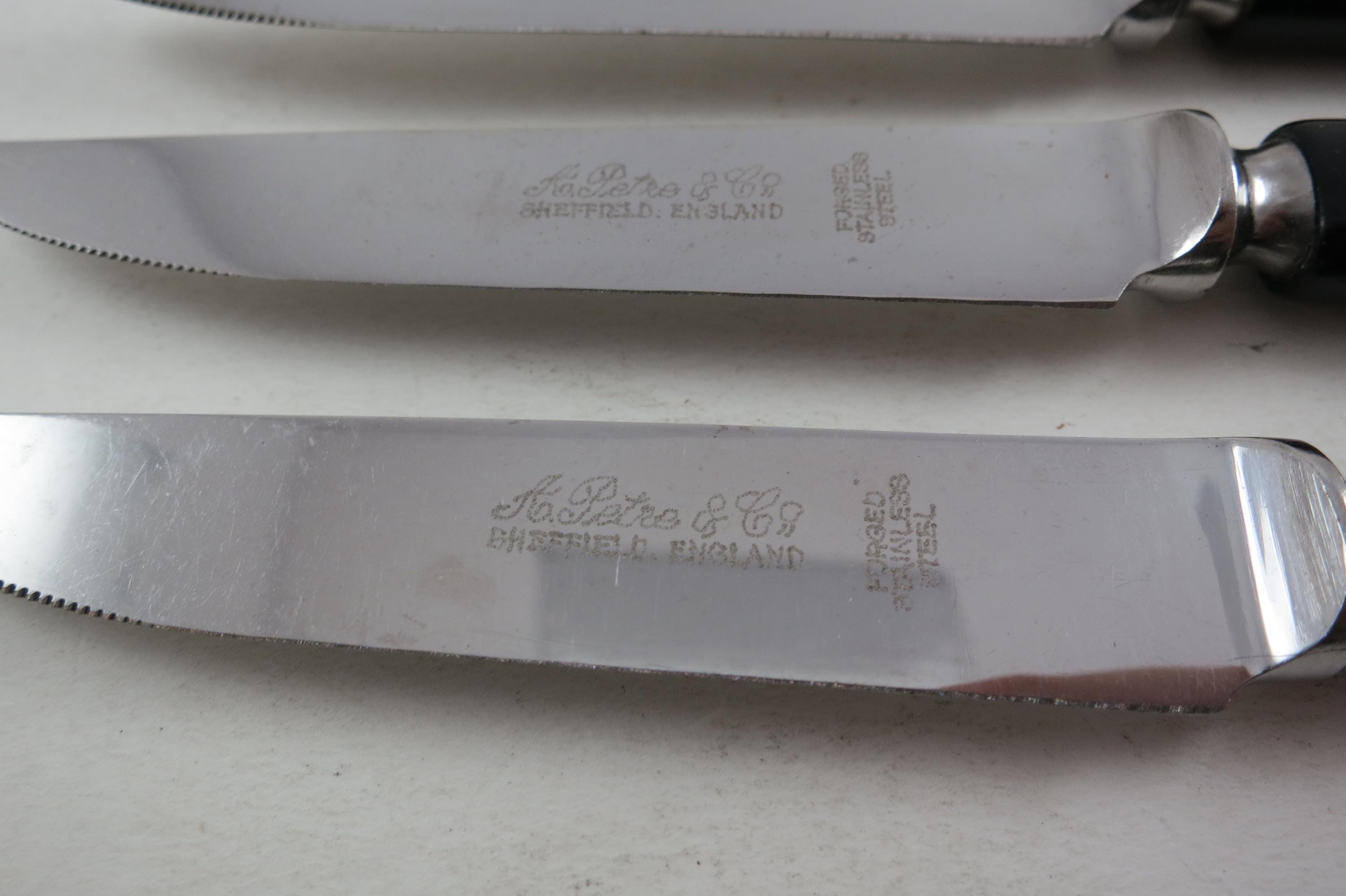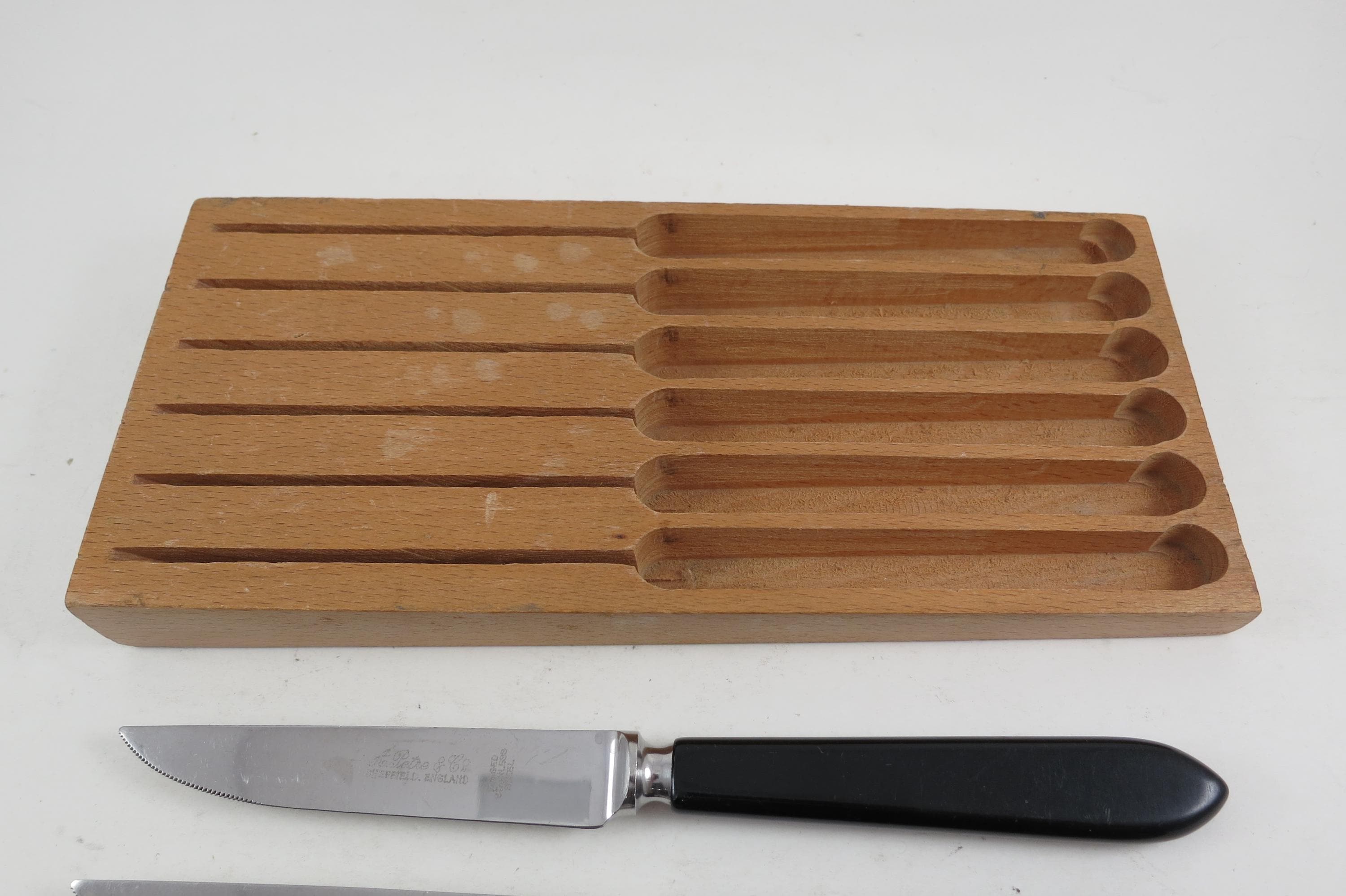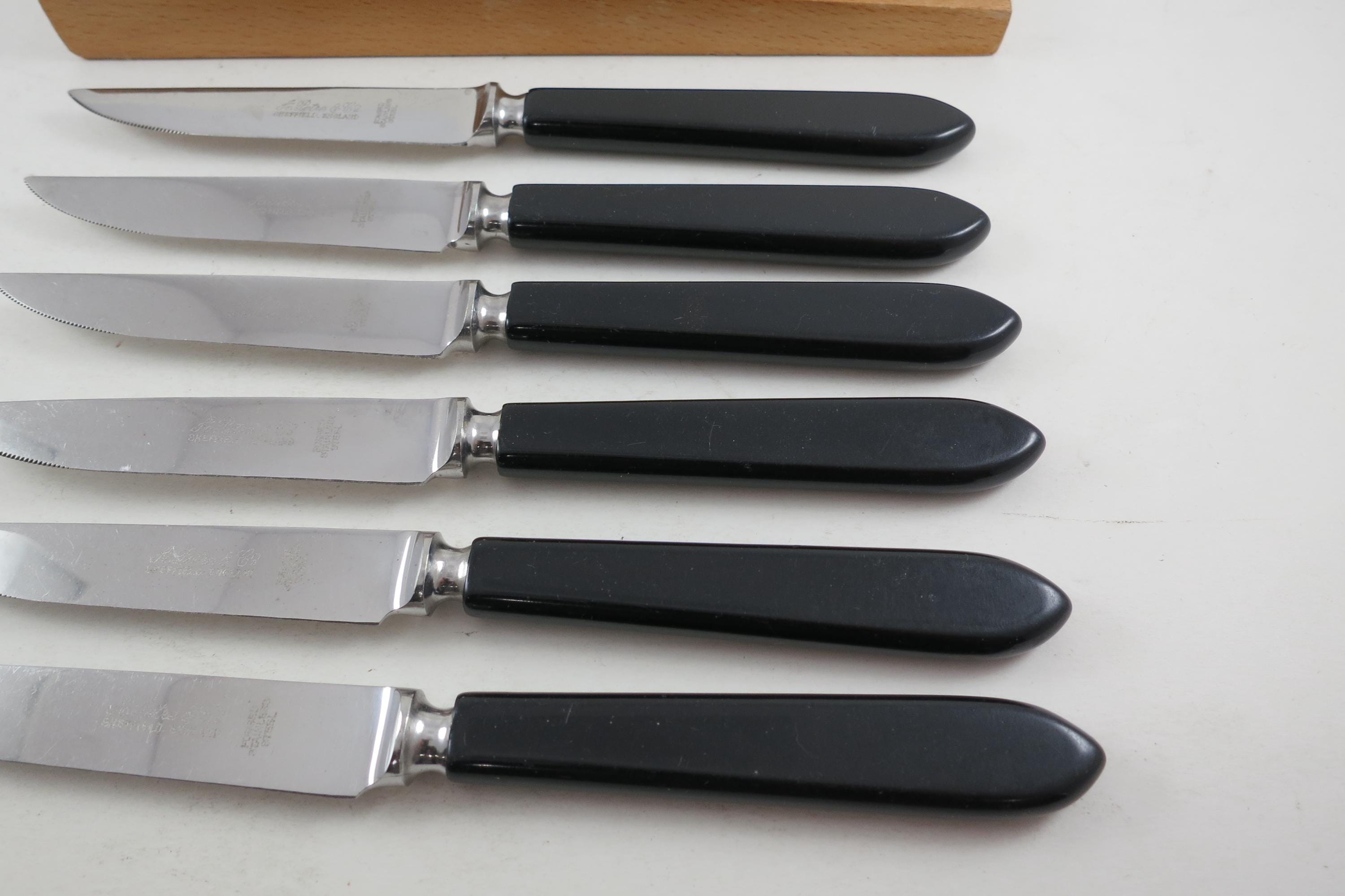 Set of Six A Petre & Co Sheffield England Steak Knives Forged Stainless Steel Bakelite Handles In Wooden Block Holder. Knives are 7 1/2 inches long with 3 3/4 inch blades. Nice Set!