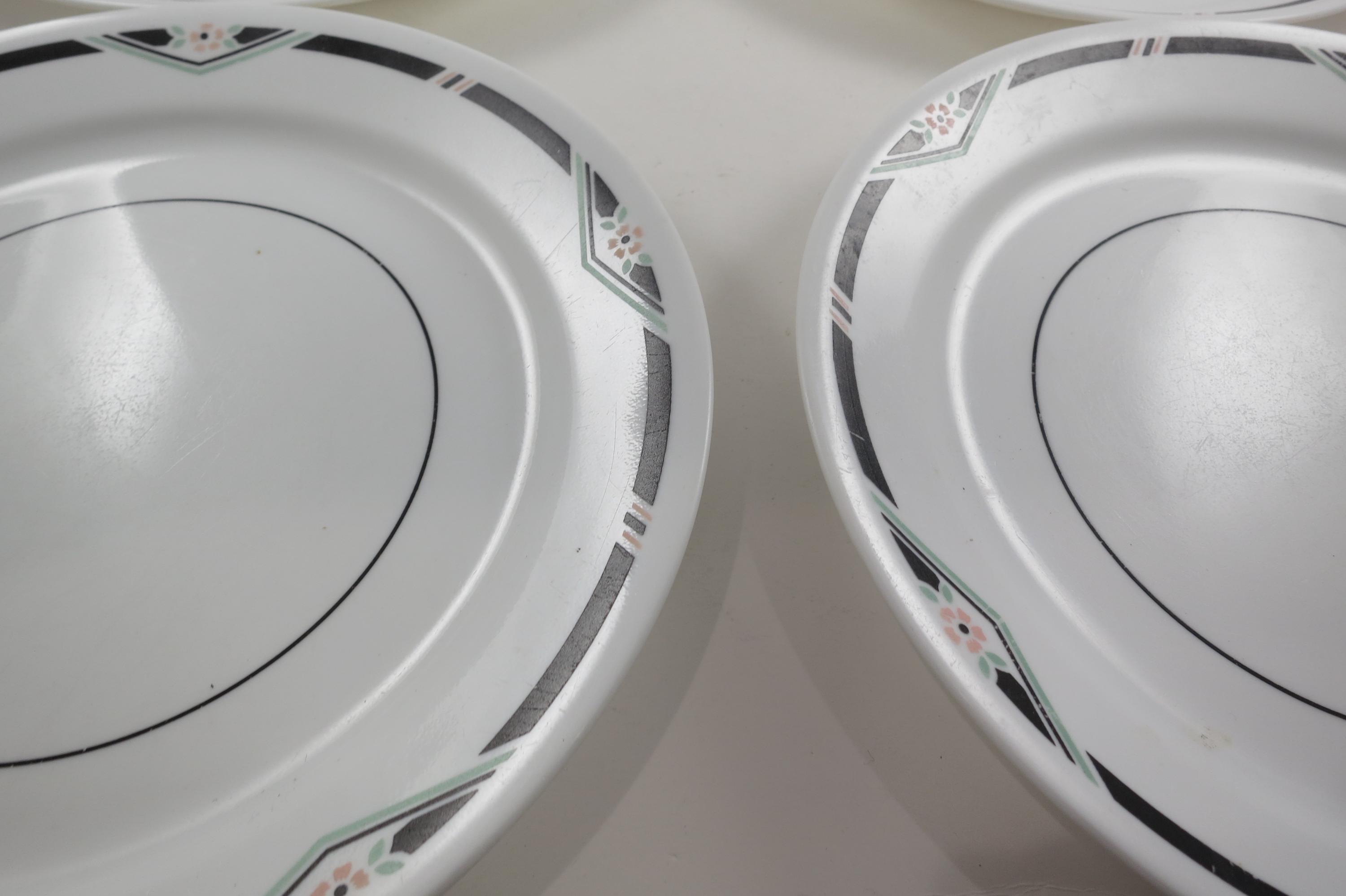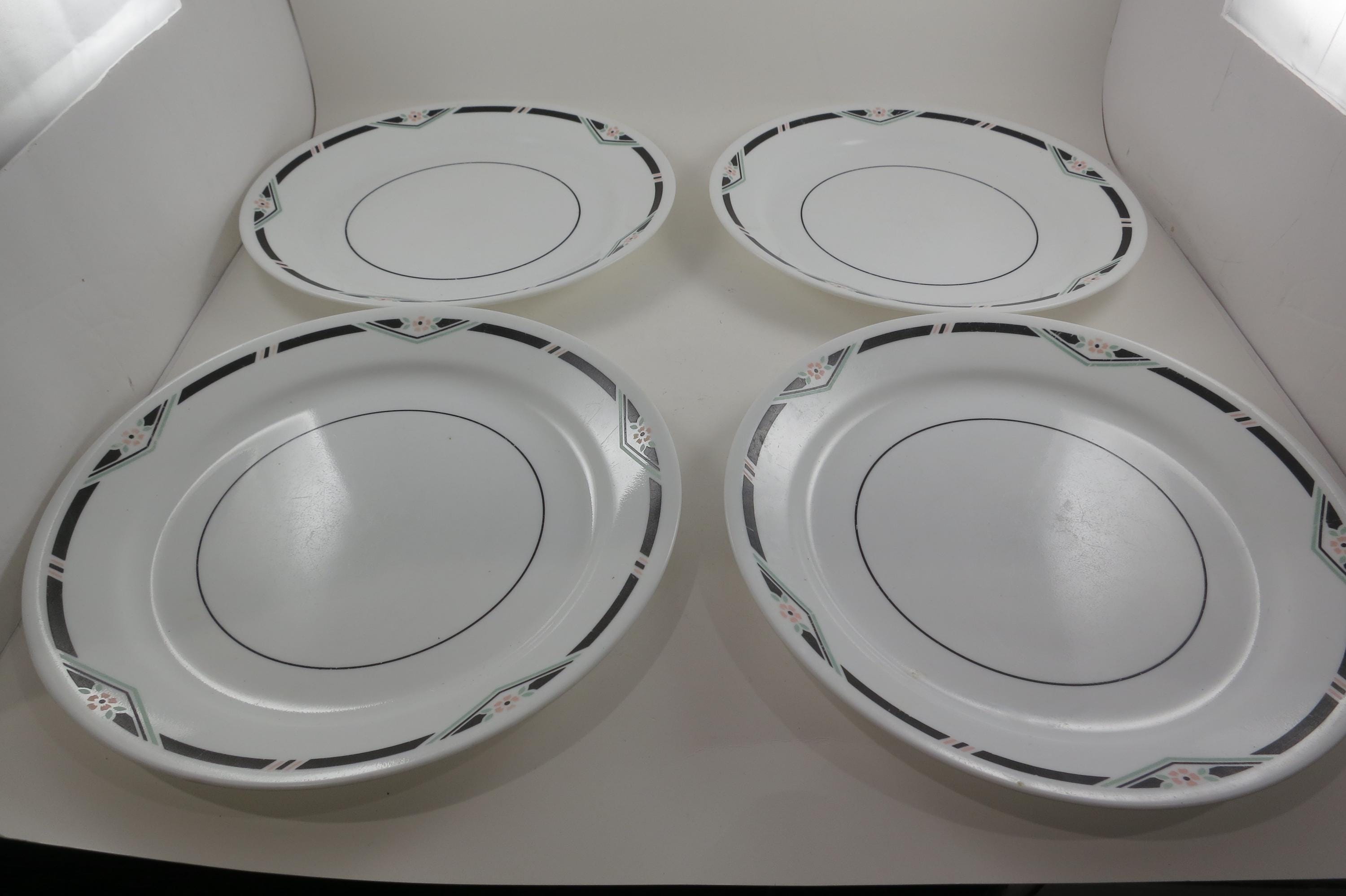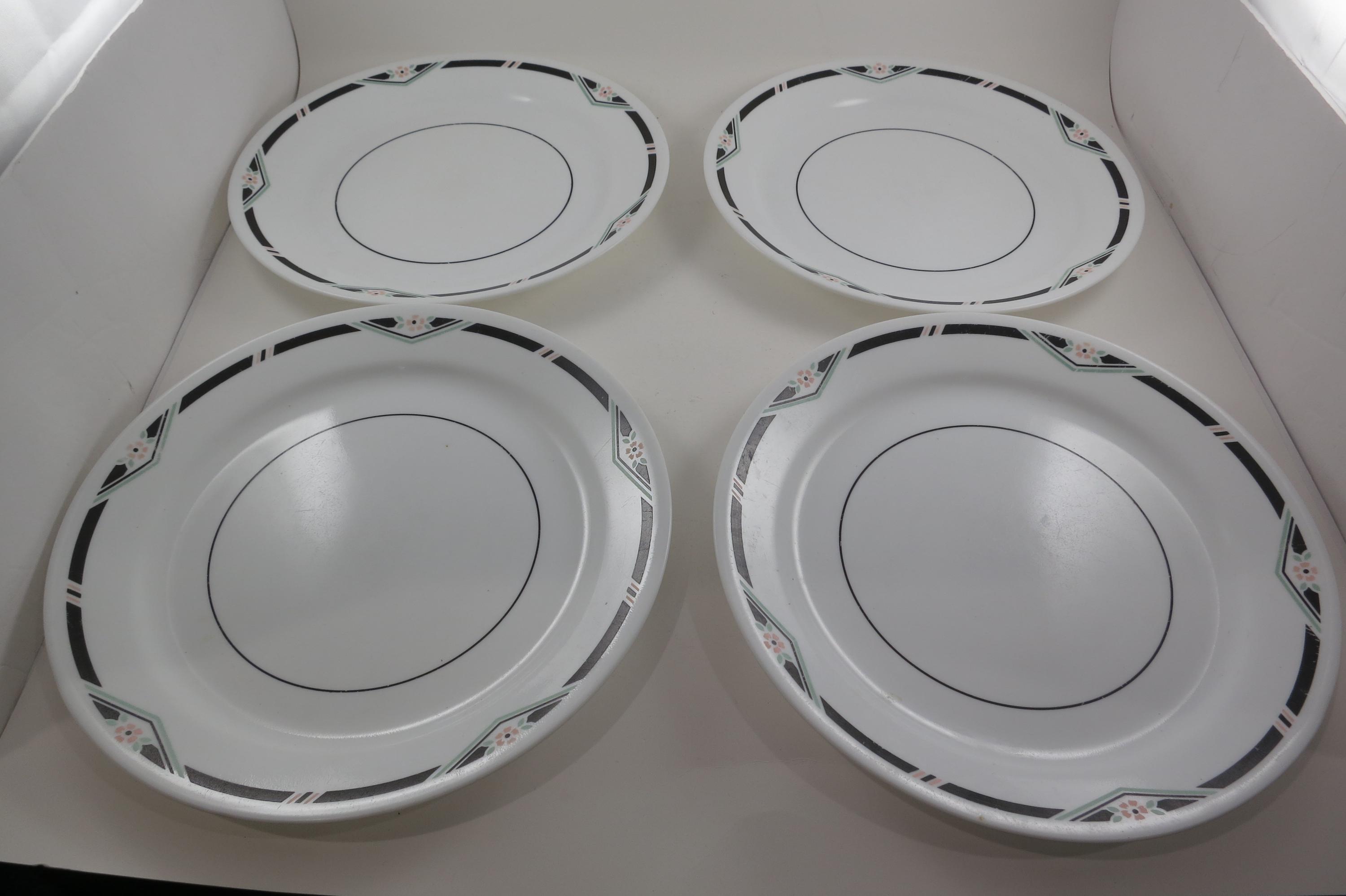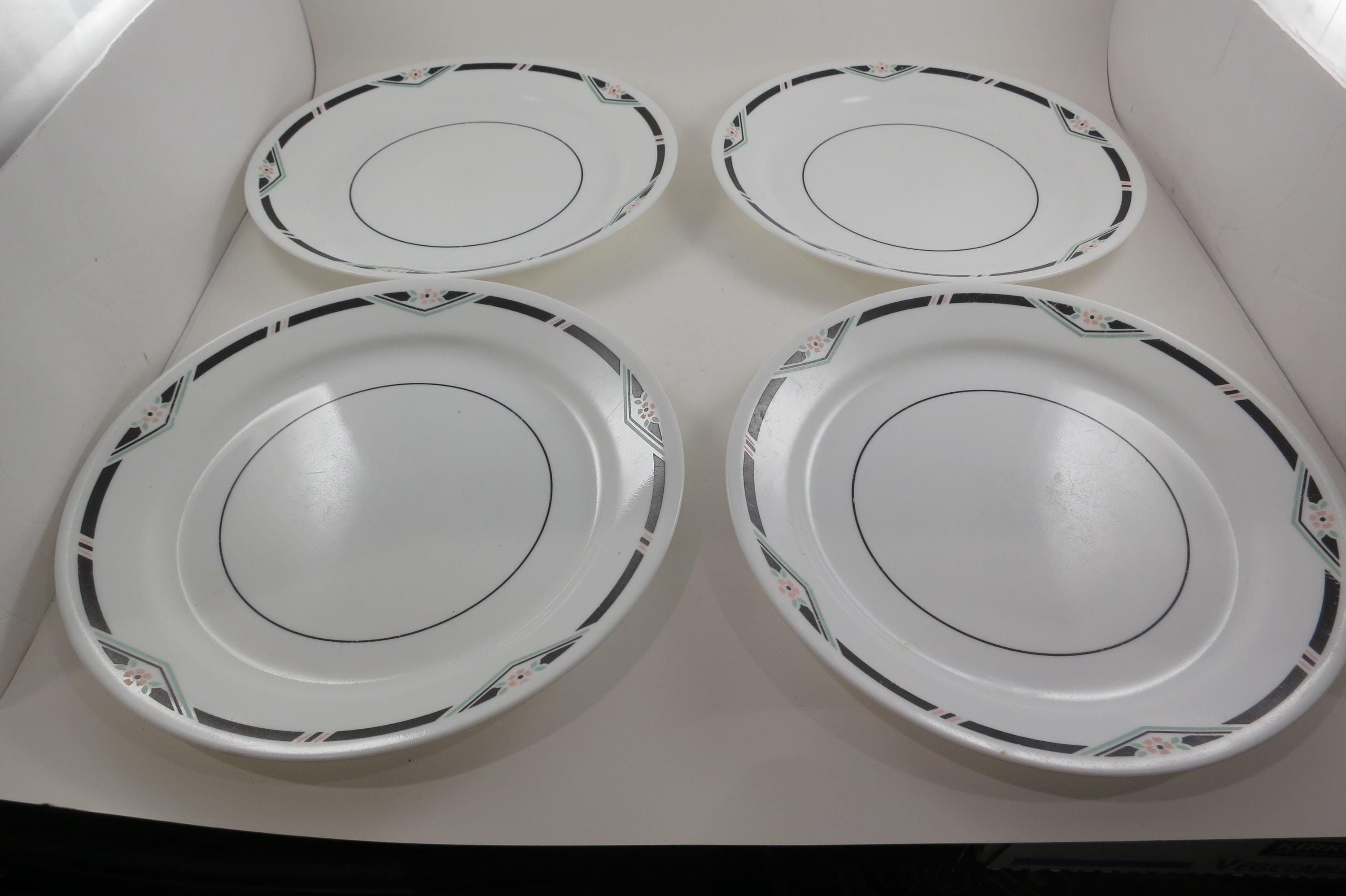 Set of Four Vintage Corelle by Corning Zenith Black 10 1/4 Inch Dinner Plates Very Good Used Condition. No chips, cracks or damages, they do have marks from flatware.