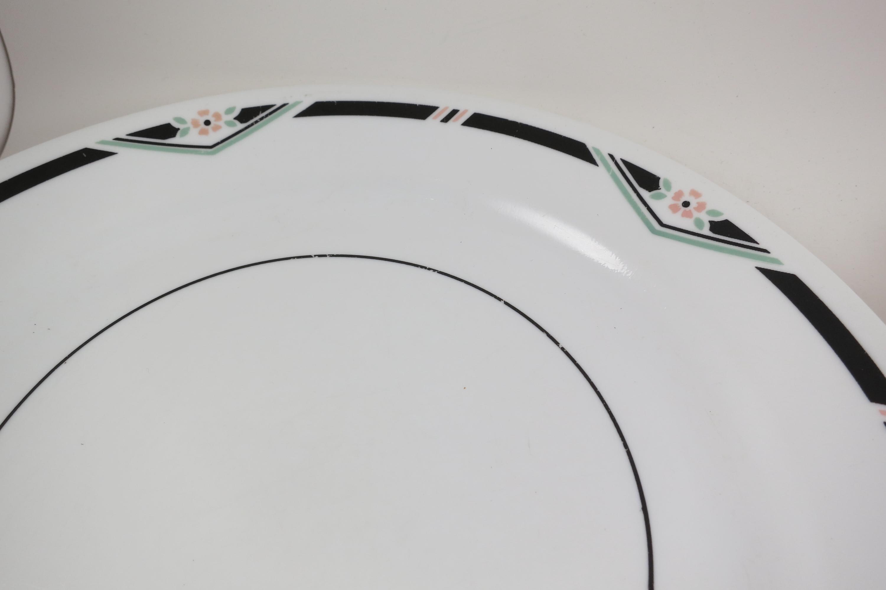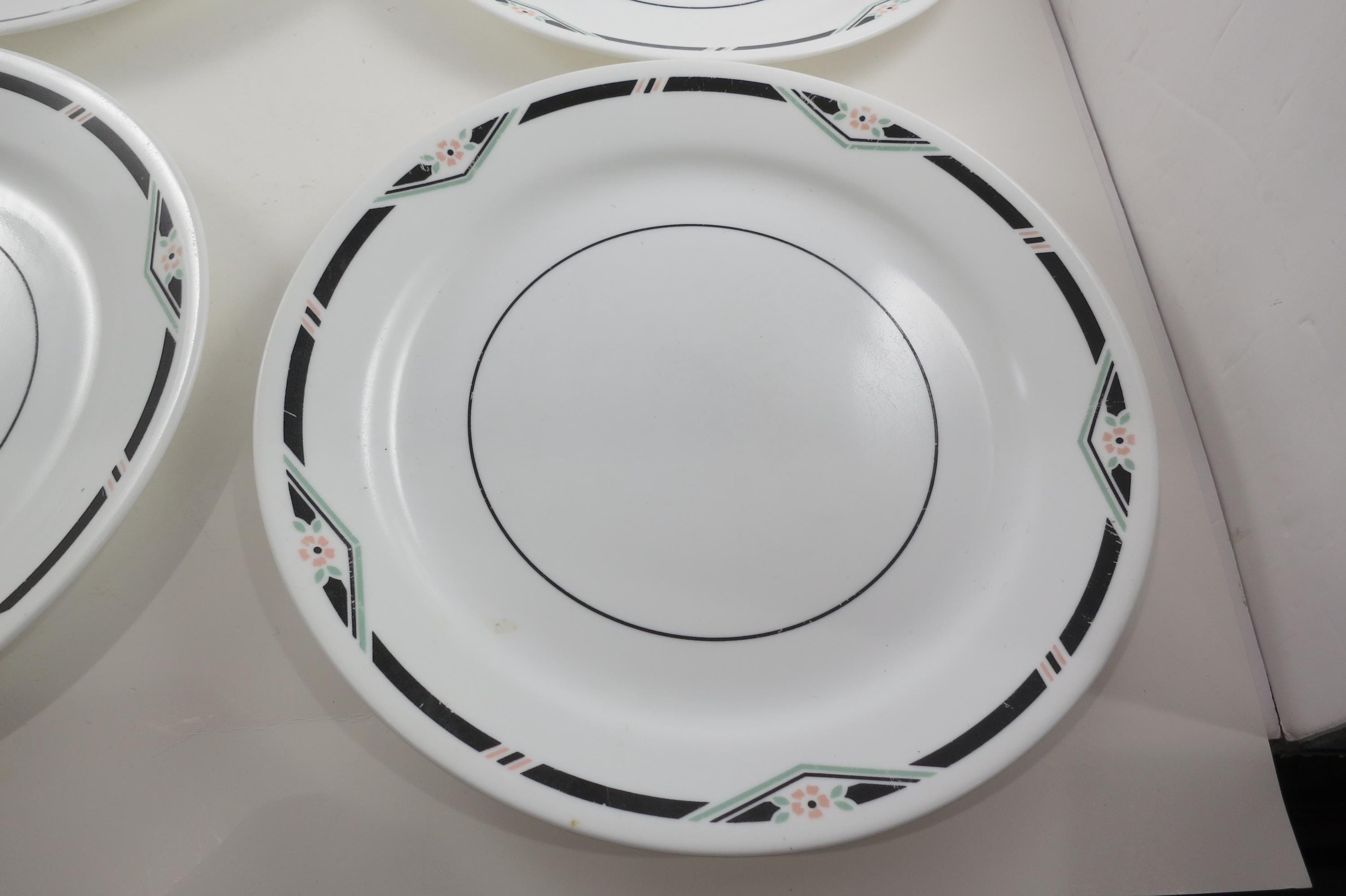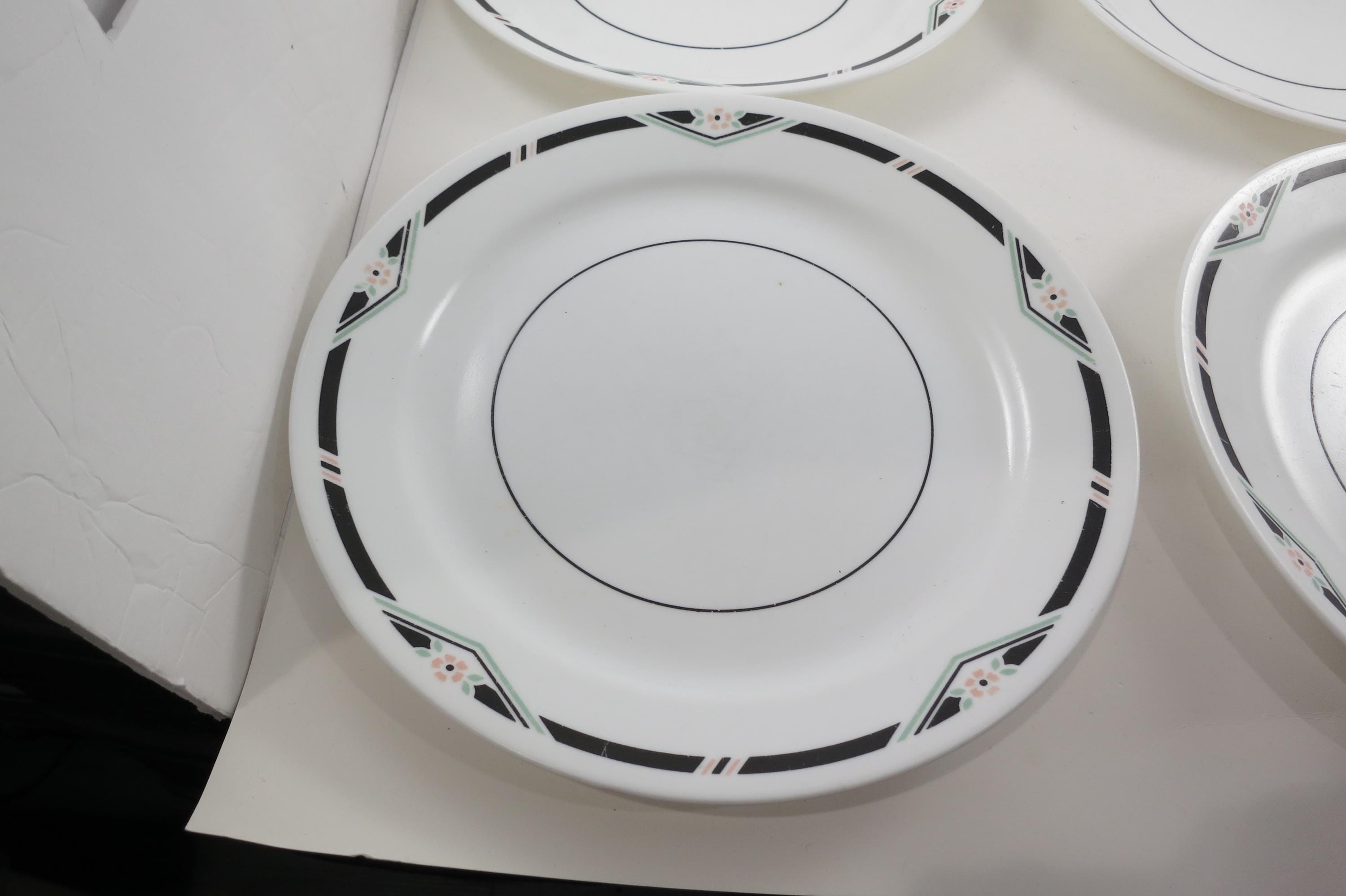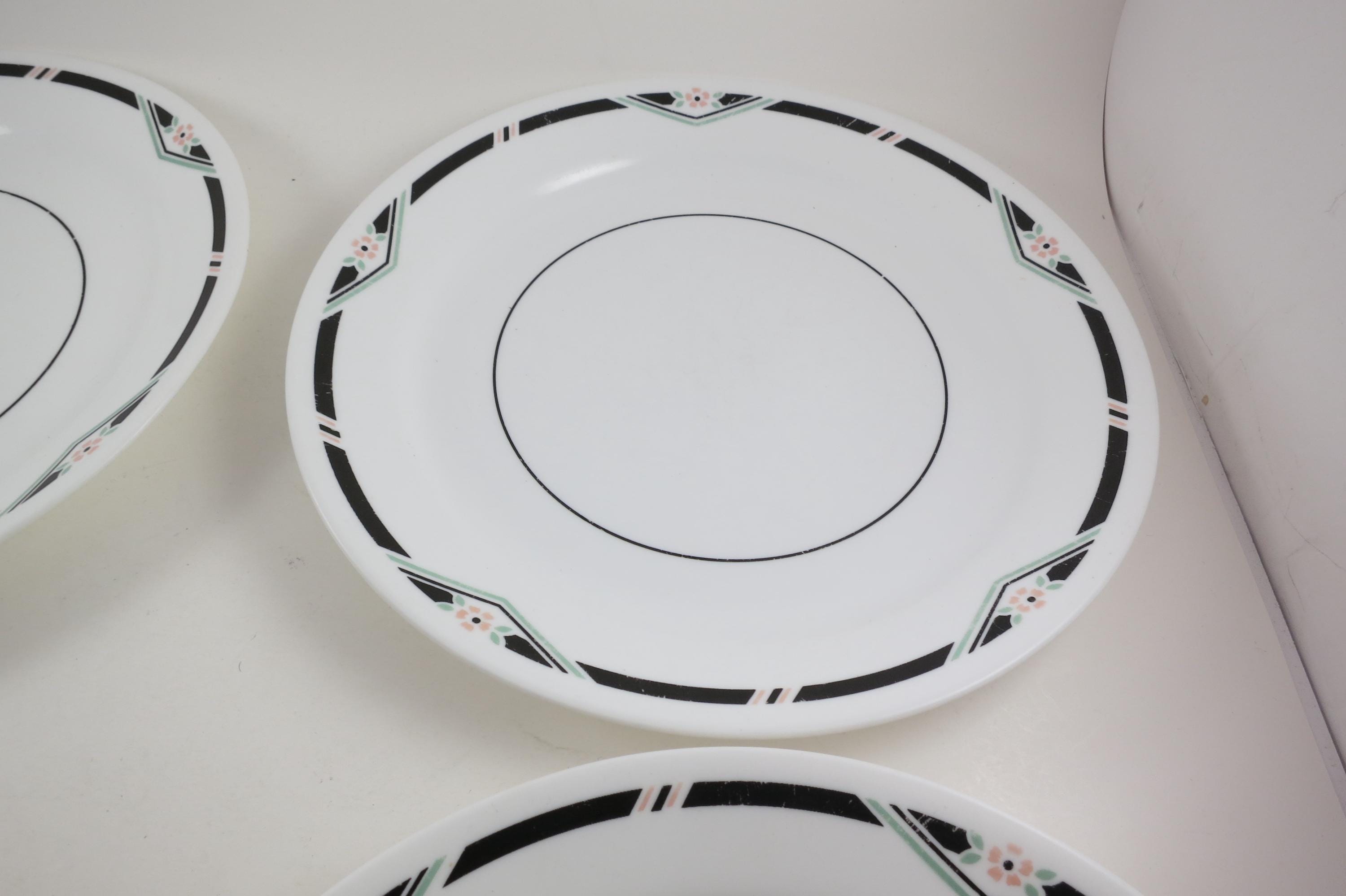 Set of Four Vintage Corelle by Corning Zenith Black 10 1/4 Inch Dinner Plates Very Good Used Condition. No chips, cracks or damages, they do have marks from flatware.
