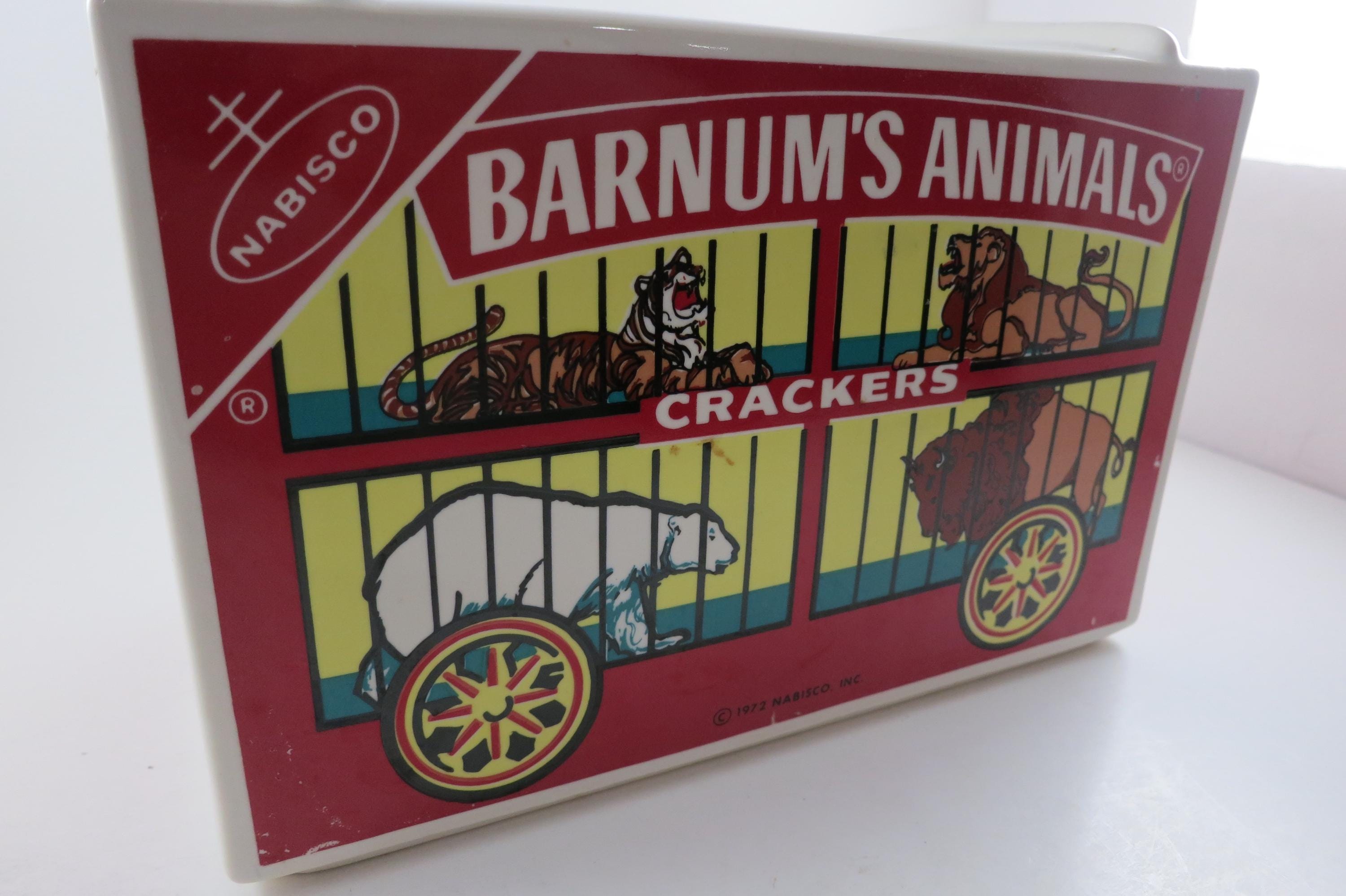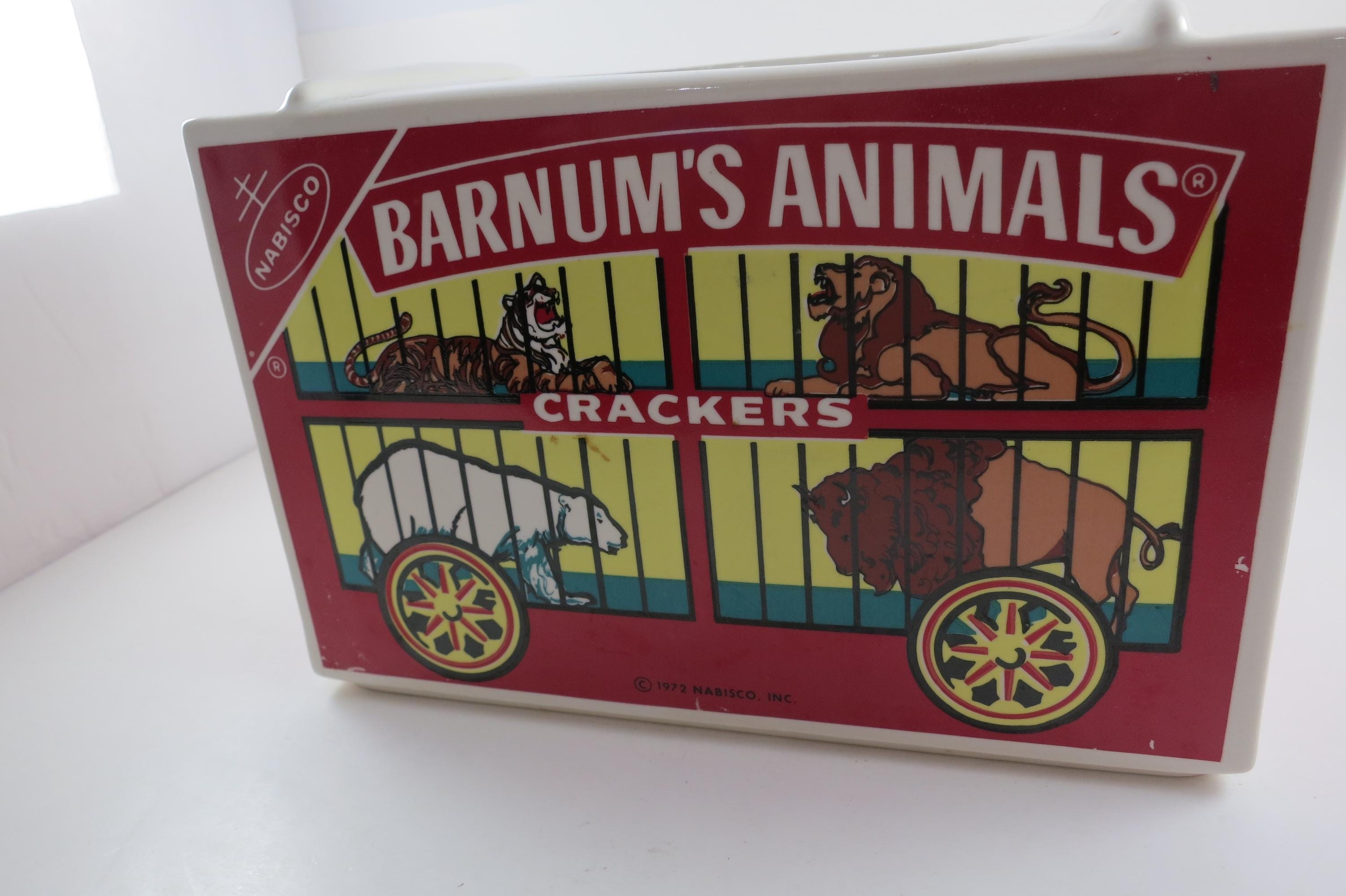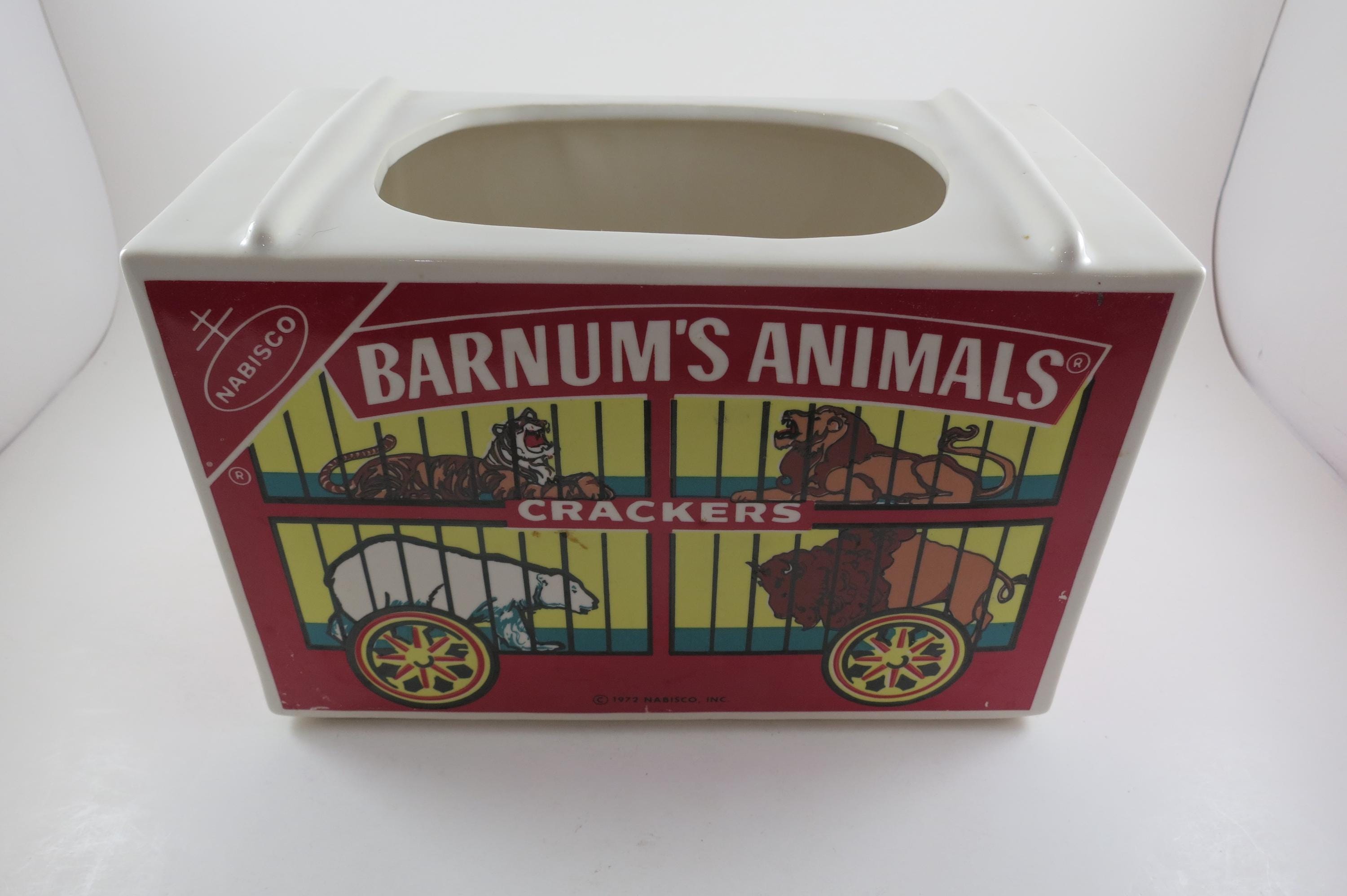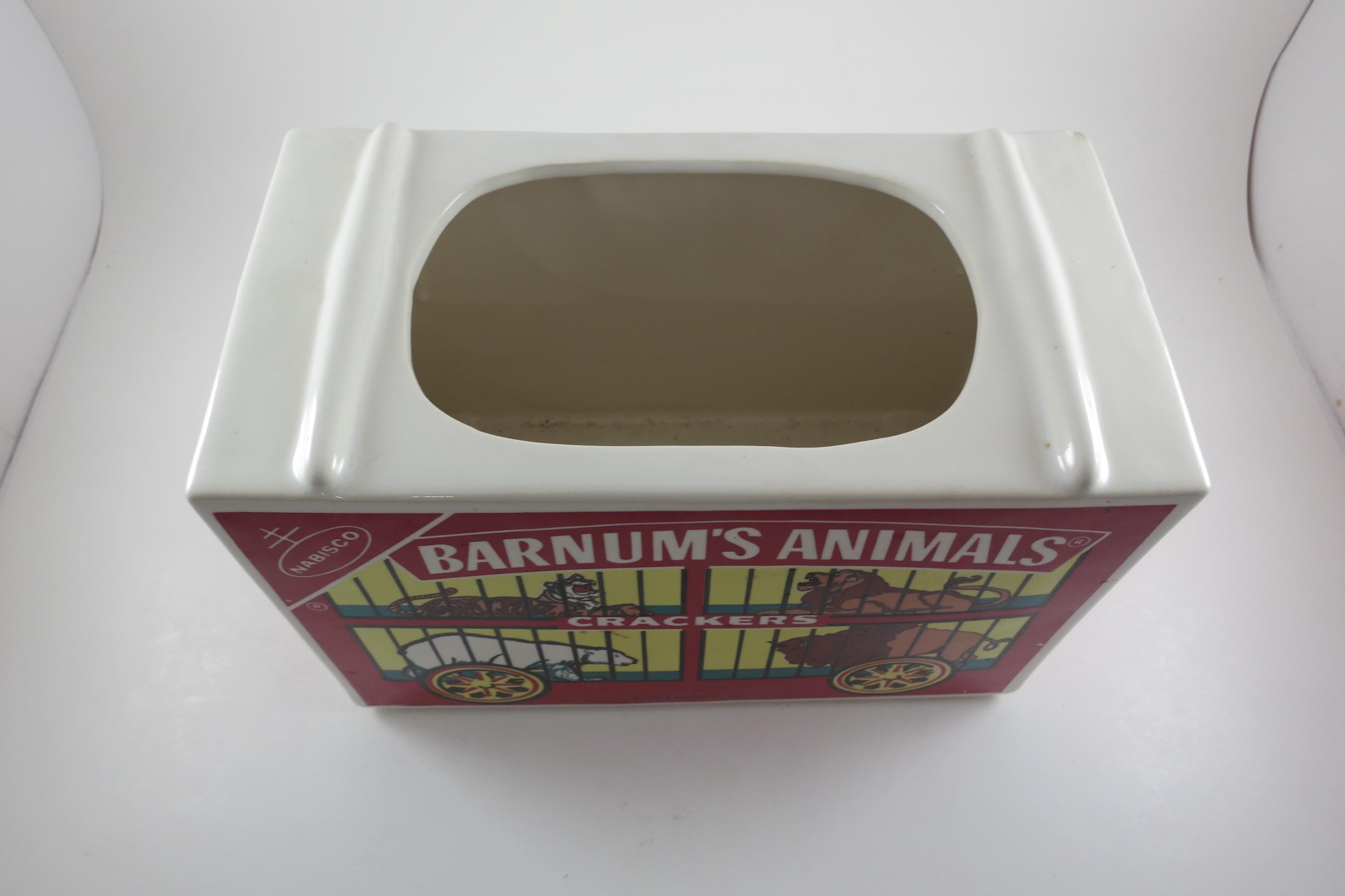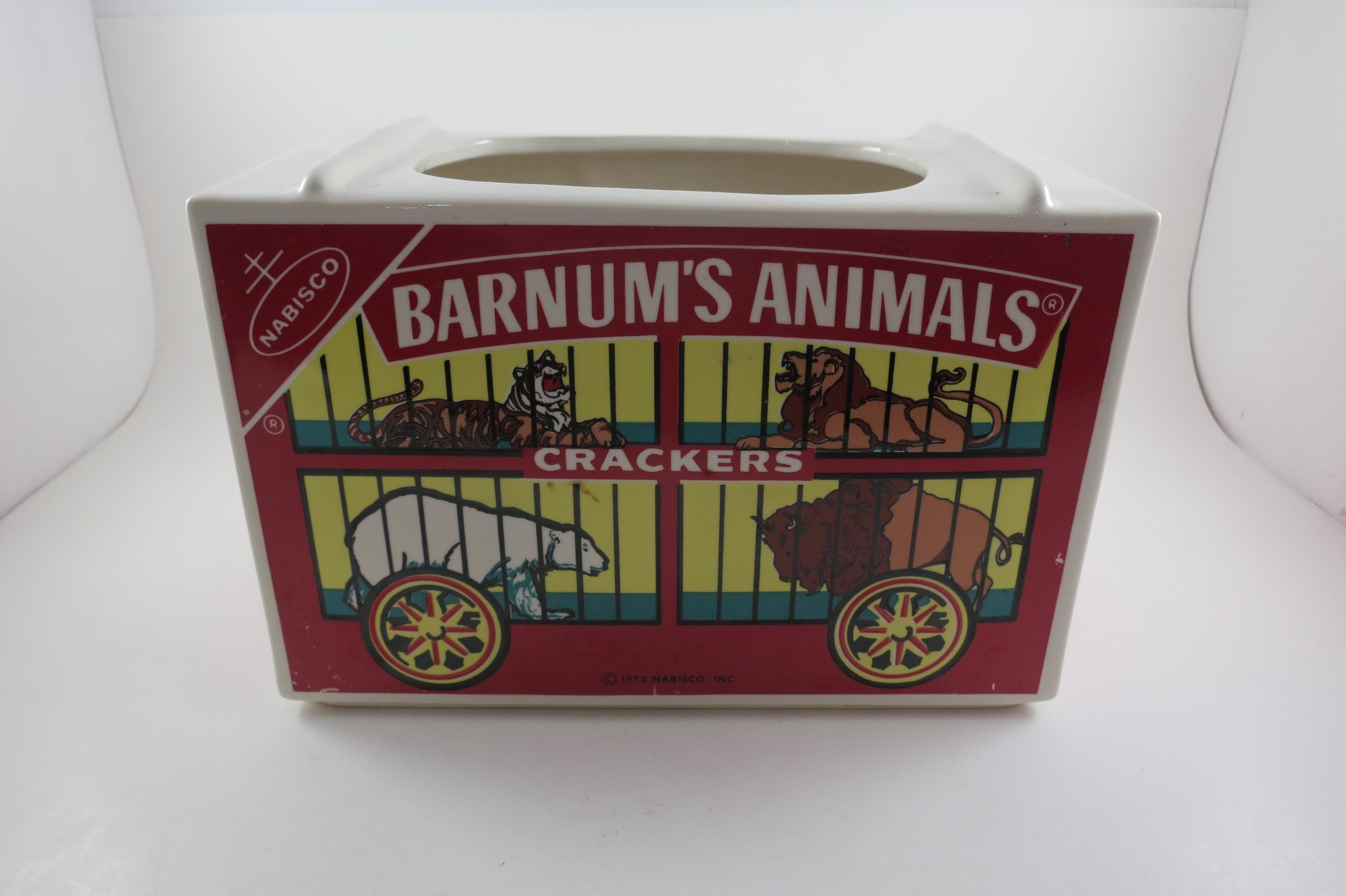 Vintage 1972 Nabisco Barnum's Animals Crackers Cookie Jar No Lid. Measures 9 1/4 inches wide, 5 inches deep and 6 1/4 inches tall. Has one tiny ceramic ding on the back right corner.