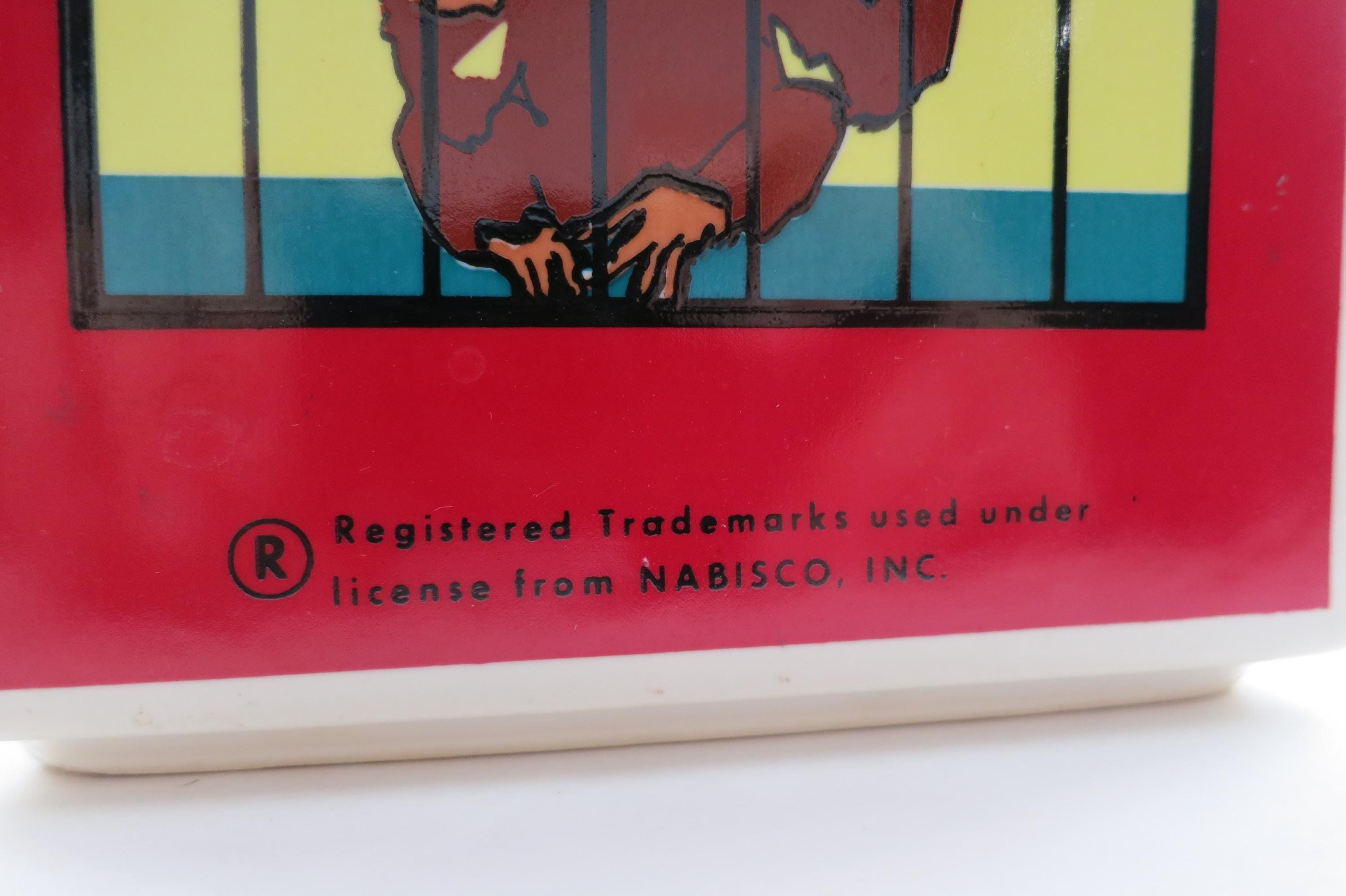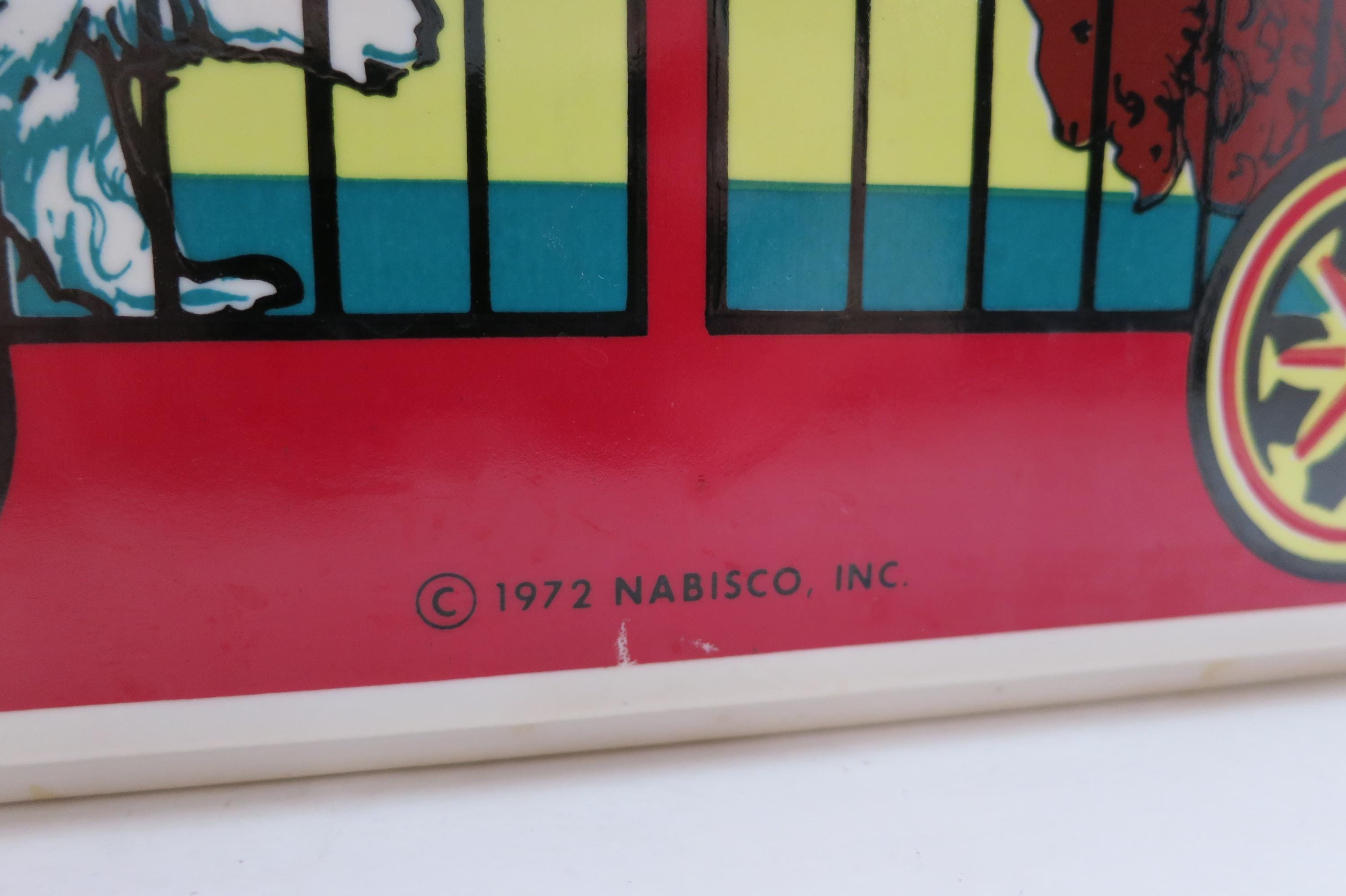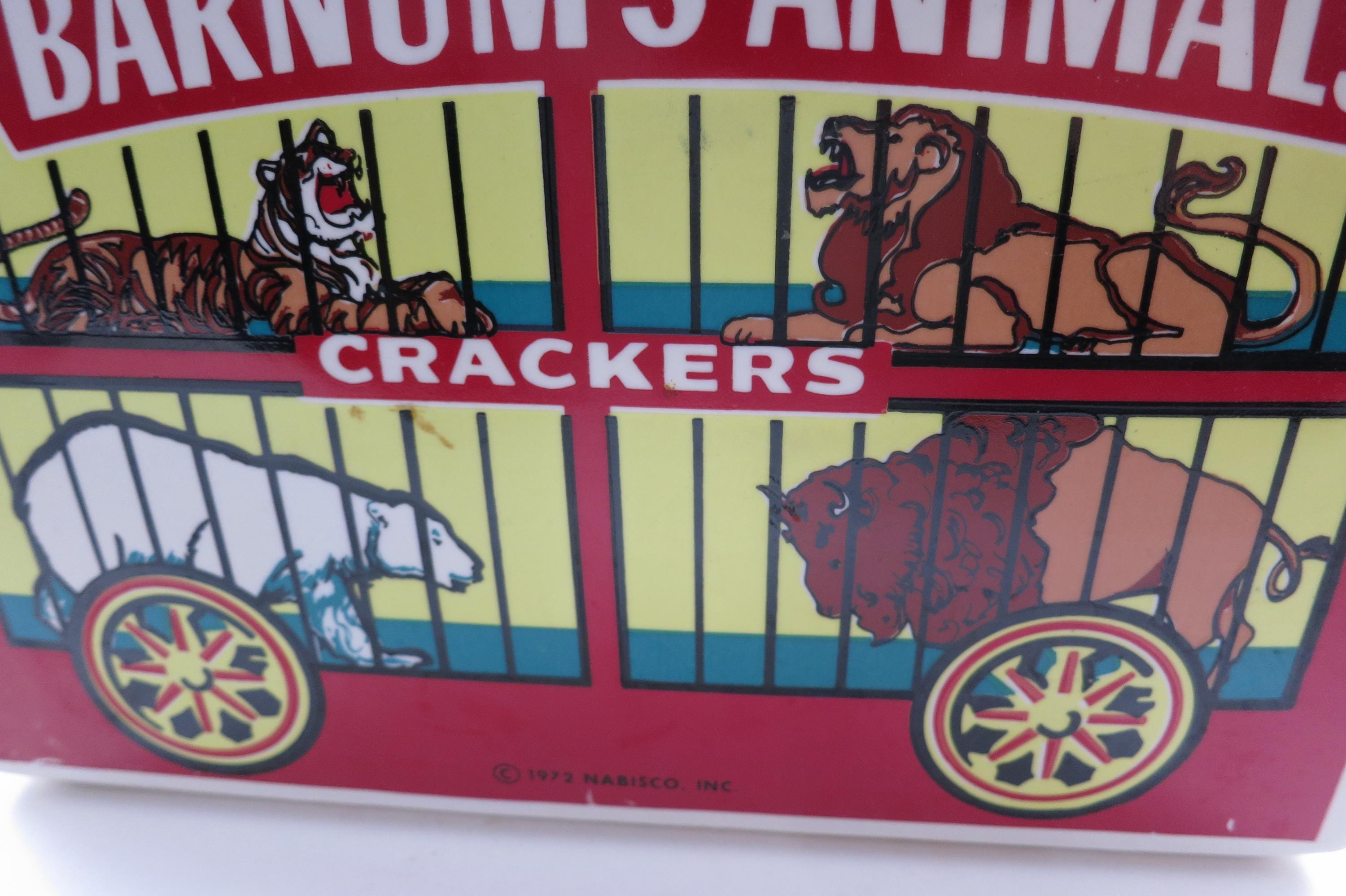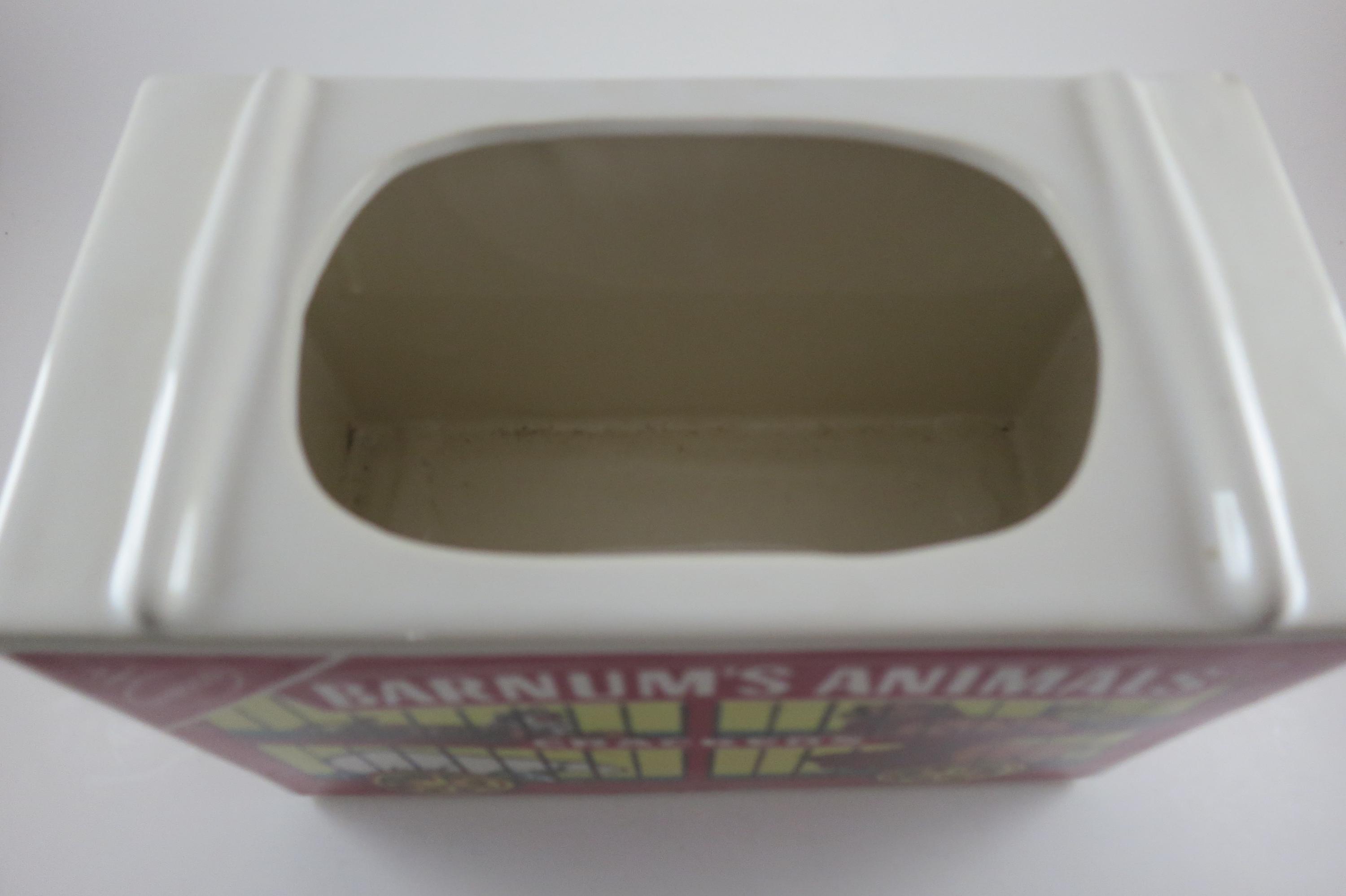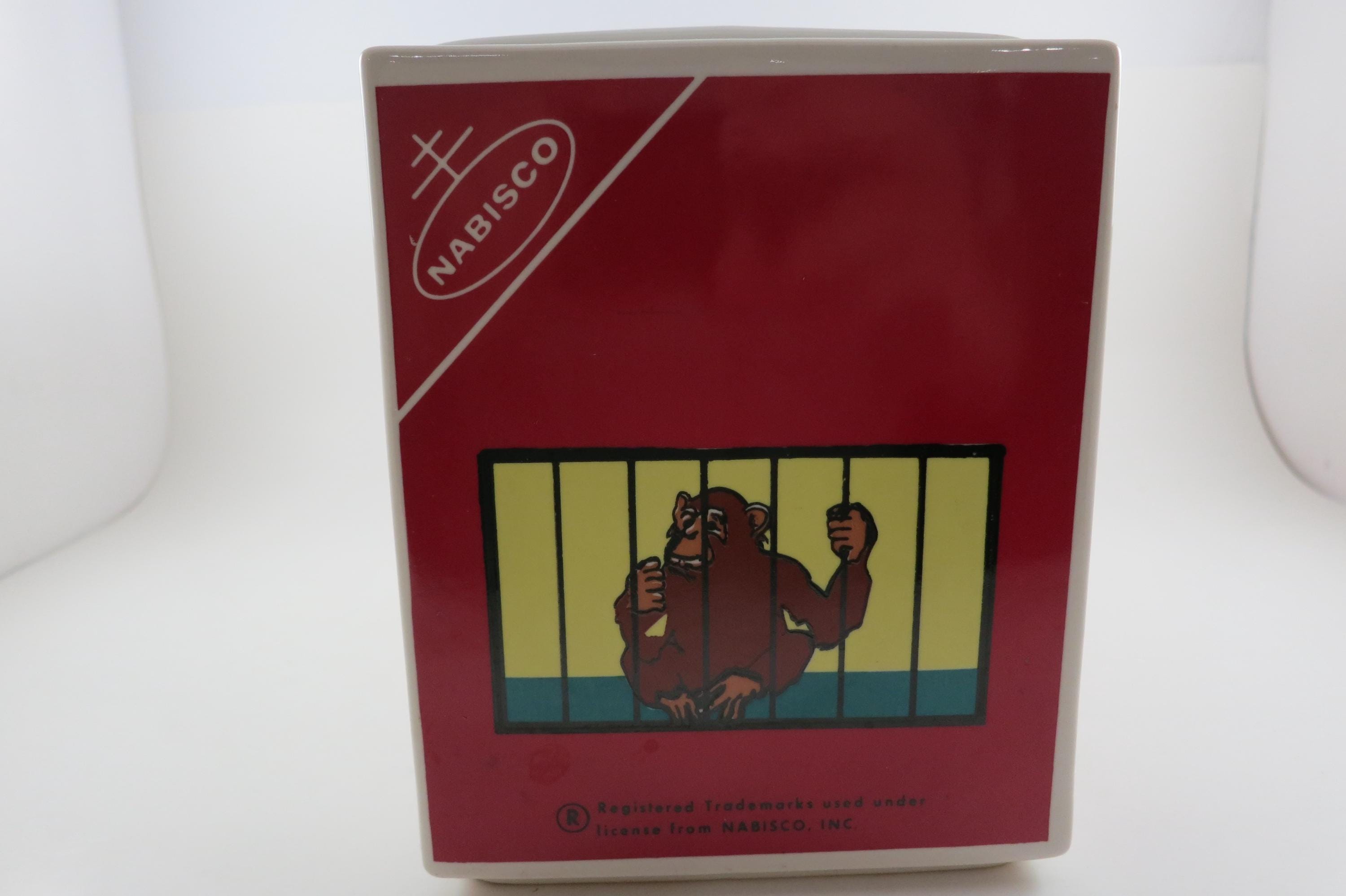 Vintage 1972 Nabisco Barnum's Animals Crackers Cookie Jar No Lid. Measures 9 1/4 inches wide, 5 inches deep and 6 1/4 inches tall. Has one tiny ceramic ding on the back right corner.