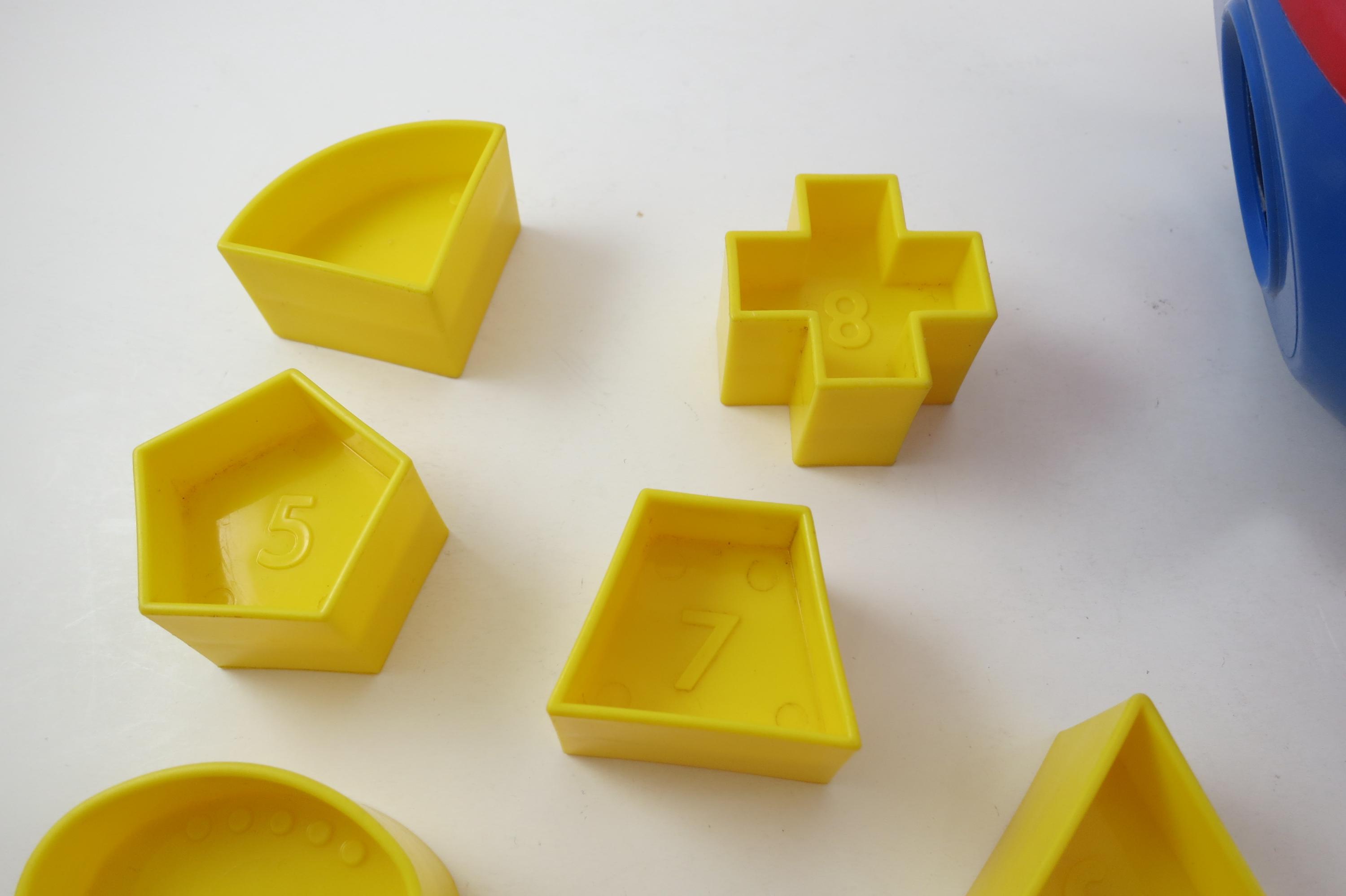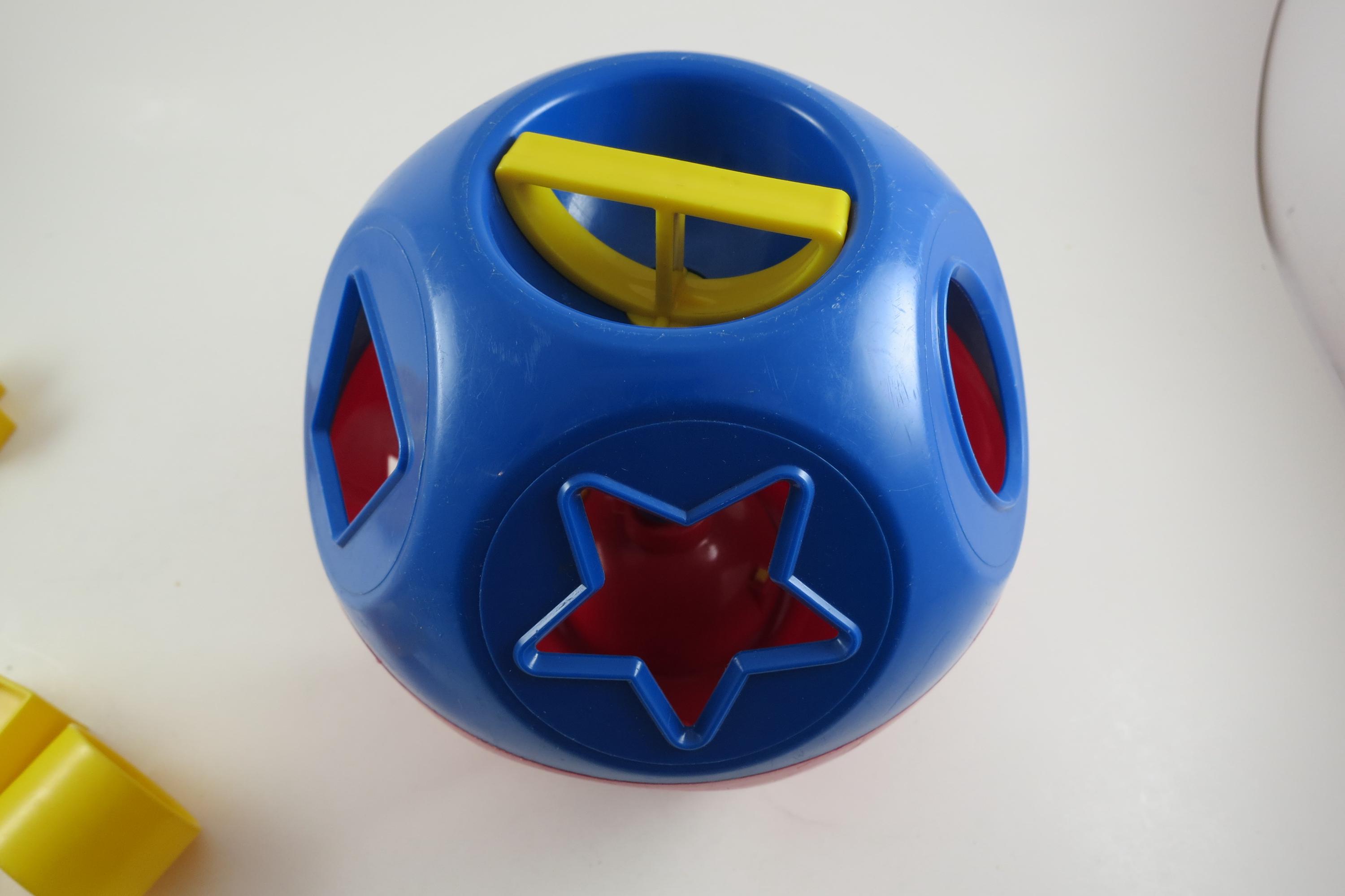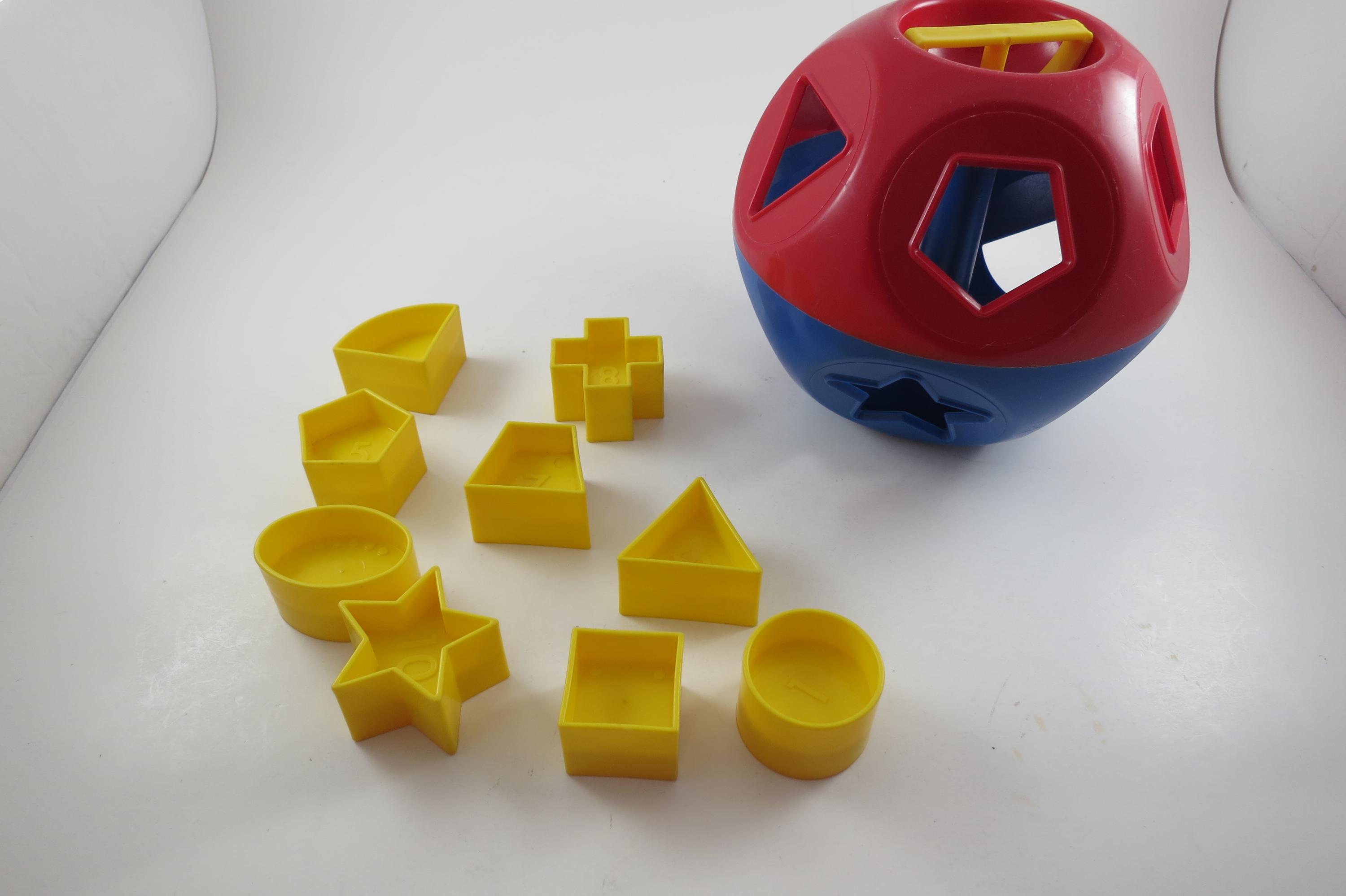 Vintage Tupperware Tuppertoys Red and Blue Shapes Ball with Nine Original shapes. Very good original condition!
