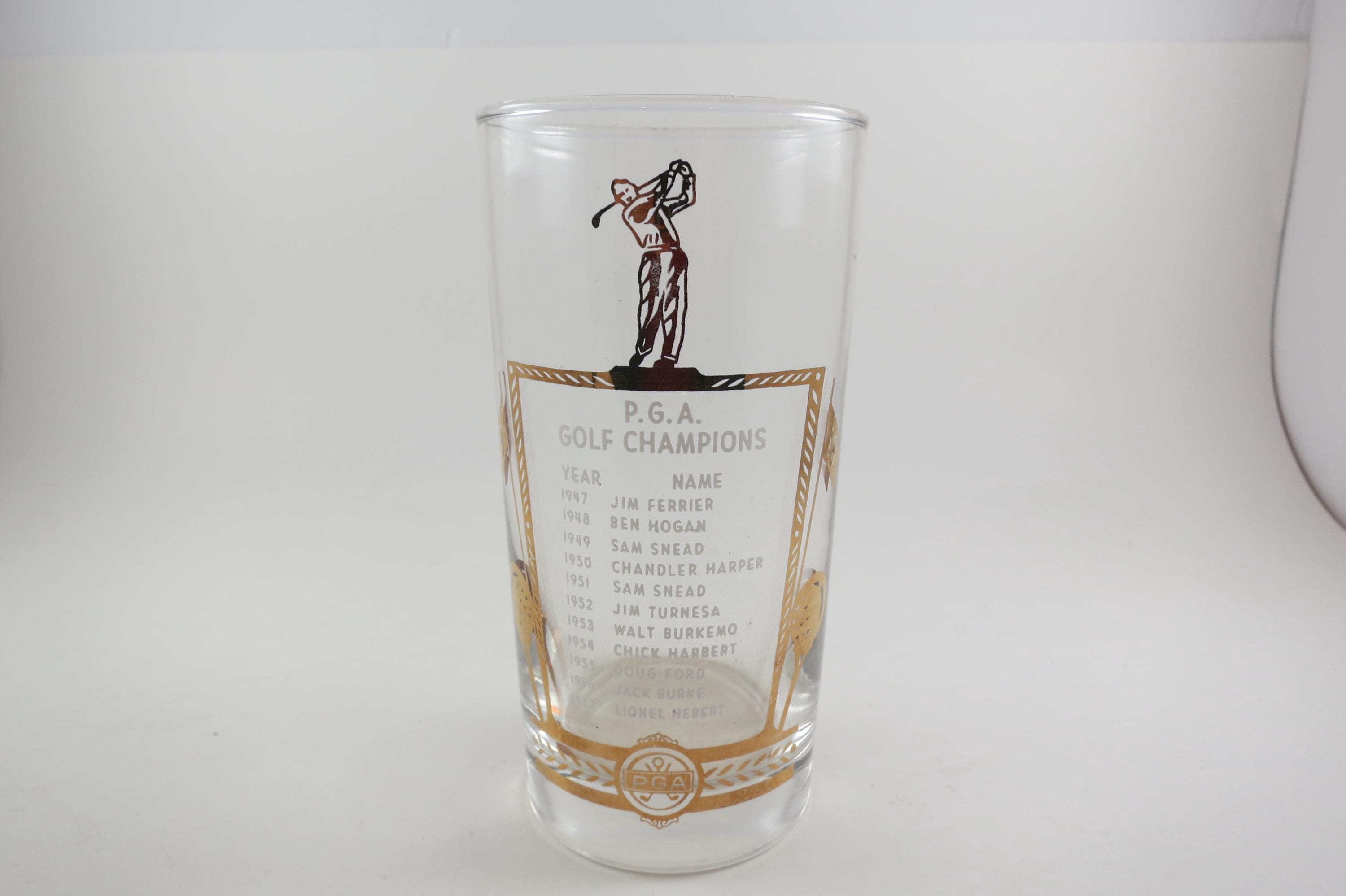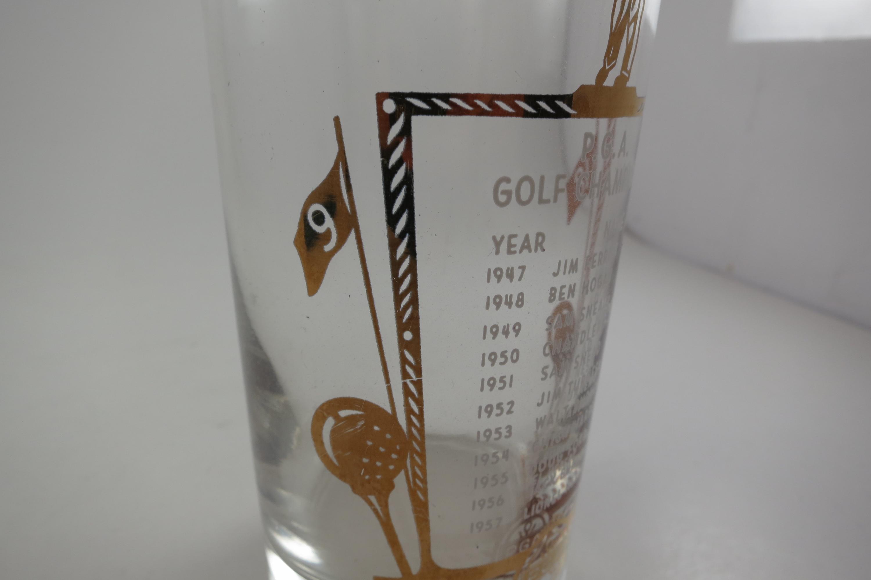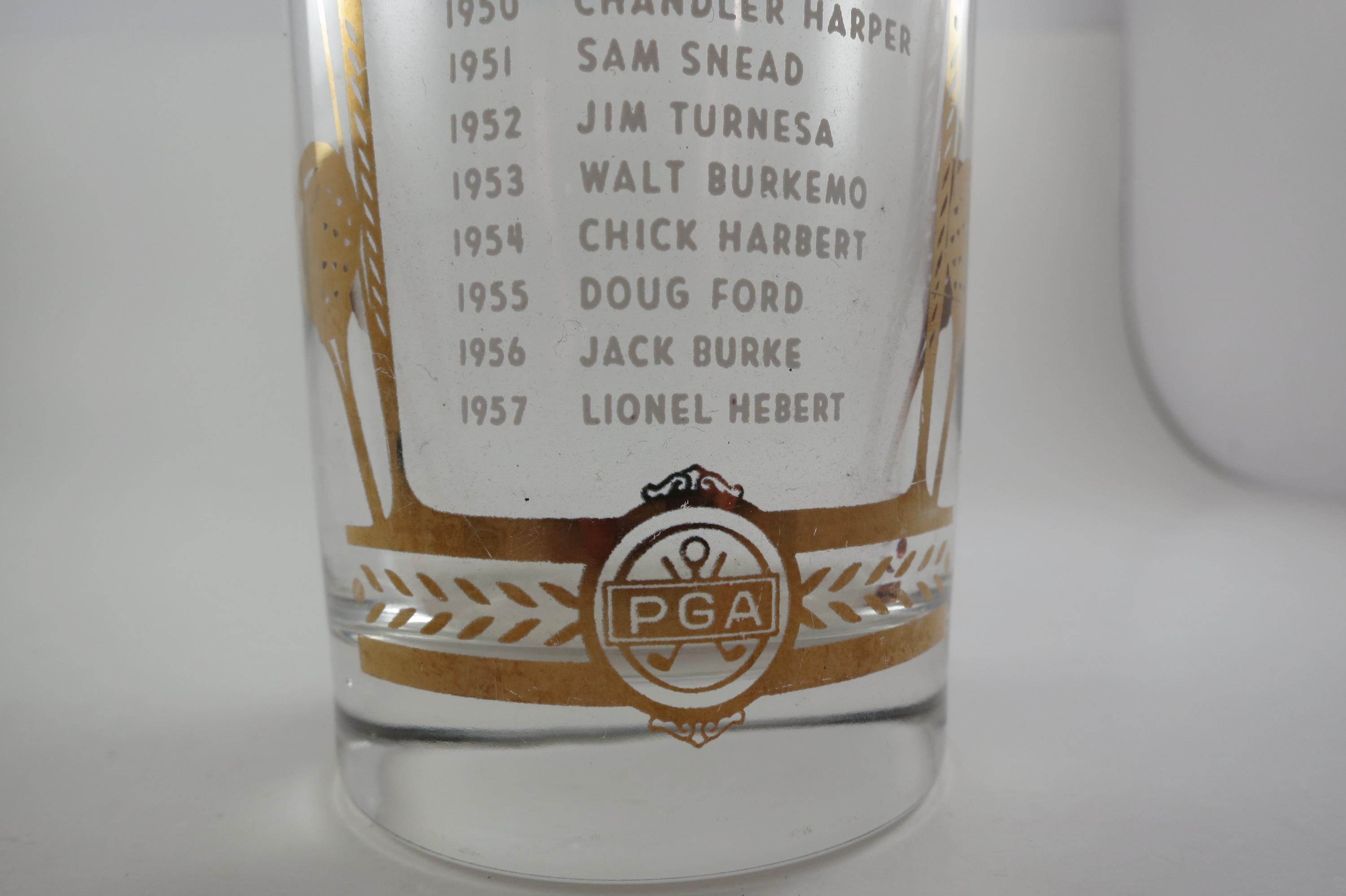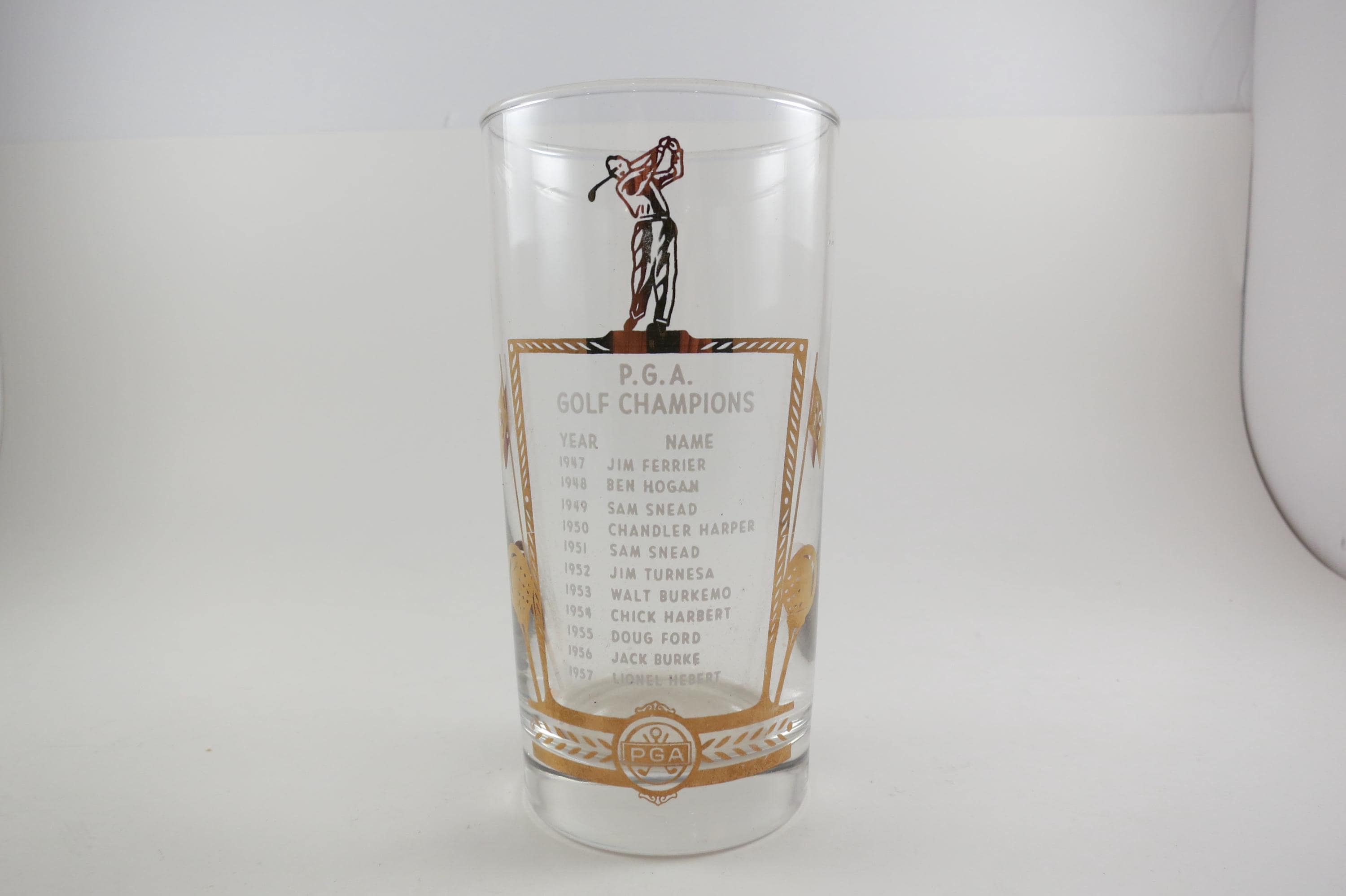 Vintage 1958 PGA Golf Tour Champions Glass 1947-1957 Winners Listen Excellent Condition. Measures 5 1/2 inches tall with gold trim.