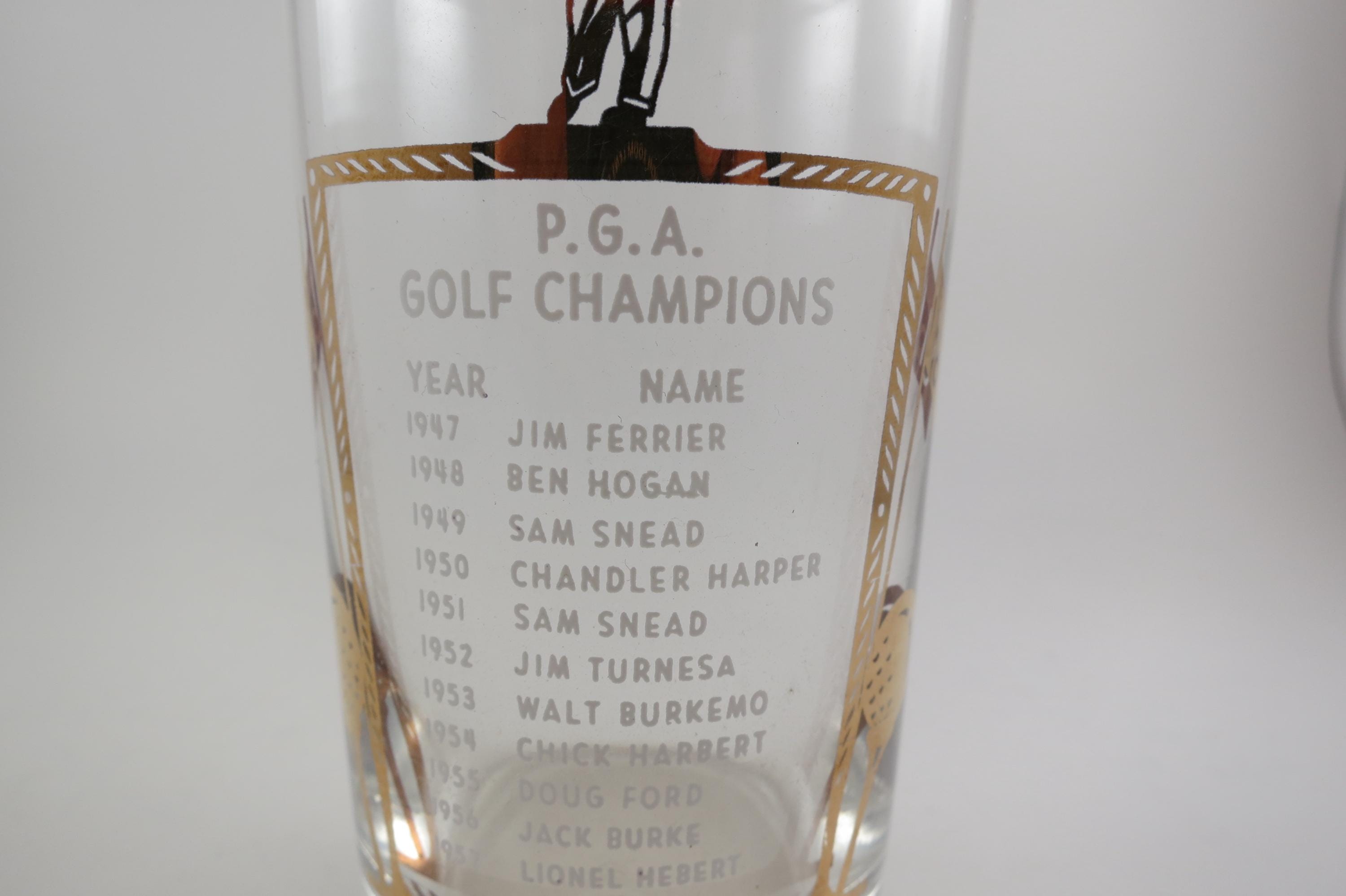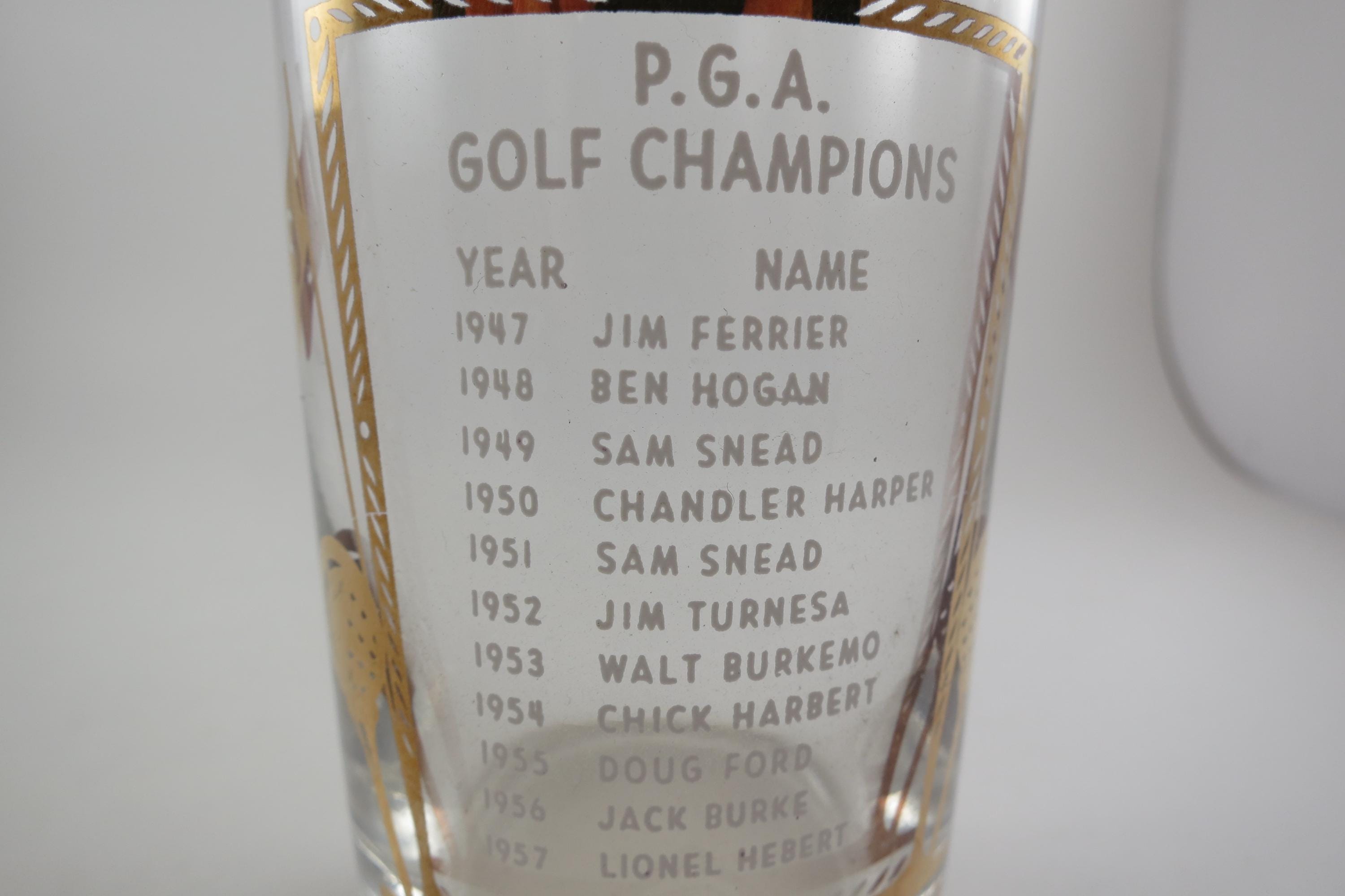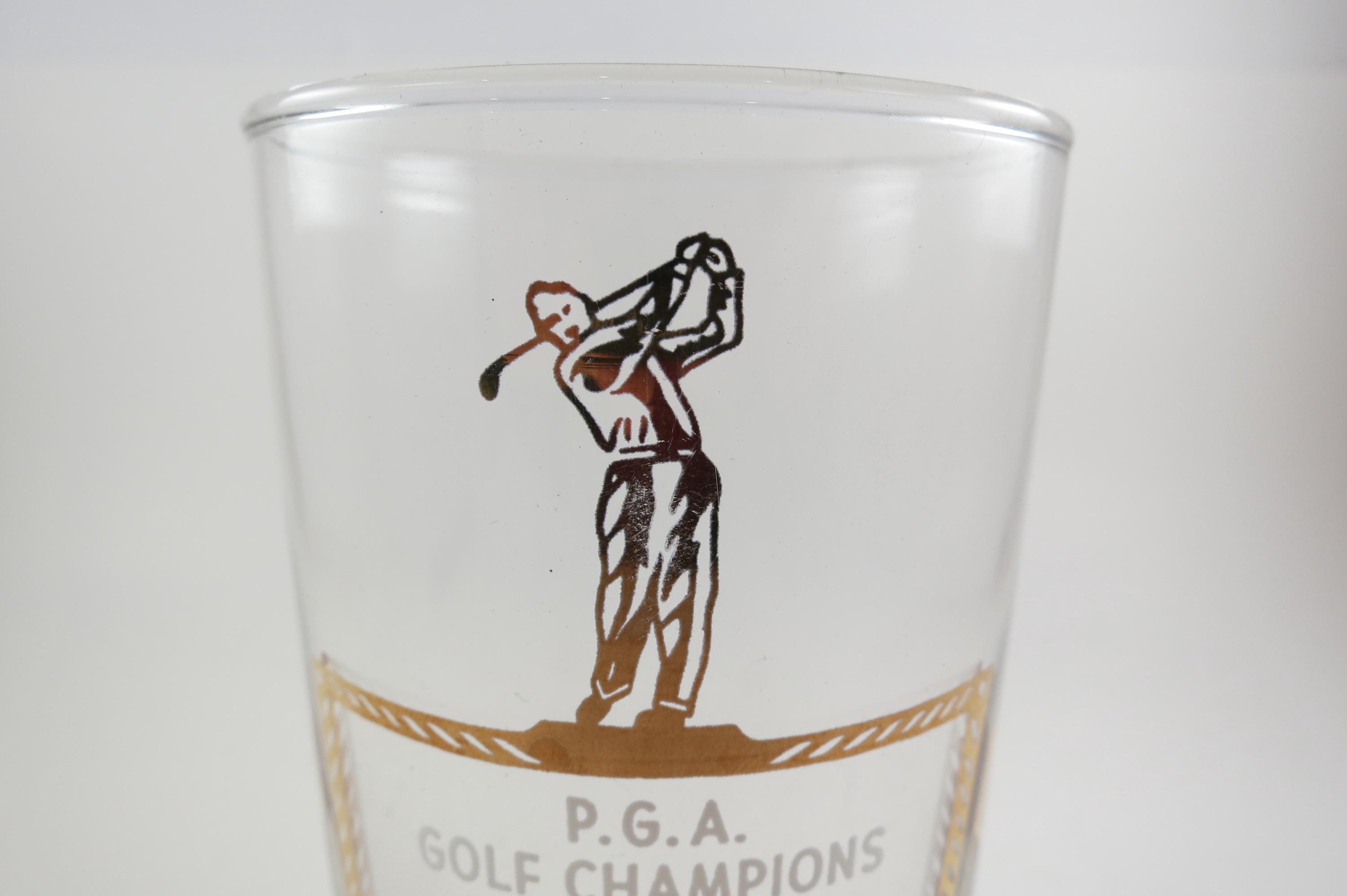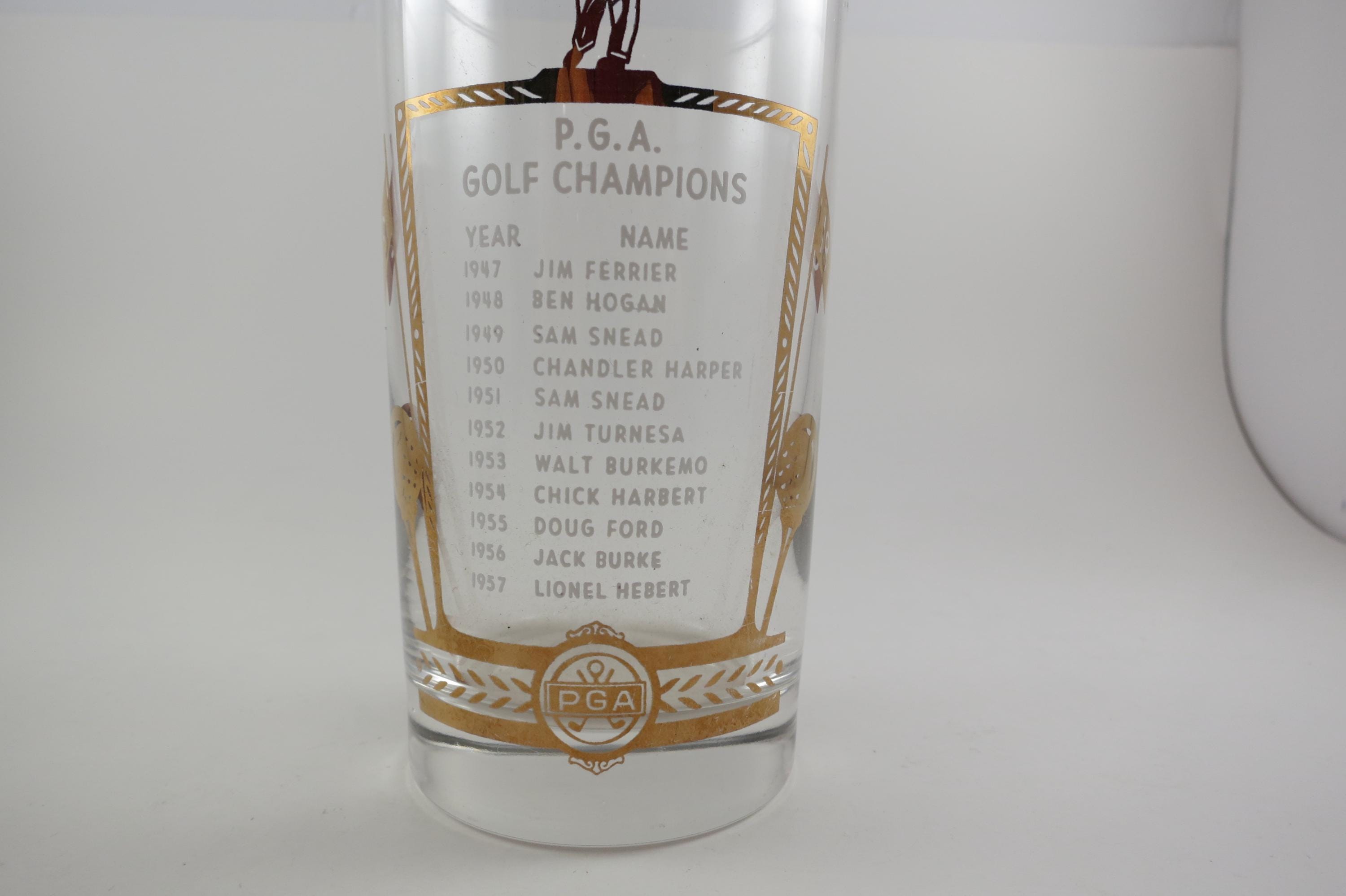 Vintage 1958 PGA Golf Tour Champions Glass 1947-1957 Winners Listen Excellent Condition. Measures 5 1/2 inches tall with gold trim.