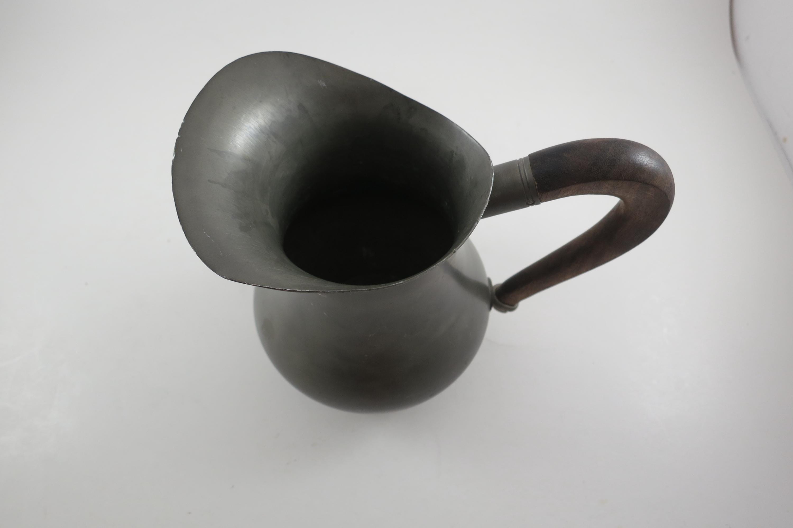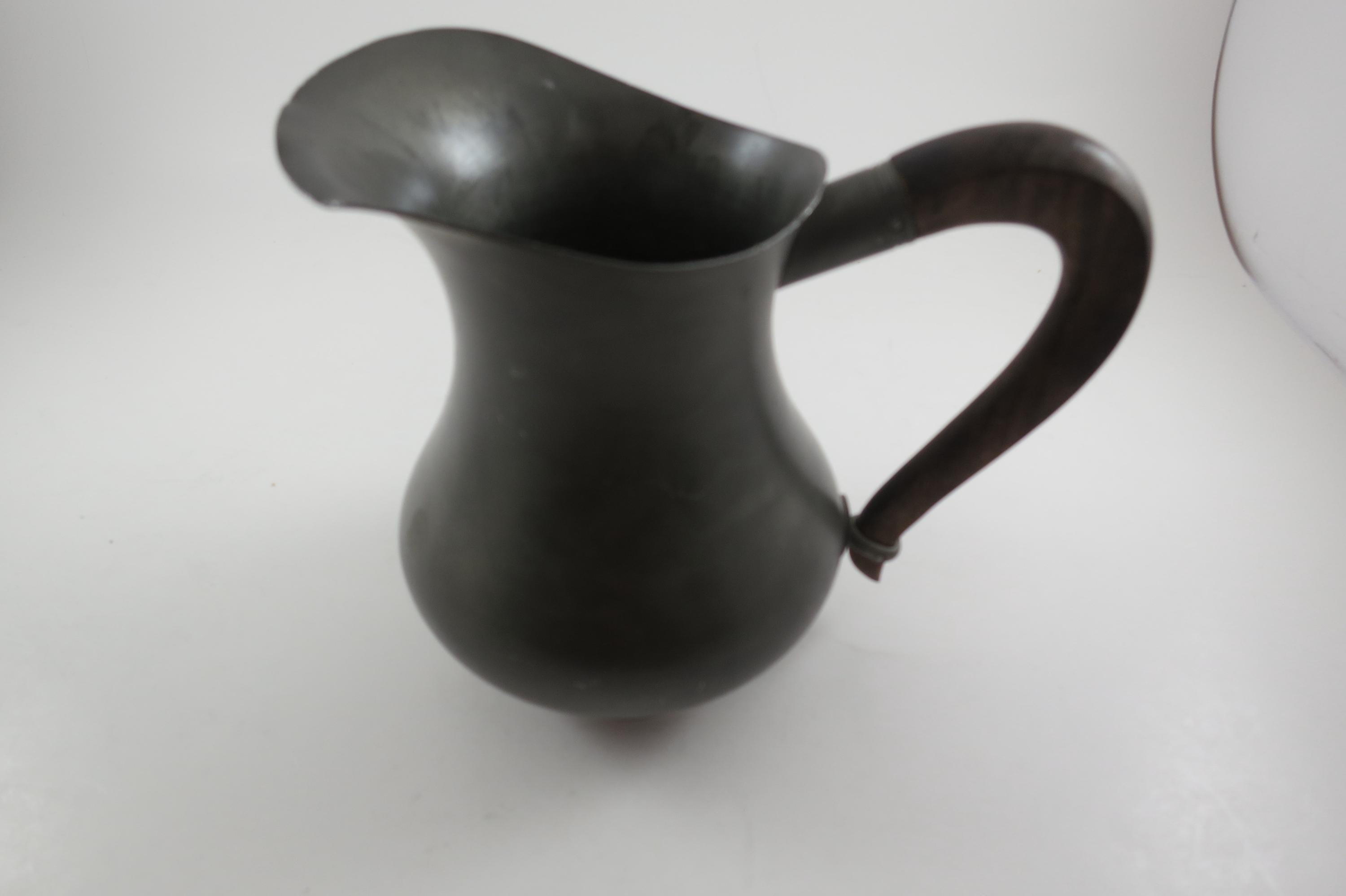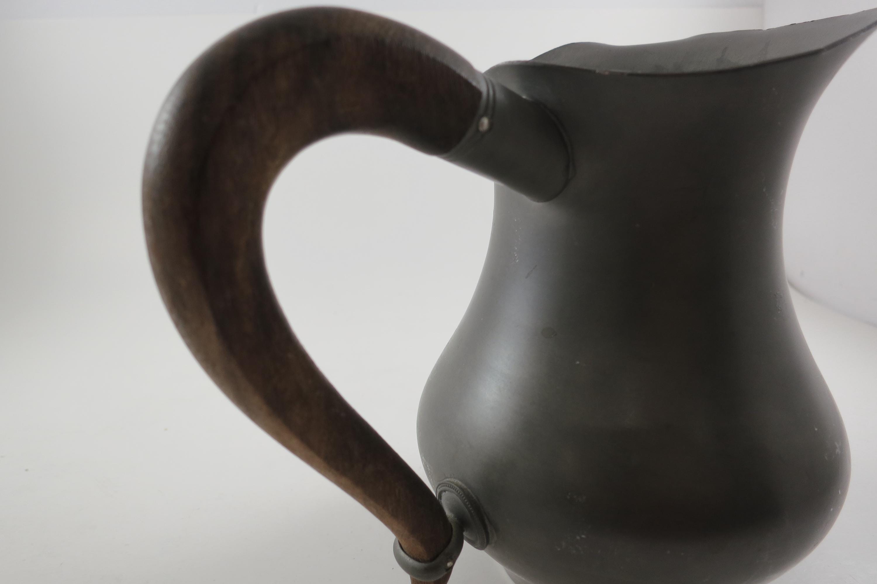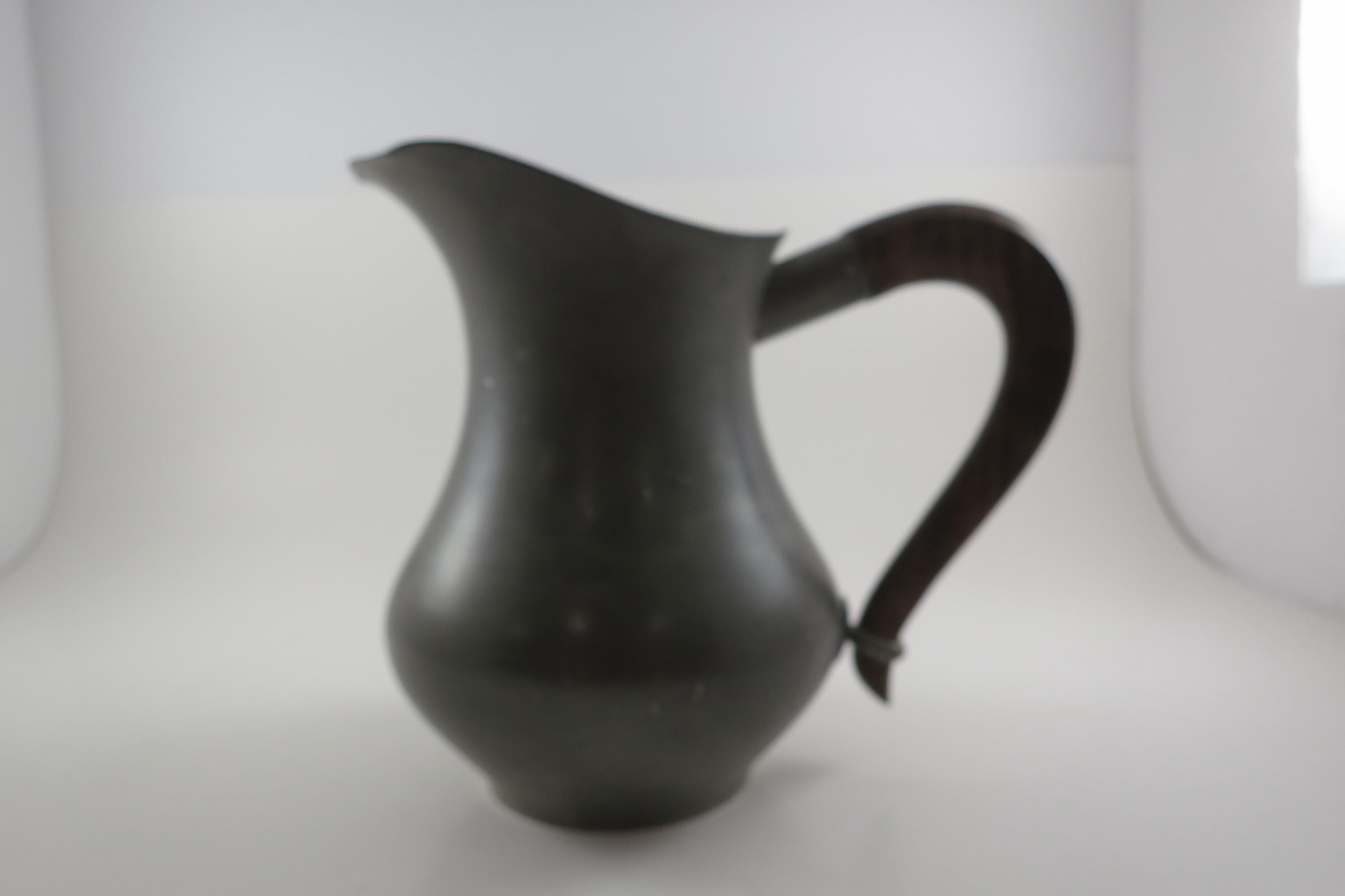 Vintage Pewter Small Pitcher with Wooden Handle 20 Excellent Condition. Nice condition. 5 3/4 Inches tall and 6 3/4 Inches Wide spout to handle.