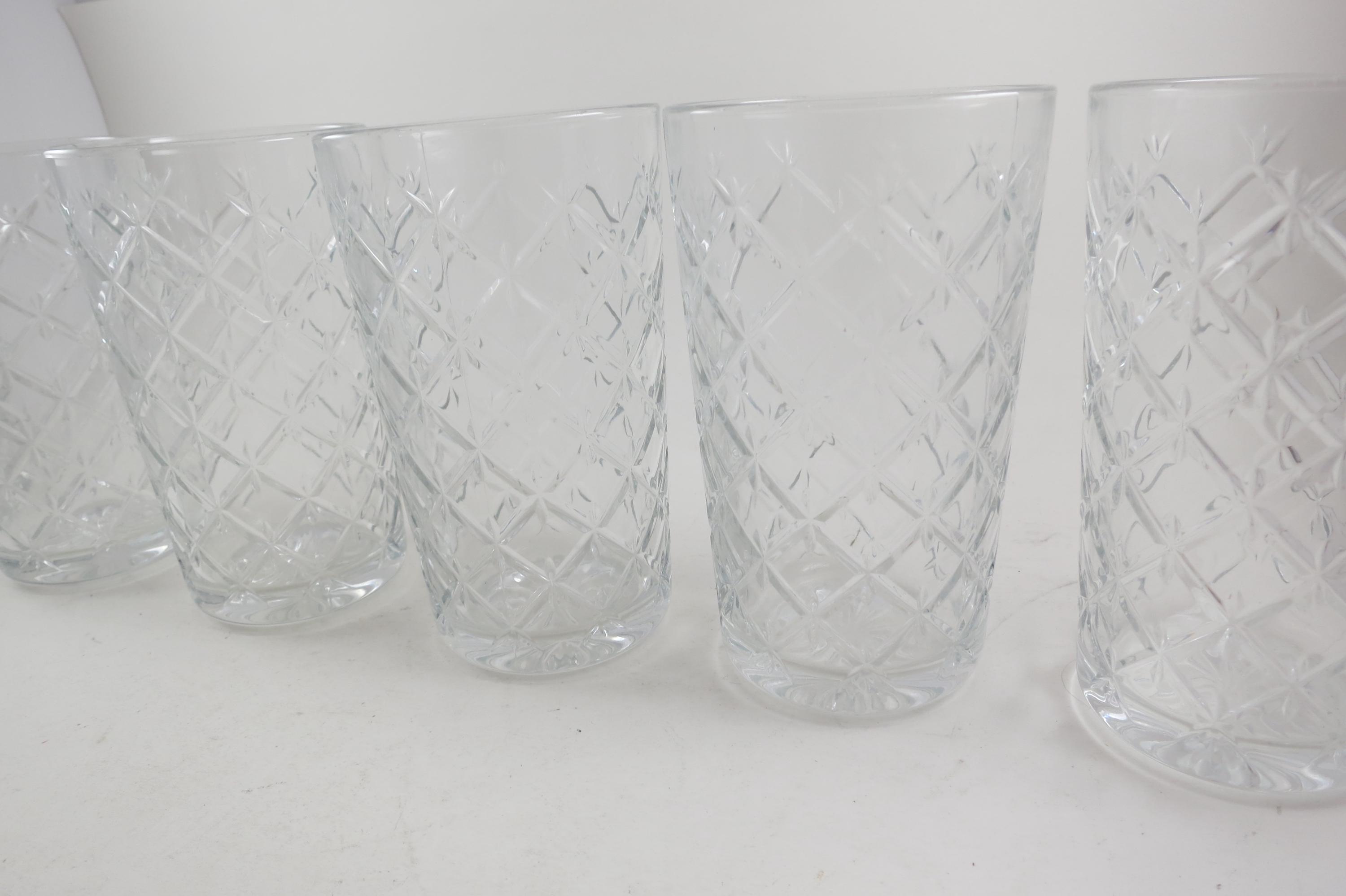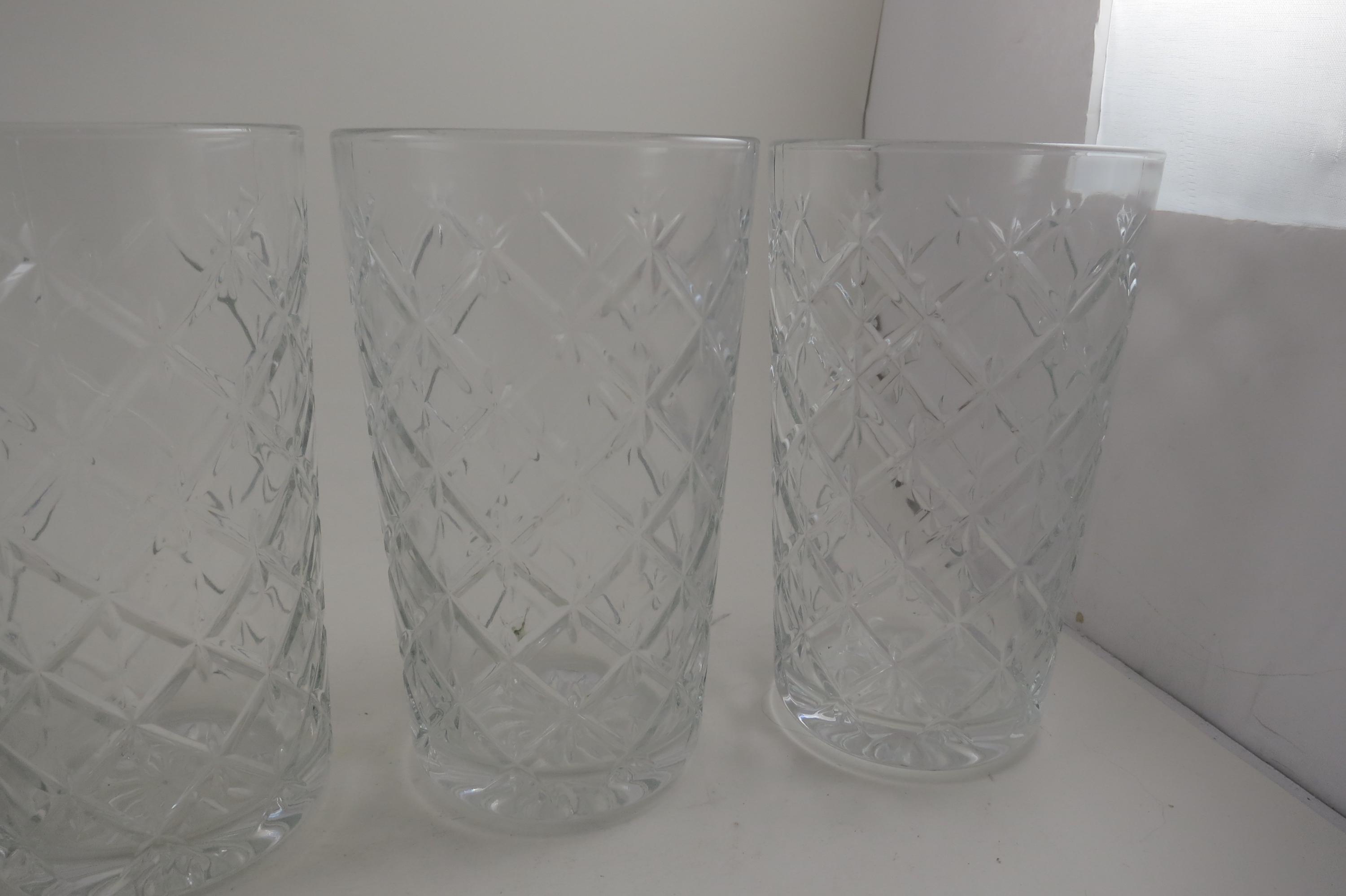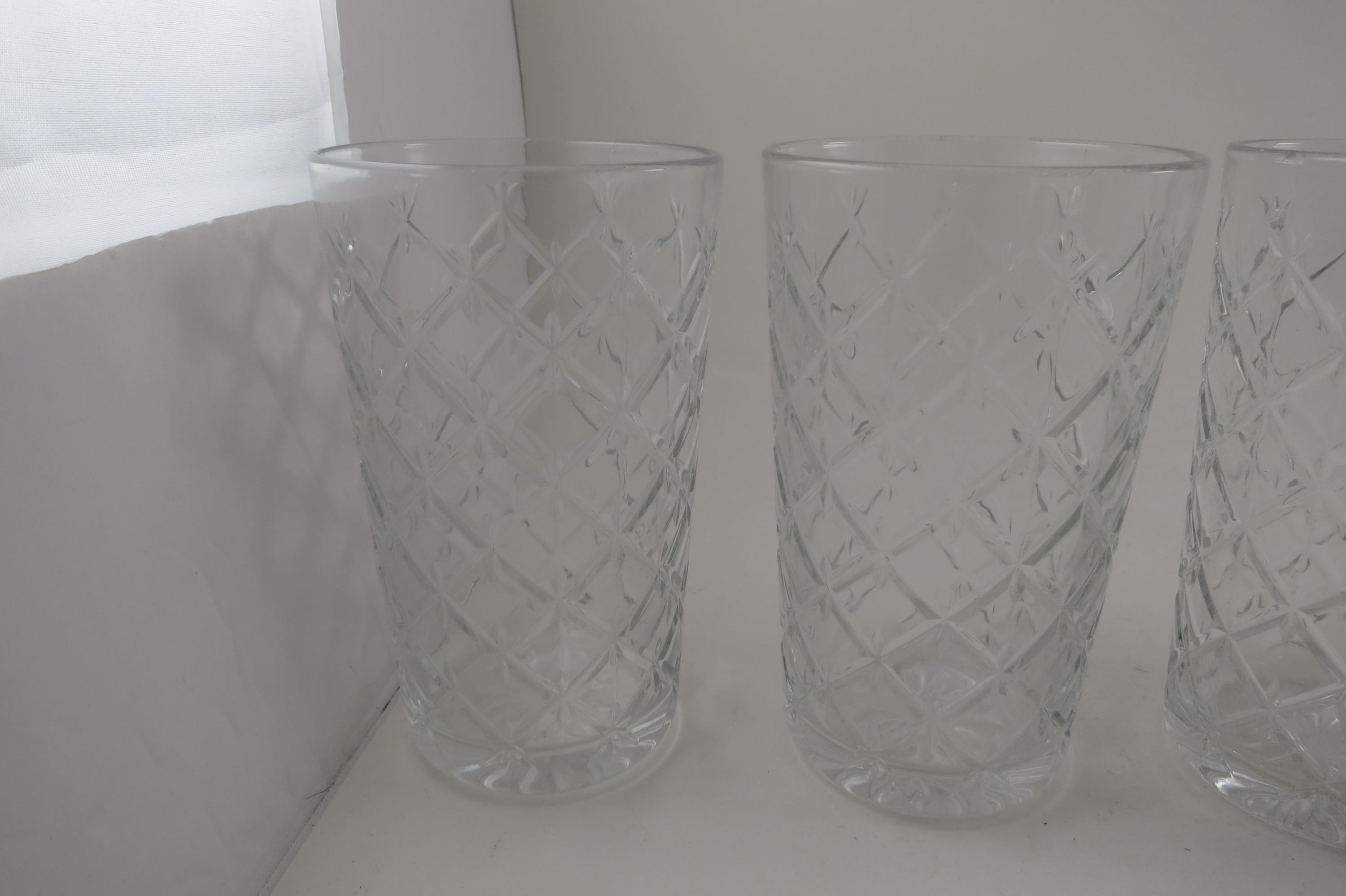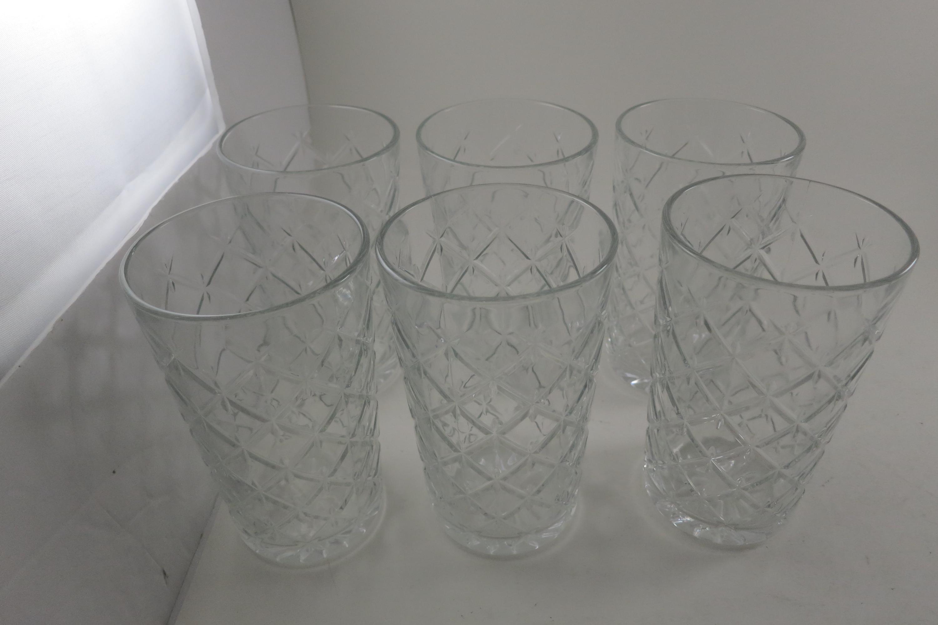 Set of Six MCM Pressed Glass 5 1/2 Inch Water Glasses Excellent Condition. No damages, very nice glasses. They are 5 1/2 inches tall and 3 1/4 inches wide.