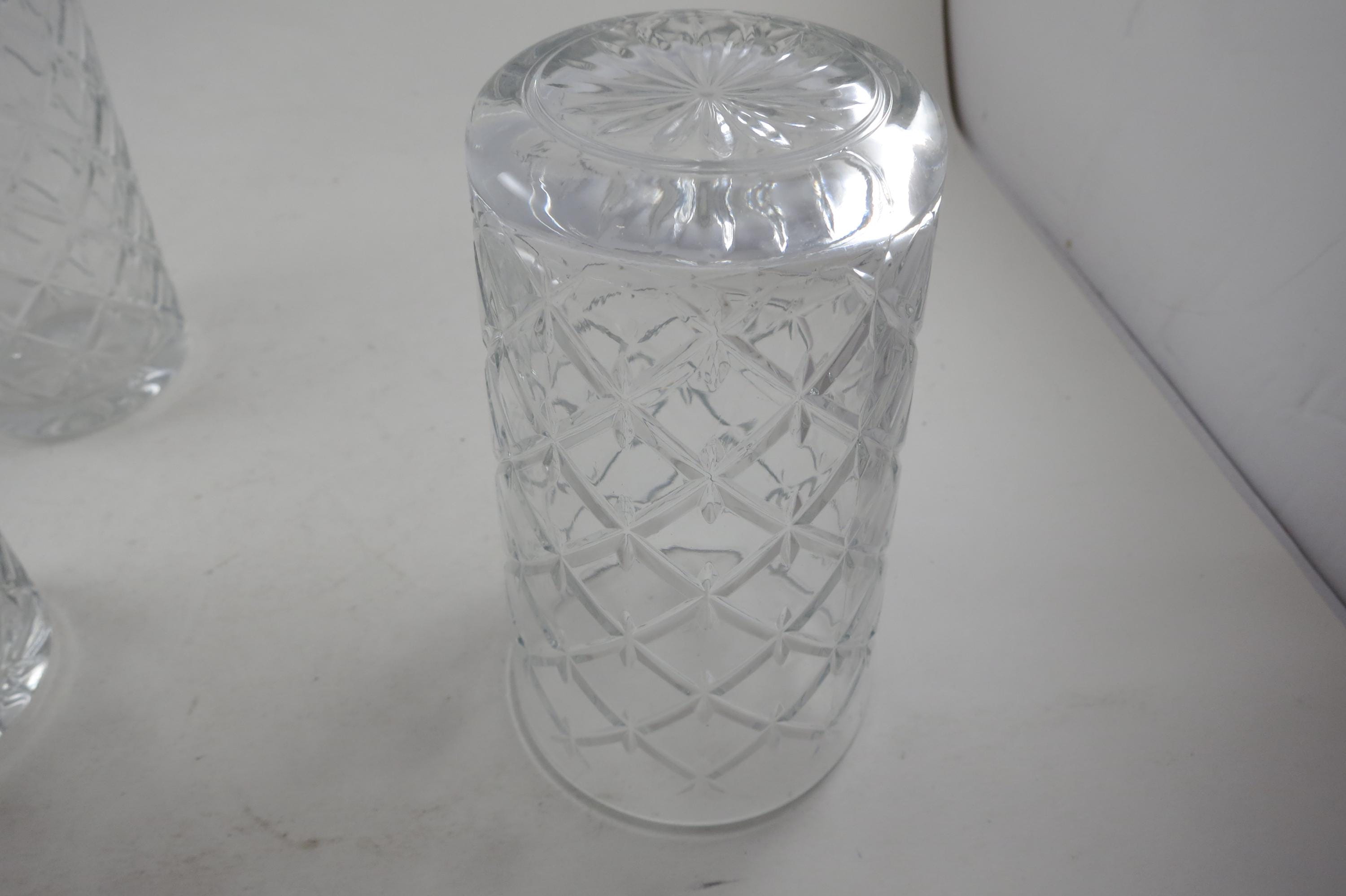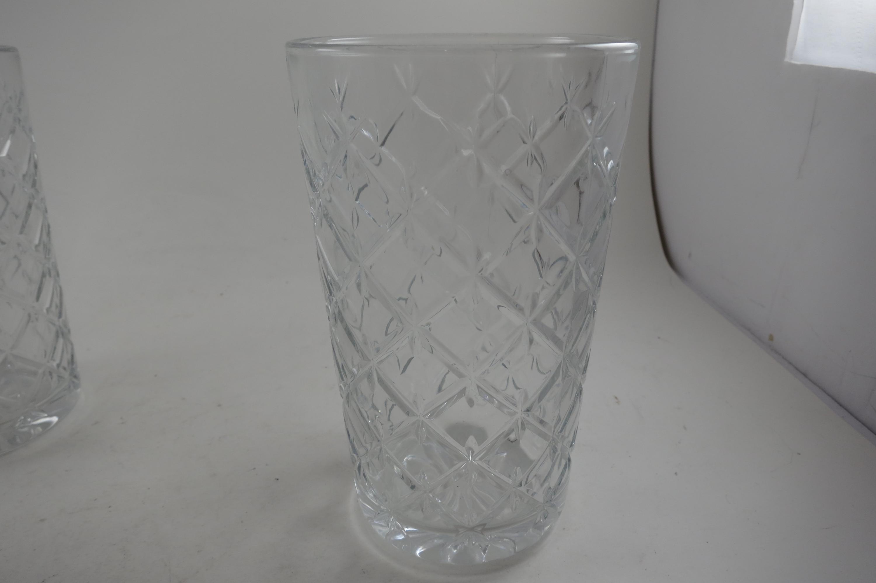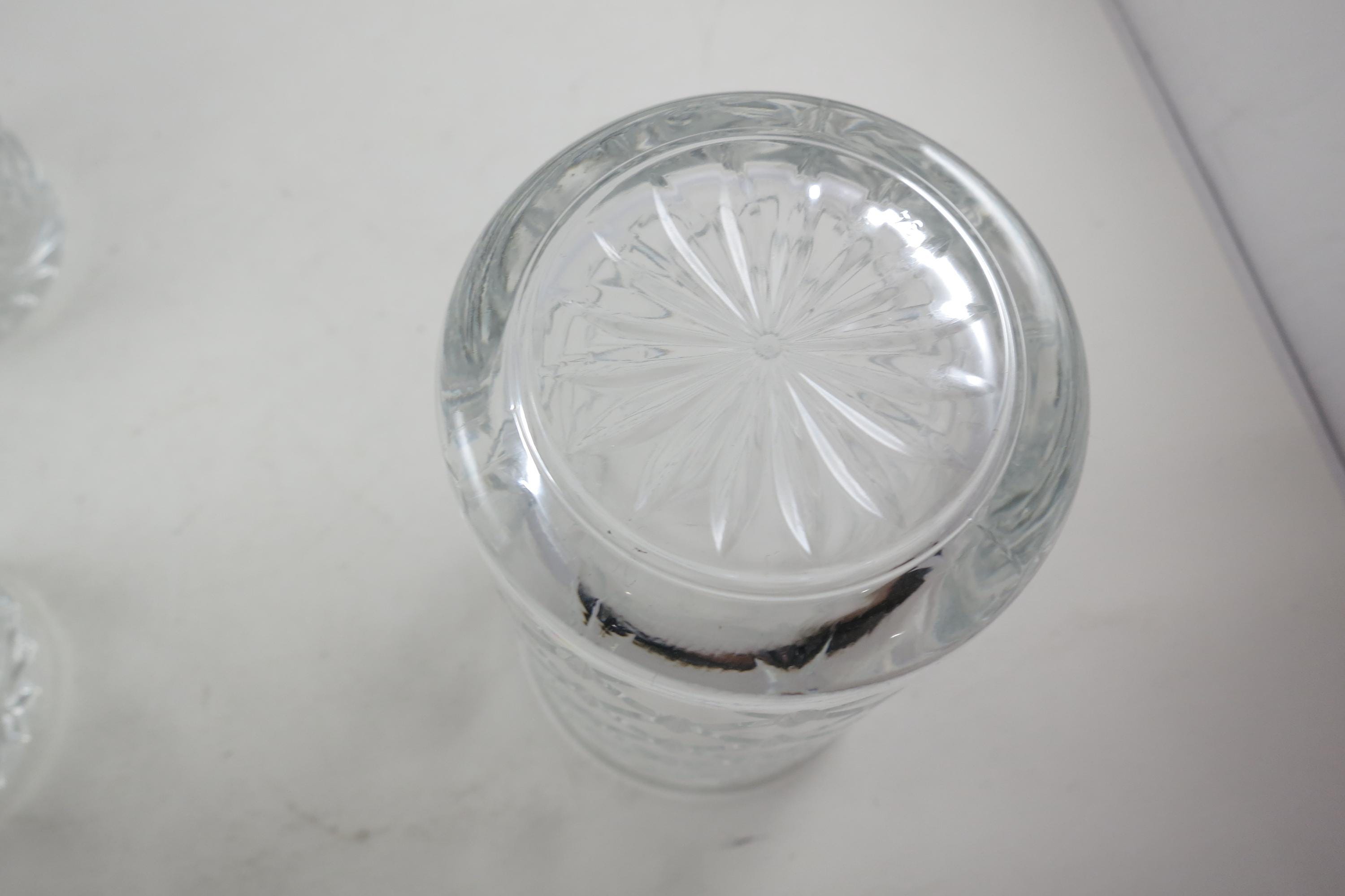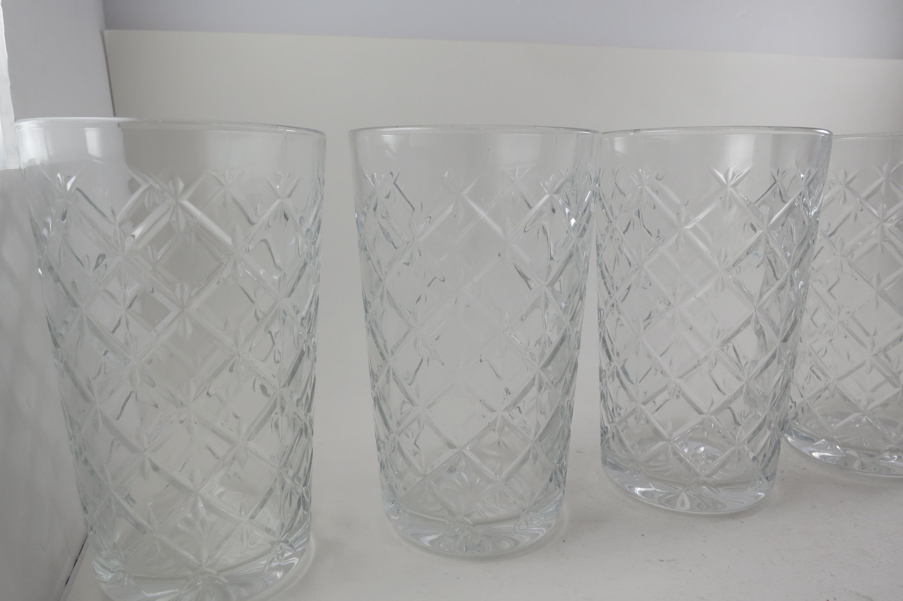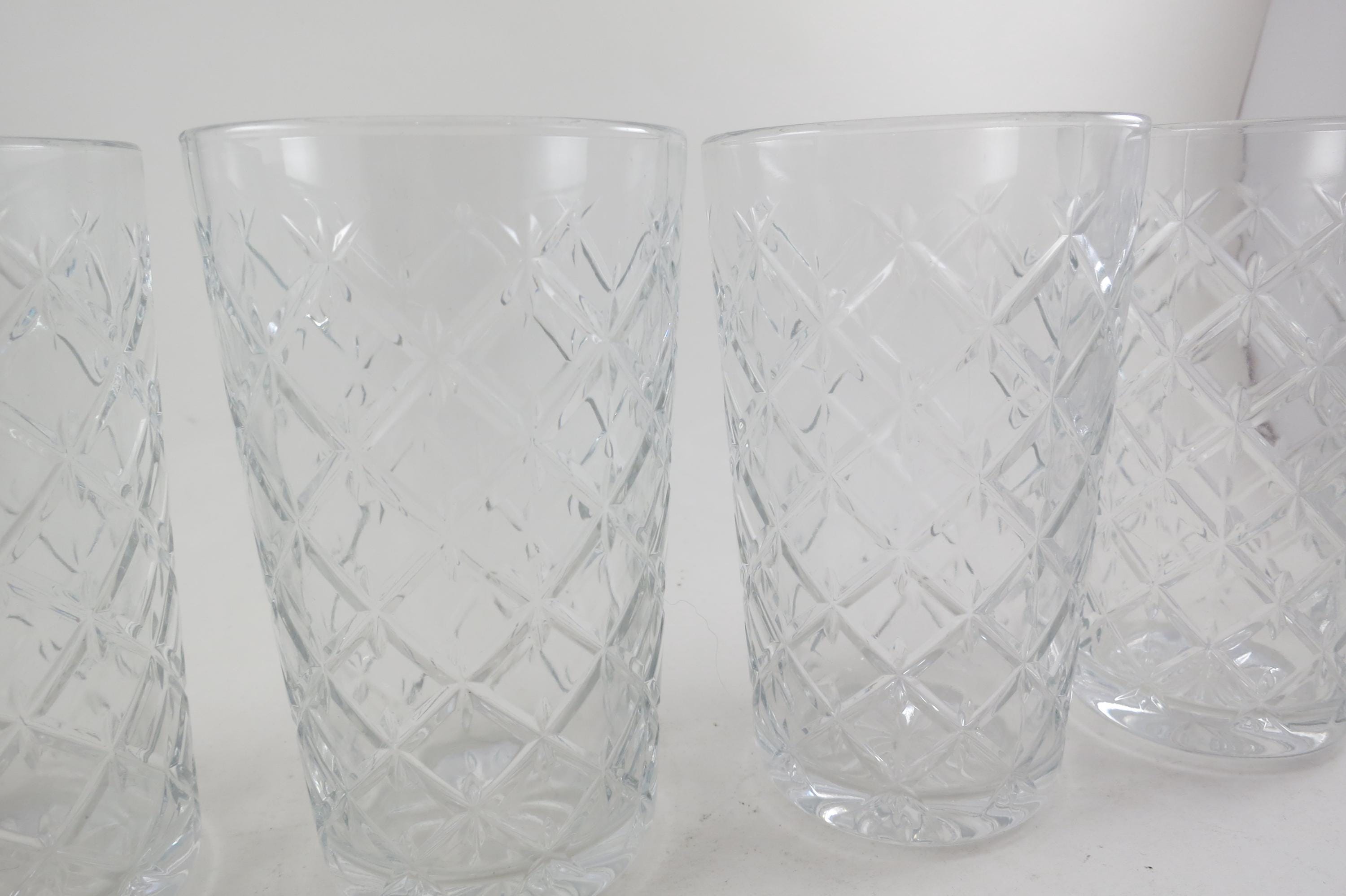 Set of Six MCM Pressed Glass 5 1/2 Inch Water Glasses Excellent Condition. No damages, very nice glasses. They are 5 1/2 inches tall and 3 1/4 inches wide.