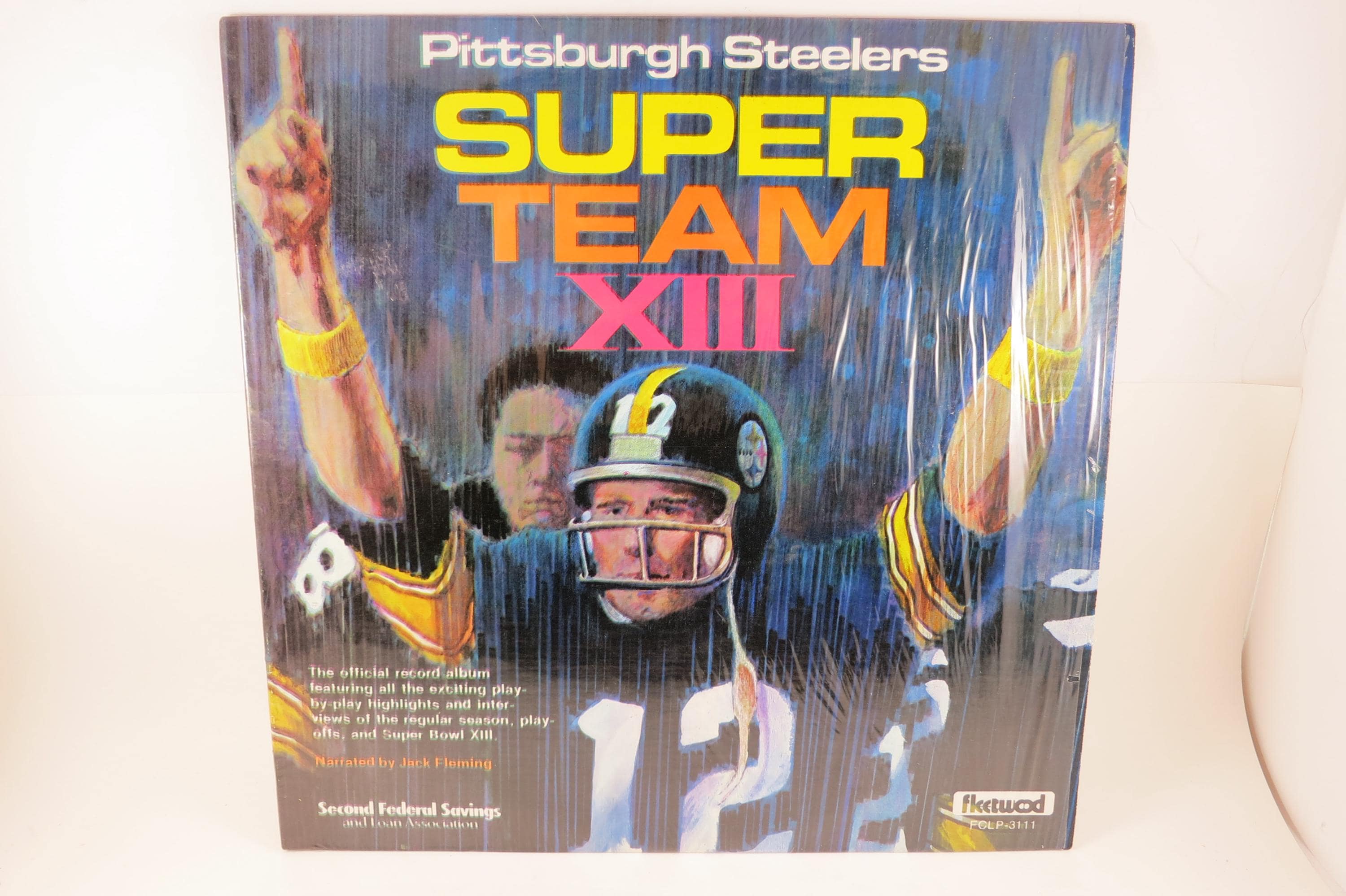 1979 Vinyl Record LP Record Pittsburgh Steelers: Super Team XIII Near Mint Condition In Shrink. Original cover is in Near Mint condition and includes the inner sleeve and factory shrink wrap. Record is Near Mint as well.