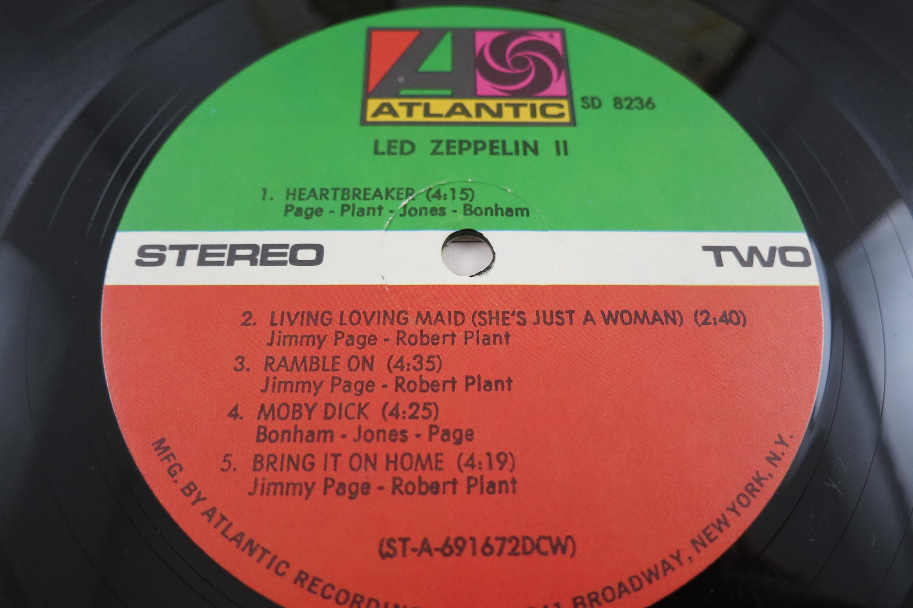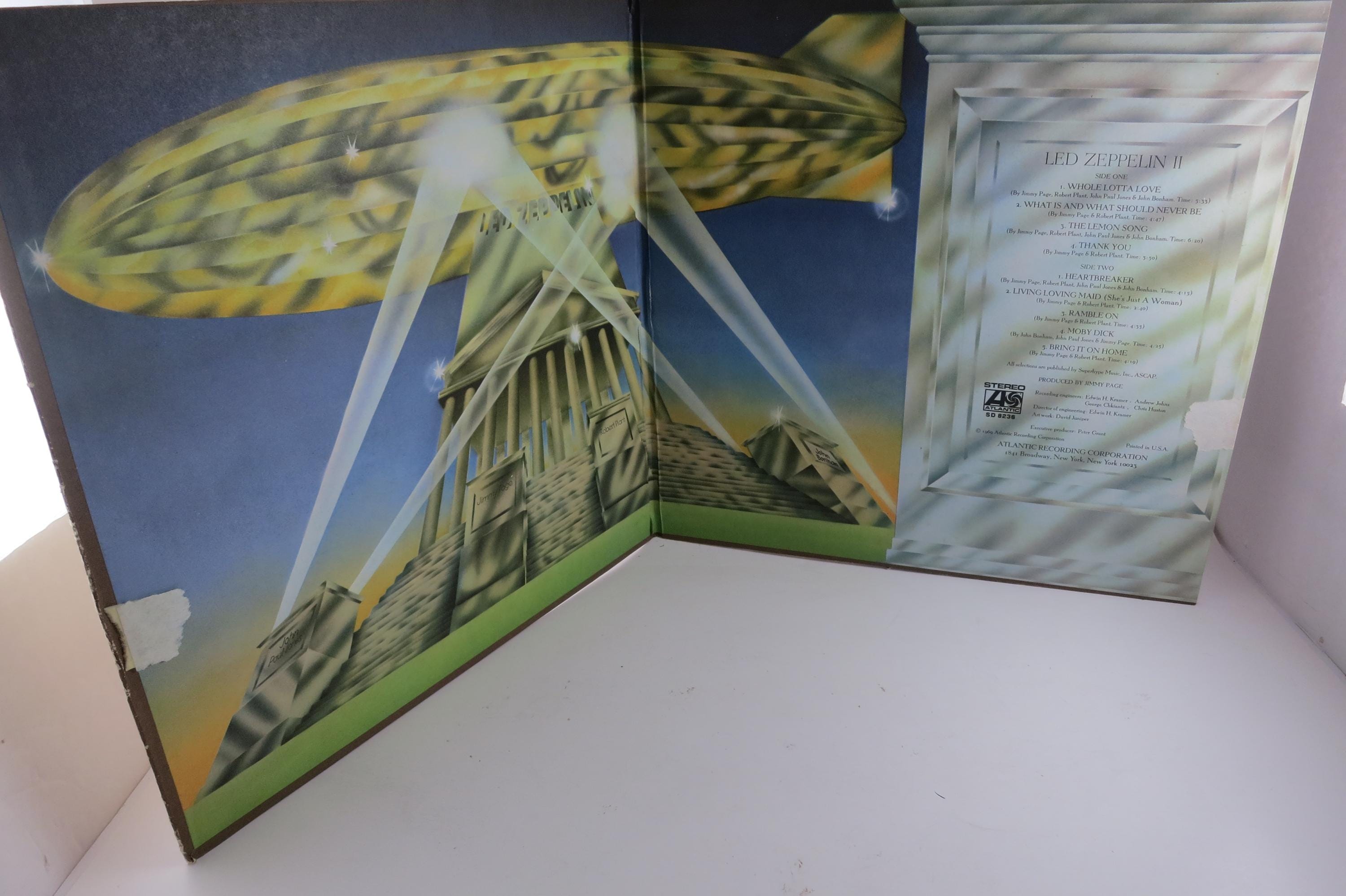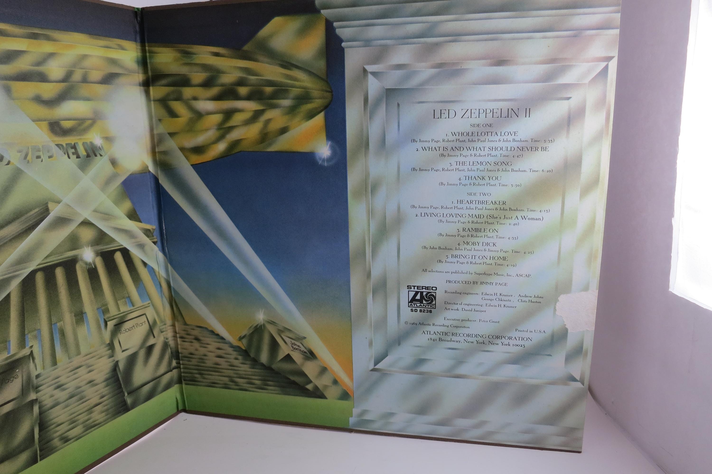 Vintage 1970 Vinyl LP Record Led Zeppelin II Very Good Condition. Original Gate fold cover is in very good condition. Cover was hung on a wall at some point and has four spots on the rear cover of paper loss and inside the gate fold. Front looks great. Record has a Major scuff on song 1 and 2 on side 1. The entire first song skips as does the first part of song two. Rest of side one plays perfectly, as does the entire side 2. Thus the low price! Tracks are as follows