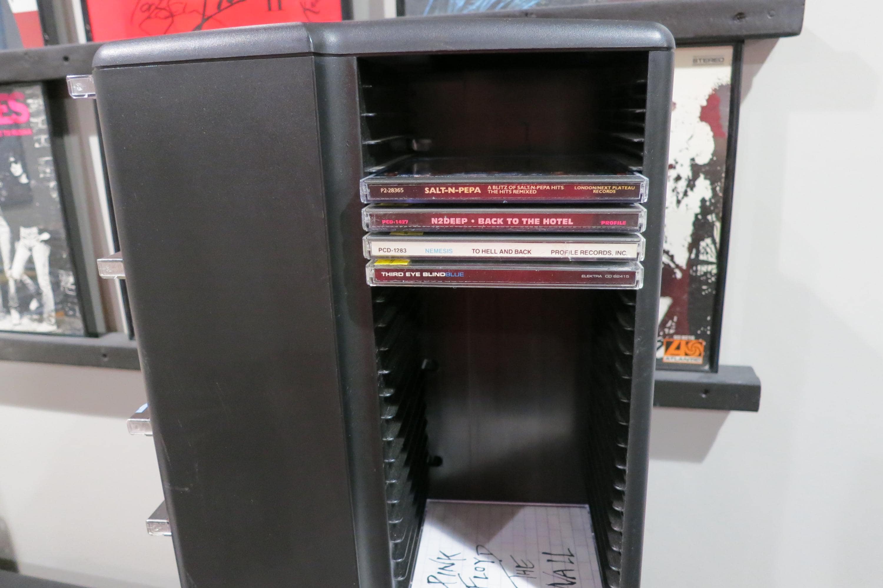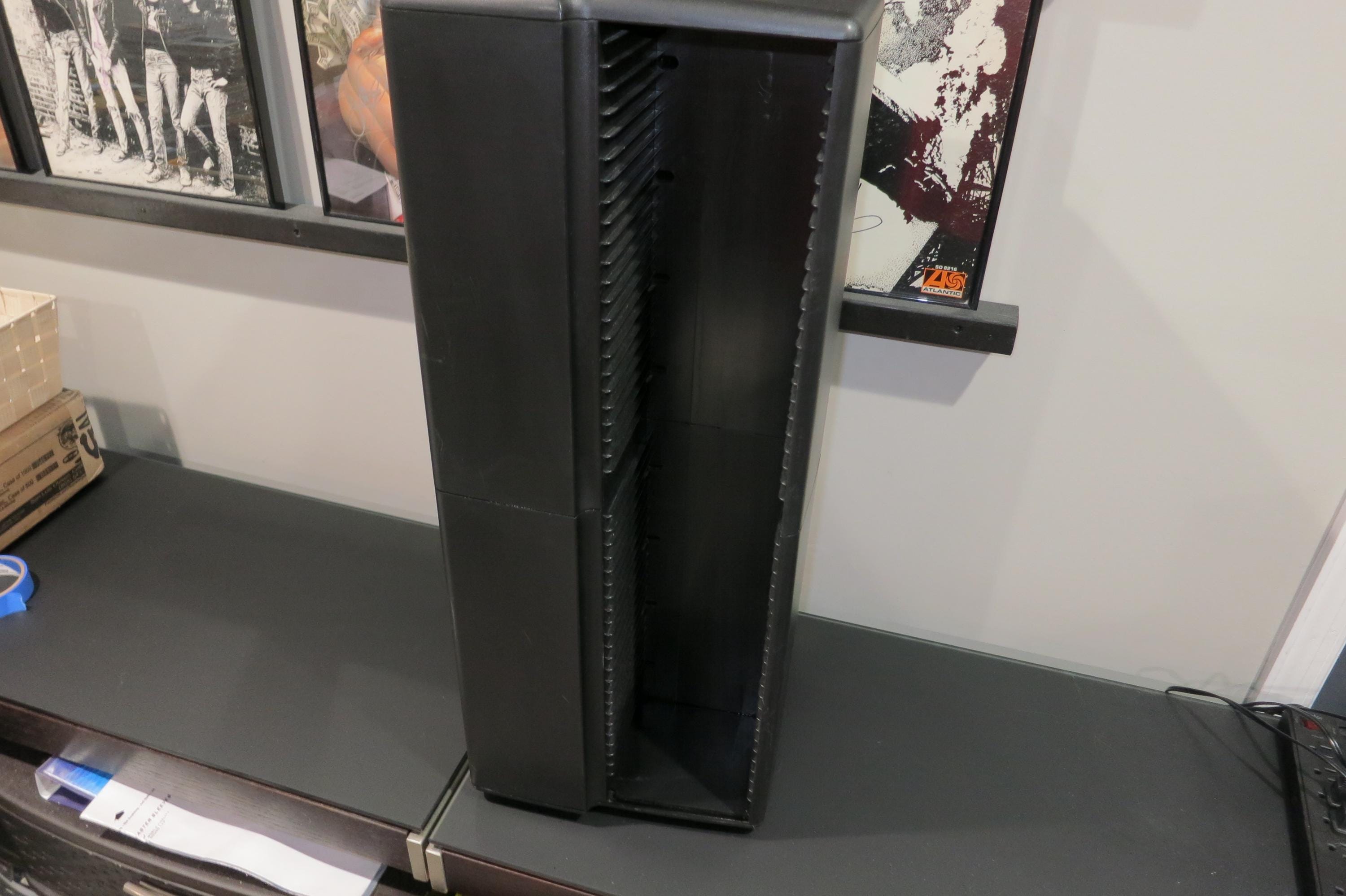 1990's Black Laserline CD Floor Tower Mega Holder Rotating Base Holds 200 CD's Regular and Oversized Excellent Condition 28 Inches Tall. Rotating base to easily view your cd's. This was the biggest of the day by Laserline, it is a free standing floor (or table) model with rotating base. Each side holds 40 regular sized disc's and 5 oversized, for a total of 160 standard disc's and 20 doubles. (Or any combination you need, up to 200) Tower measures 26 1/2 inches tall, base measures 11x11. Great looking holder for your home or a perfect gift!!
