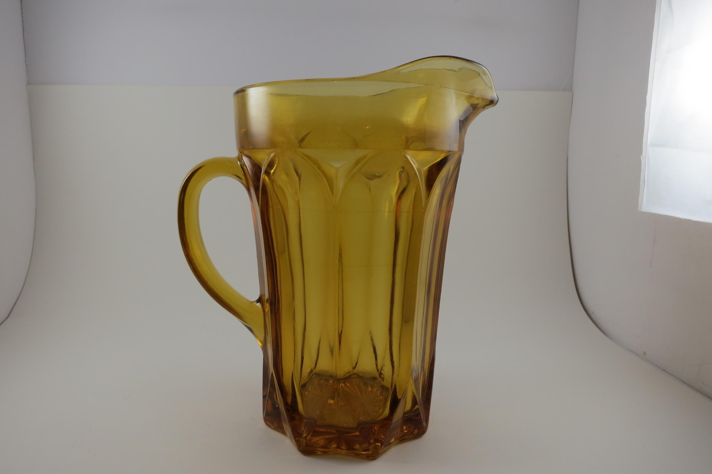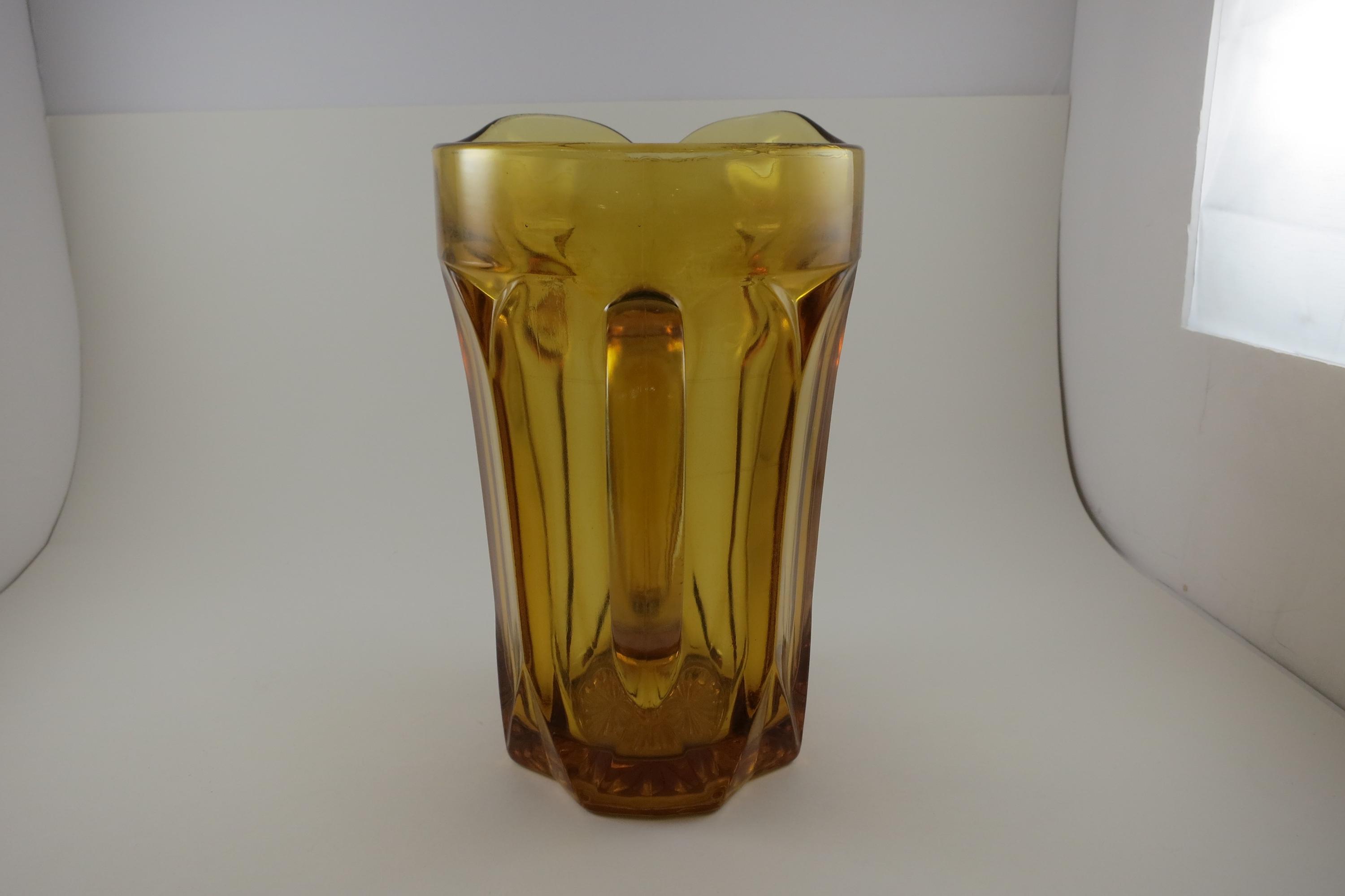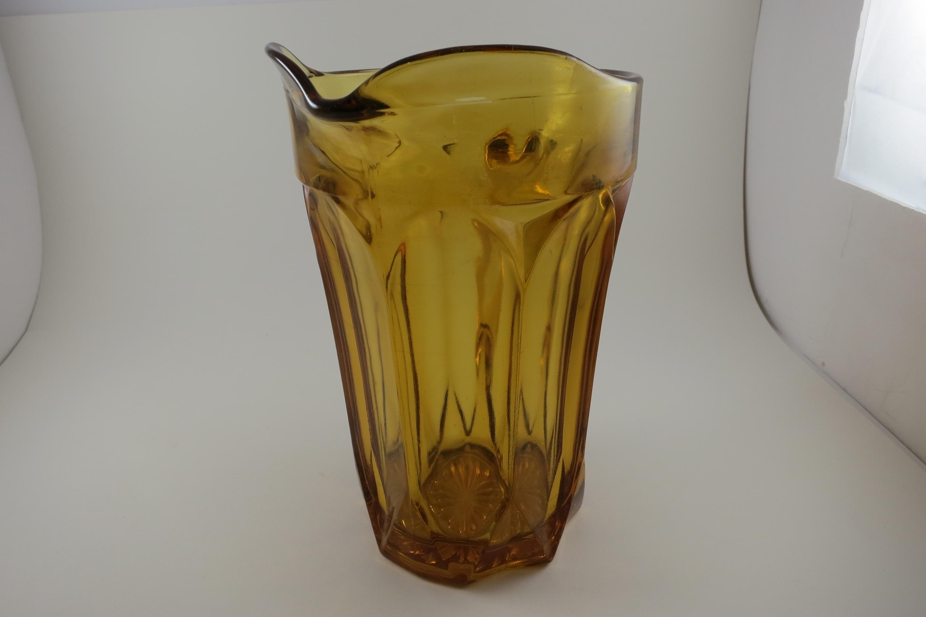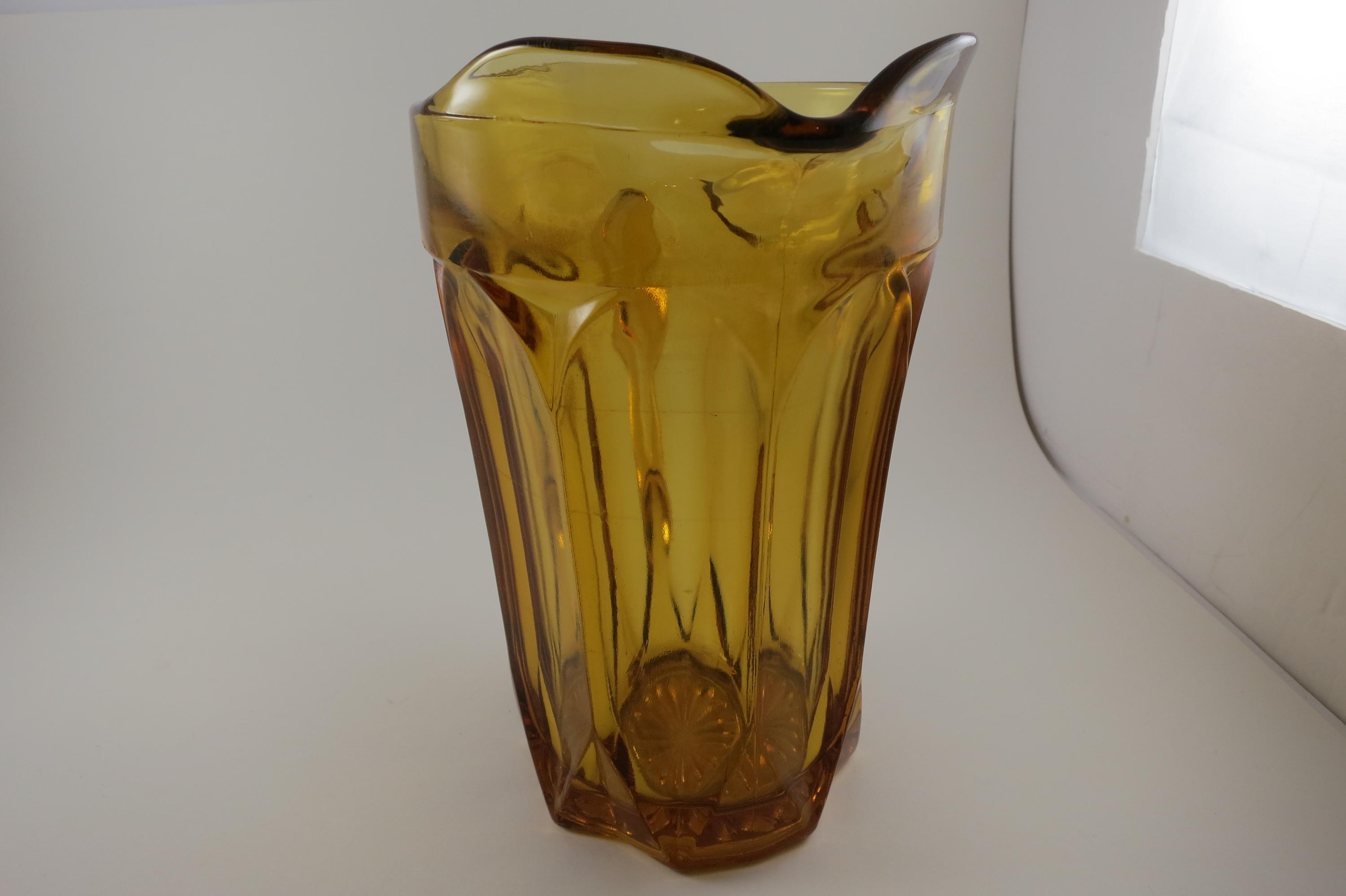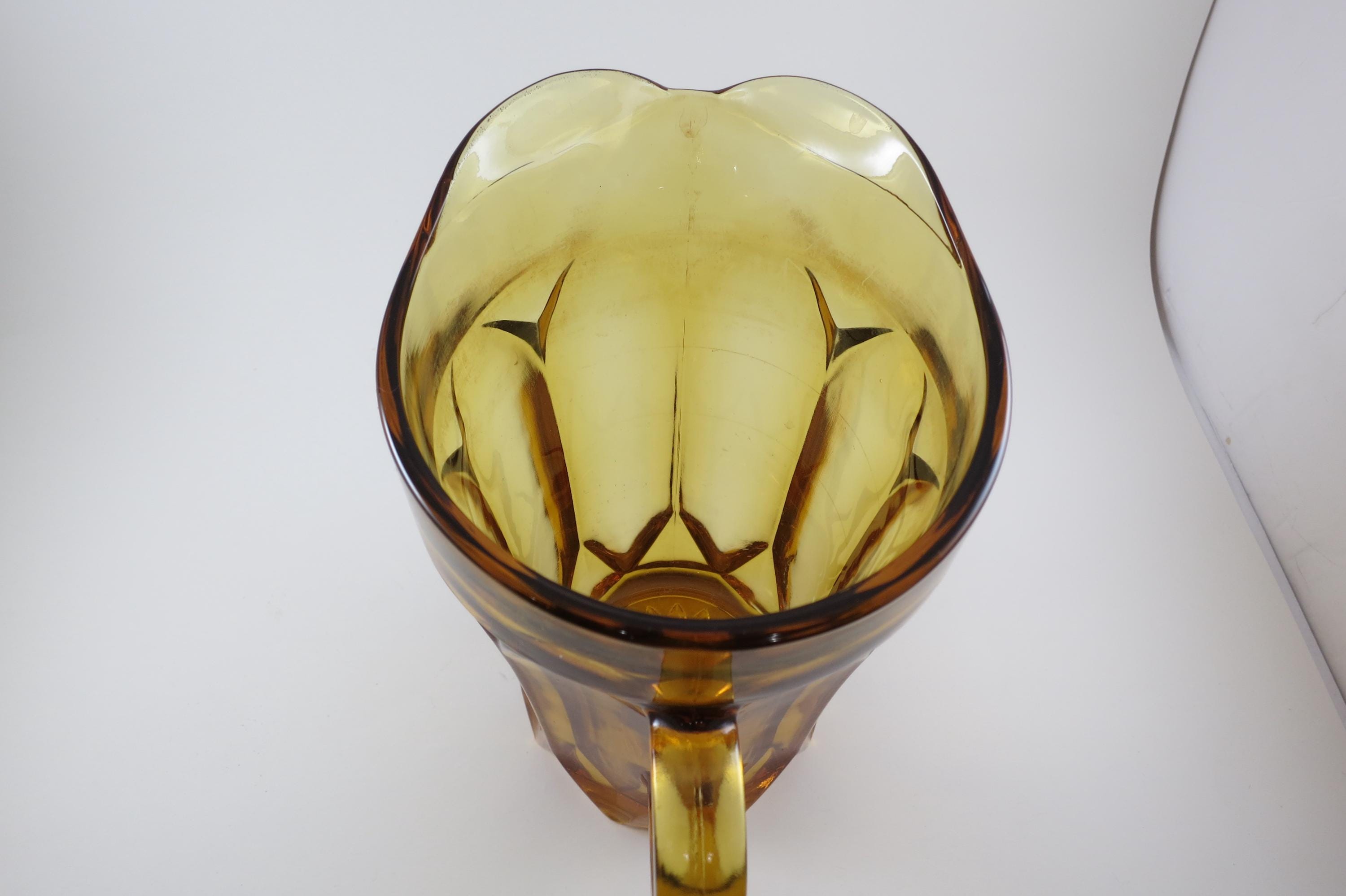 No damages, very nice pitcher. Paneled, Mid Century, Fairfield Amber Color. 8 1/2 inches tall and 7 1/2 inches wide.