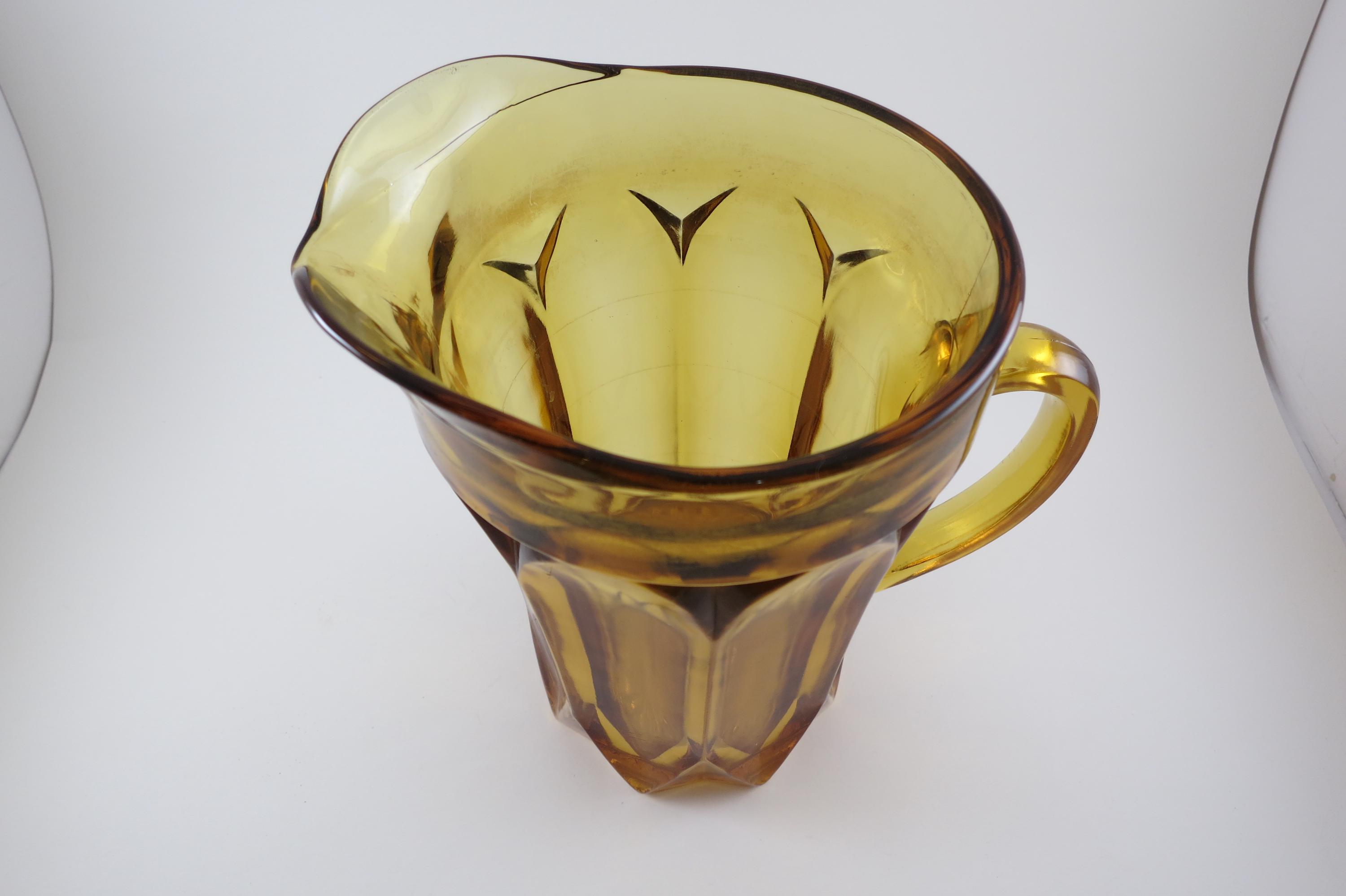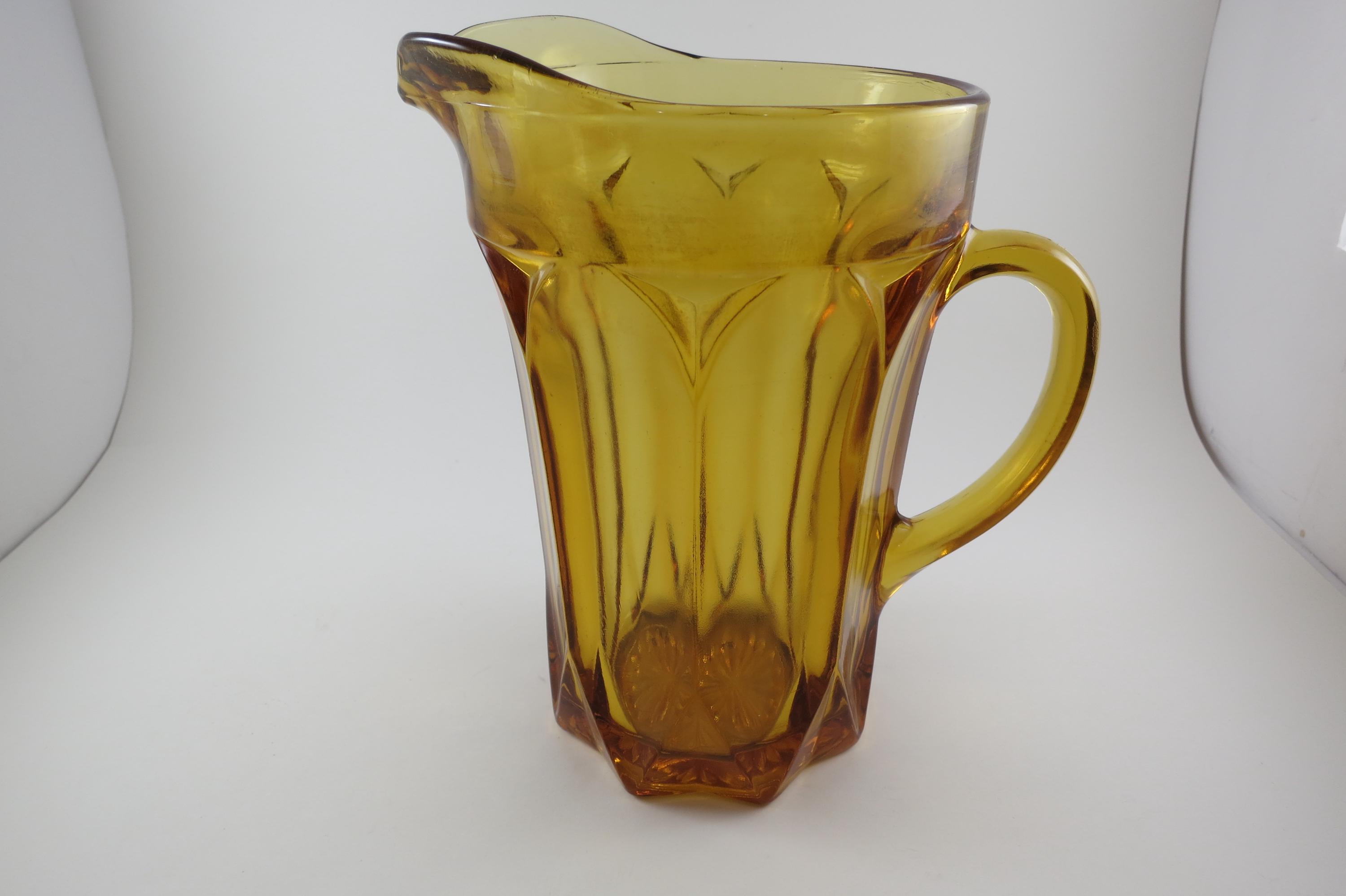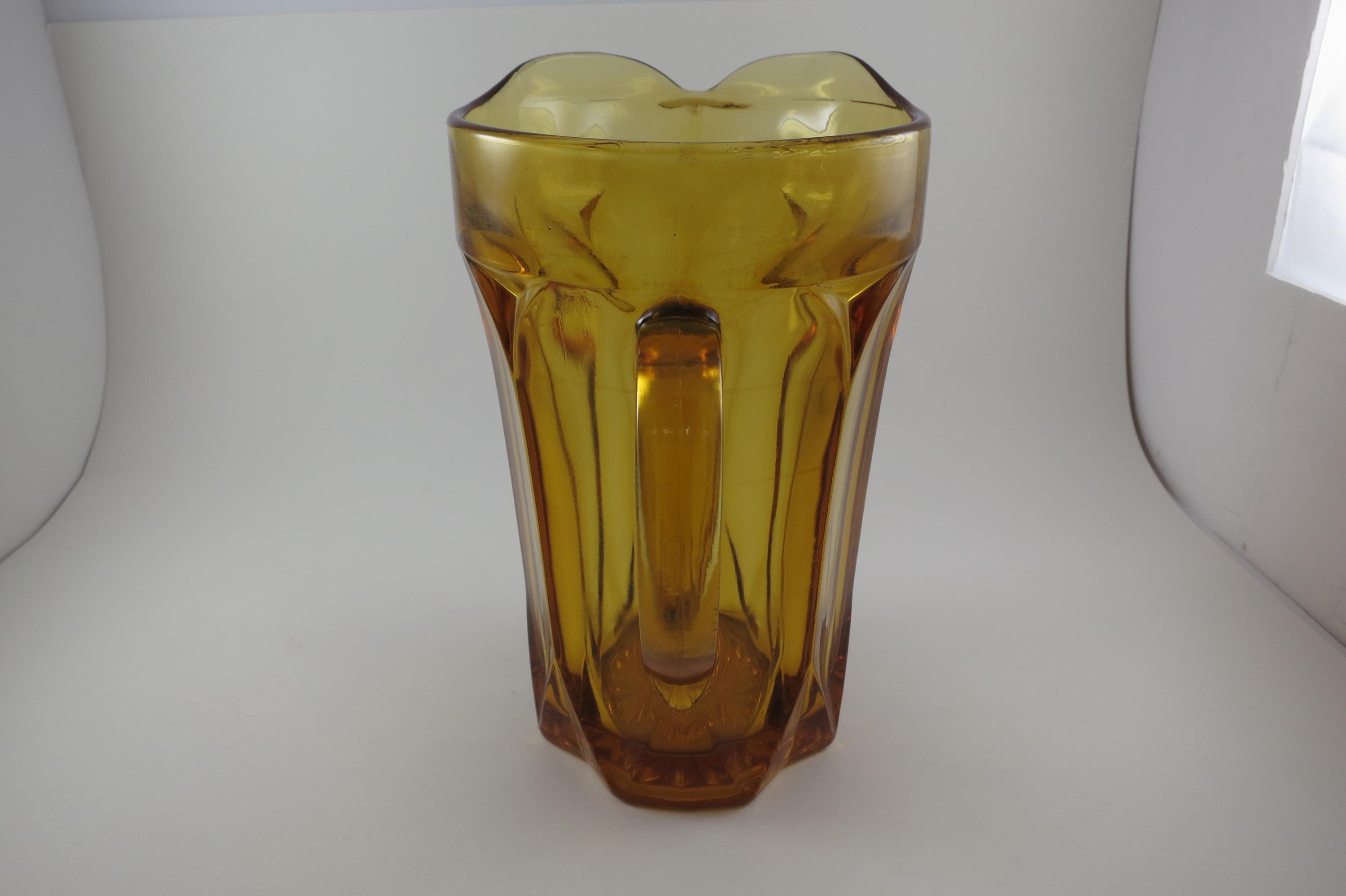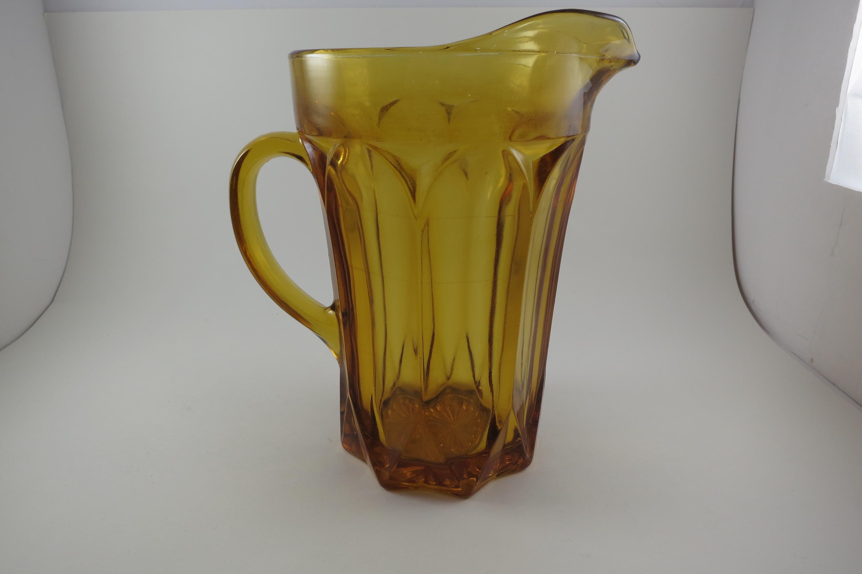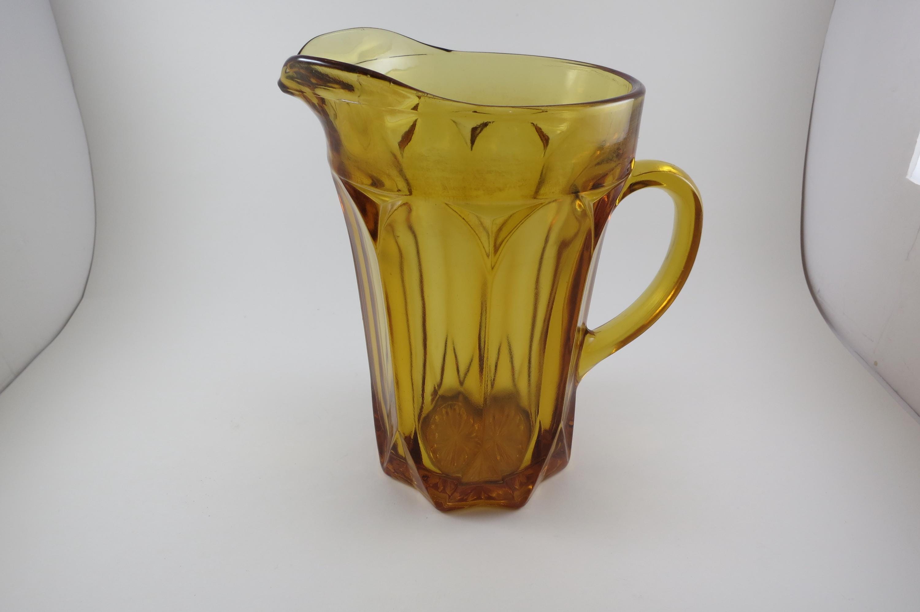 No damages, very nice pitcher. Paneled, Mid Century, Fairfield Amber Color. 8 1/2 inches tall and 7 1/2 inches wide.