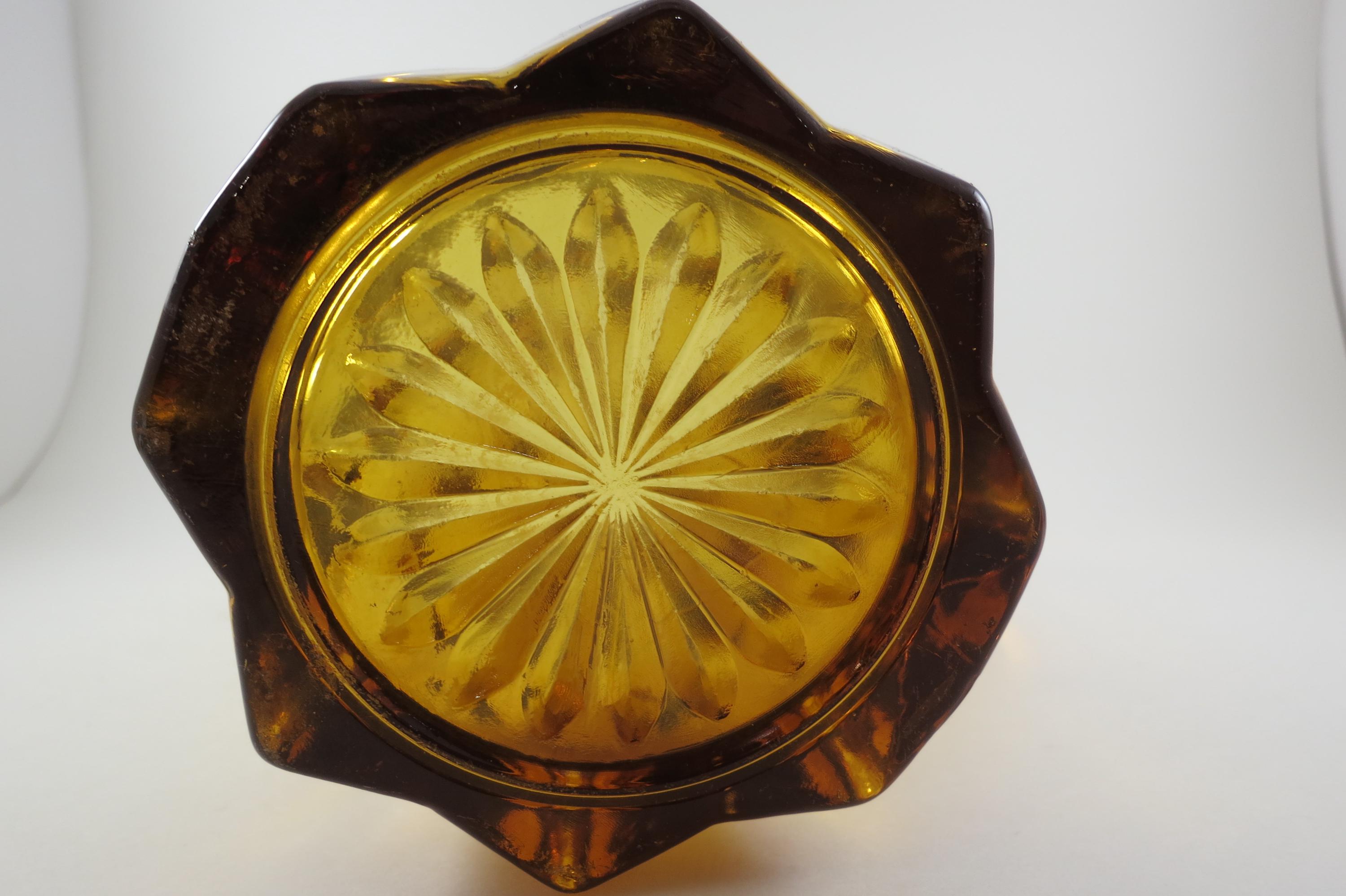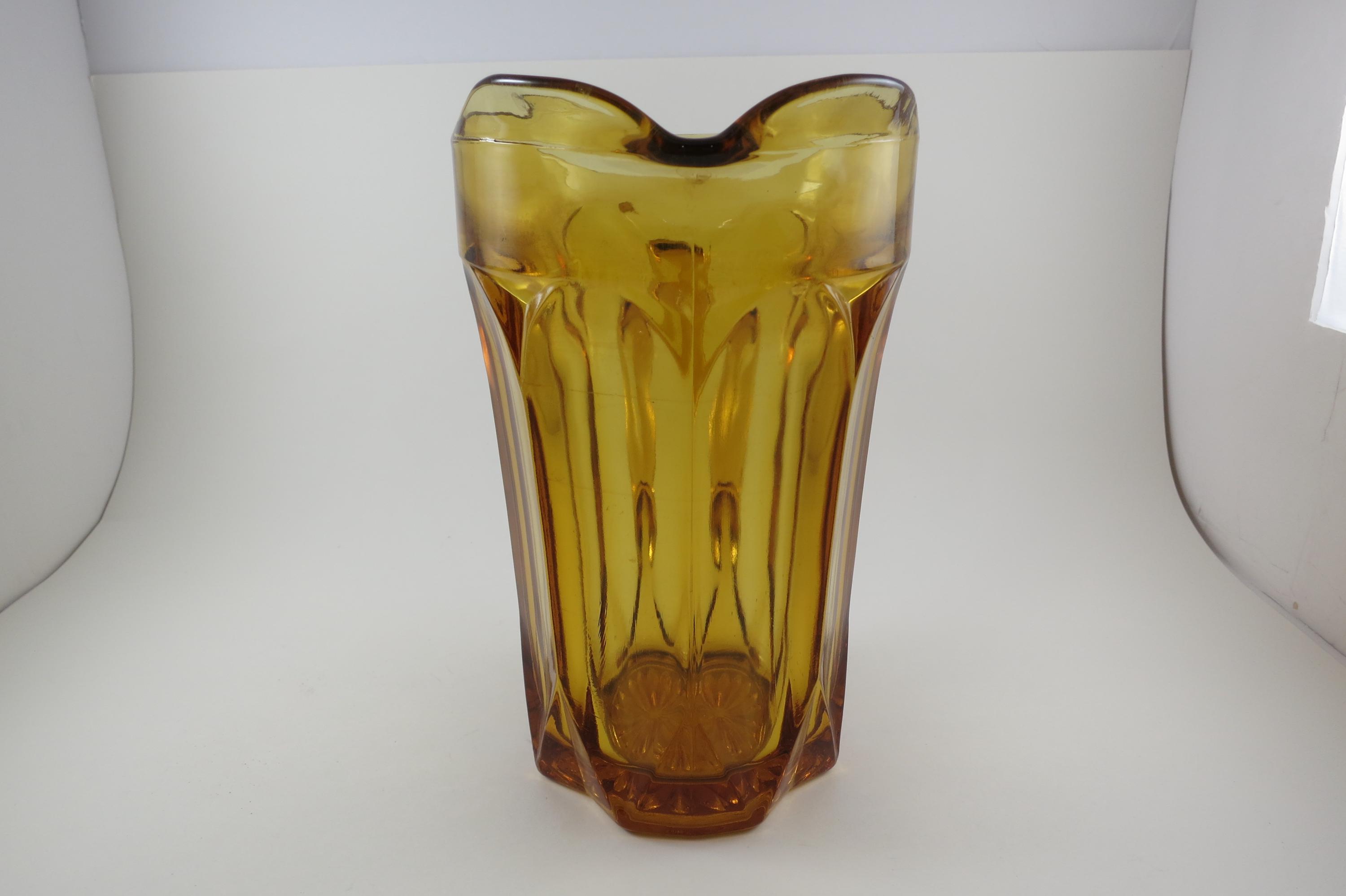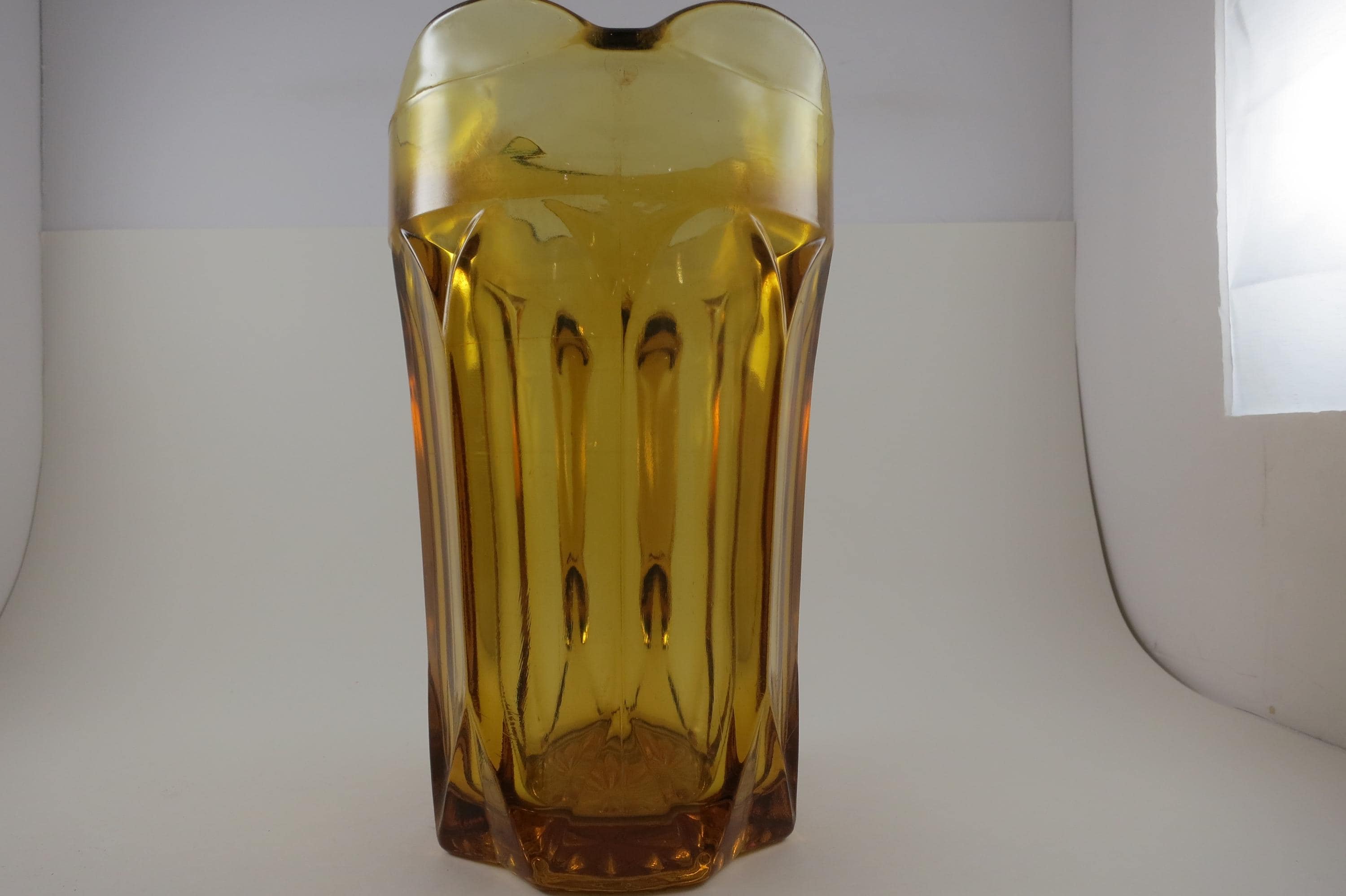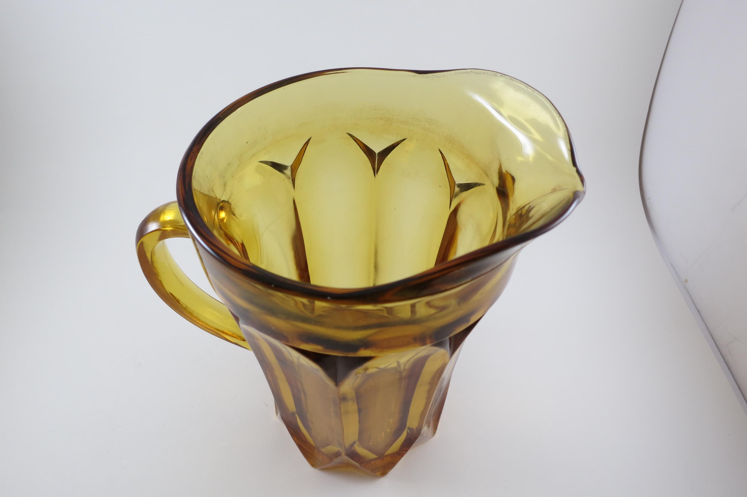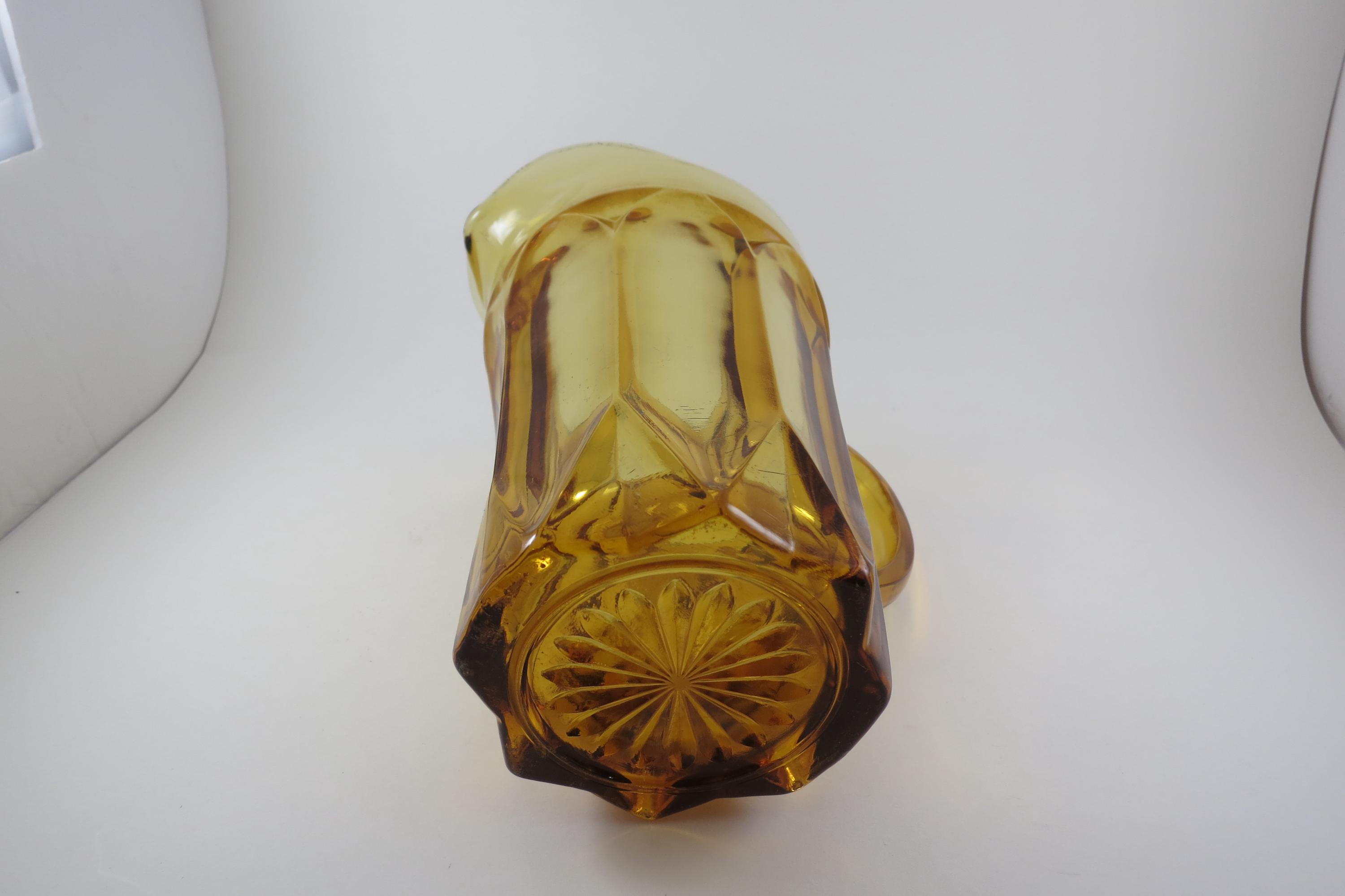 No damages, very nice pitcher. Paneled, Mid Century, Fairfield Amber Color. 8 1/2 inches tall and 7 1/2 inches wide.