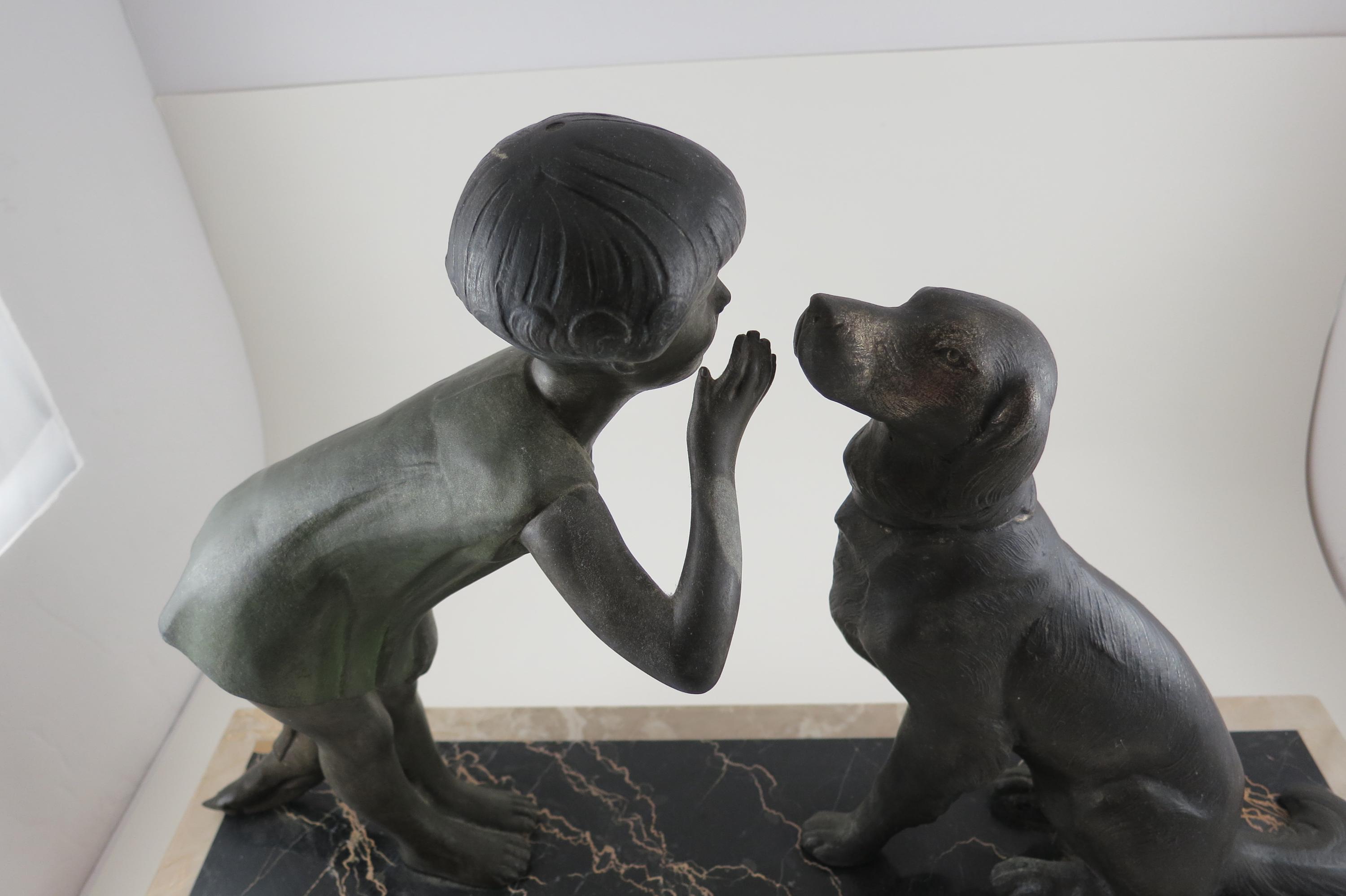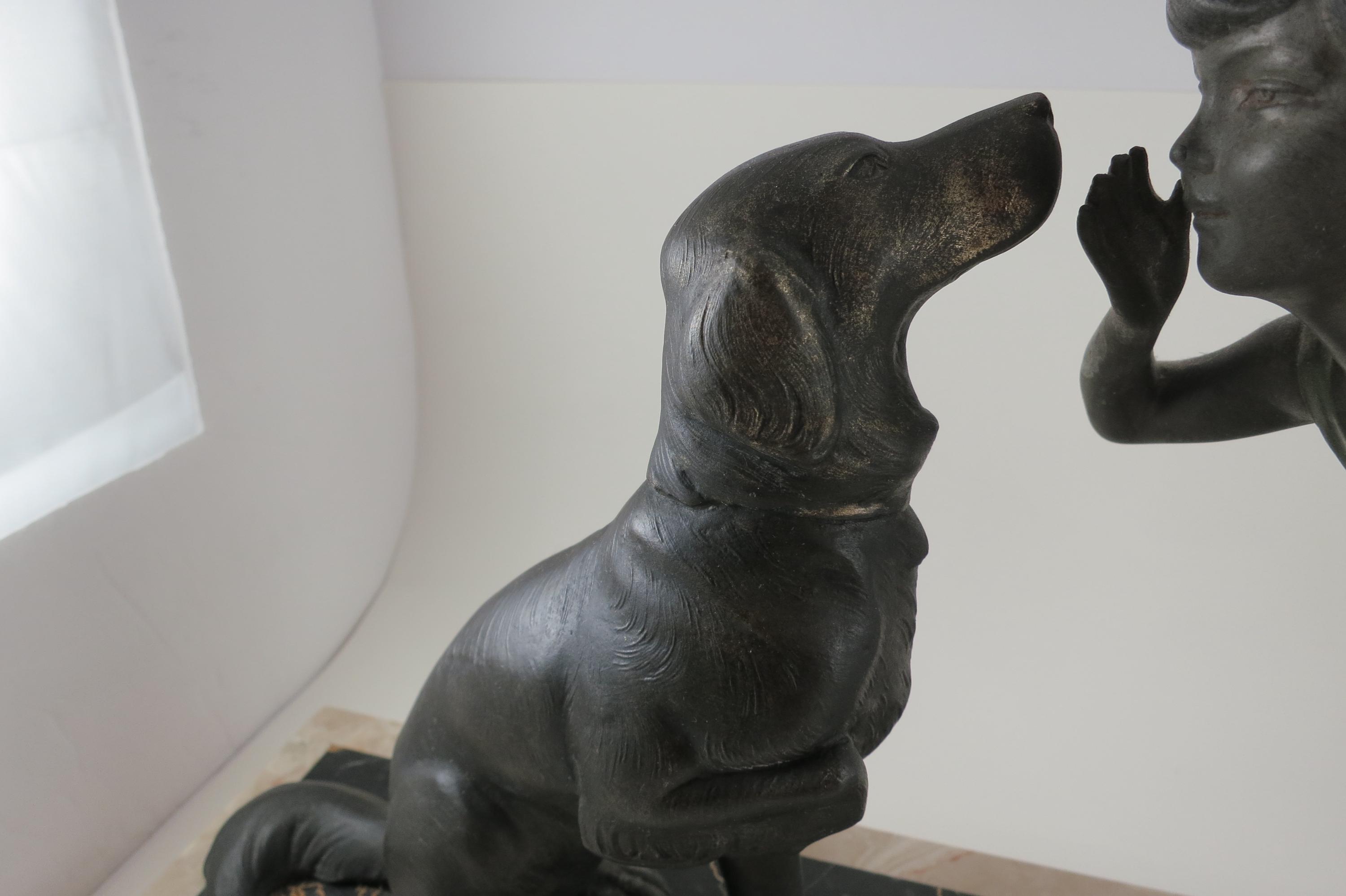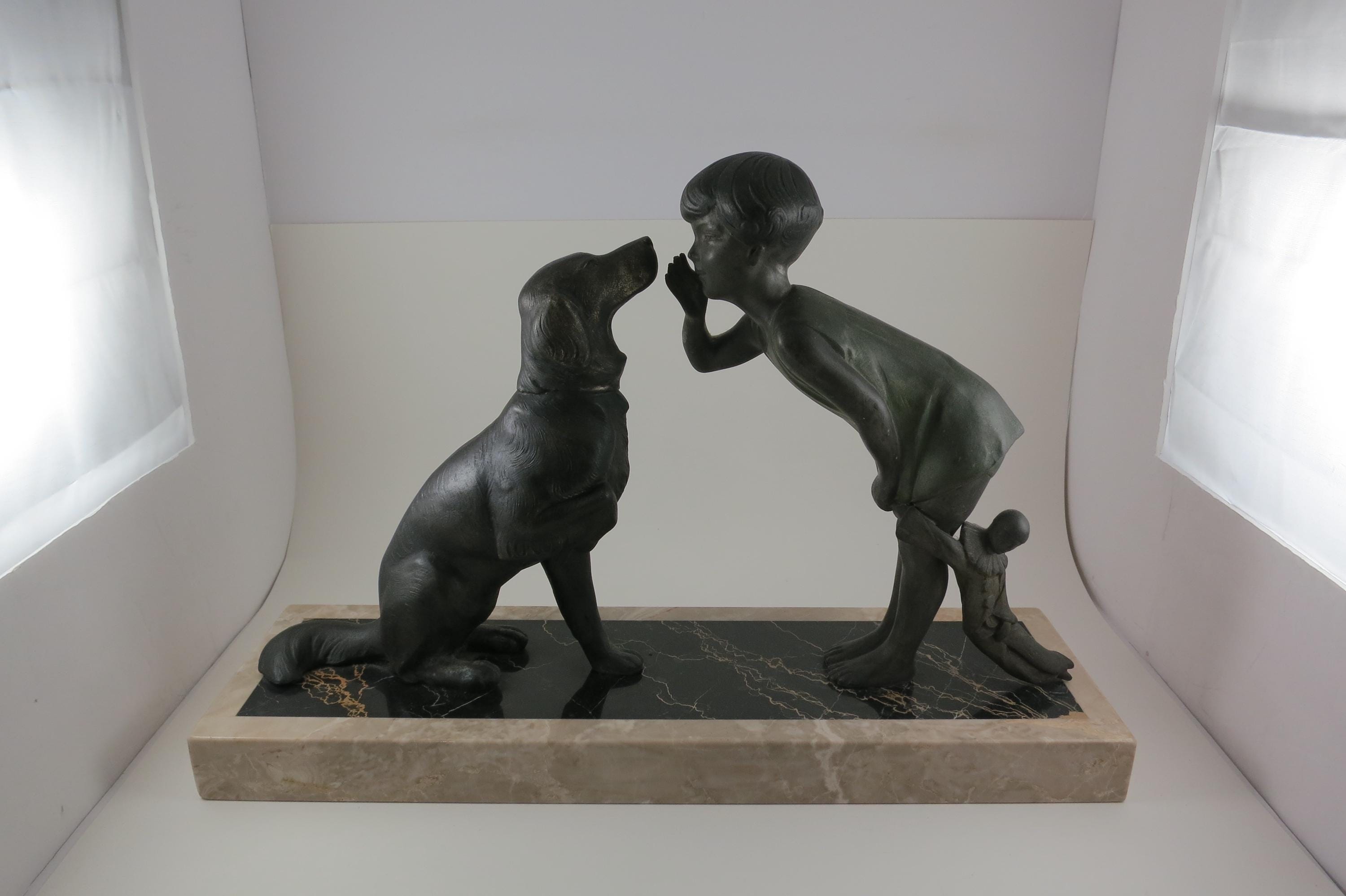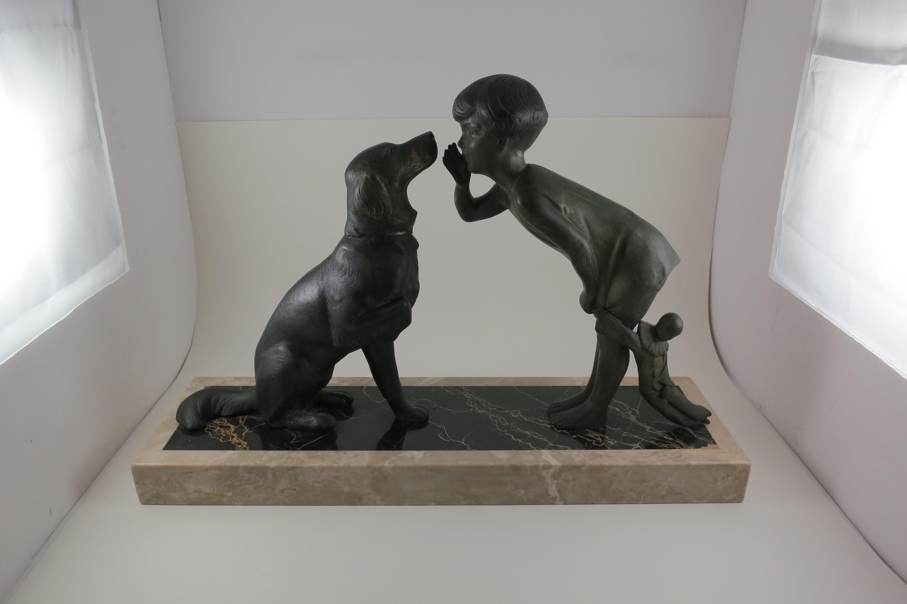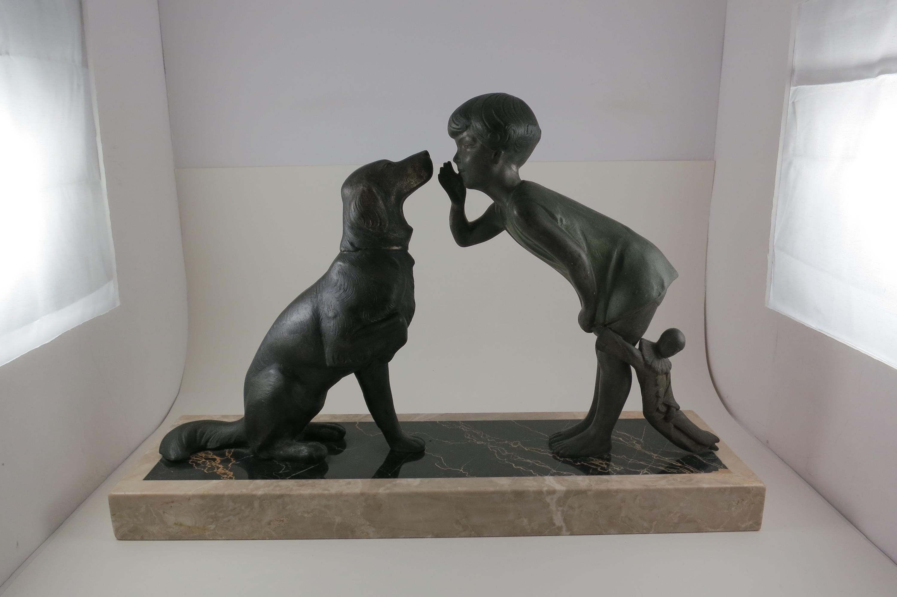 Large Bronze Art Deco Boy and Dog Statue Heavy Marble Base.