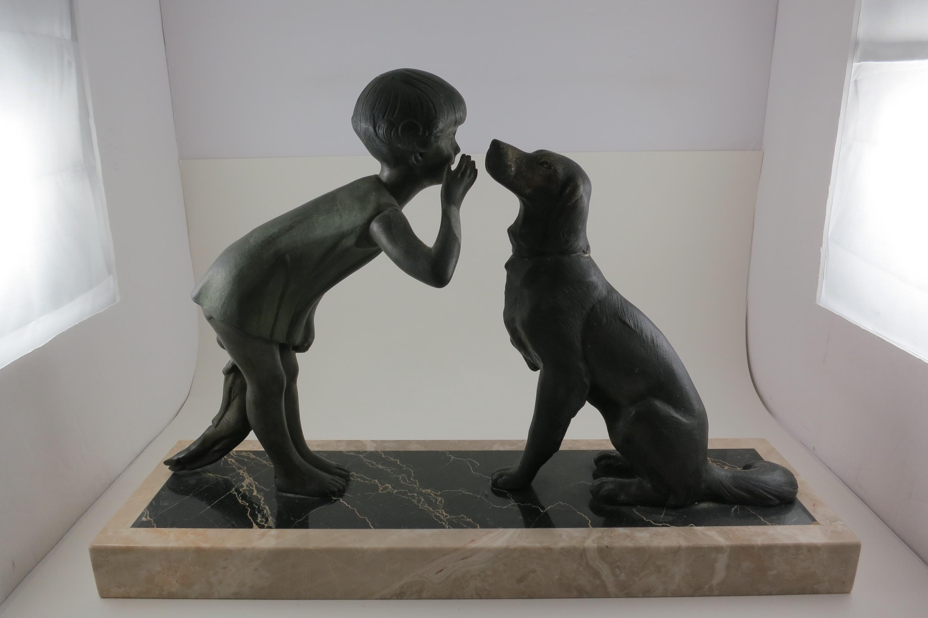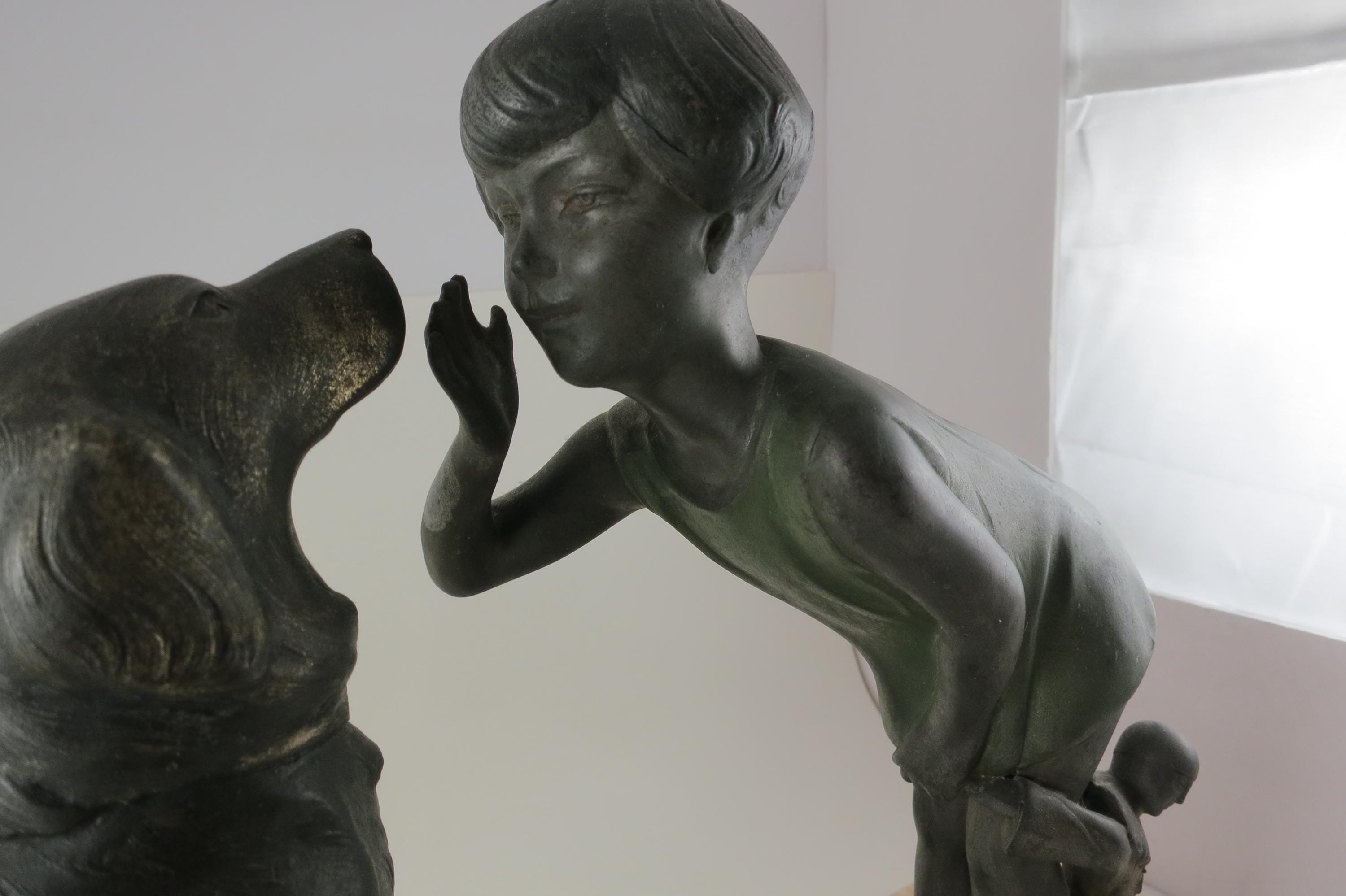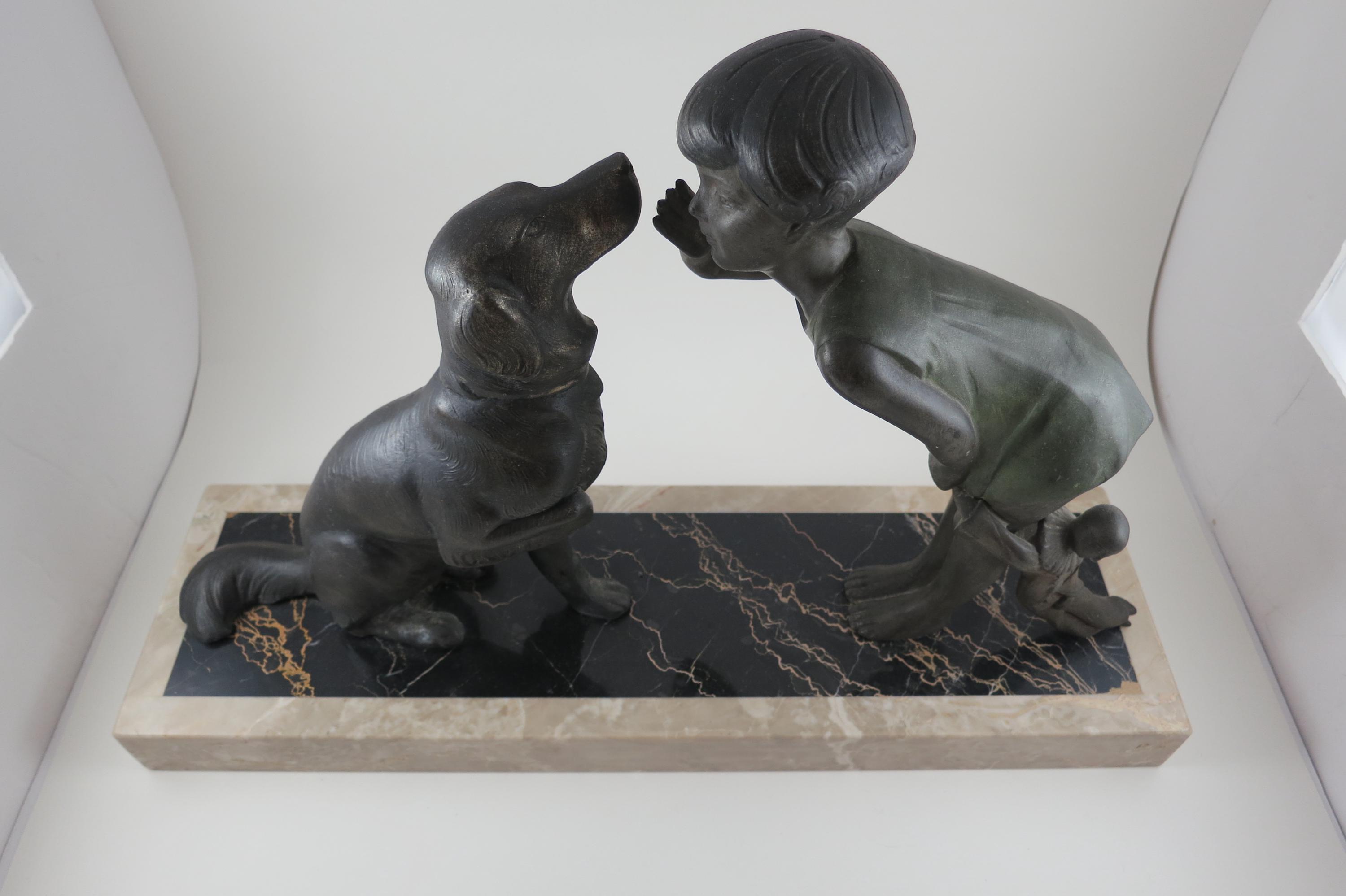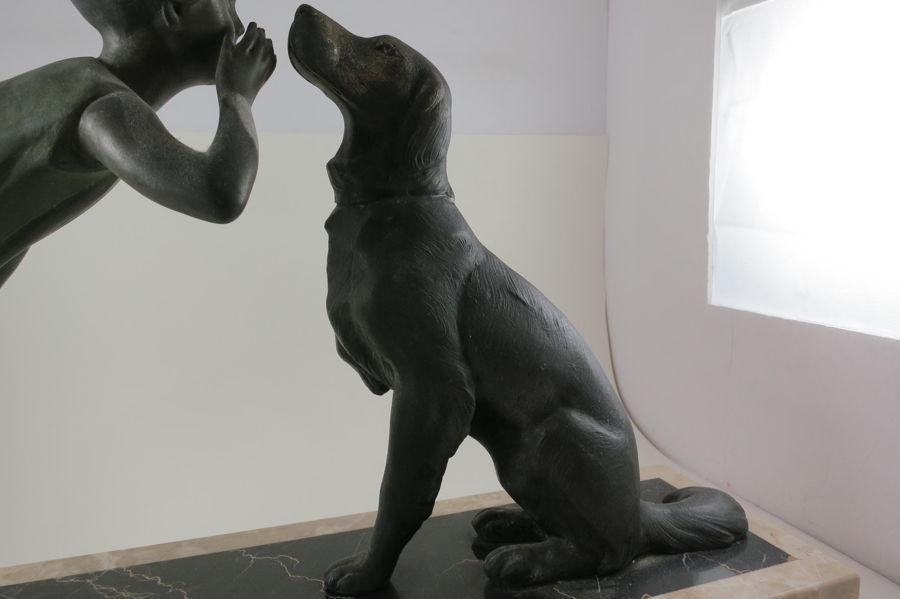 Large Bronze Art Deco Boy and Dog Statue Heavy Marble Base.