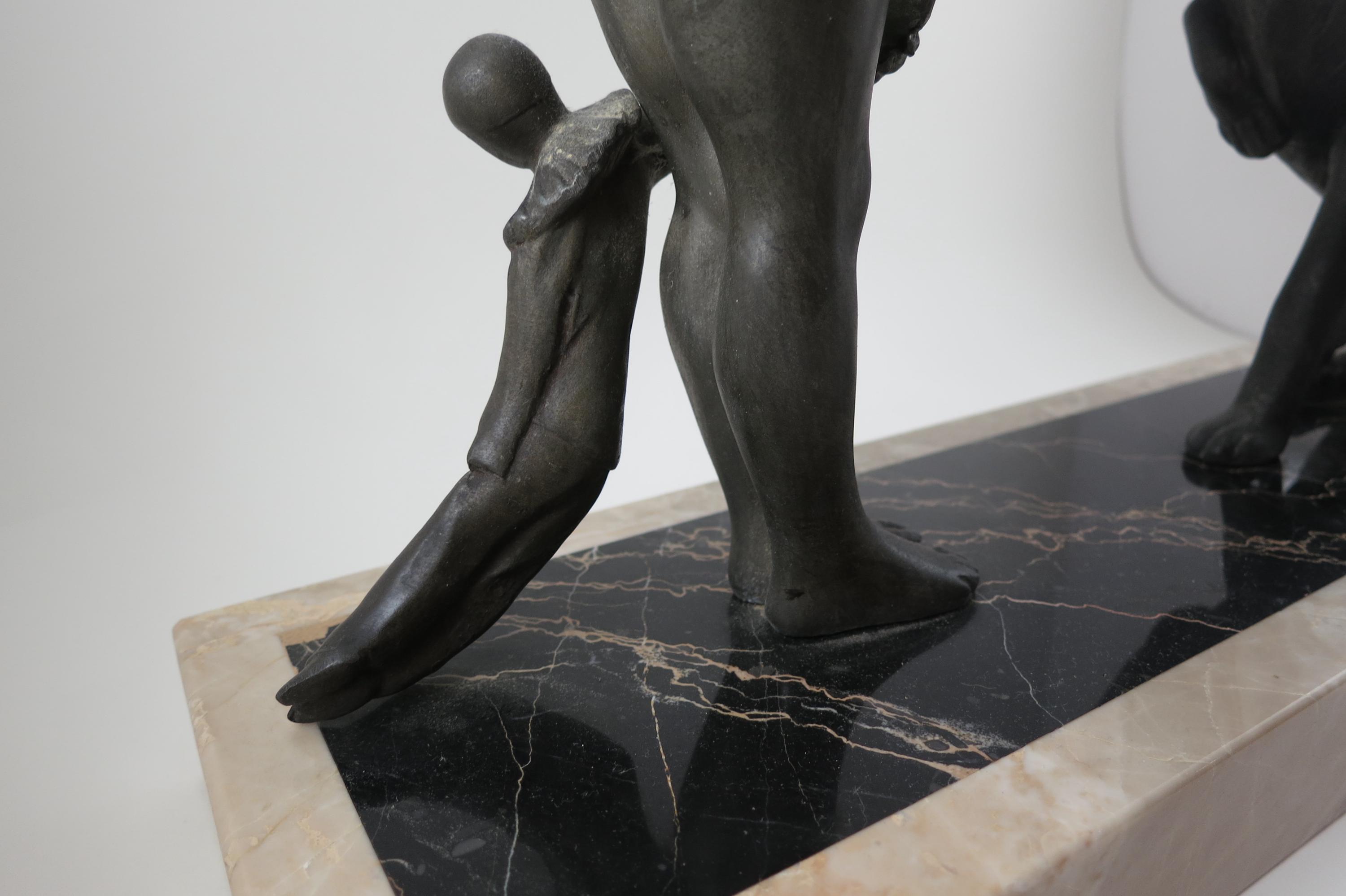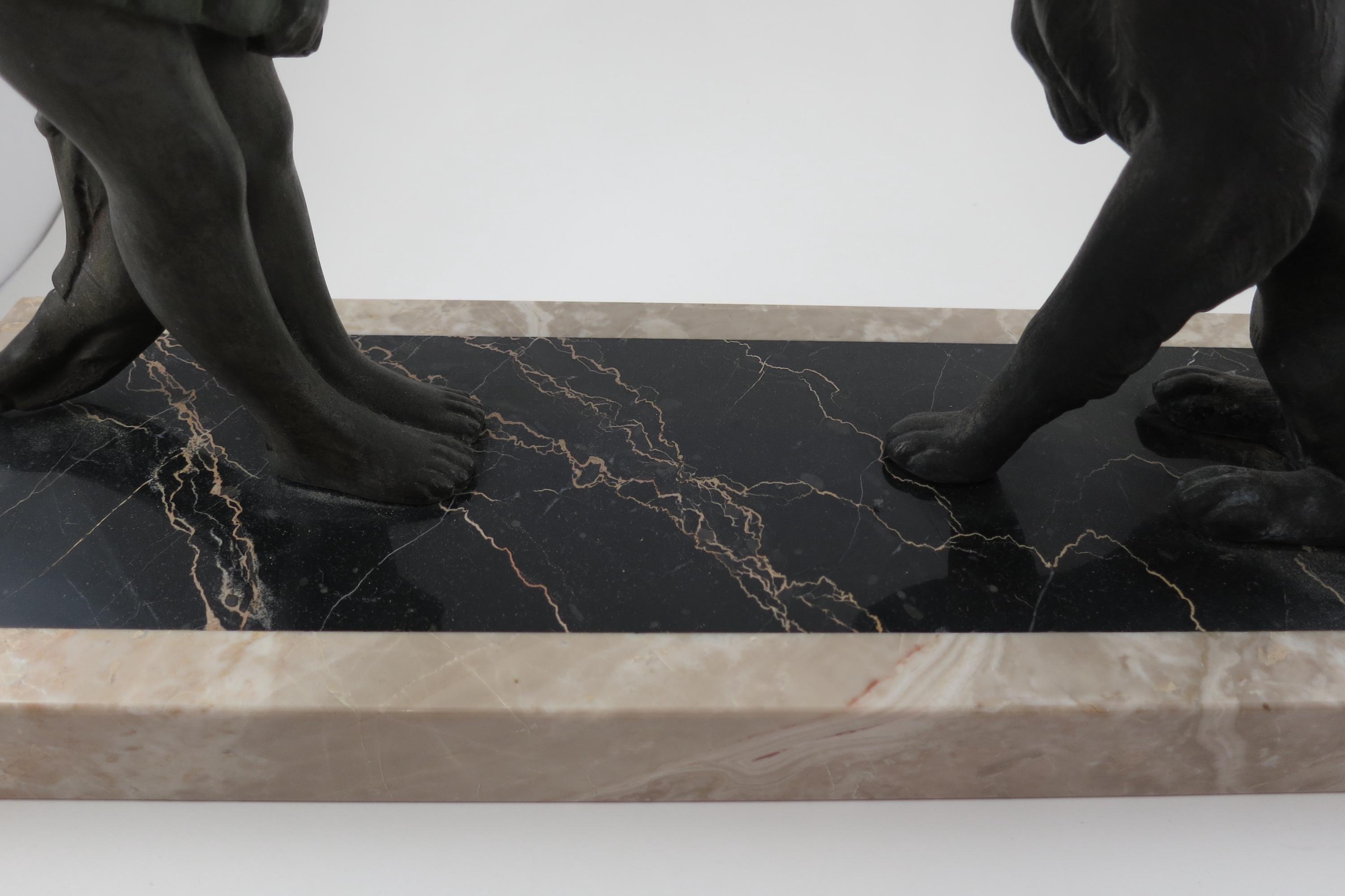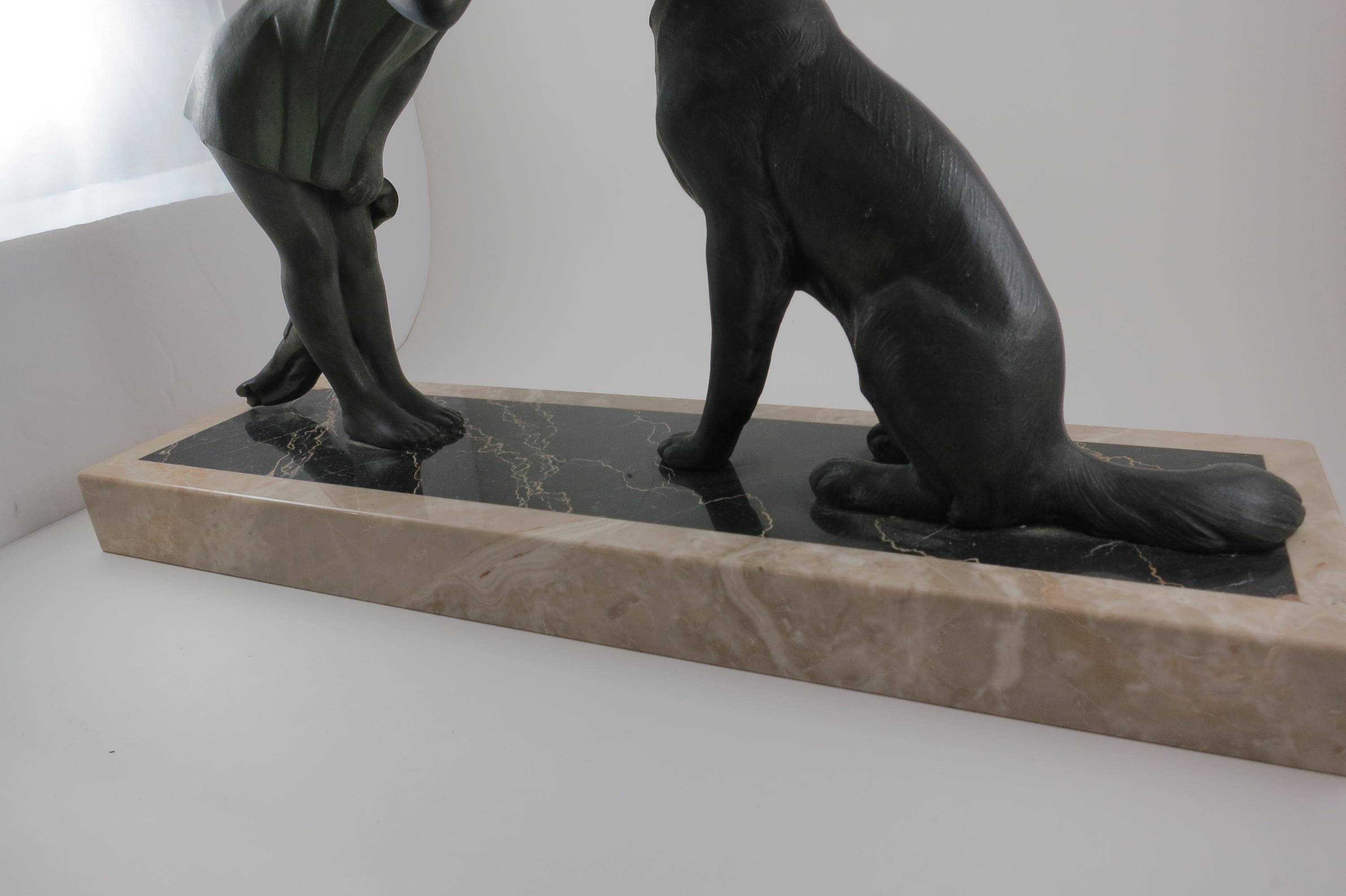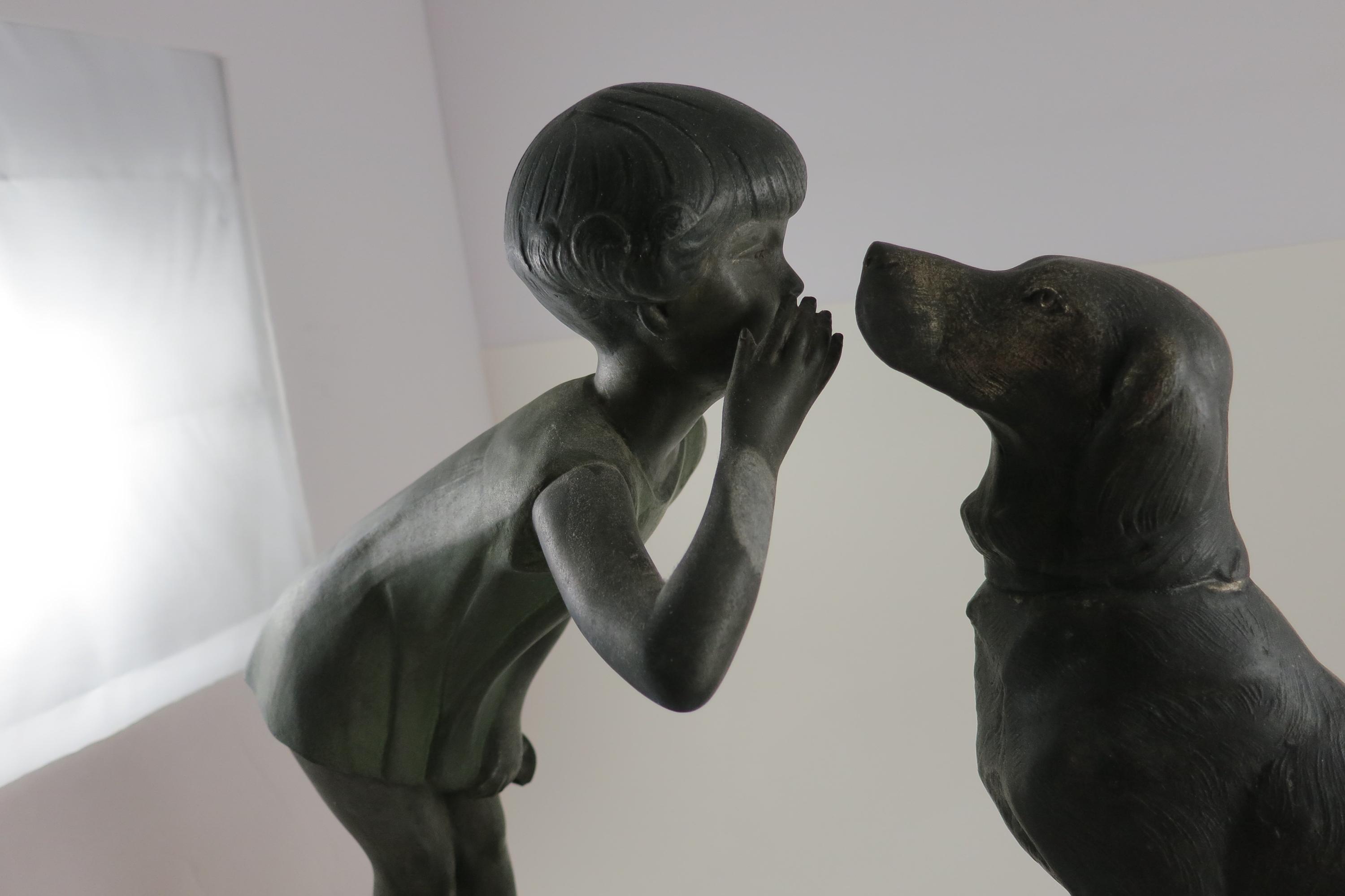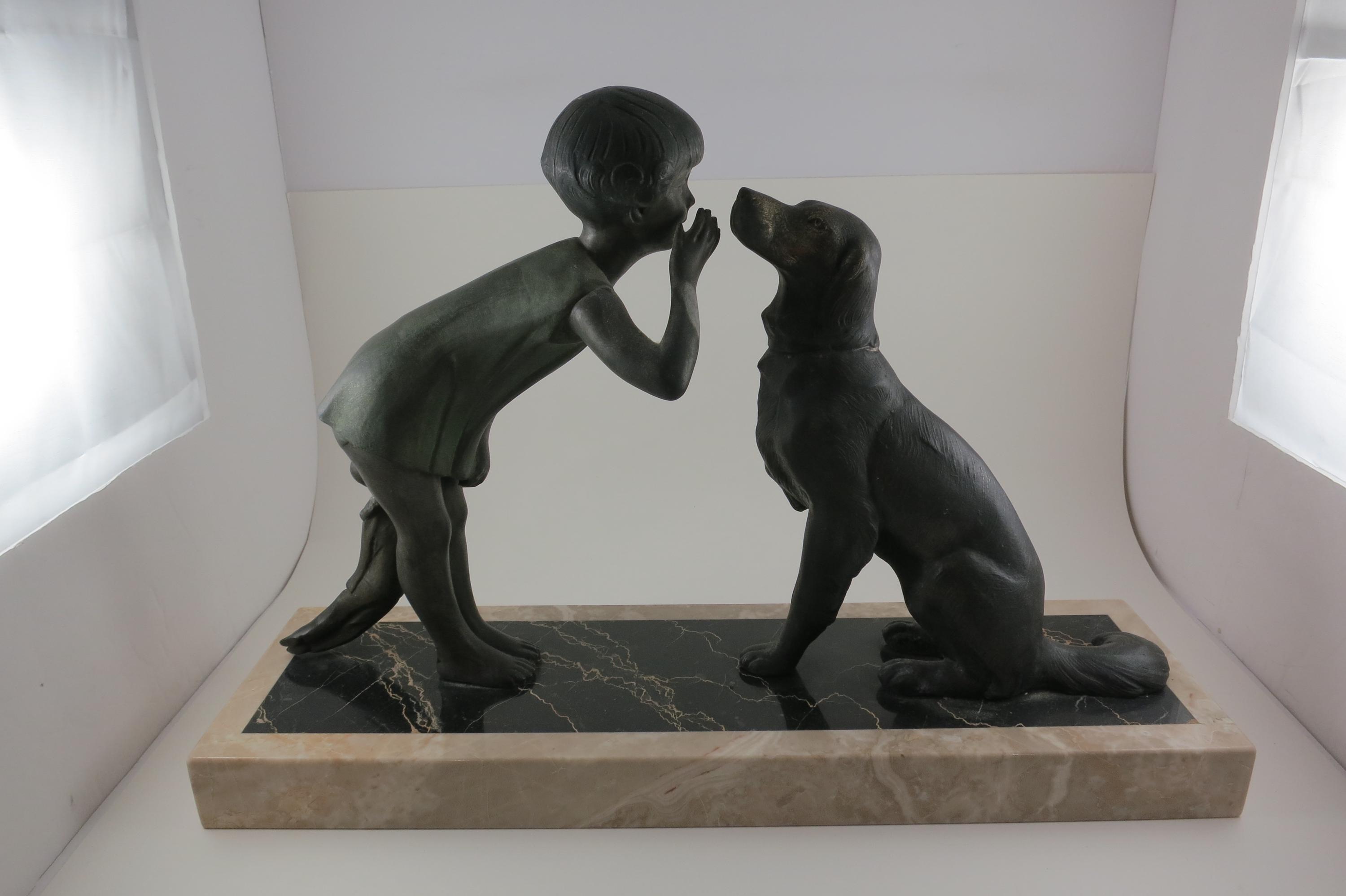 Large Bronze Art Deco Boy and Dog Statue Heavy Marble Base.