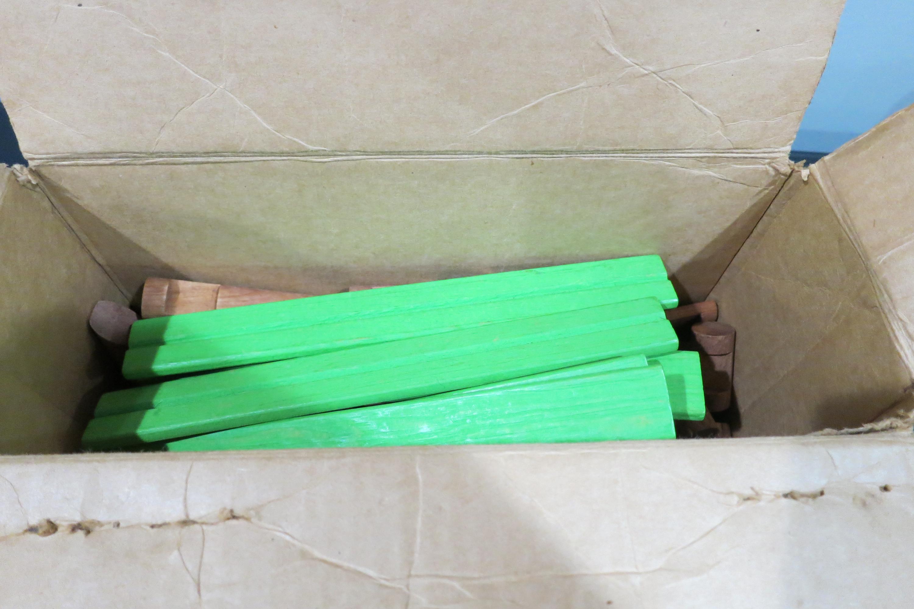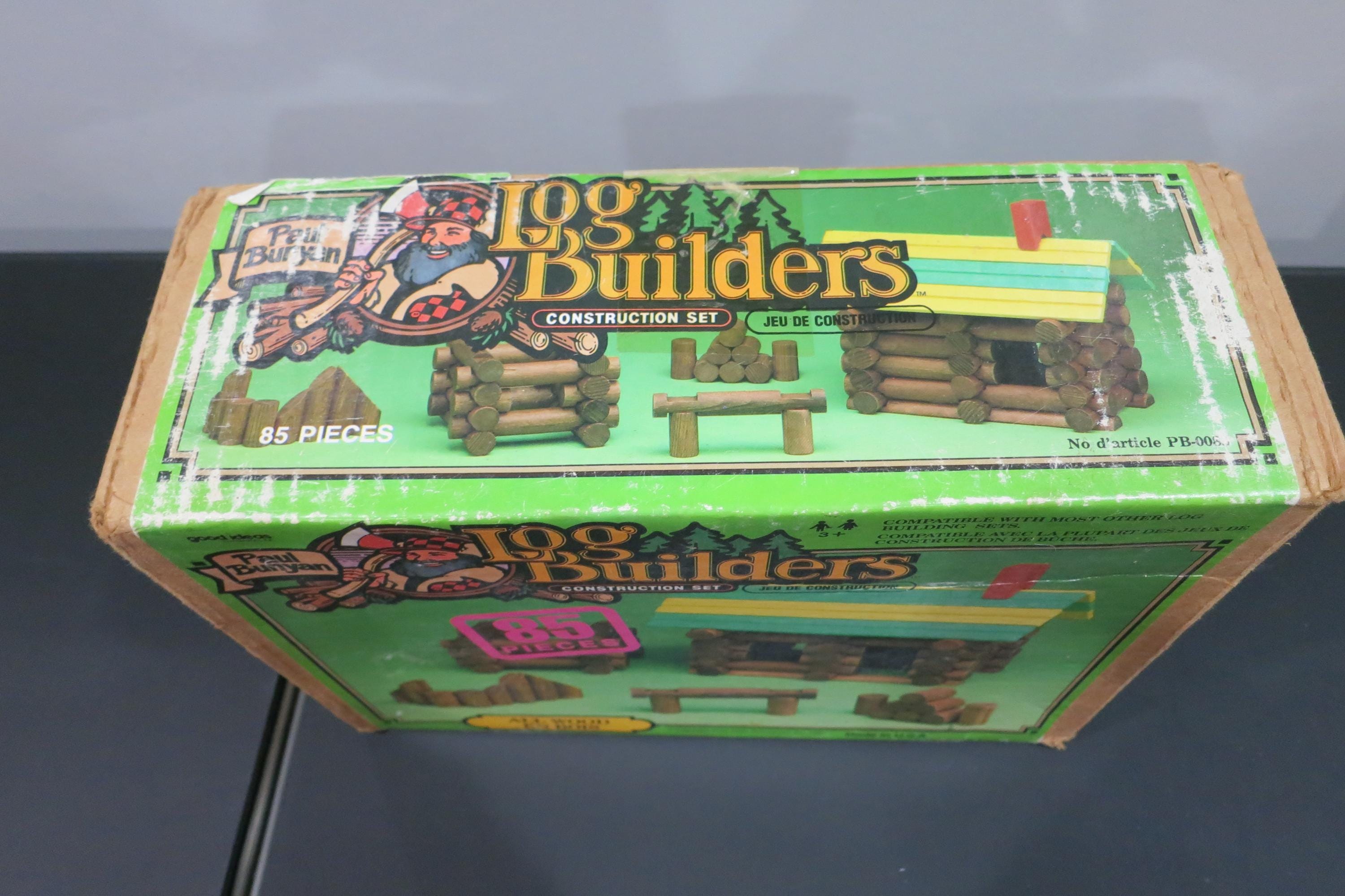 Vintage 1990 Paul Bunyon 85 Piece Log Builders Construction Set IOB. Box is a little worn, counted all 85 pieces, complete. Box says will integrate with most other brands, such as Lincoln Logs.