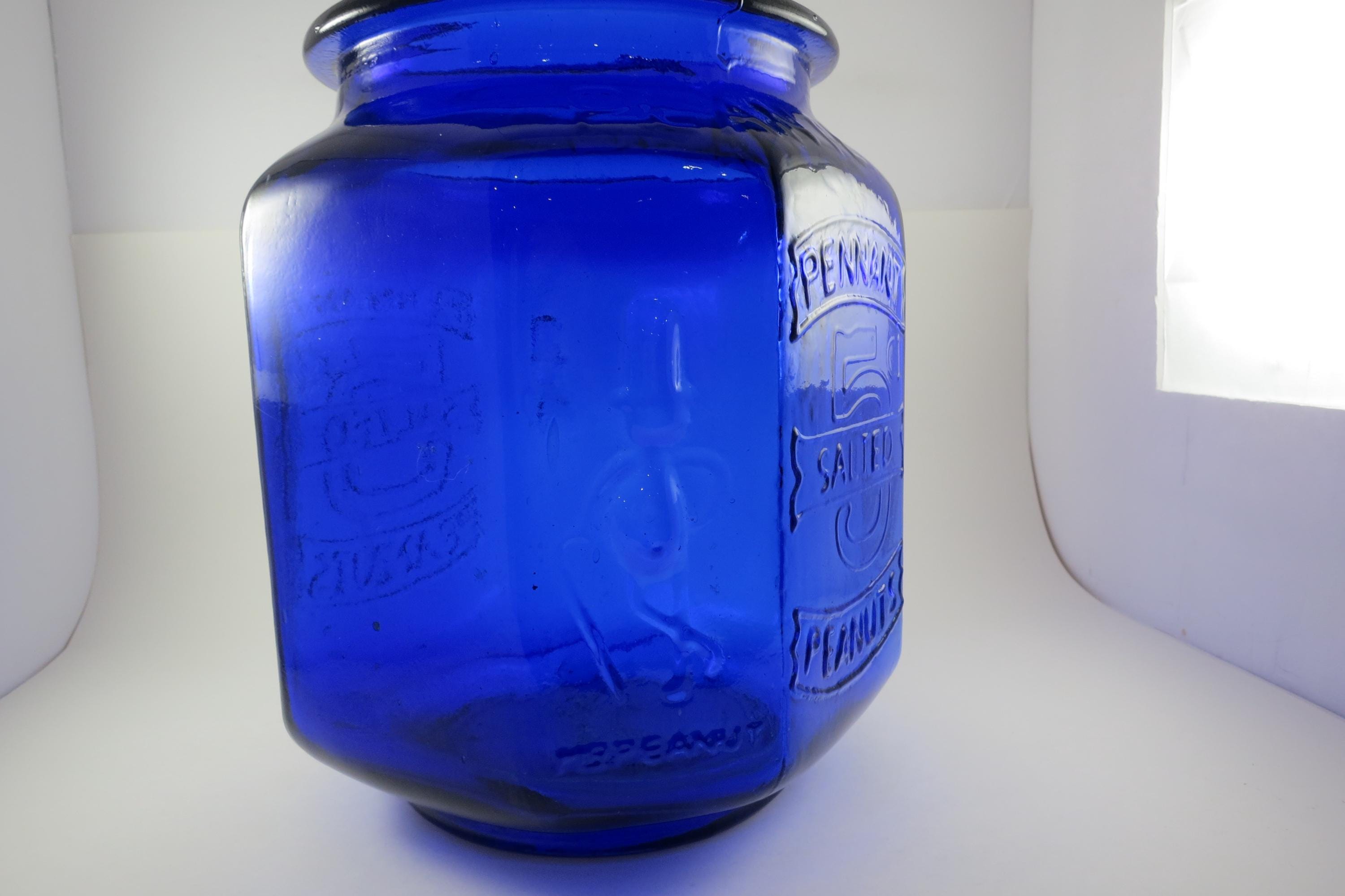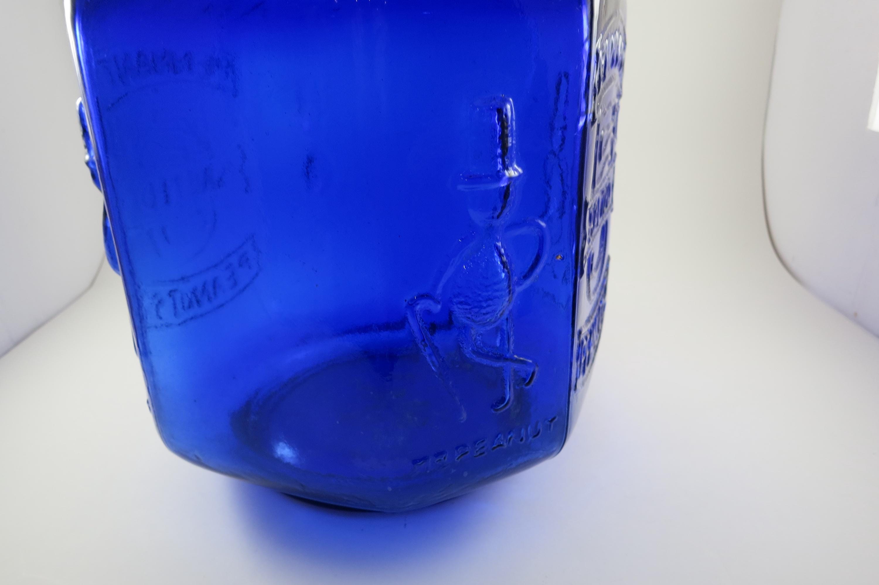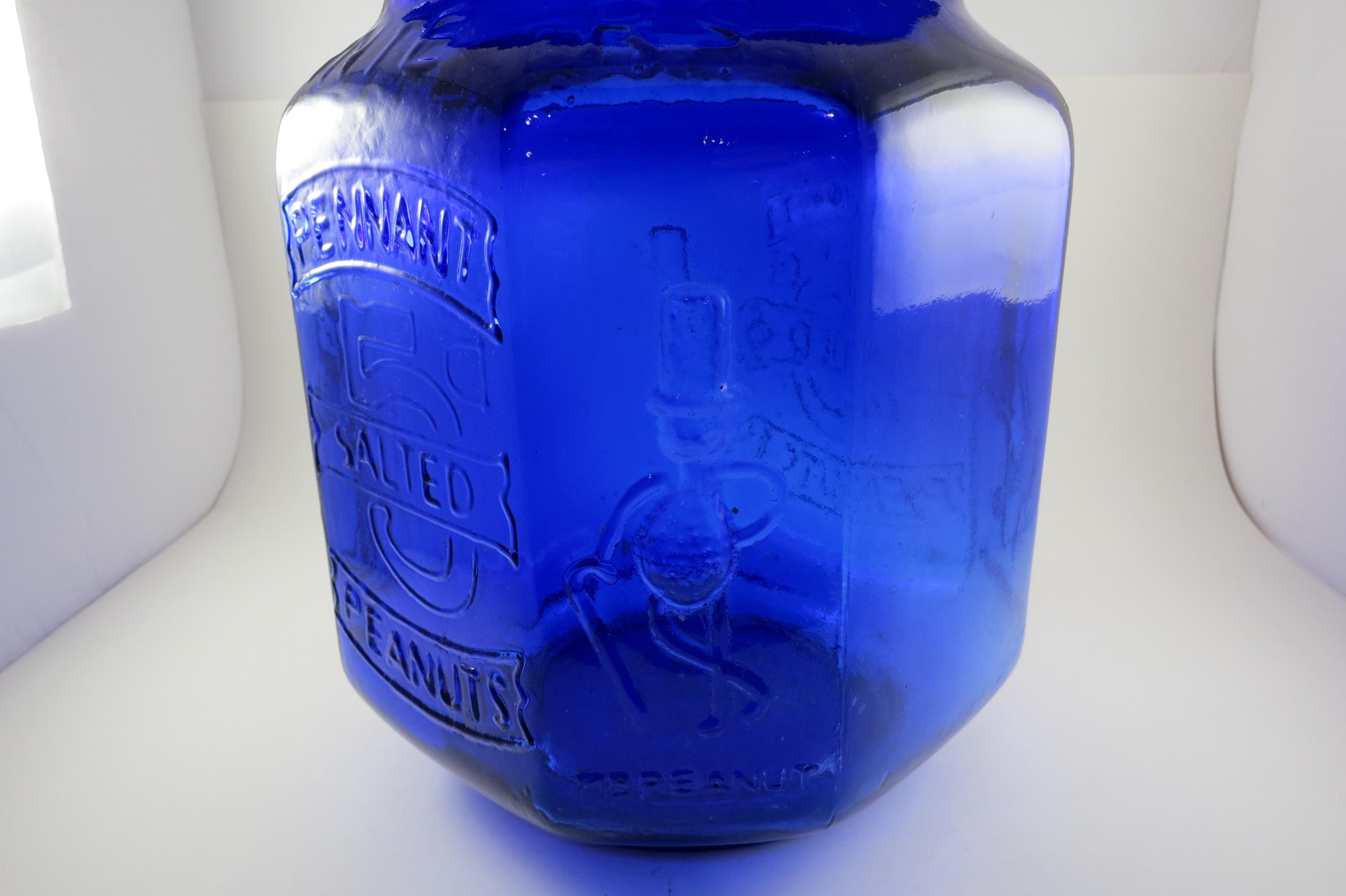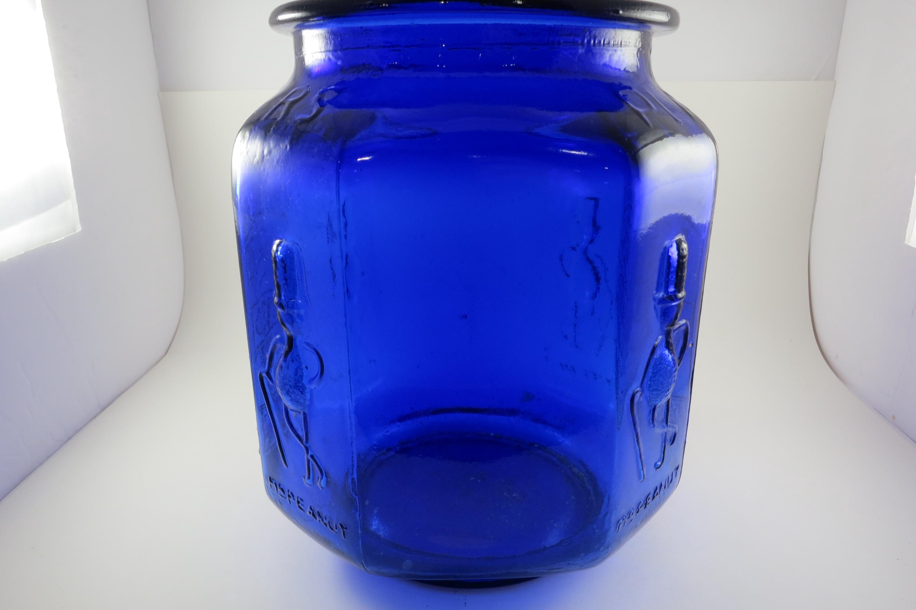 Fabulous Vintage Cobalt Blue Mr. Peanut Planters Peanuts Jar Large Size Embossed Bubbled Glass Great Display Piece. A wonderful addition to any home or collection. Very detailed, measures 10 1/2 inches tall and 8 inches wide. No chips, cracks or damages. Looks great in the cabinet and even better when light shines through!!