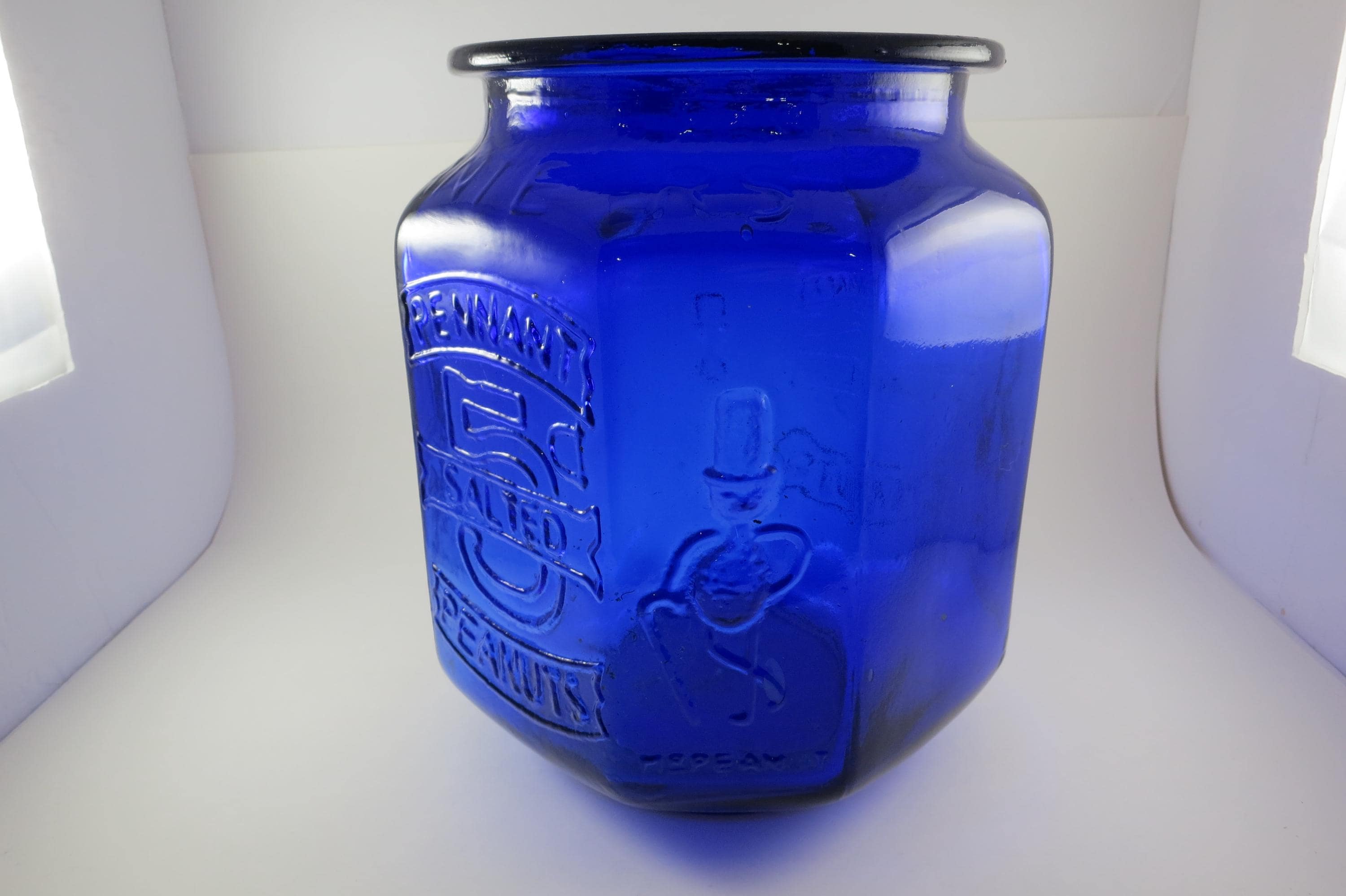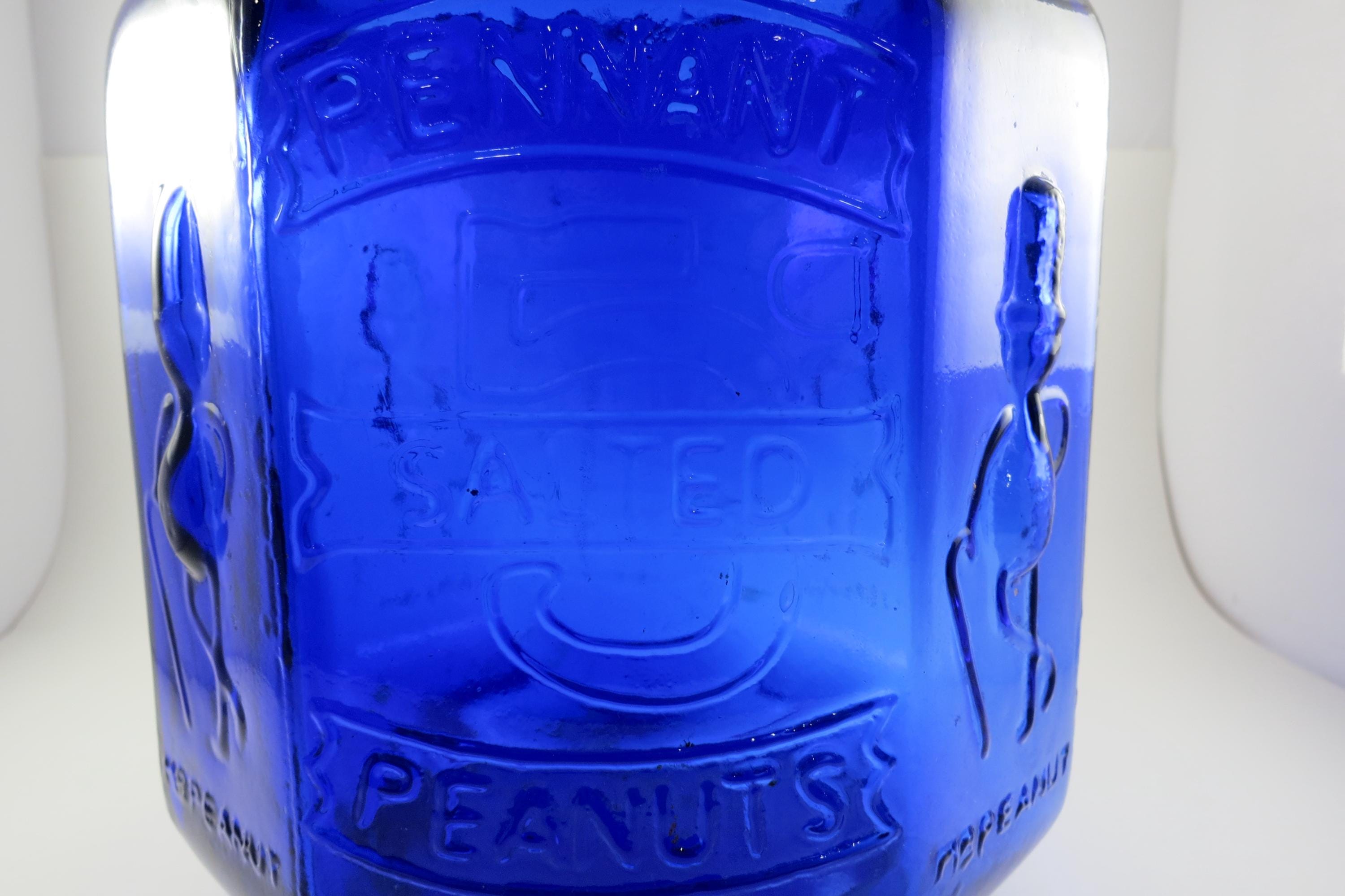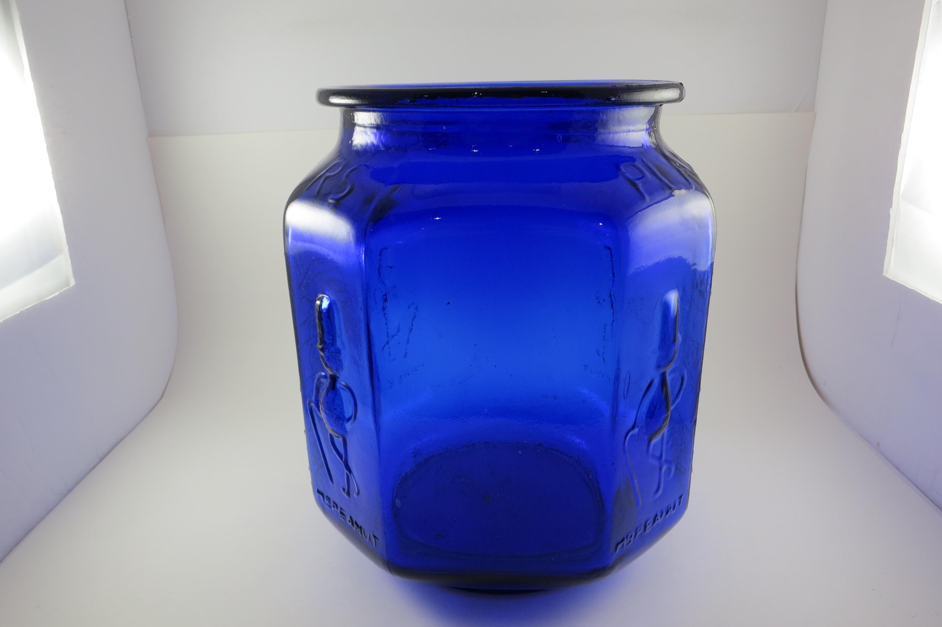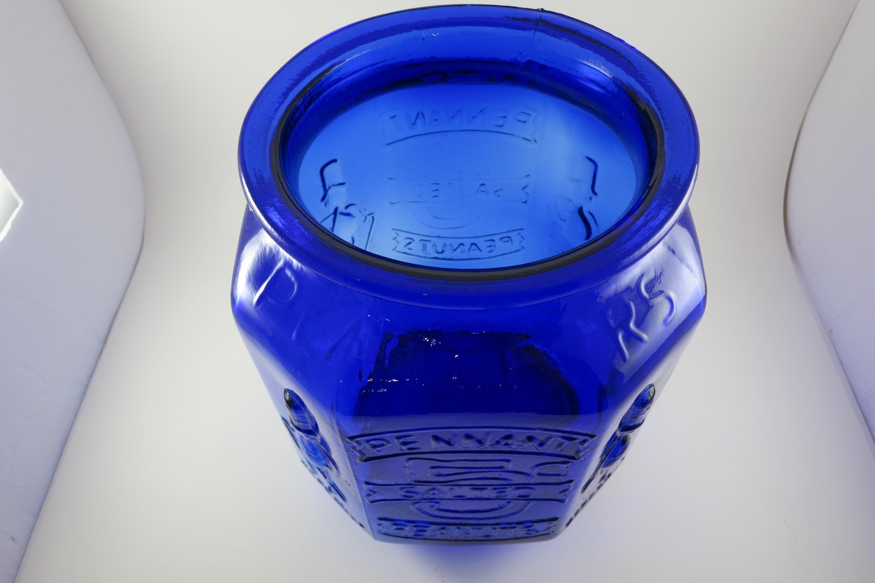 Fabulous Vintage Cobalt Blue Mr. Peanut Planters Peanuts Jar Large Size Embossed Bubbled Glass Great Display Piece. A wonderful addition to any home or collection. Very detailed, measures 10 1/2 inches tall and 8 inches wide. No chips, cracks or damages. Looks great in the cabinet and even better when light shines through!!