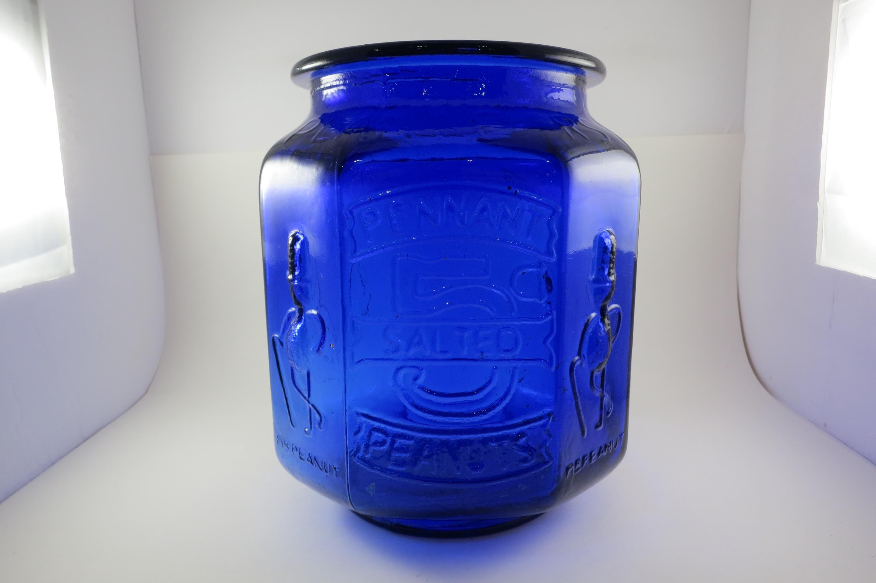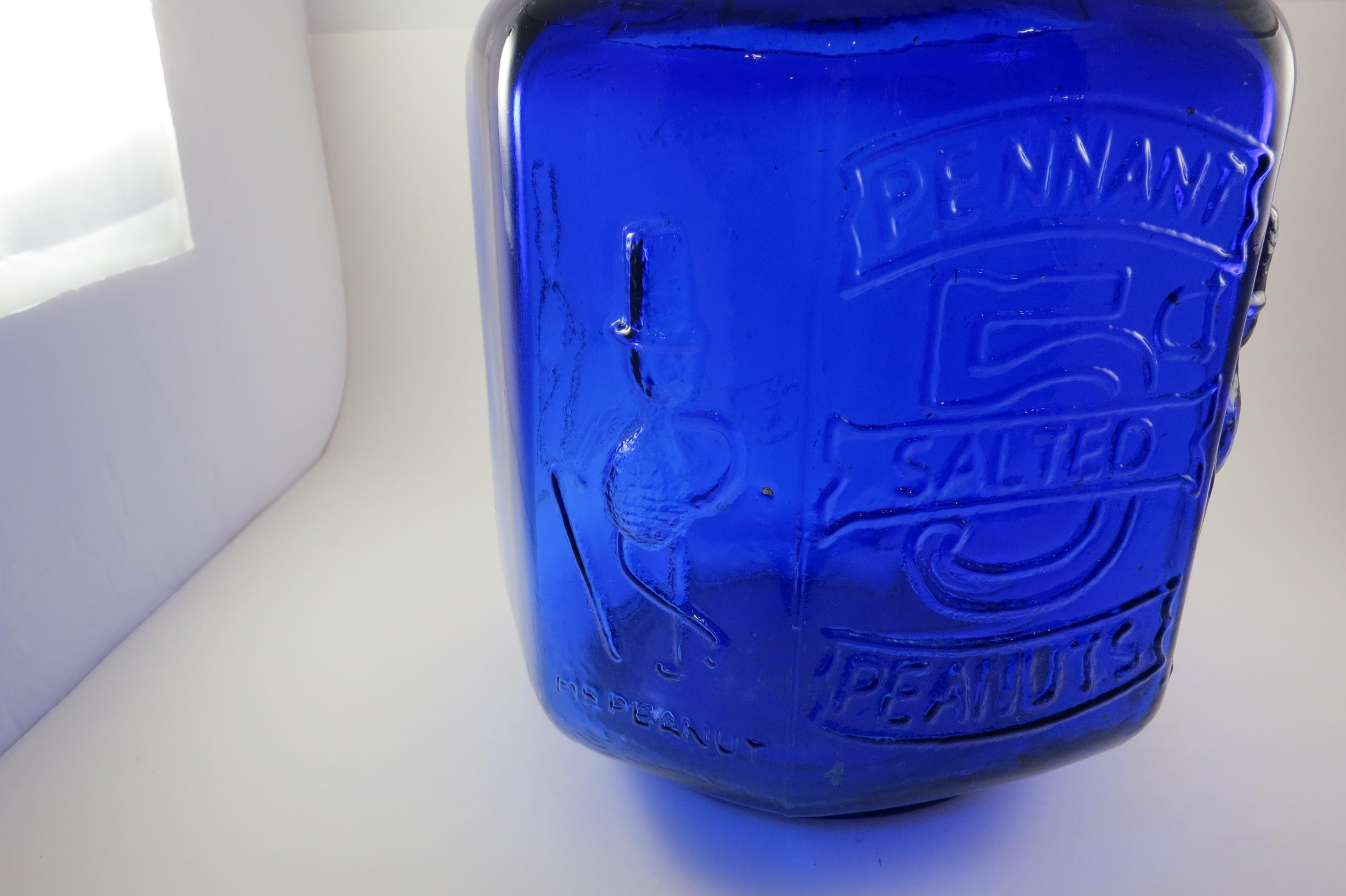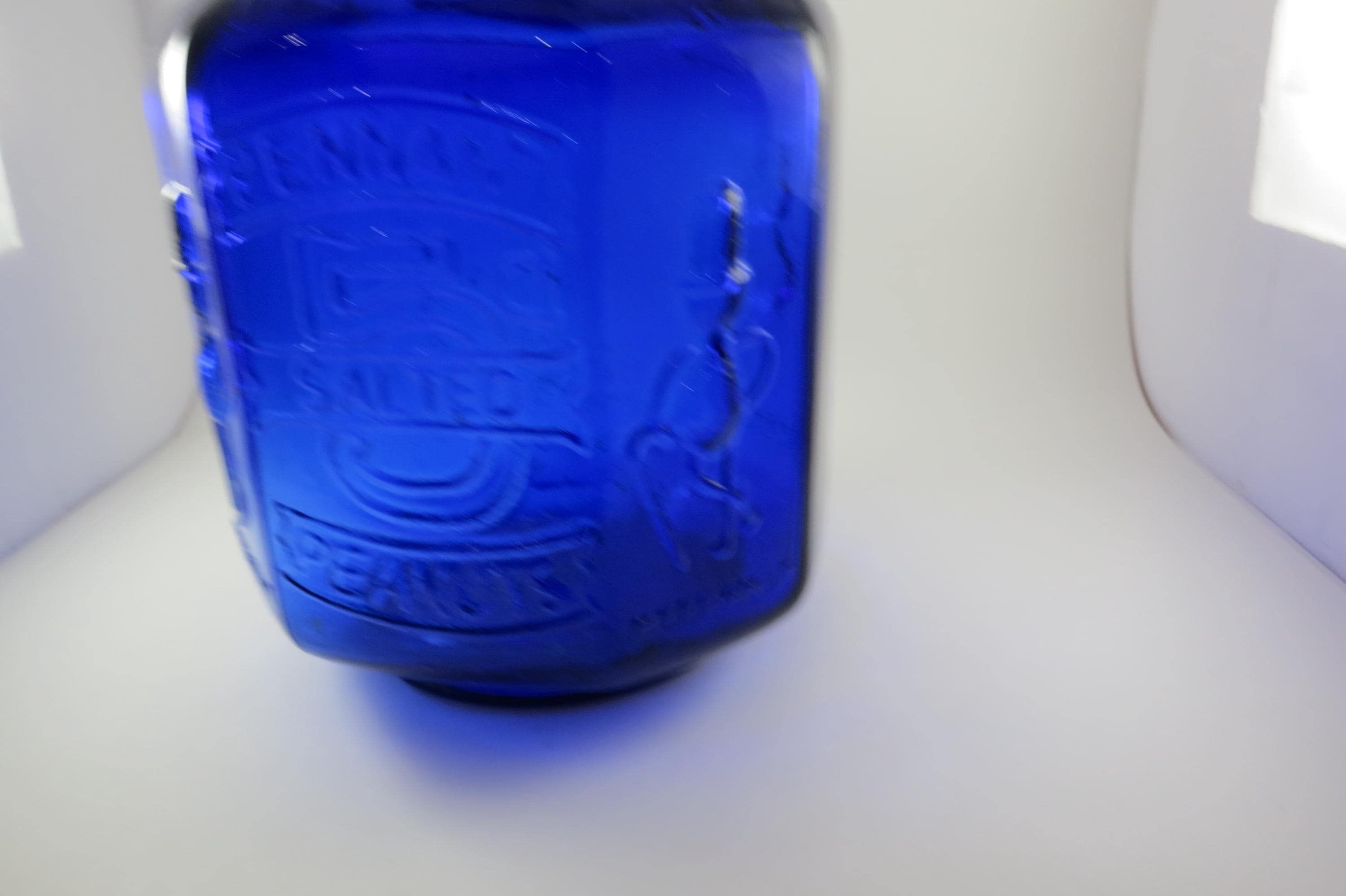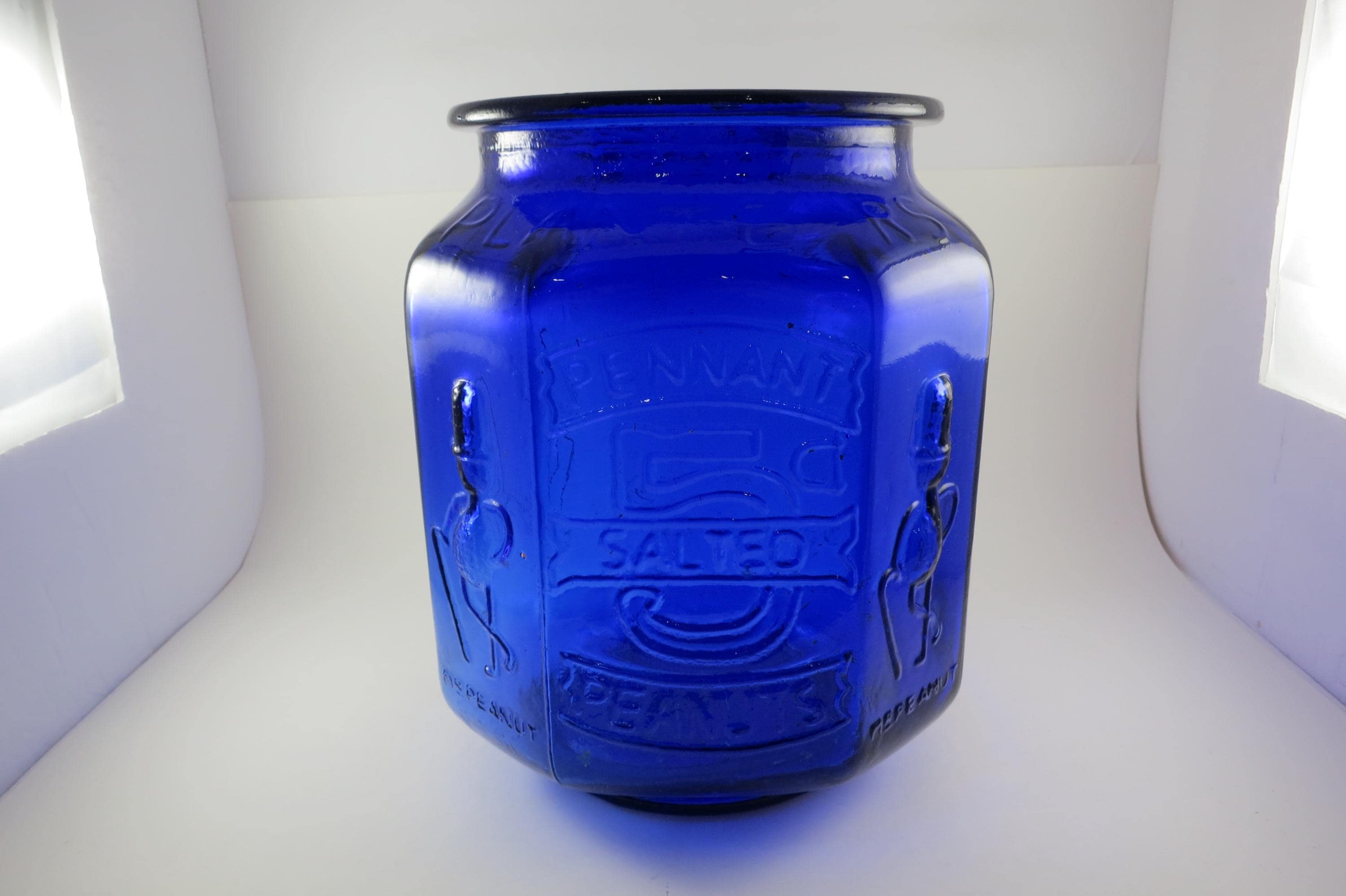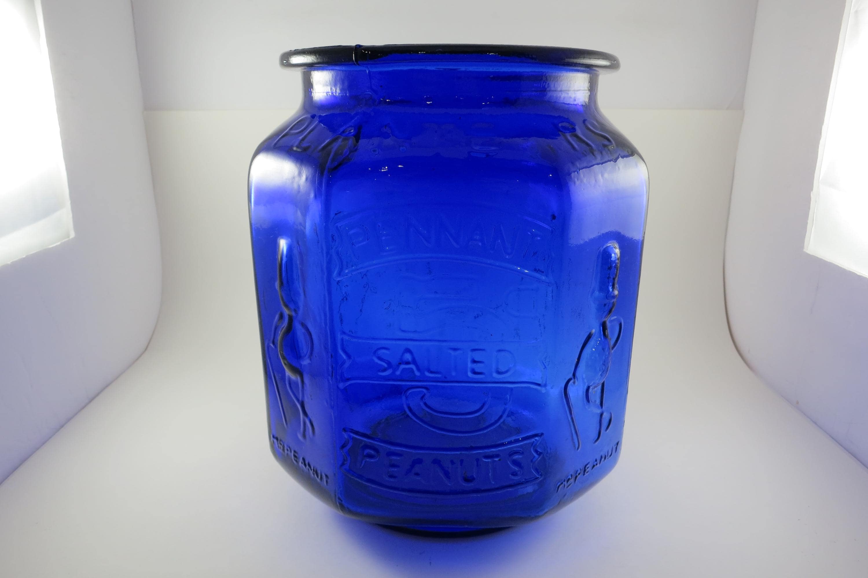 Fabulous Vintage Cobalt Blue Mr. Peanut Planters Peanuts Jar Large Size Embossed Bubbled Glass Great Display Piece. A wonderful addition to any home or collection. Very detailed, measures 10 1/2 inches tall and 8 inches wide. No chips, cracks or damages. Looks great in the cabinet and even better when light shines through!!